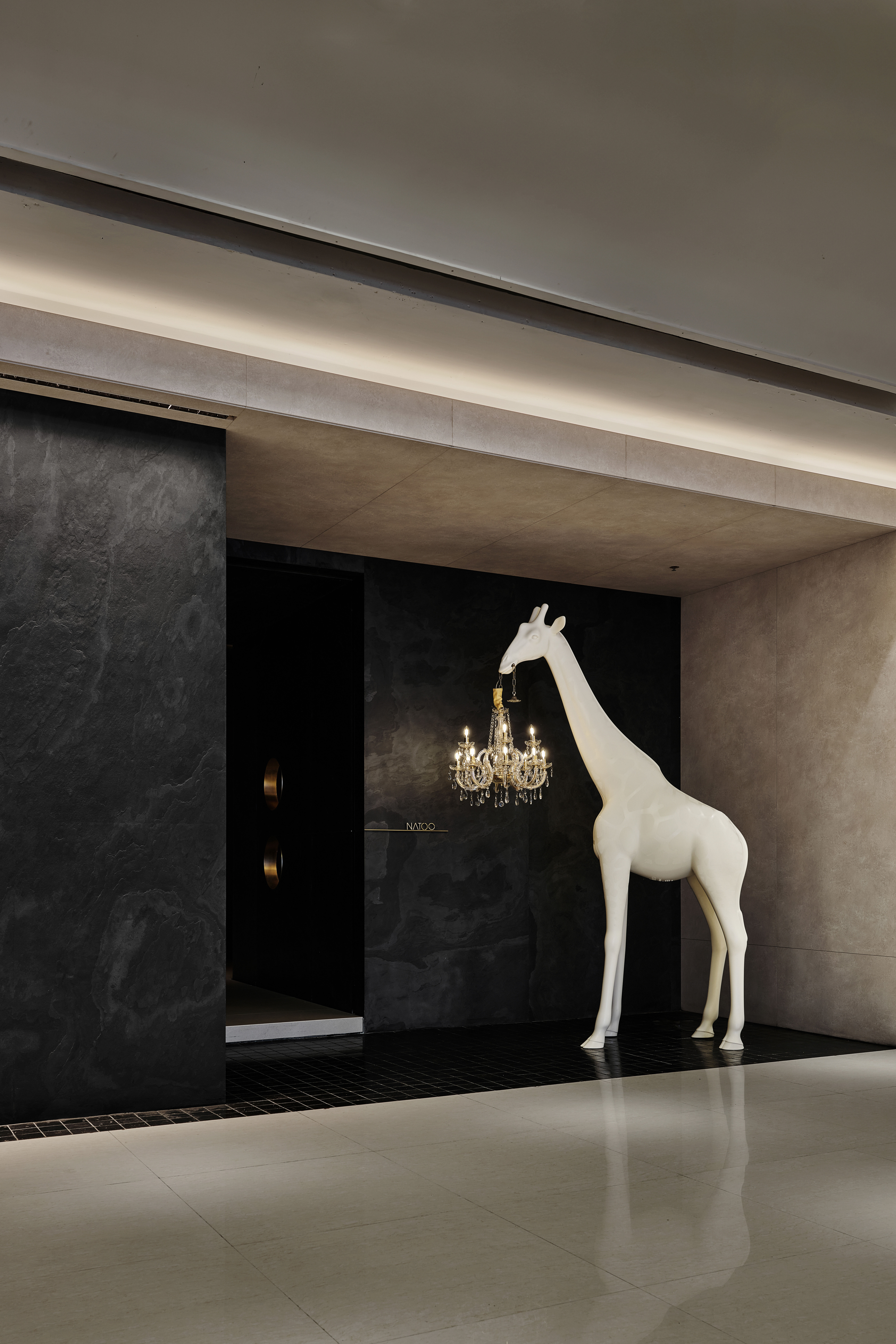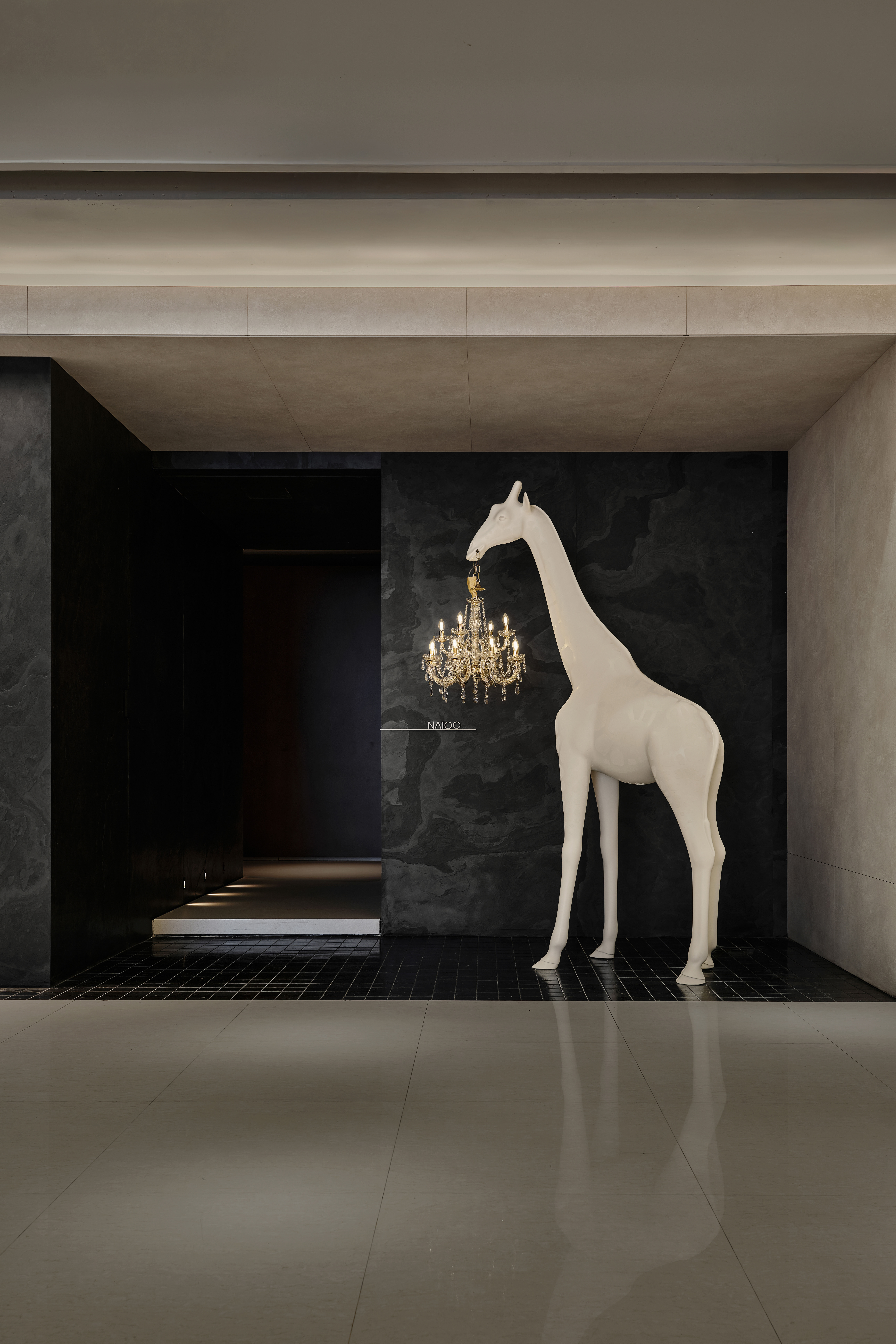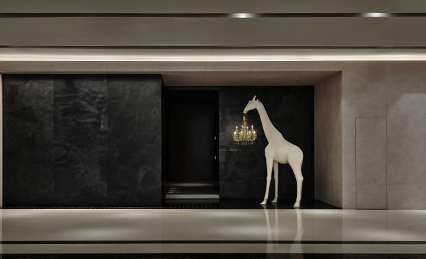 空间意境:展示空间:极简几何构造中,巨型白色长颈鹿艺术装置与水晶吊灯形成趣味互动,打破常规尺度的艺术表达。