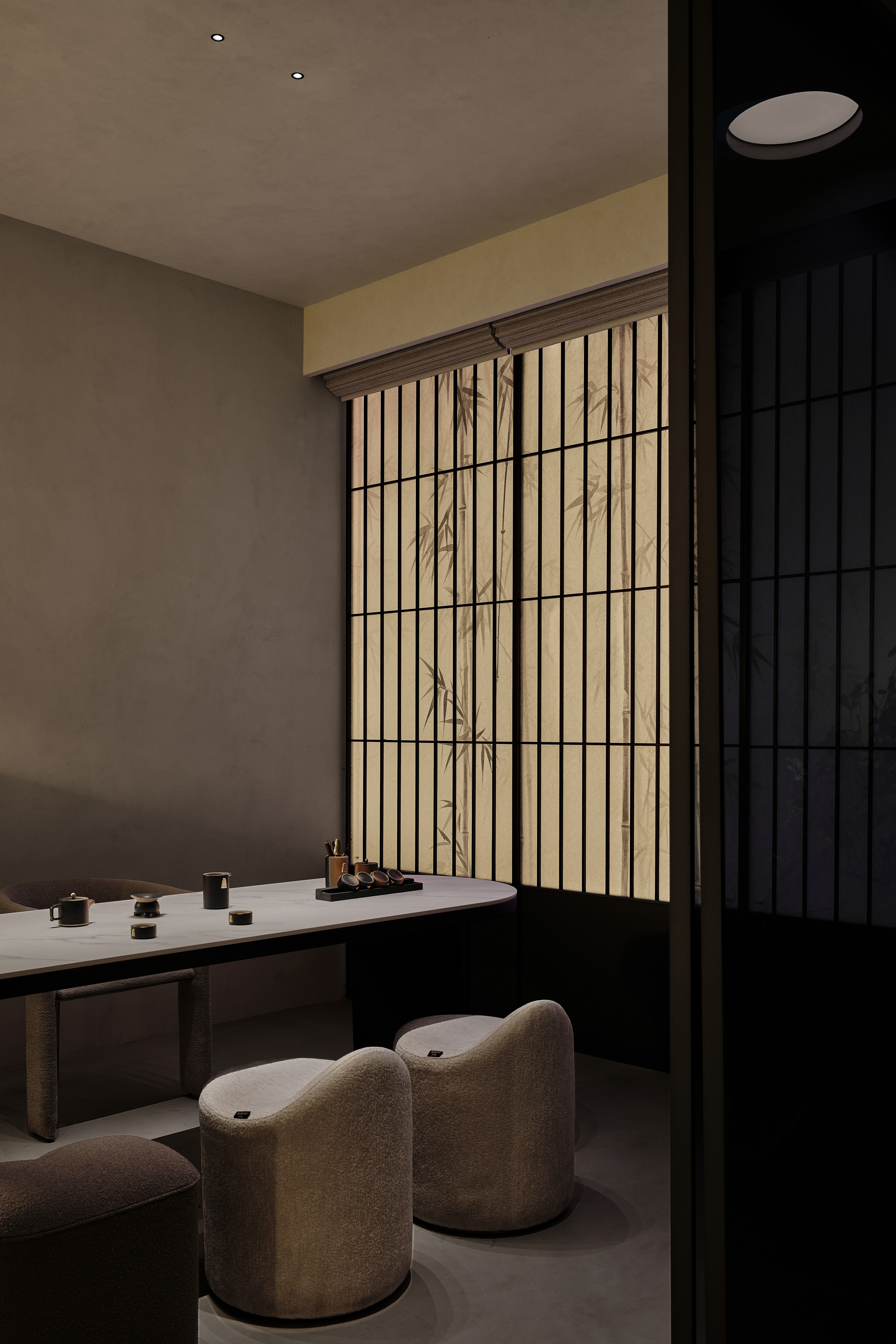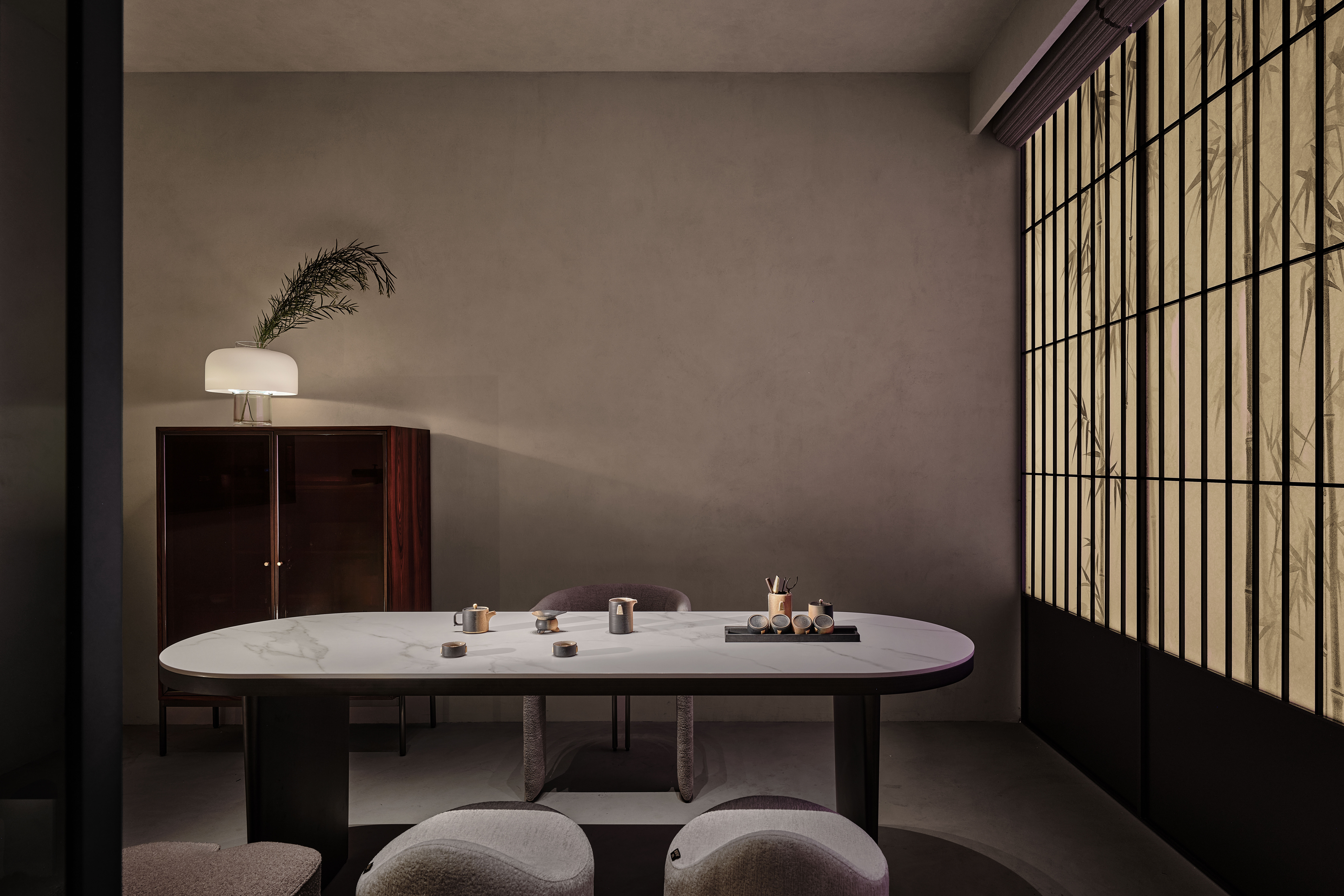 茶室:竹影屏风以东方美学符号为引,透过现代工艺演绎出朦胧雅致的空间层次,木质高柜与现代球形灯具的组合在材质与形态的碰撞中平衡了禅意的沉静与现代的先锋。 -