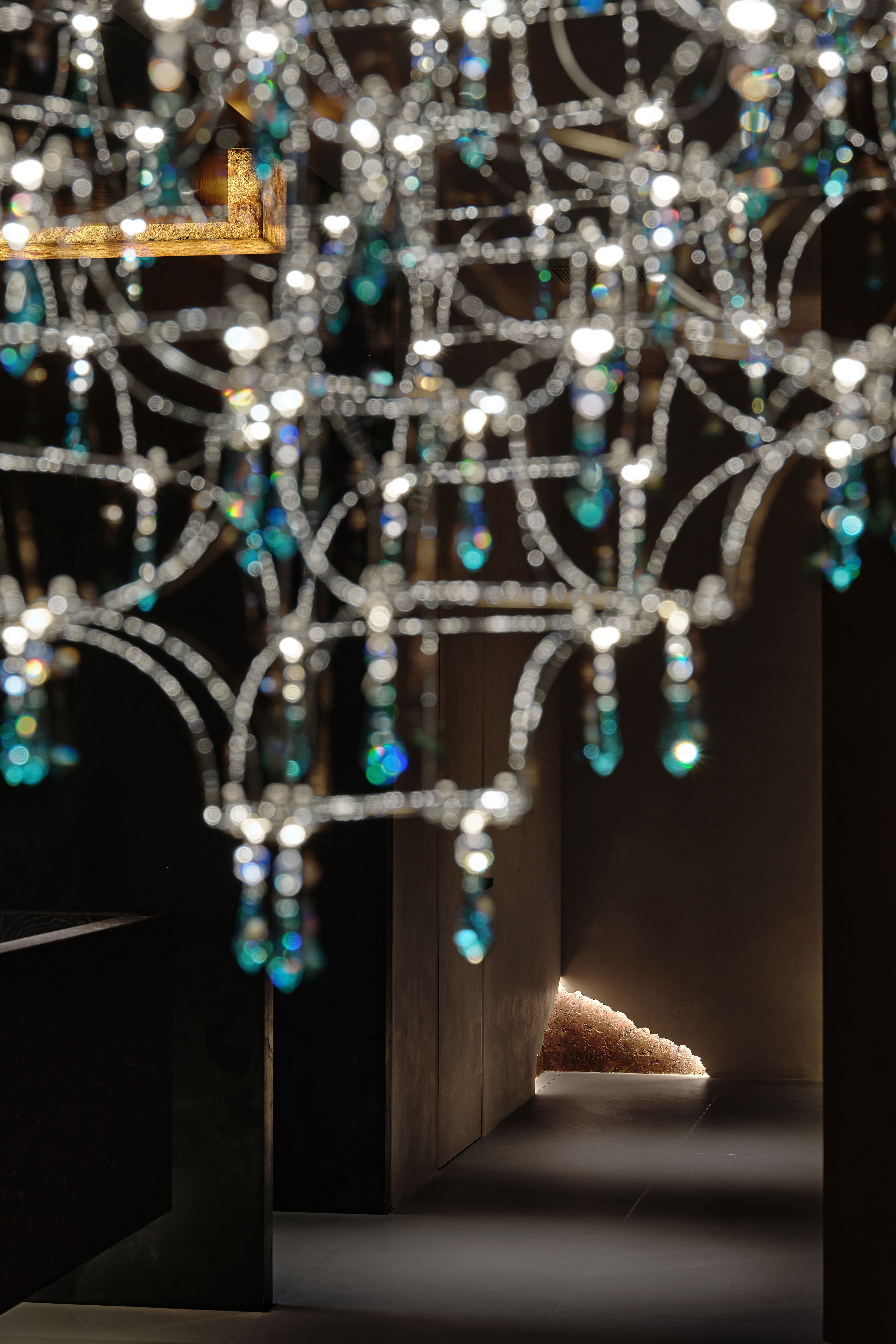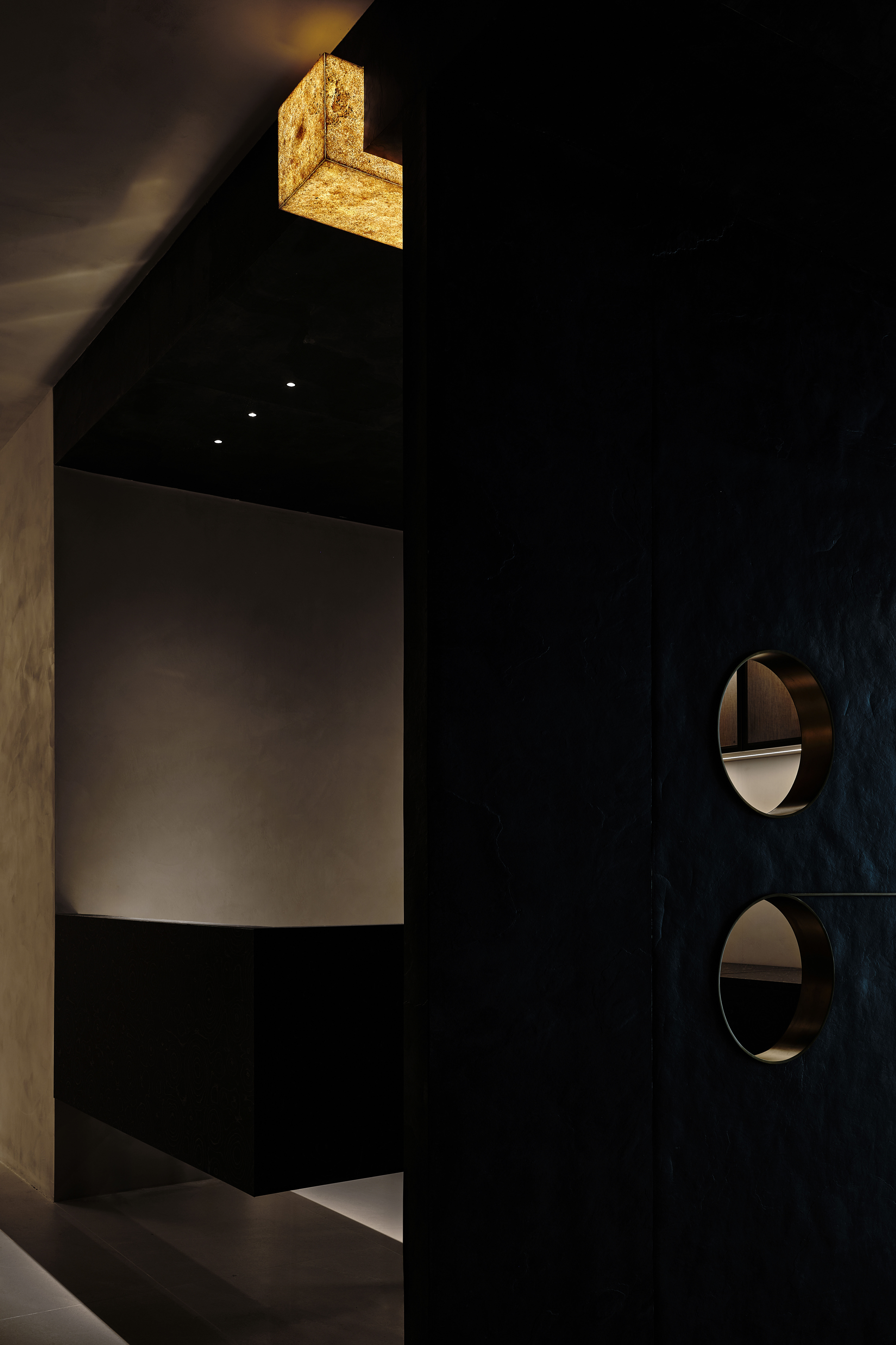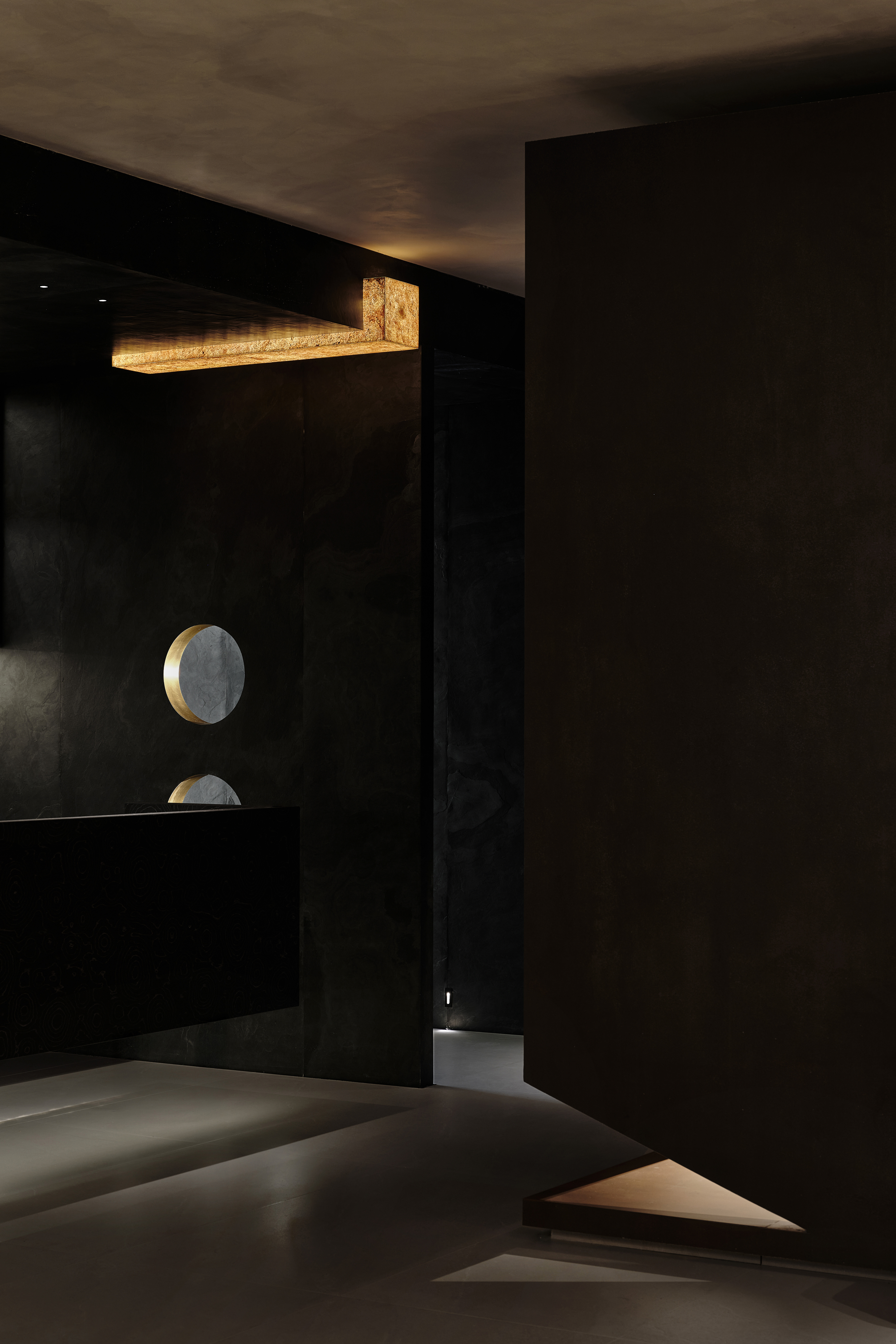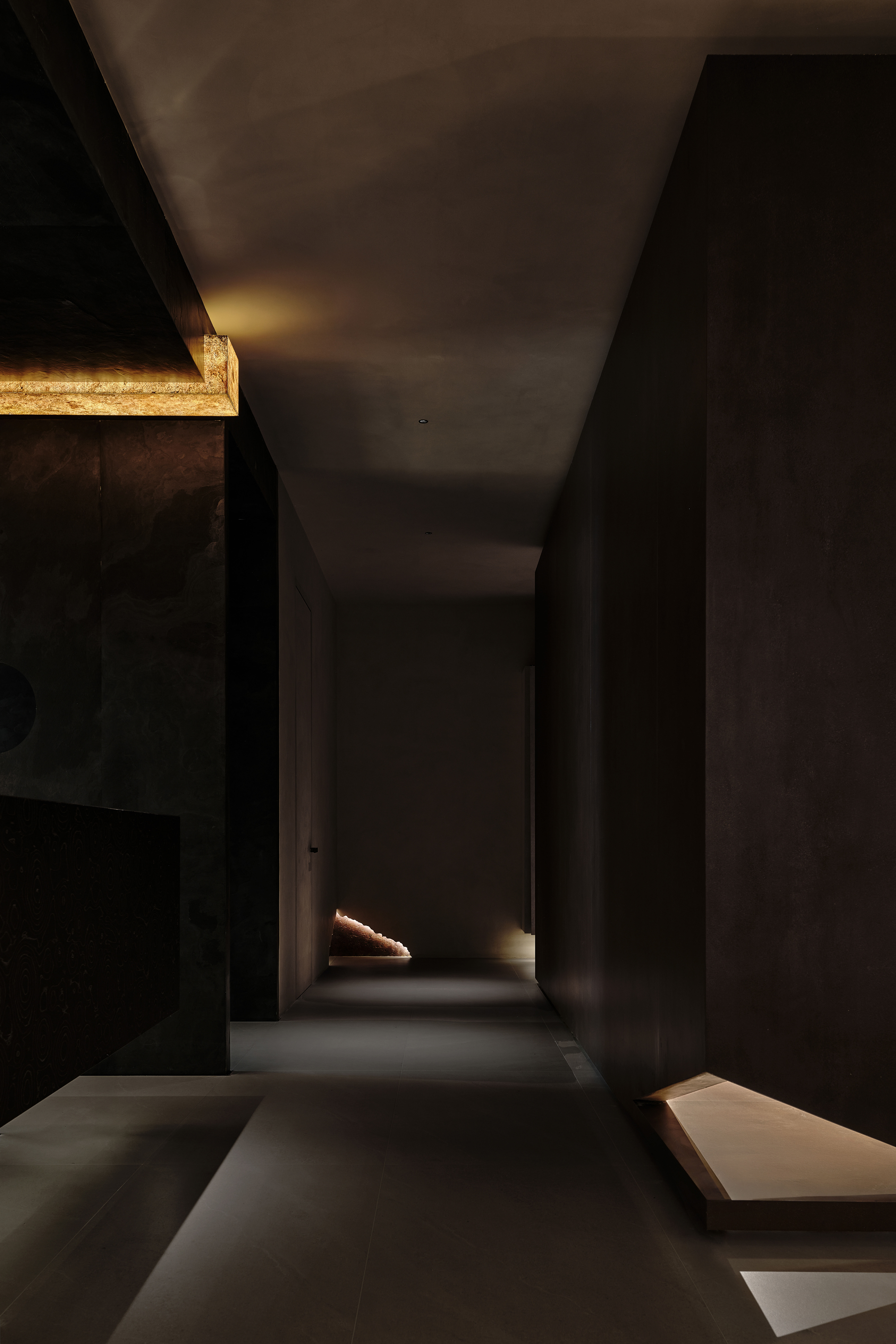 角落处的定制山石肌理装置在局部灯光的晕染下如禅意画中的 “枯山水” 意象将自然肌理以现代工艺定格。 -