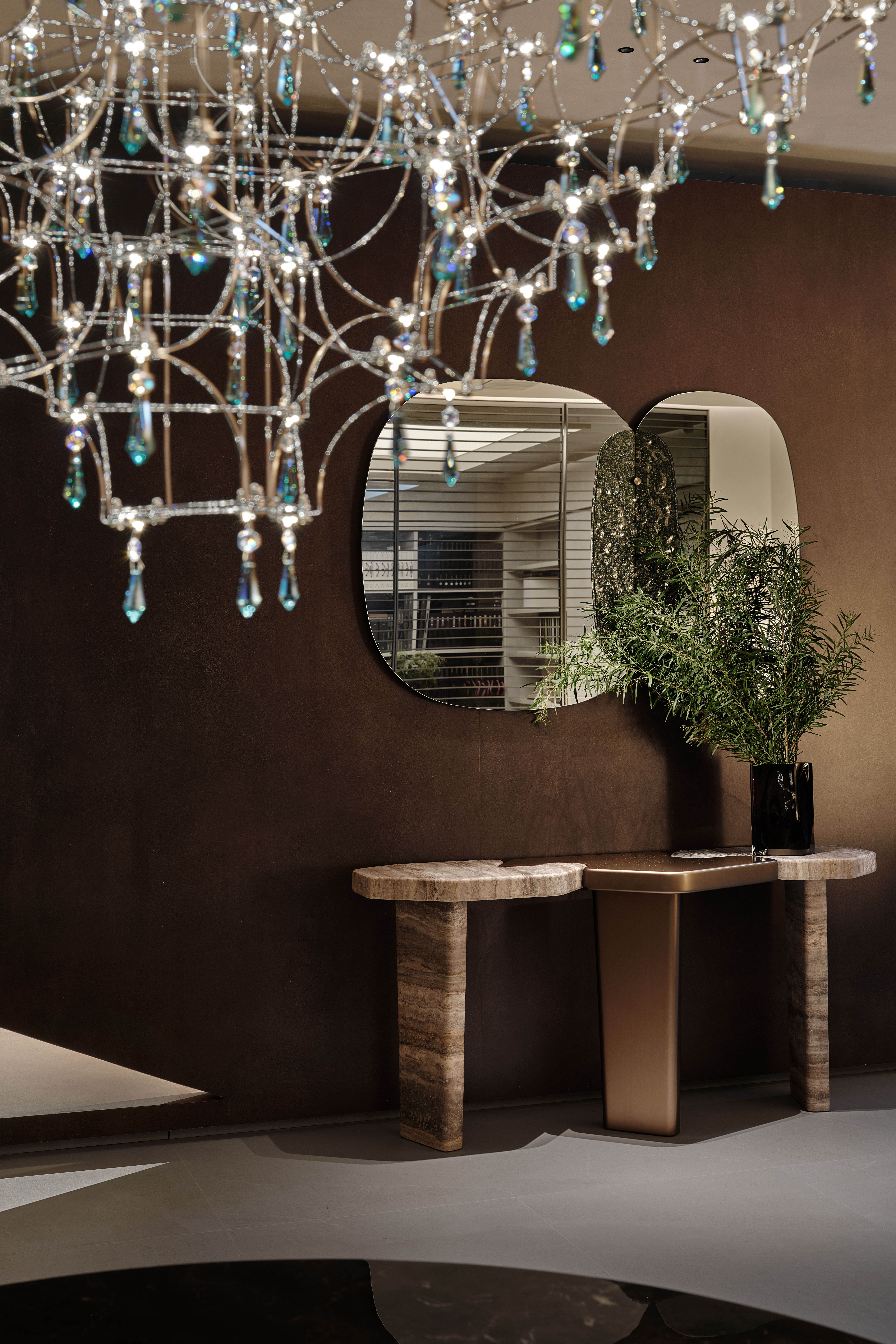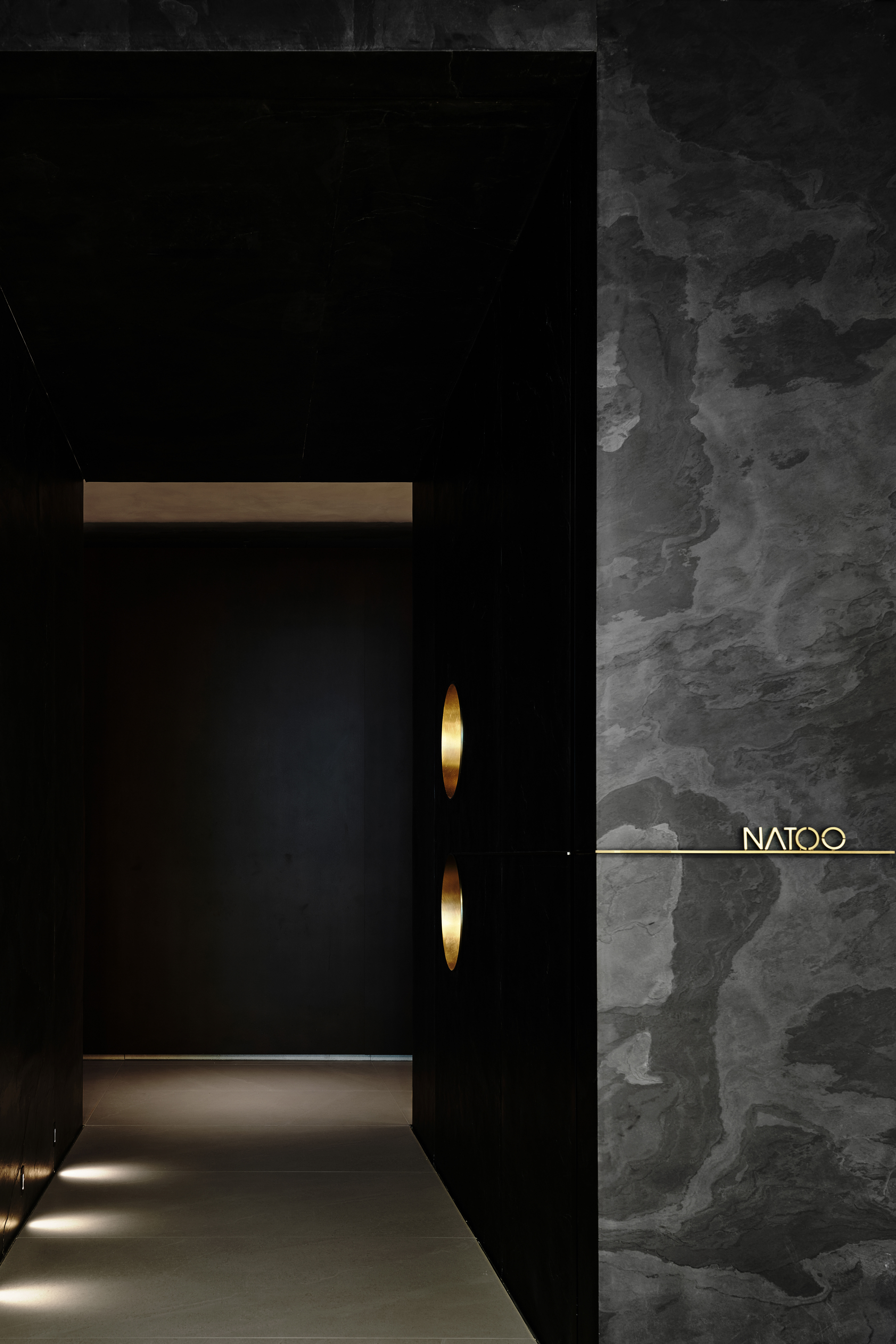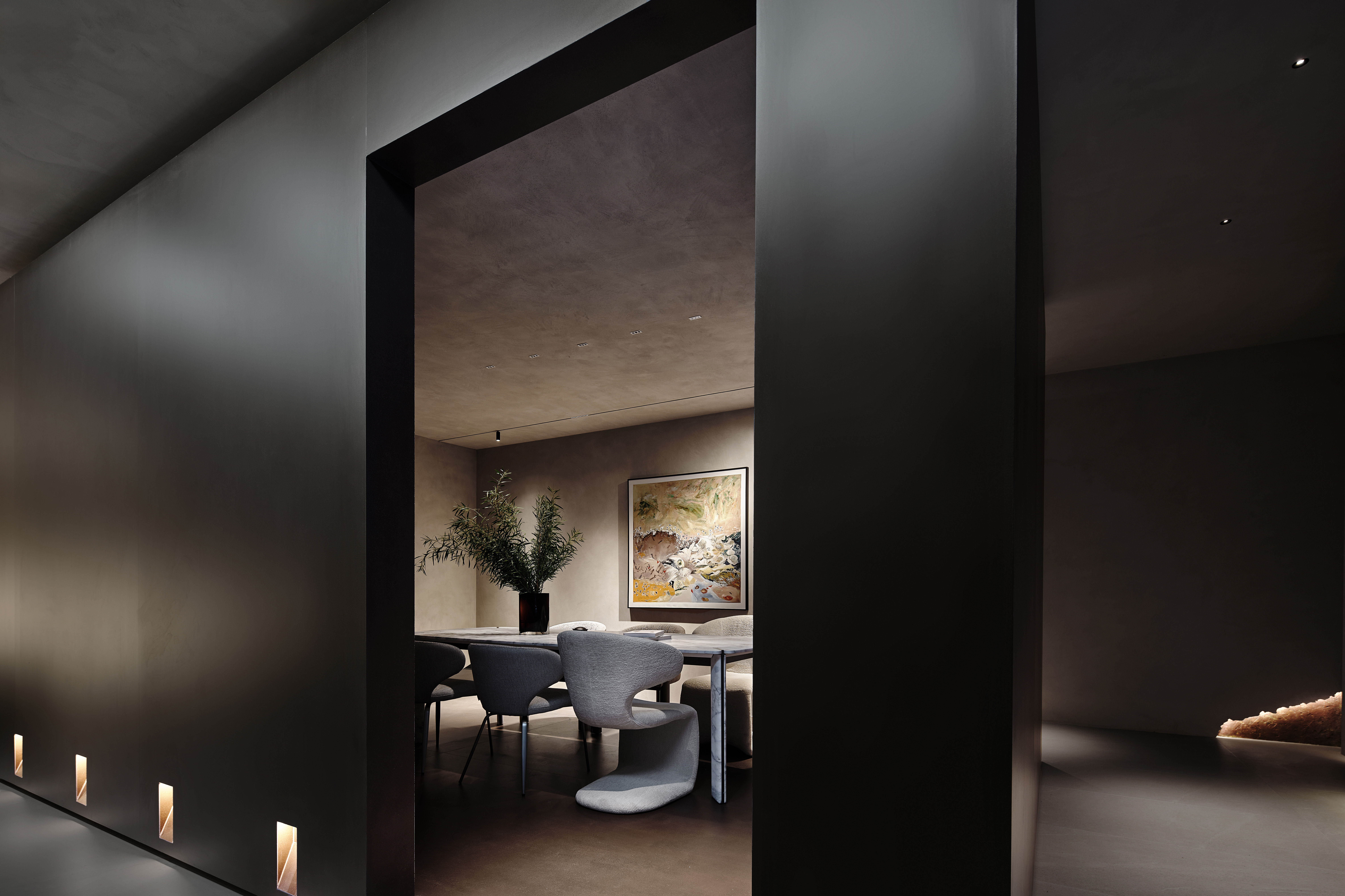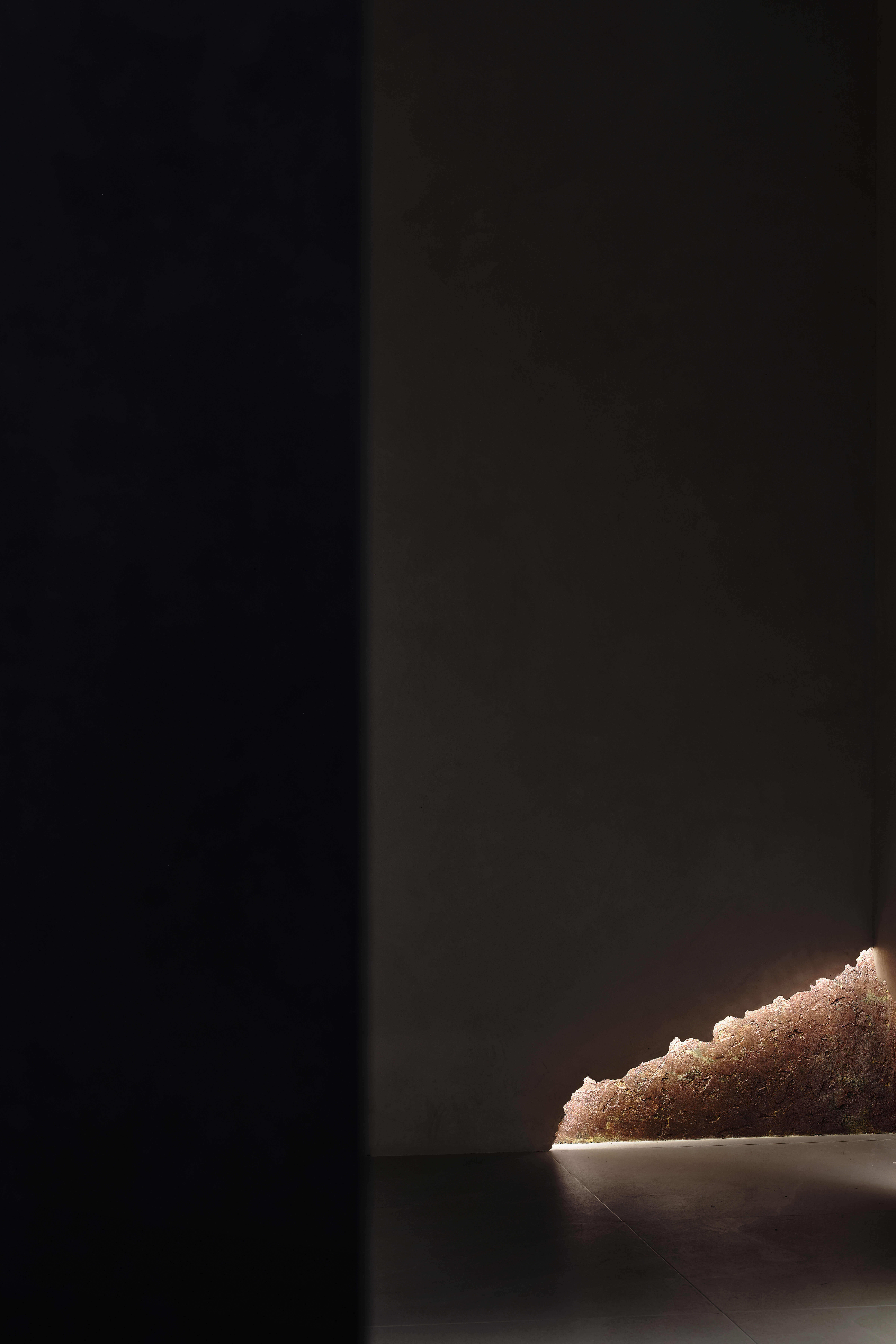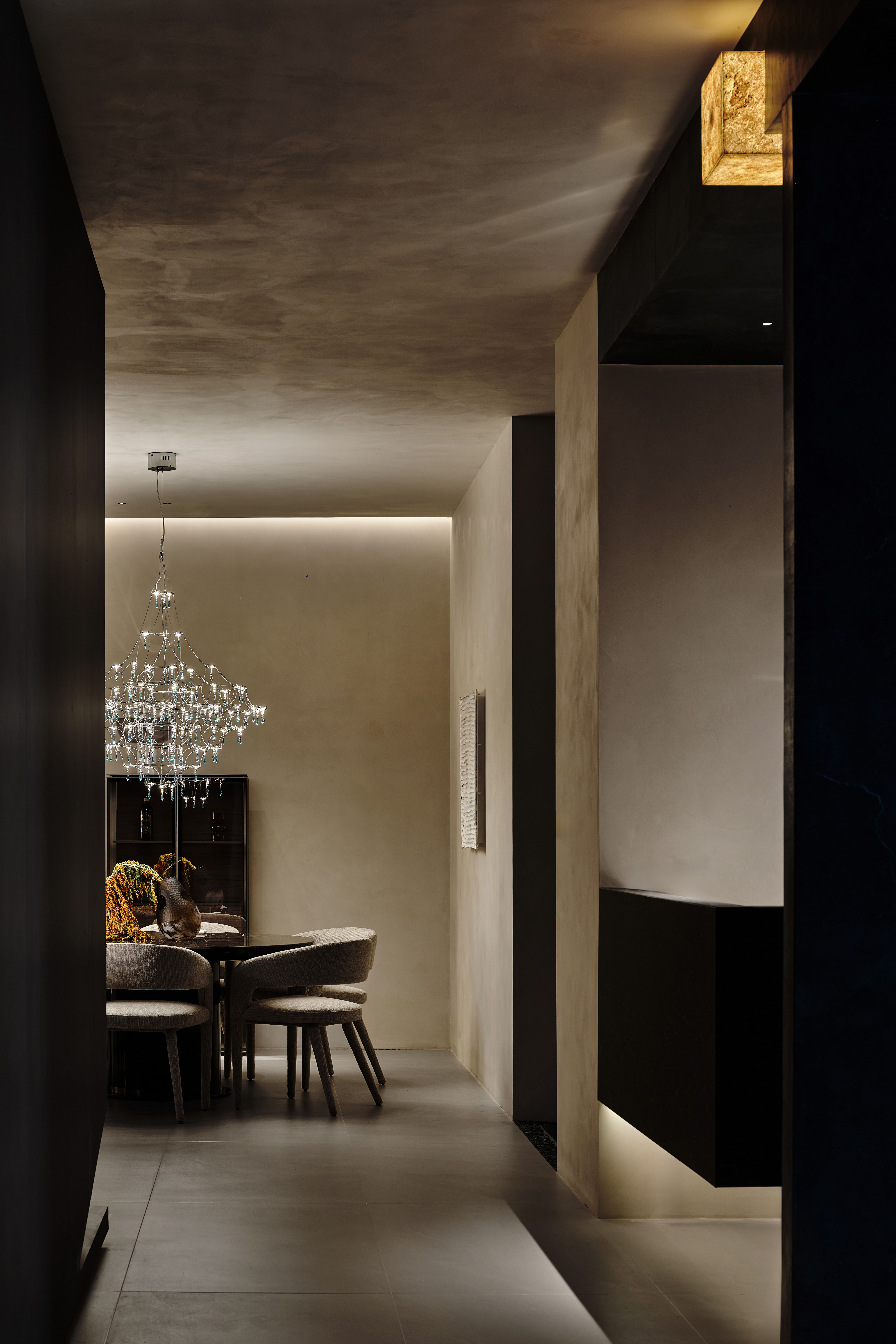 角落处的定制山石肌理装置在局部灯光的晕染下如禅意画中的 “枯山水” 意象将自然肌理以现代工艺定格。 -