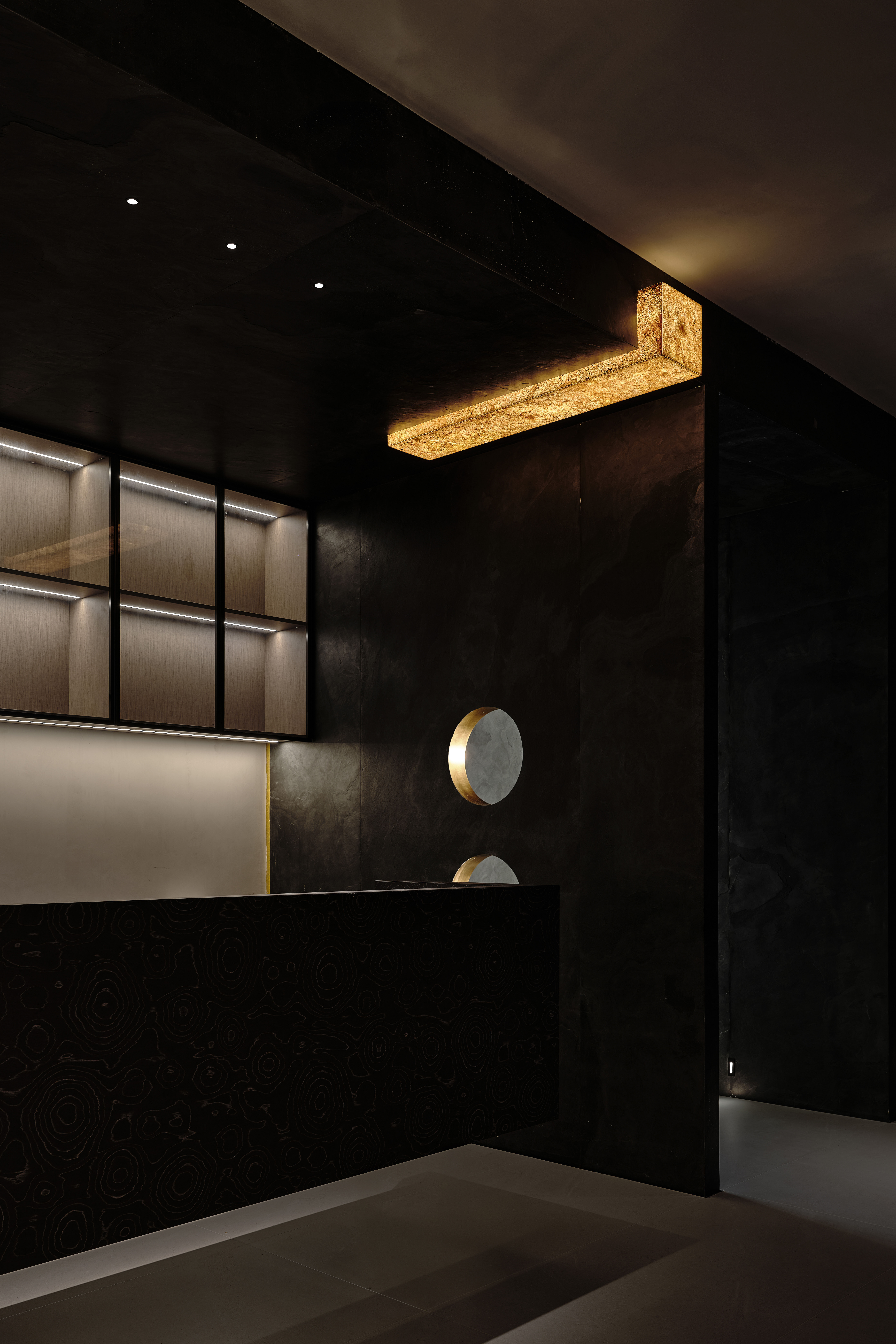 接待区:以深黑为主调,特殊工艺墙面呈现独特肌理质感,金色线条与内嵌灯光如暗夜里的星火点亮奢华基因,几何灯光装置与圆形装饰元素形成形态对比,定制接待台的纹样暗藏细节巧思。