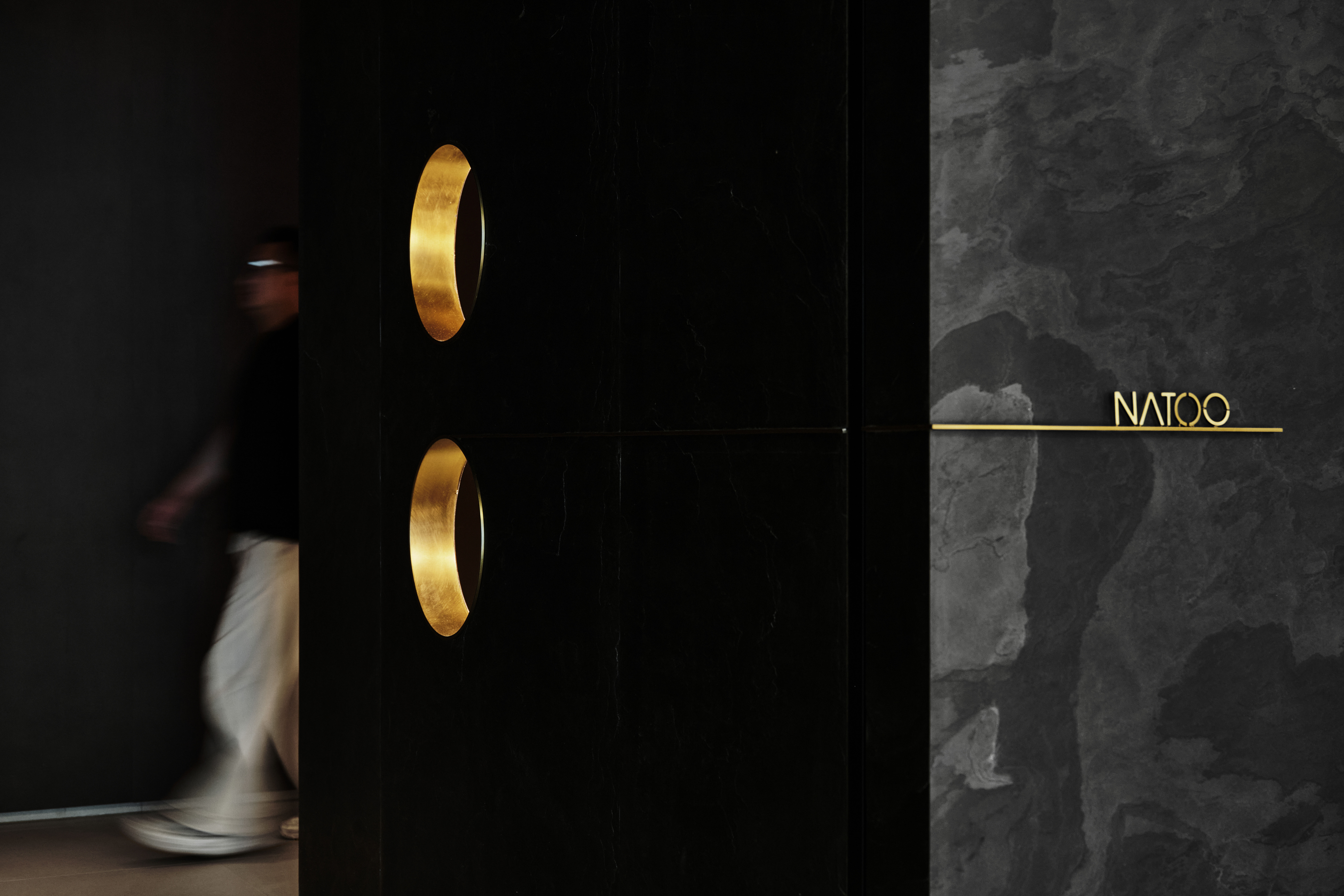 门厅区:以深黑石材的自然肌理为基底,植入金色环形装置,其形态暗合禅意 “圆融” 的哲学符号,金属的现代工艺质感与石材的天然粗粝形成强烈对话。