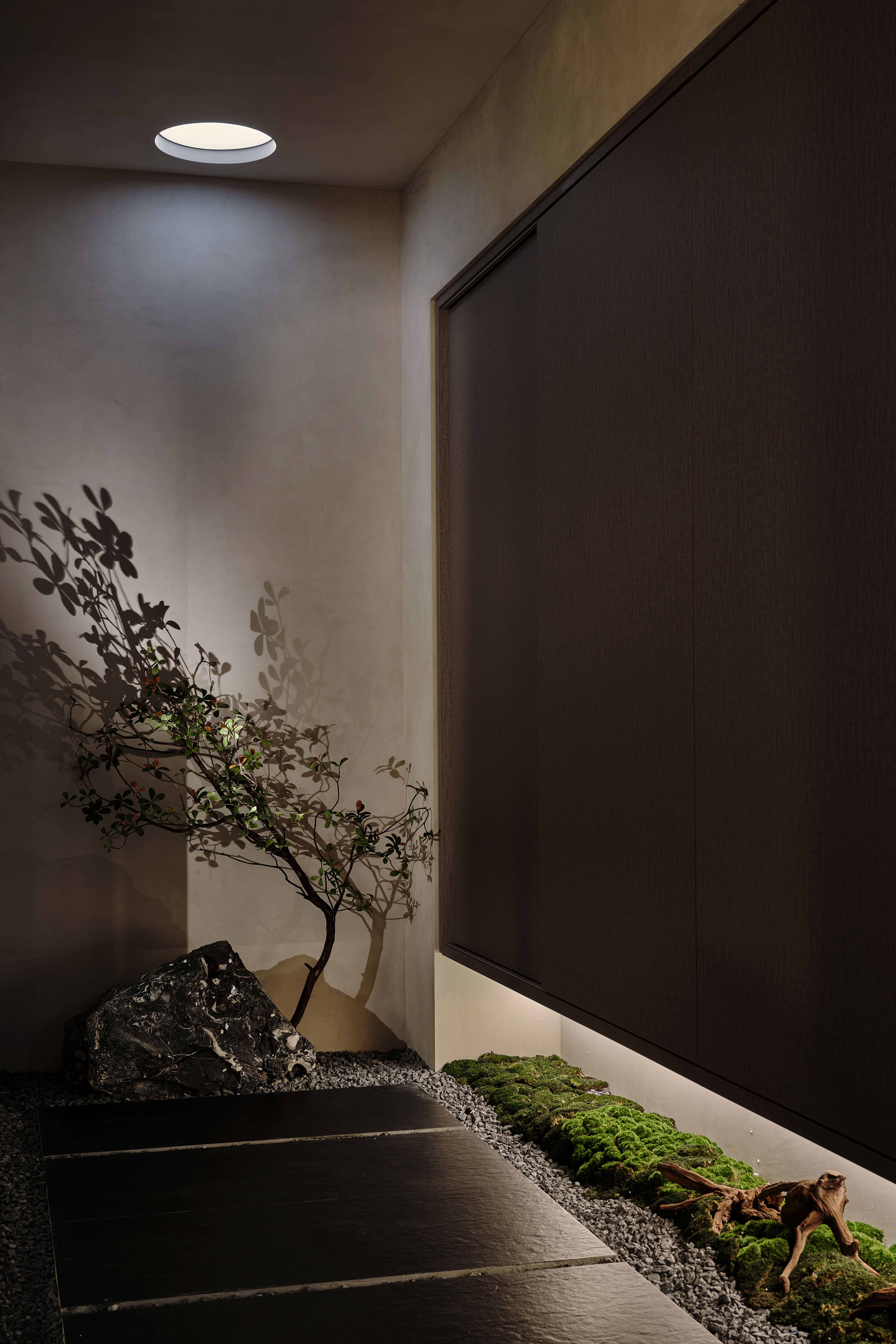 植入禅意枯山水的核心元素,黑石苍劲、枝影婆娑。