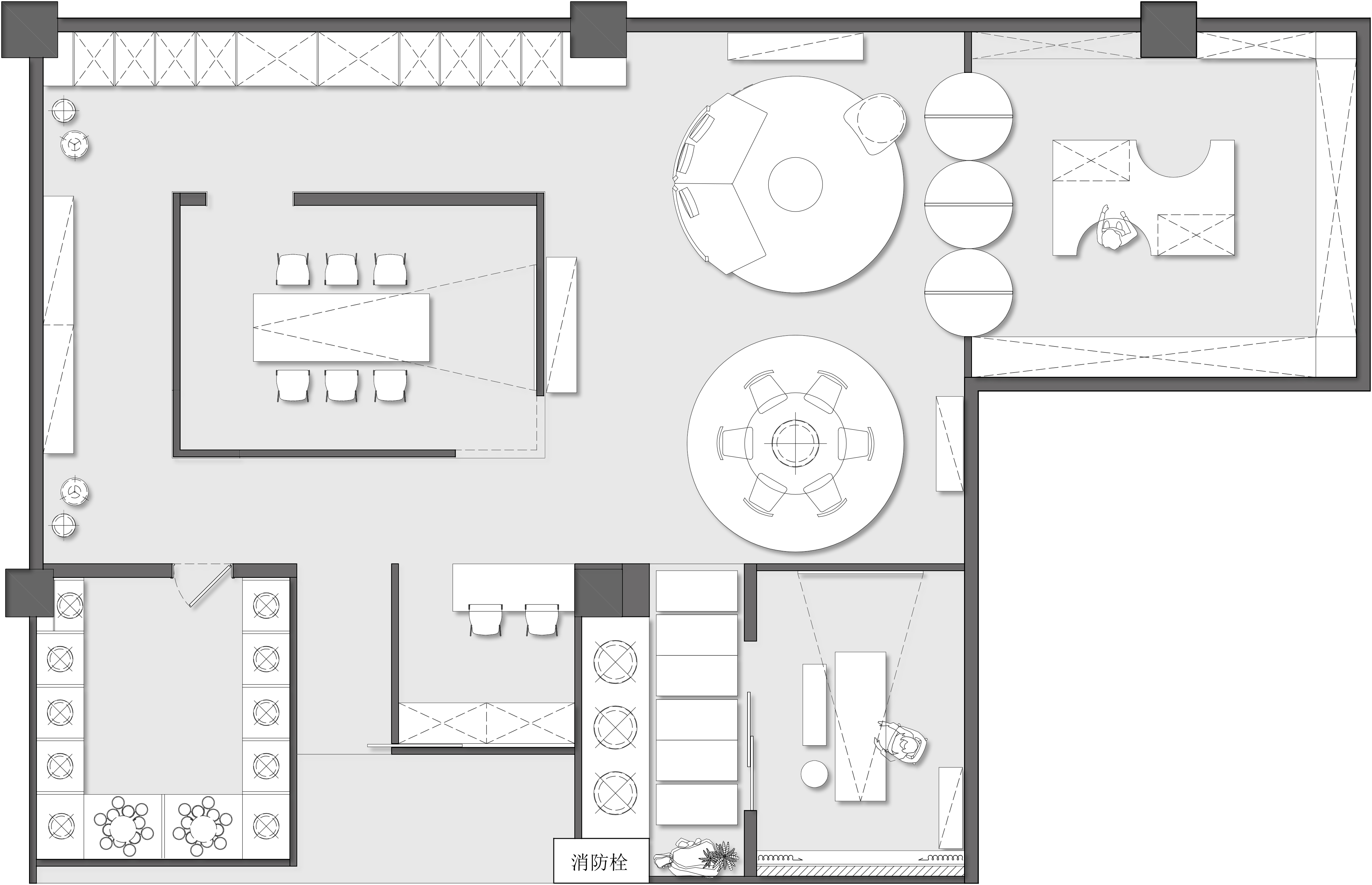 空间布局:以明暗色块的极简分割构建现代视觉框架,角落处的定制山石肌理装置在局部灯光的晕染下如禅意画中的 “枯山水” 意象,将自然肌理以现代工艺定格。