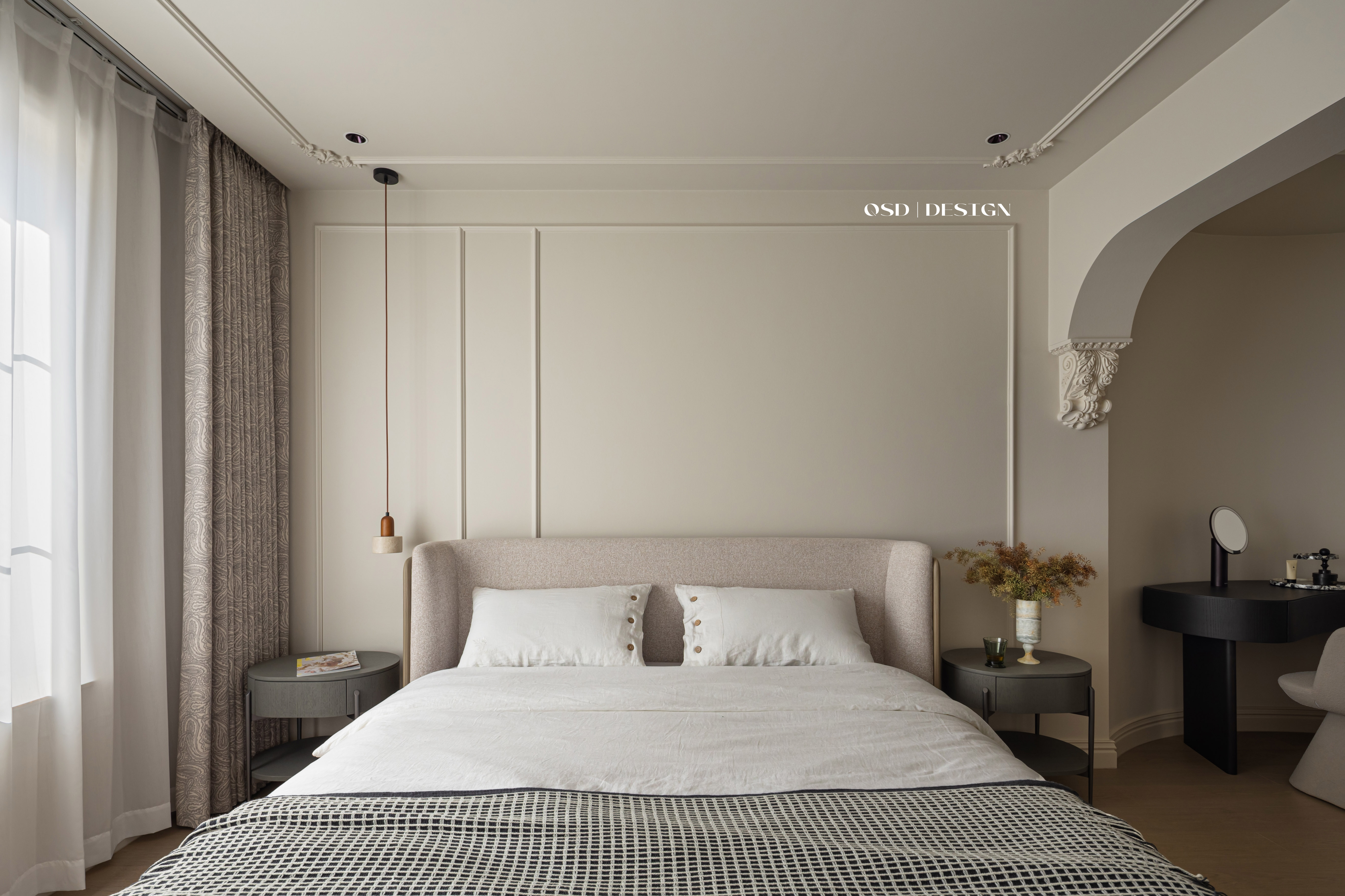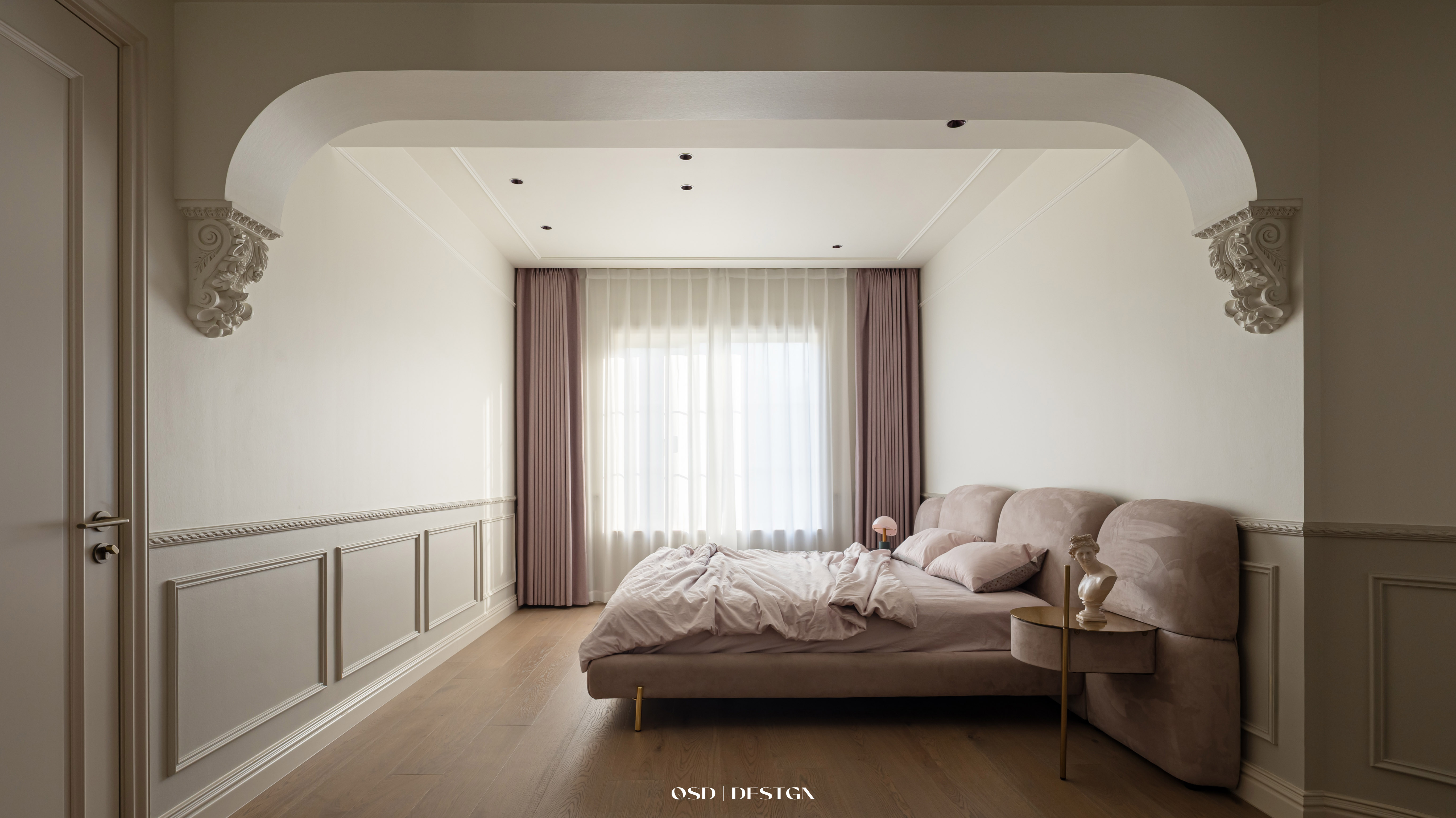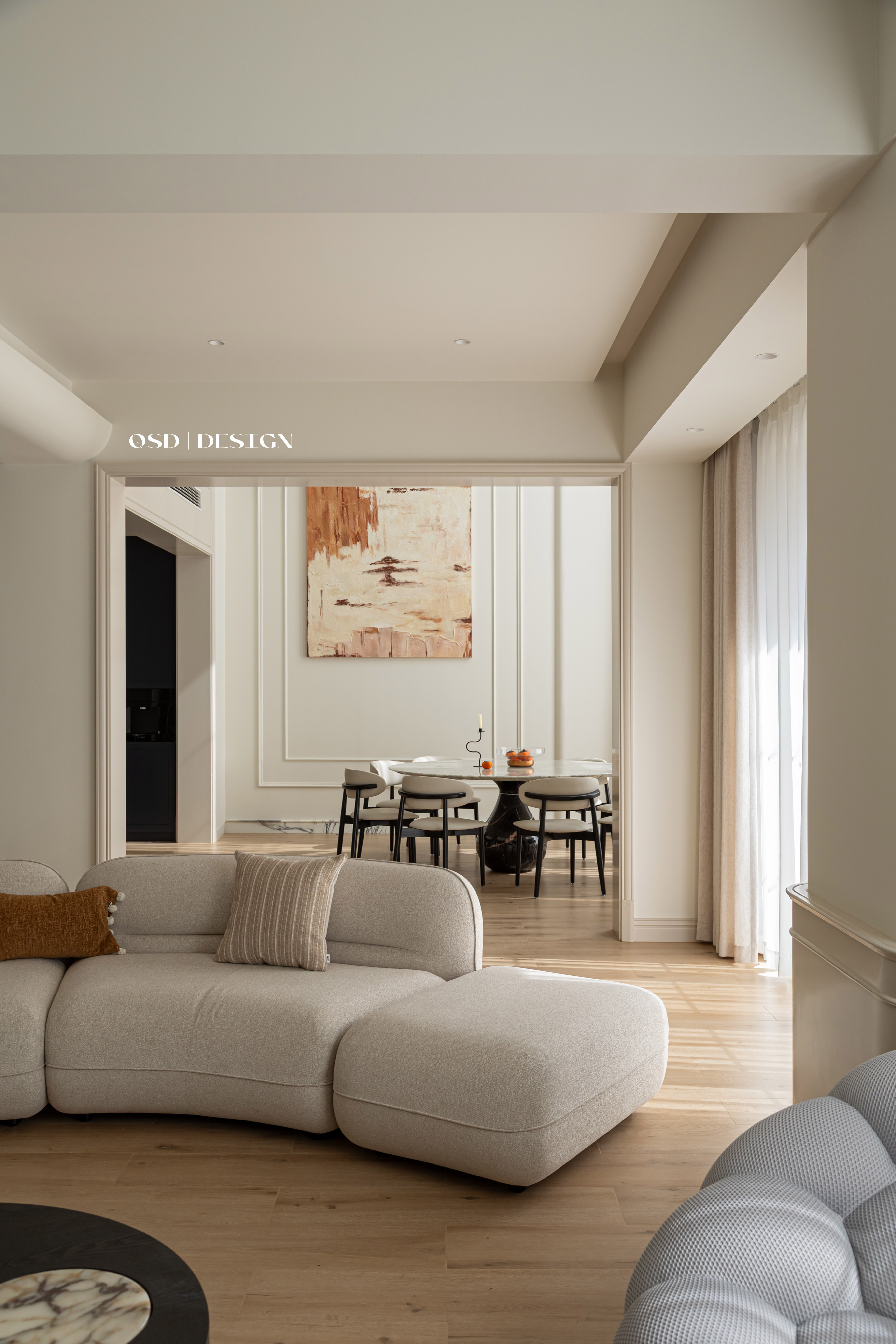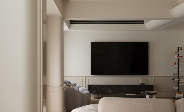空间意境:延续法式经典的弧形元素替代尖锐棱角,营造柔和氛围;以 “奶油色” 为基底,选用米白、奶咖等低饱和度色彩作为主色调,奠定温柔基调;局部点缀焦糖色软装提亮,避免单调,增强层次感。