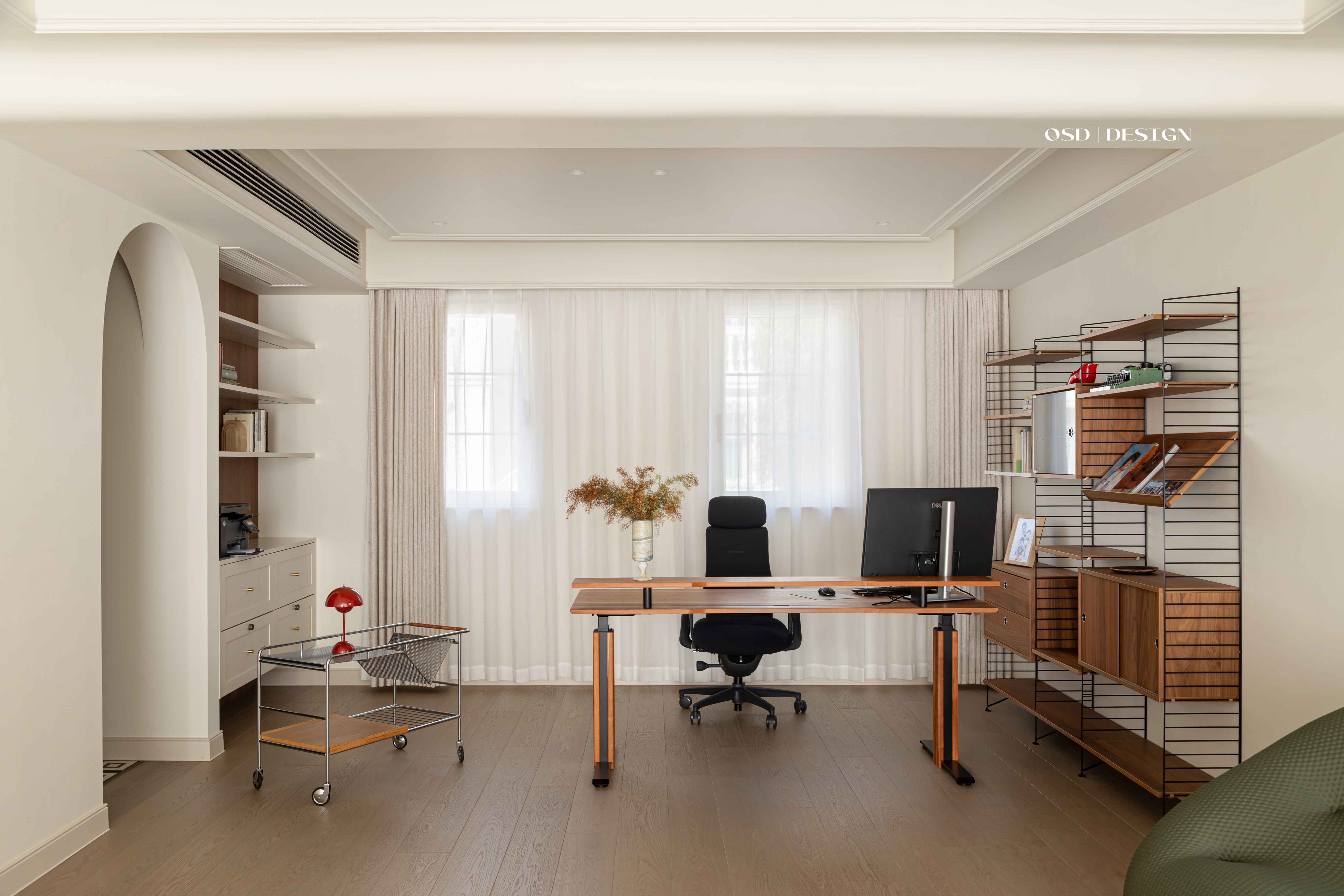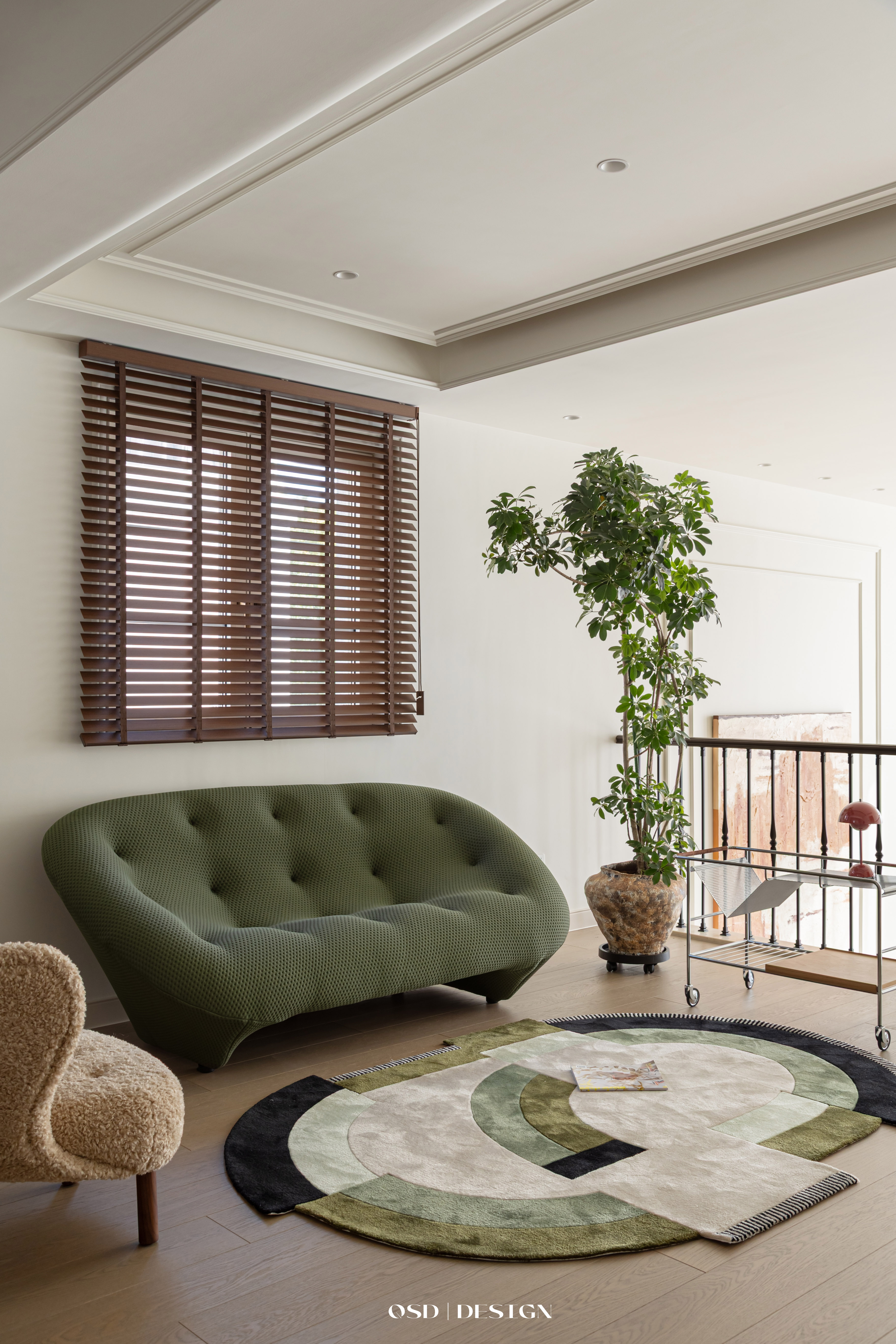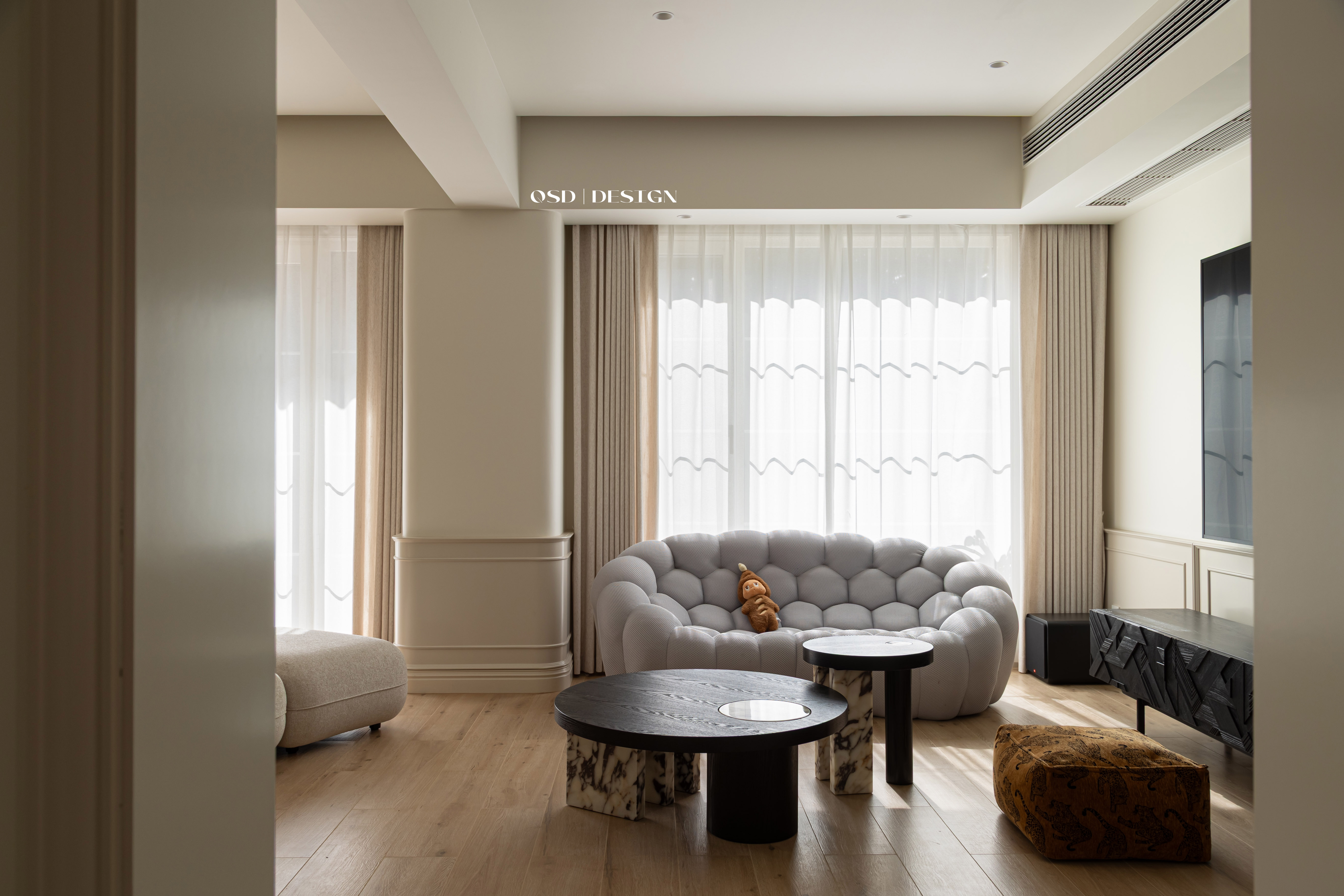 空间意境:延续法式经典的弧形元素替代尖锐棱角,营造柔和氛围;以 “奶油色” 为基底,选用米白、奶咖等低饱和度色彩作为主色调,奠定温柔基调;局部点缀焦糖色软装提亮,避免单调,增强层次感。