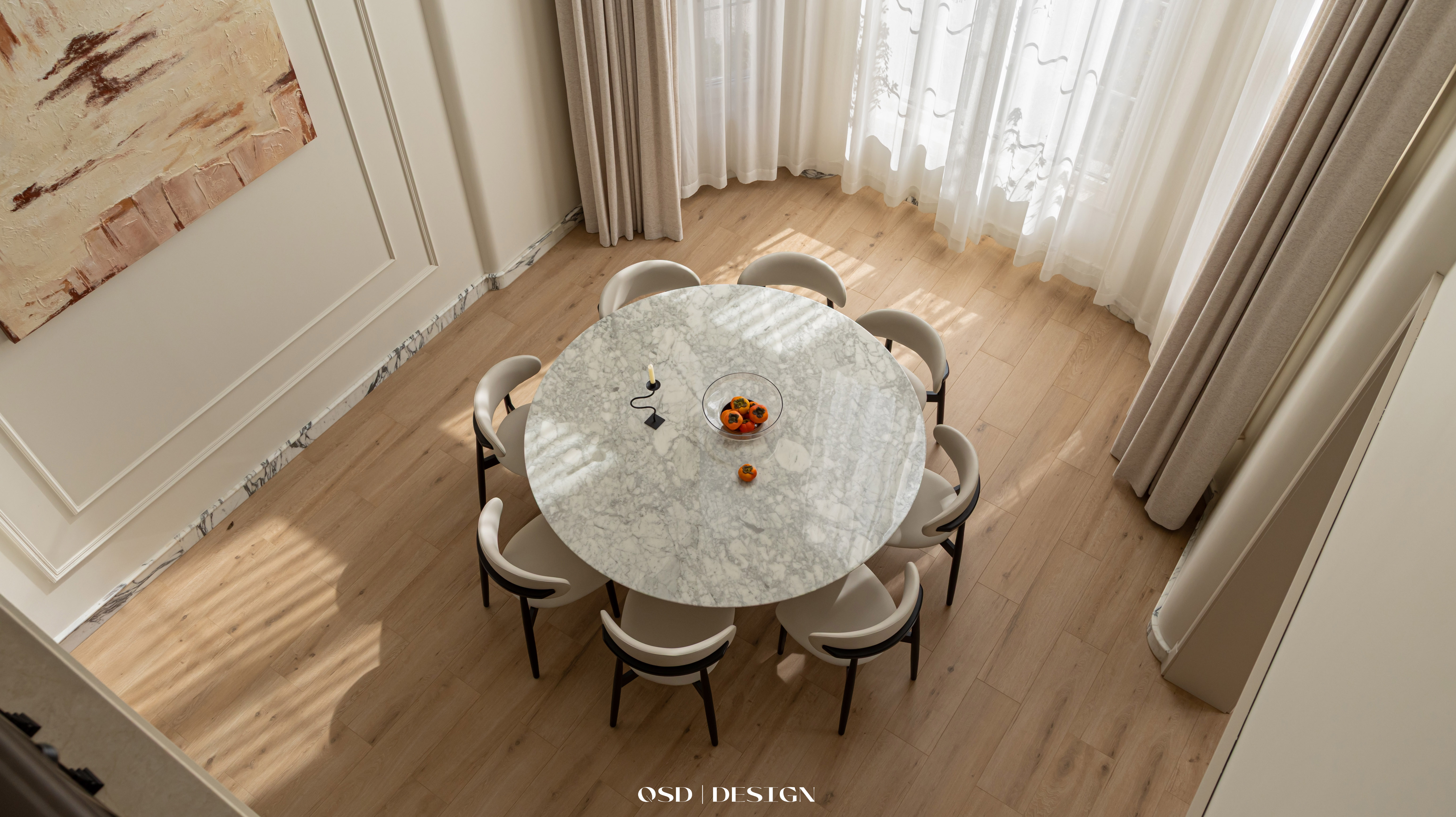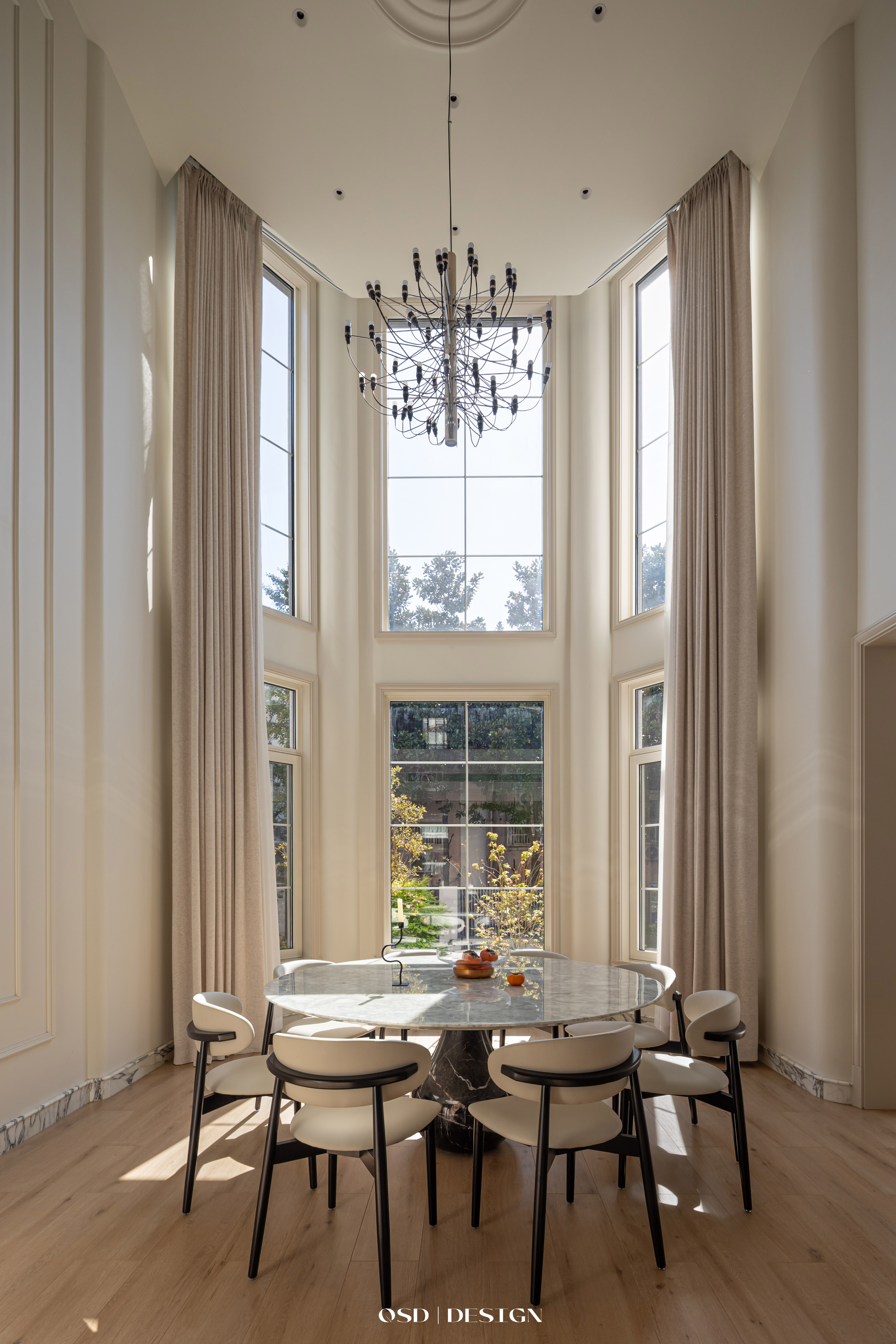 圆形大理石餐桌和建筑结构相呼应,上方悬挂法式吊灯,营造温馨用餐氛围;