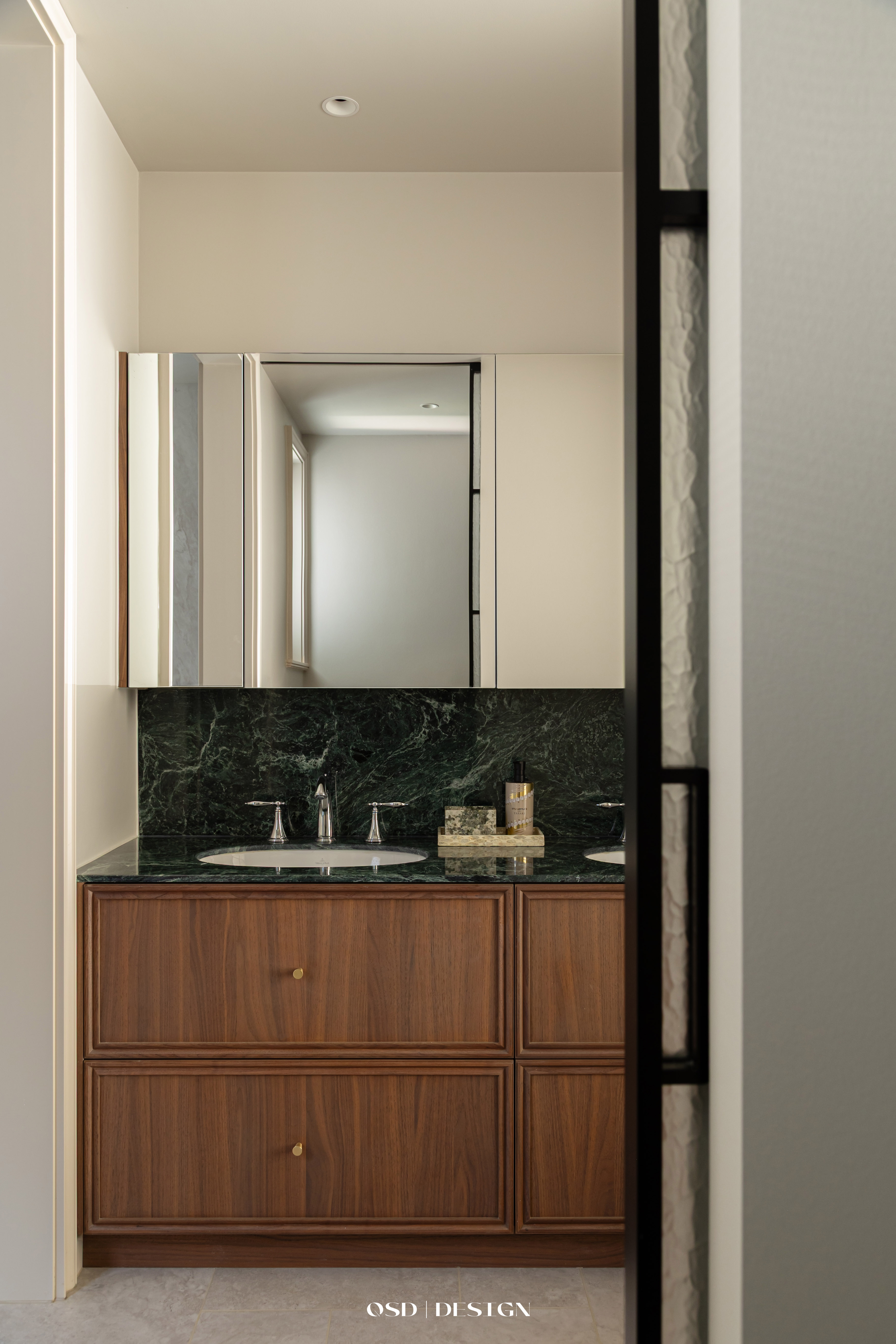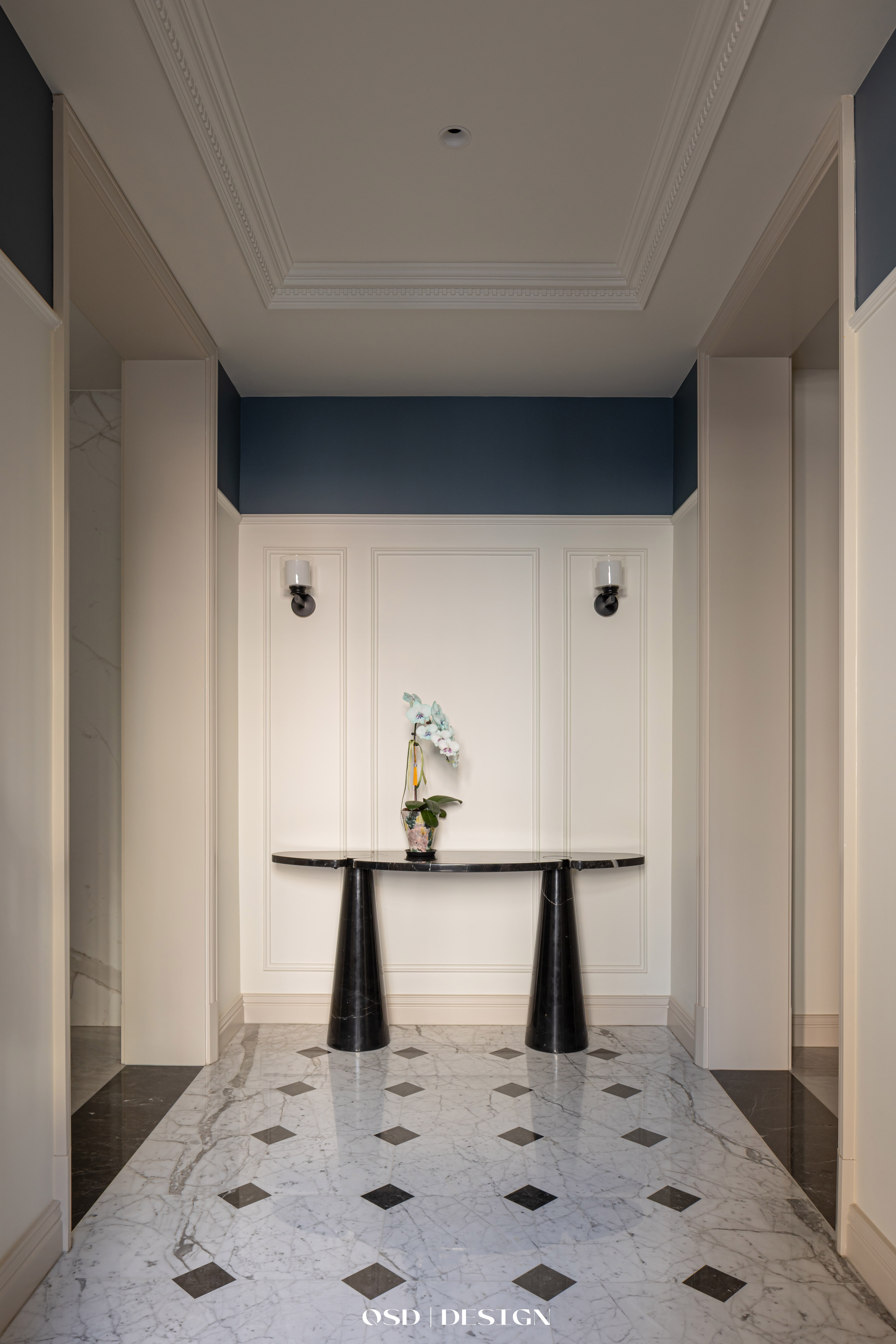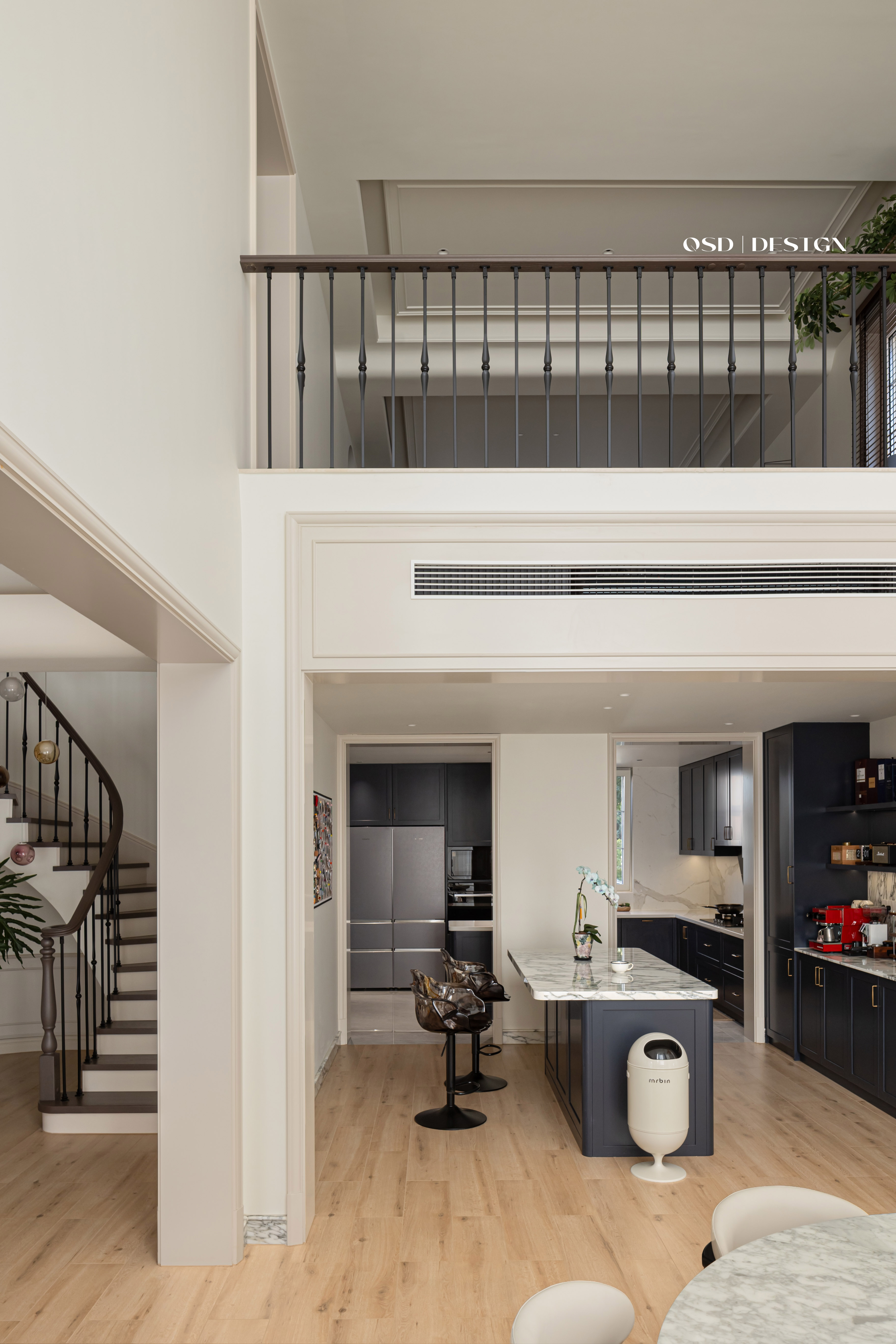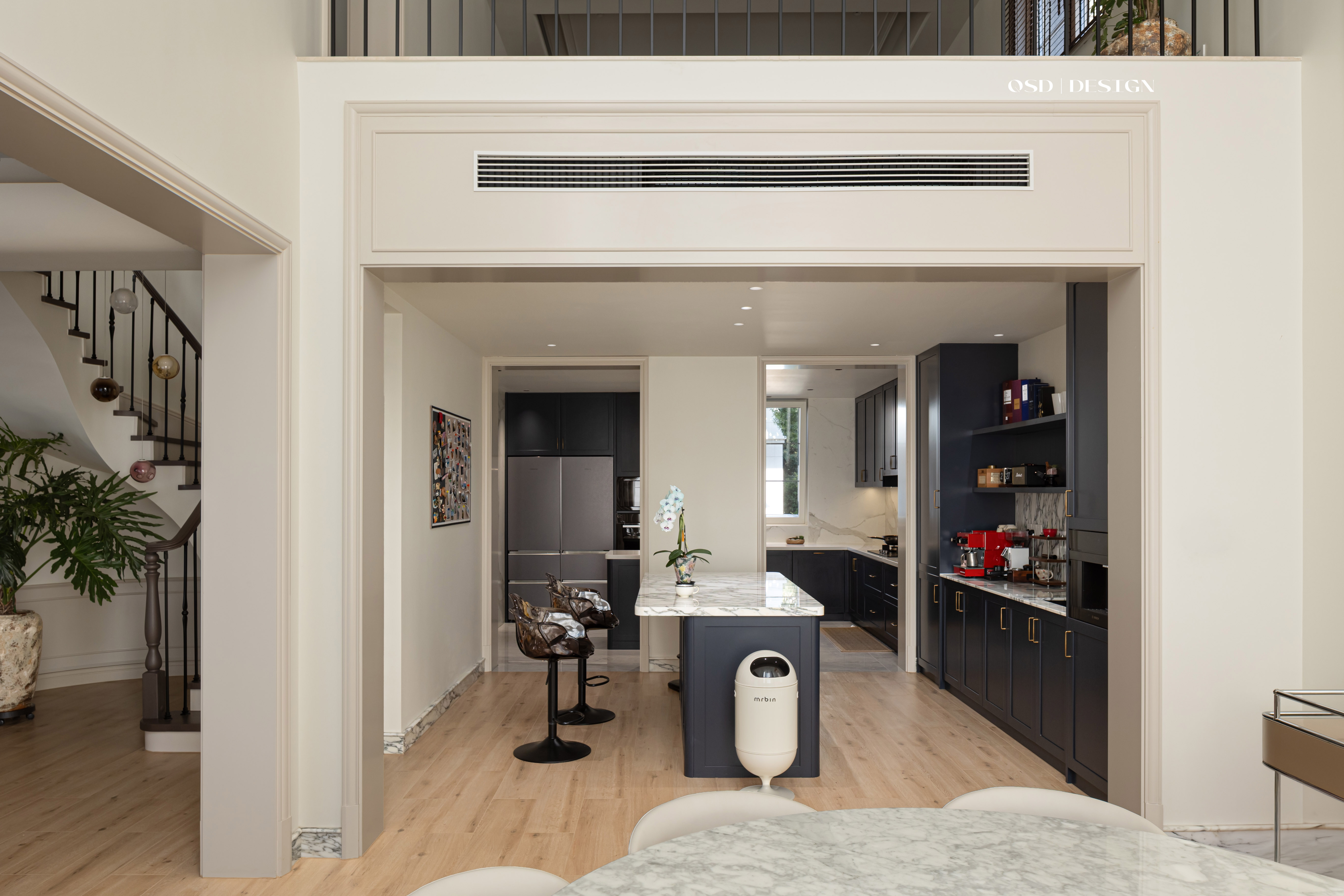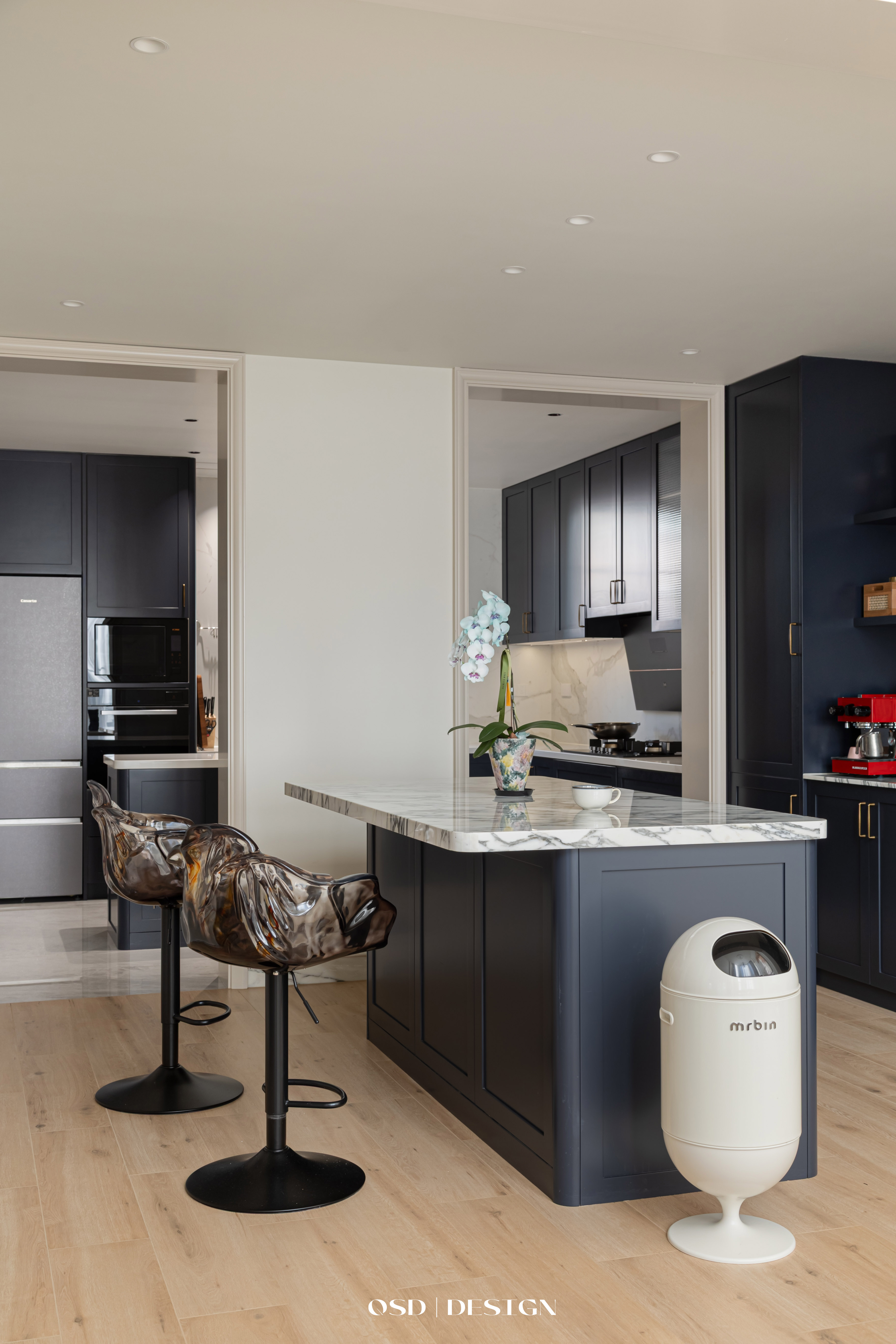 西厨区域吧台柜采用墨蓝色烤漆面板,搭配宝格丽大理石台面,金色拉手点缀,兼顾收纳与美观。 -