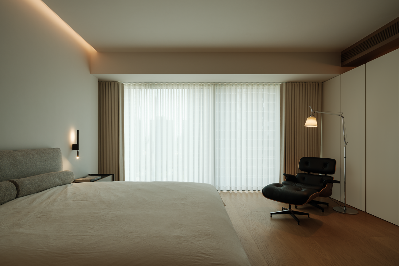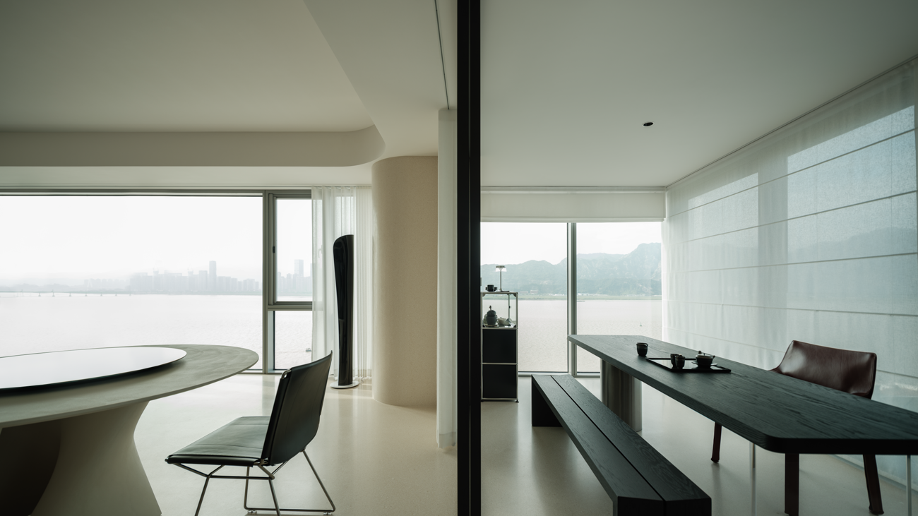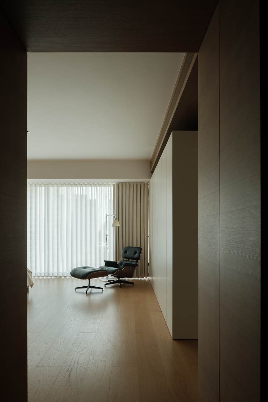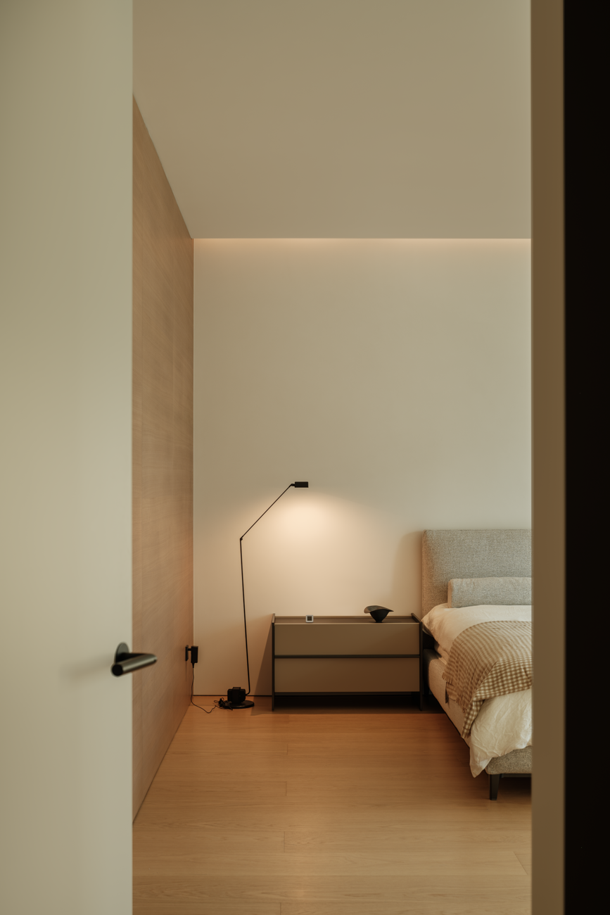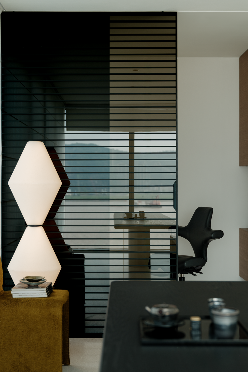 空间意境:客厅以黑白为基调,大量的白色铺陈,如同一张纯净的画布,让自然光与江光在此折射出更通透的明亮感,黑色的纳入则更像是空间的重量锚点,打造层次分明的视觉韵律。而对装饰的极致克制,既在保持“画布”的纯净,也指引着居者将更多地注意力集中于窗外的视野。品茗区被设置于餐厅后方,通过移门的开合,与公区形成微妙的弹性关系。当移门闭合,独处的场景悄然呈现,江景也并未被隔绝在外,煮茶间氤氲的水汽与窗外绵绵江涛形成沉默的共鸣;移门打开,这处私密区域又转化为社交的延伸,这种可调节的存在,恰是对现代人“既需要独处的沉淀,也渴望联结的温度”的精准回应。与公区的黑白理性截然不同,卧室则使用了更多的原木材质,表达温馨柔和的质感,计刻意剥离了多余的装饰,通过适当的留白,为日后的生活预留成长的土壤。空间并未追求全域明亮的绝对性,反而刻意保留适当的暗区,从而让光线侵入空间的路径被反复勾勒,成为几何性的艺术伏笔。阴影赋予光明以意义,暗区指引人们向明亮处聚集,这种光的梯度自然而然地引导家庭成员走向更亲密的互动。
