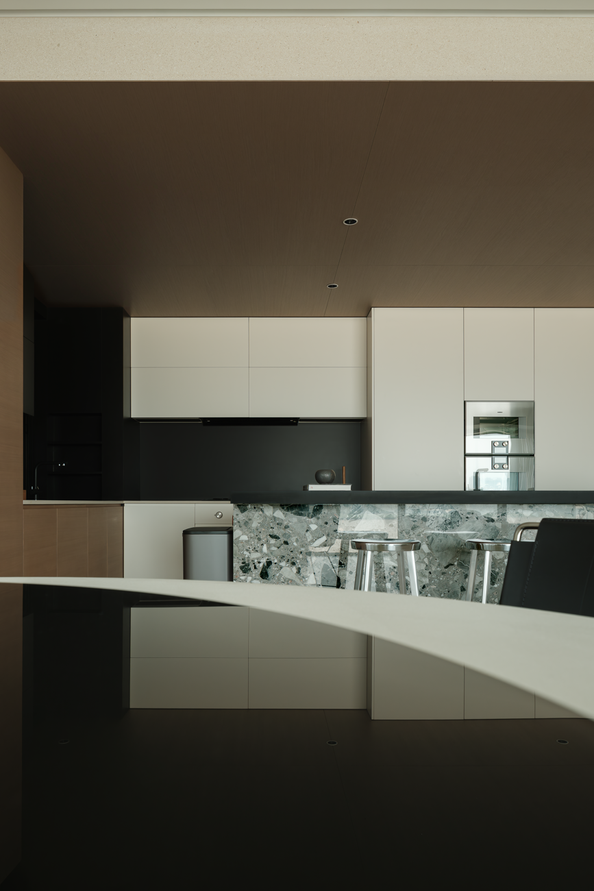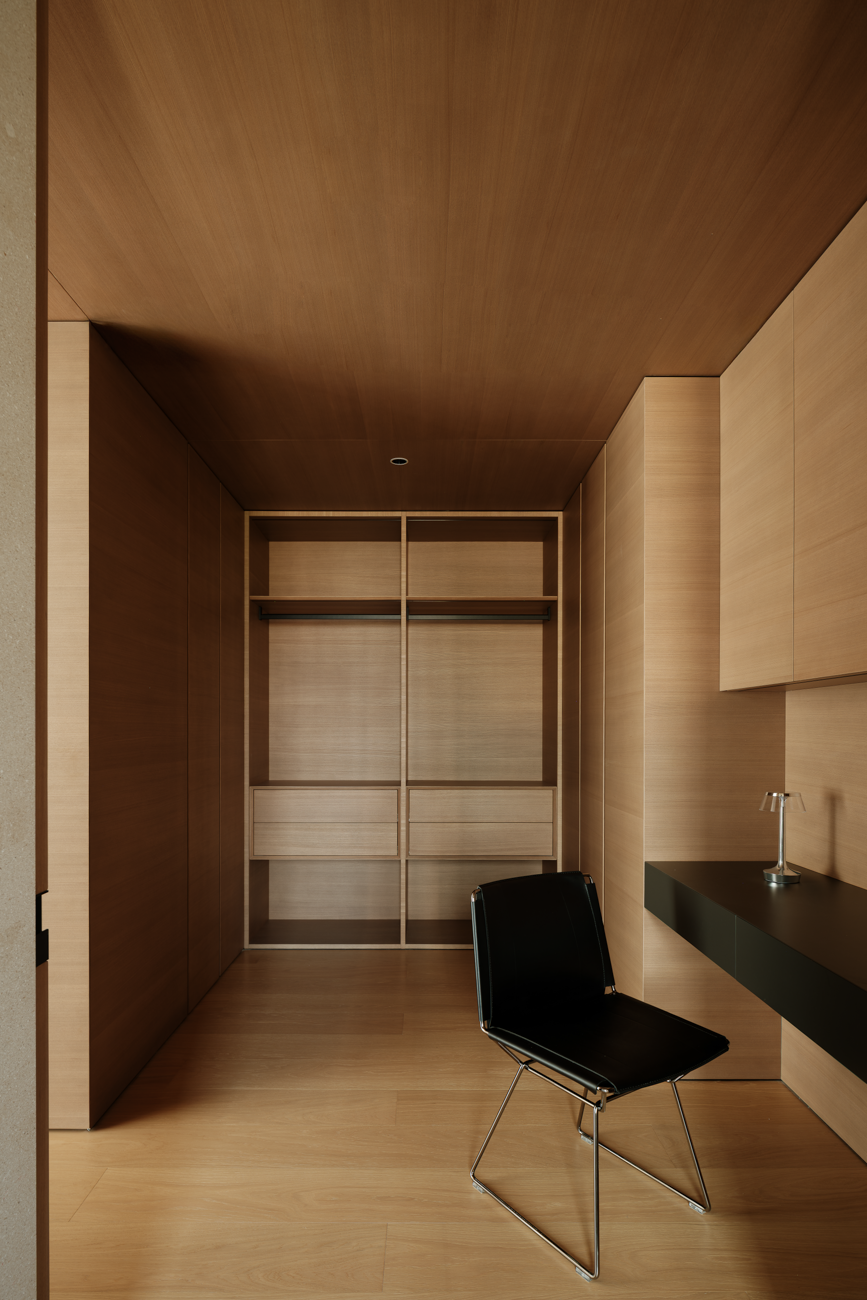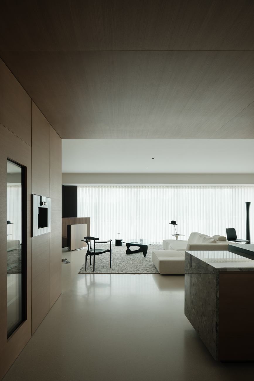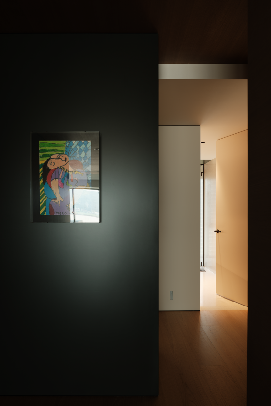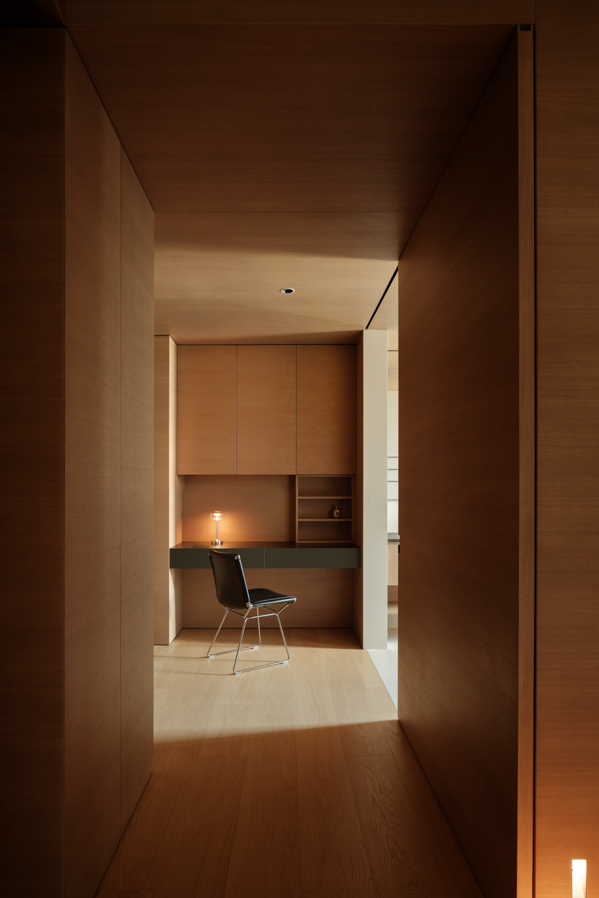 空间意境:客厅以黑白为基调,大量的白色铺陈,如同一张纯净的画布,让自然光与江光在此折射出更通透的明亮感,黑色的纳入则更像是空间的重量锚点,打造层次分明的视觉韵律。而对装饰的极致克制,既在保持“画布”的纯净,也指引着居者将更多地注意力集中于窗外的视野。品茗区被设置于餐厅后方,通过移门的开合,与公区形成微妙的弹性关系。当移门闭合,独处的场景悄然呈现,江景也并未被隔绝在外,煮茶间氤氲的水汽与窗外绵绵江涛形成沉默的共鸣;移门打开,这处私密区域又转化为社交的延伸,这种可调节的存在,恰是对现代人“既需要独处的沉淀,也渴望联结的温度”的精准回应。与公区的黑白理性截然不同,卧室则使用了更多的原木材质,表达温馨柔和的质感,计刻意剥离了多余的装饰,通过适当的留白,为日后的生活预留成长的土壤。空间并未追求全域明亮的绝对性,反而刻意保留适当的暗区,从而让光线侵入空间的路径被反复勾勒,成为几何性的艺术伏笔。阴影赋予光明以意义,暗区指引人们向明亮处聚集,这种光的梯度自然而然地引导家庭成员走向更亲密的互动。
