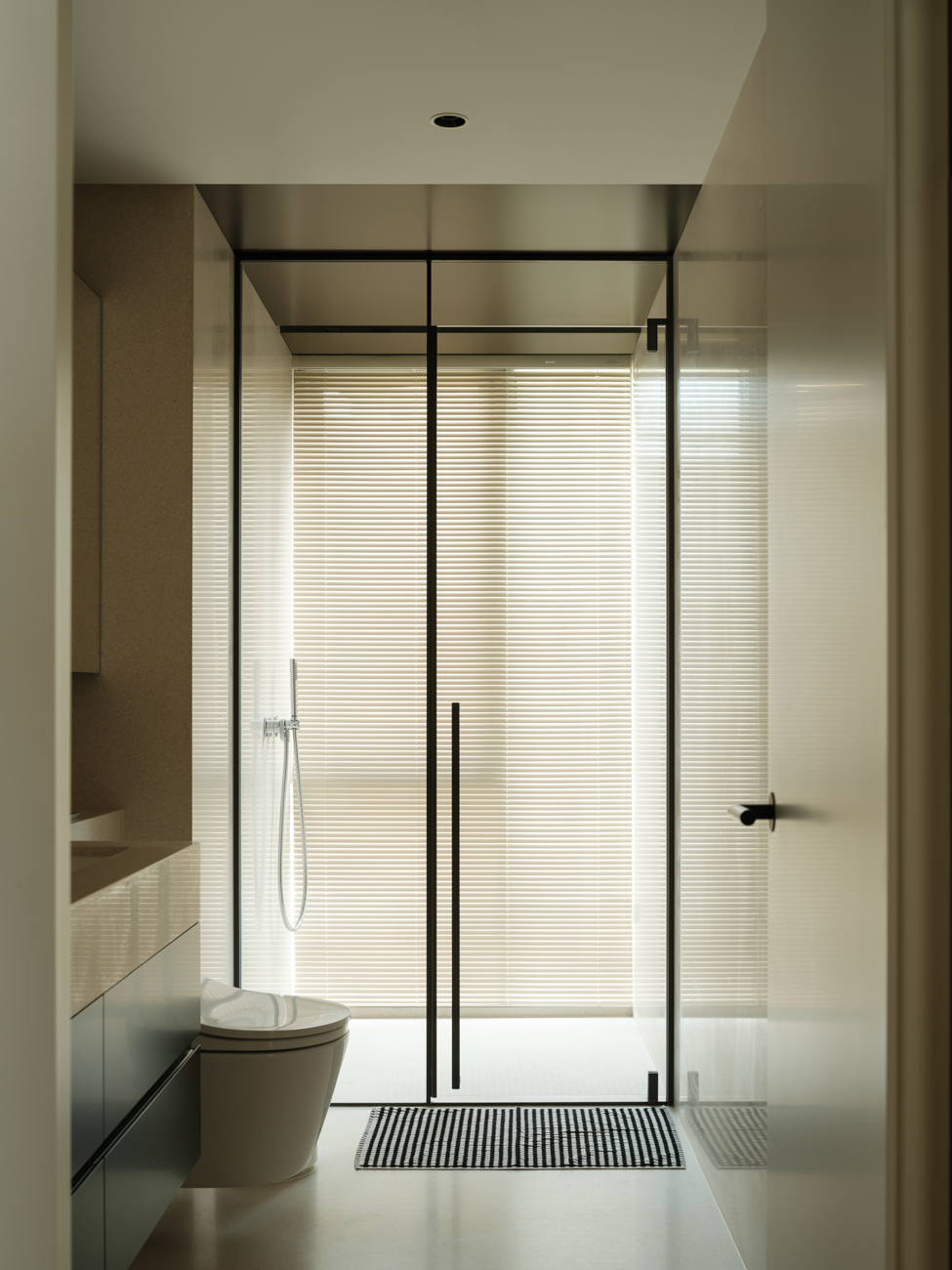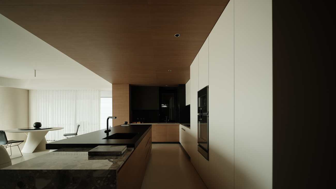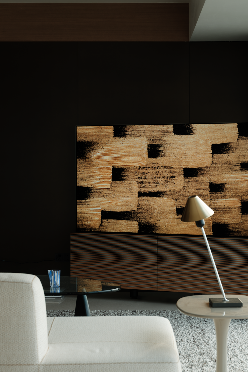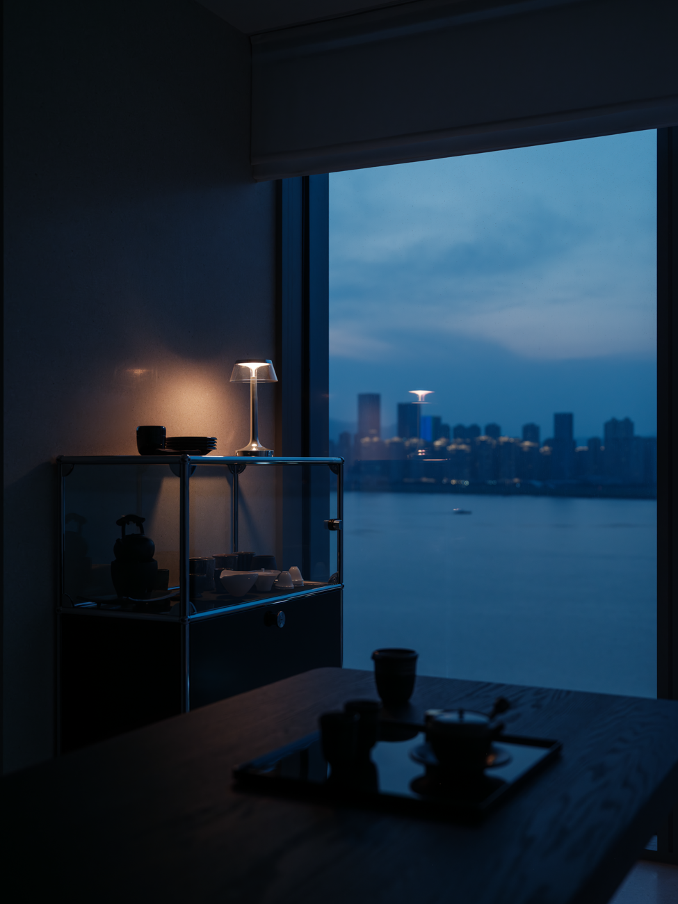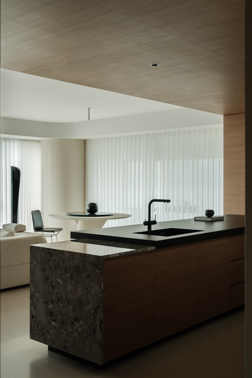 空间意境:客厅以黑白为基调,大量的白色铺陈,如同一张纯净的画布,让自然光与江光在此折射出更通透的明亮感,黑色的纳入则更像是空间的重量锚点,打造层次分明的视觉韵律。而对装饰的极致克制,既在保持“画布”的纯净,也指引着居者将更多地注意力集中于窗外的视野。品茗区被设置于餐厅后方,通过移门的开合,与公区形成微妙的弹性关系。当移门闭合,独处的场景悄然呈现,江景也并未被隔绝在外,煮茶间氤氲的水汽与窗外绵绵江涛形成沉默的共鸣;移门打开,这处私密区域又转化为社交的延伸,这种可调节的存在,恰是对现代人“既需要独处的沉淀,也渴望联结的温度”的精准回应。与公区的黑白理性截然不同,卧室则使用了更多的原木材质,表达温馨柔和的质感,计刻意剥离了多余的装饰,通过适当的留白,为日后的生活预留成长的土壤。空间并未追求全域明亮的绝对性,反而刻意保留适当的暗区,从而让光线侵入空间的路径被反复勾勒,成为几何性的艺术伏笔。阴影赋予光明以意义,暗区指引人们向明亮处聚集,这种光的梯度自然而然地引导家庭成员走向更亲密的互动。