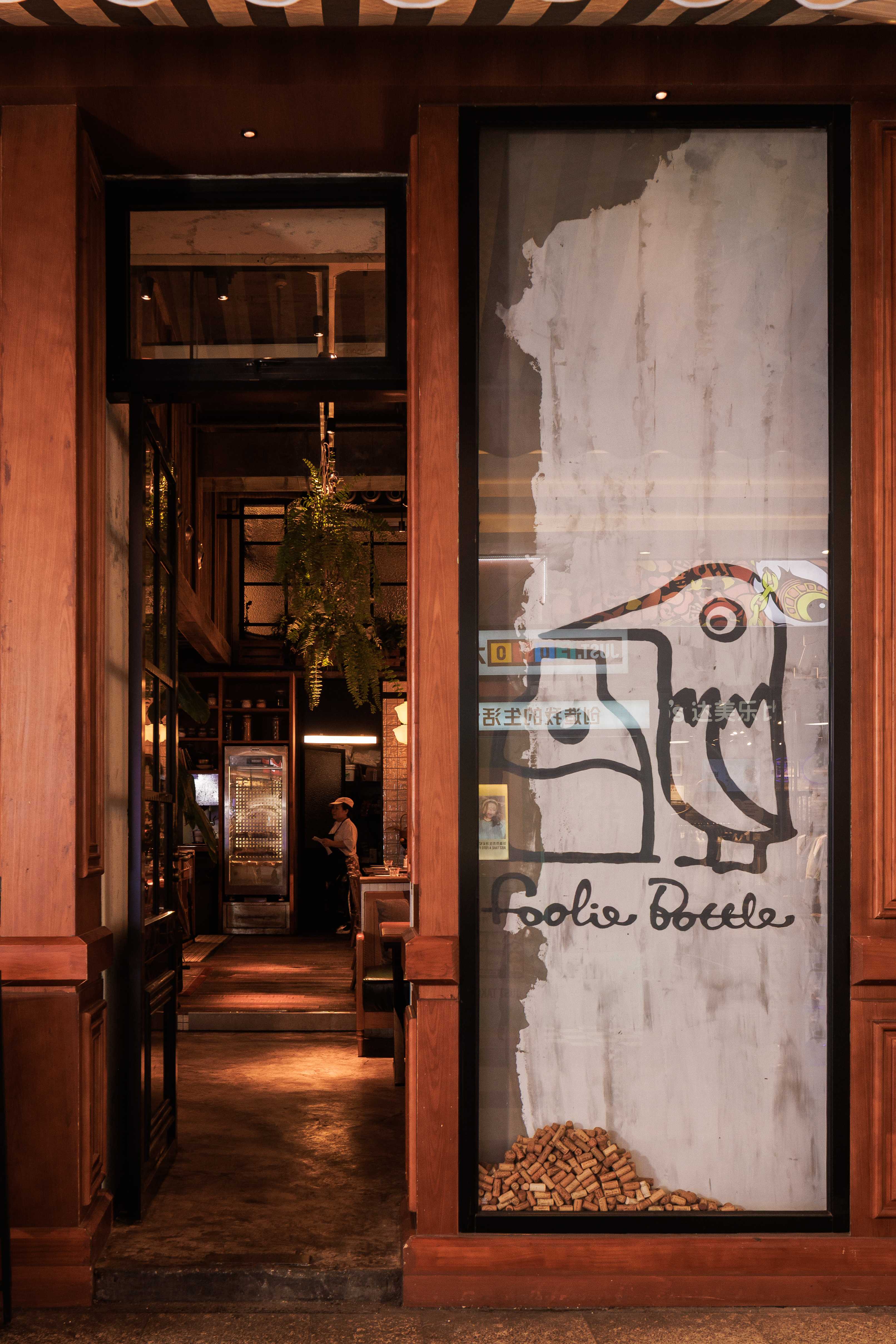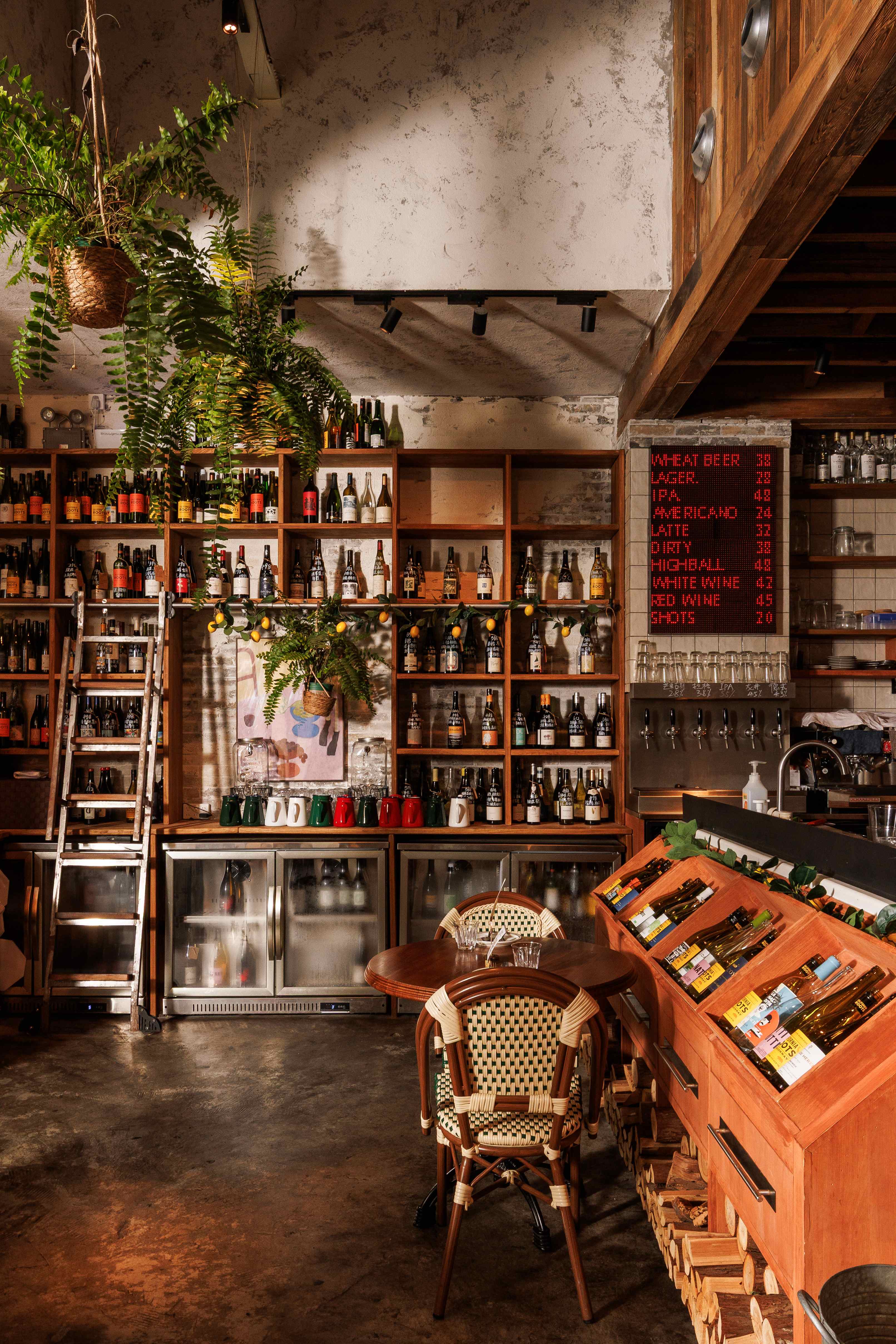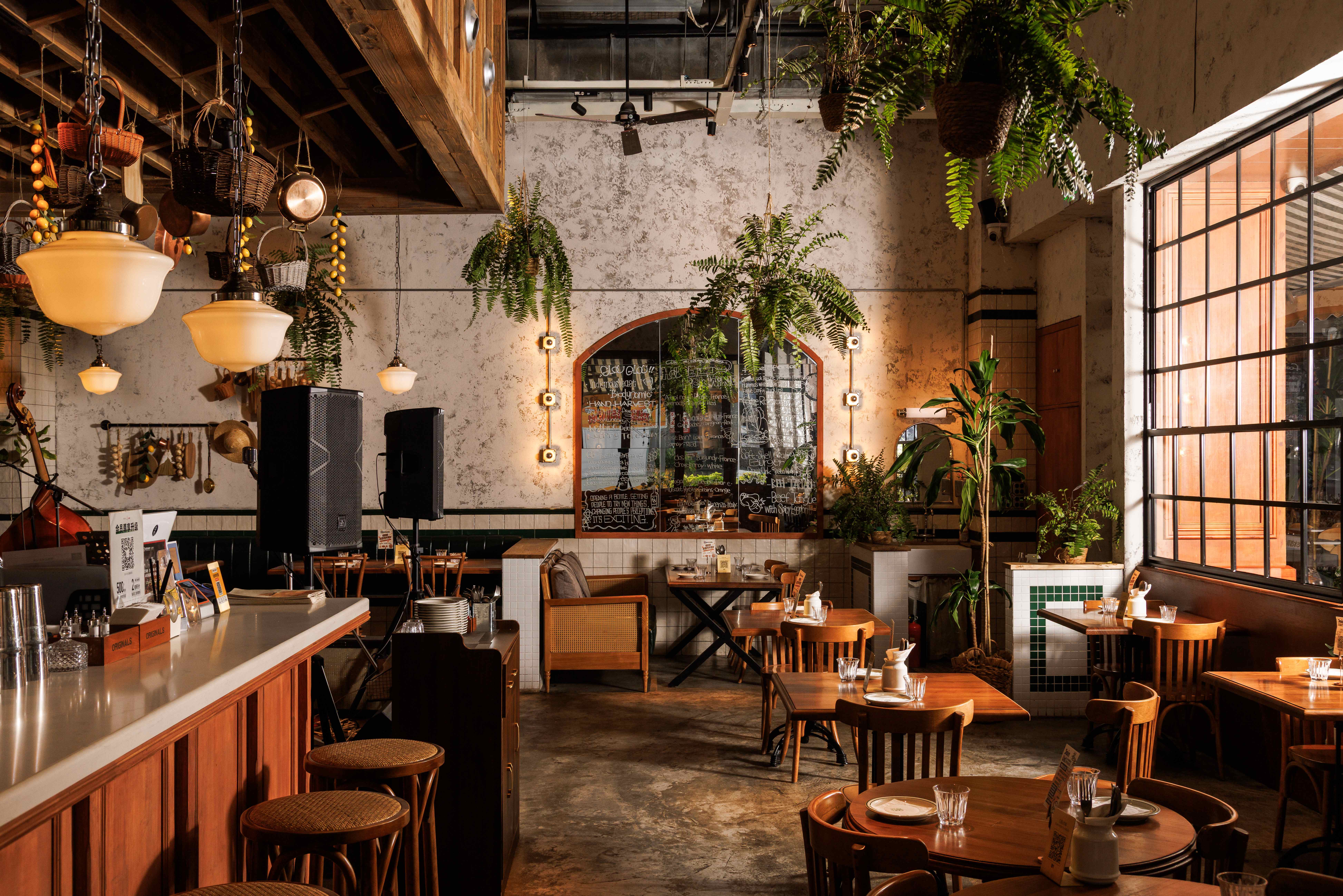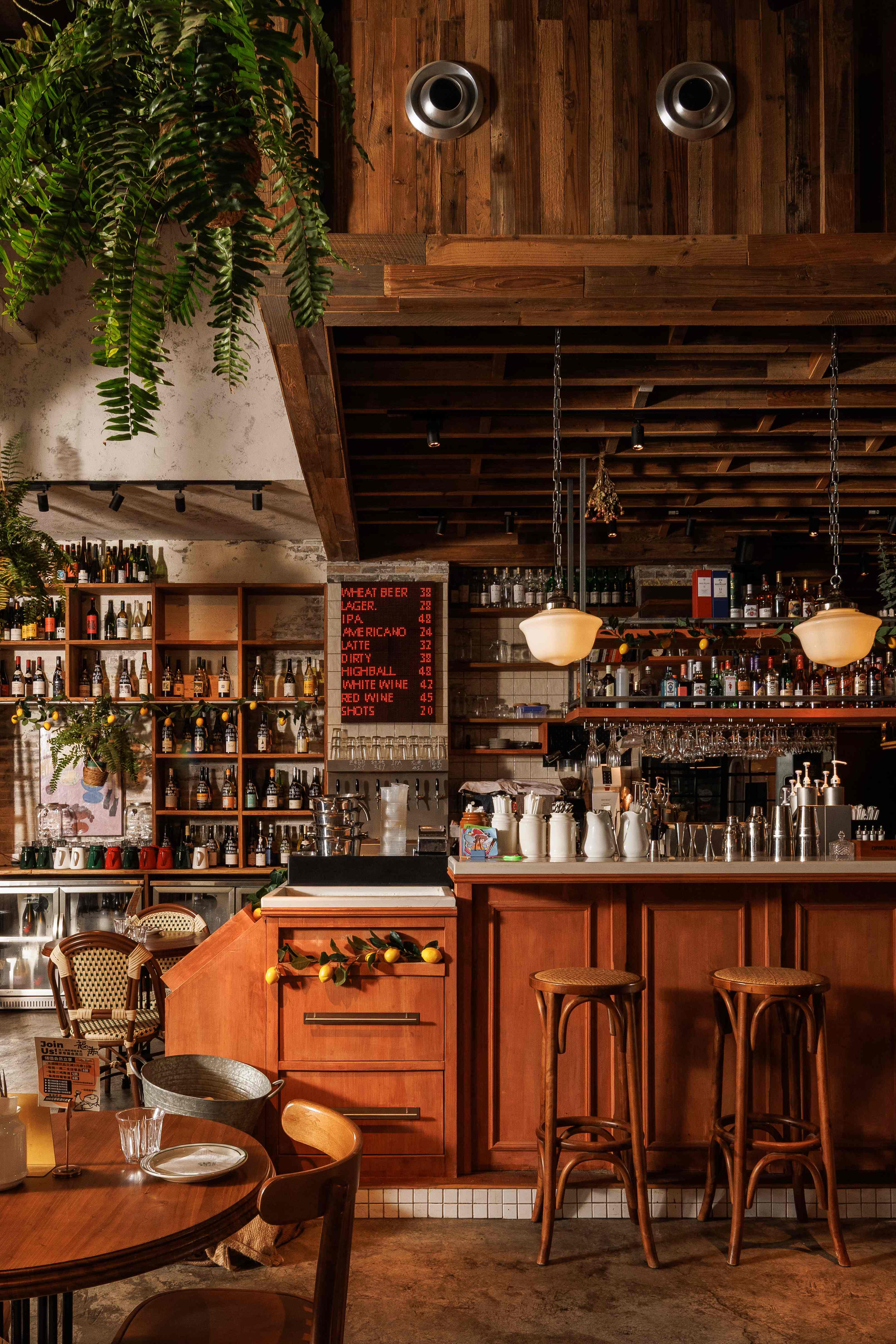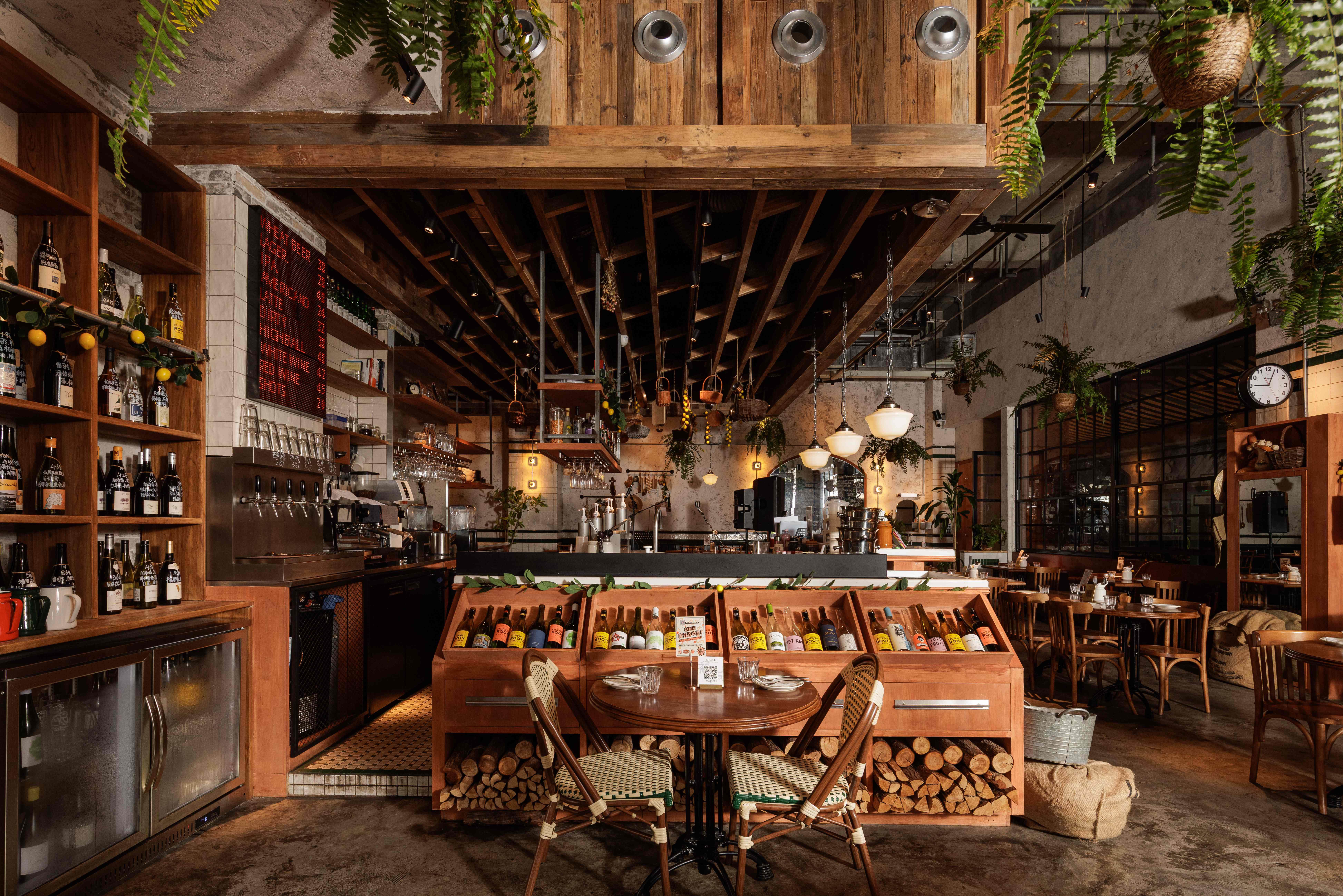 项目定位:福瓶FoolieBottle的设计定位是“都市中的花园”。它摒弃传统餐厅的封闭与形式感,旨在都市街角打造一个如法国小馆般自在、复古且明亮的“花园式”开放空间。策划思路围绕“松弛哲学”与“真诚连接”展开。通过砸掉隔墙、采用全明厨与挑高设计,物理上打破边界,拉近主厨与食客的距离,营造开放透明的氛围。空间以原生木材与法式乡村风为基调,搭配季节性绿植,塑造中性温润、自然呼吸的场域。其核心是提供一种“留白”的体验,适配从工作餐、下午茶到微醺夜饮的全时段需求,让食材与交流成为真正的主角,实现都市中理想主义的生活轻社交。
