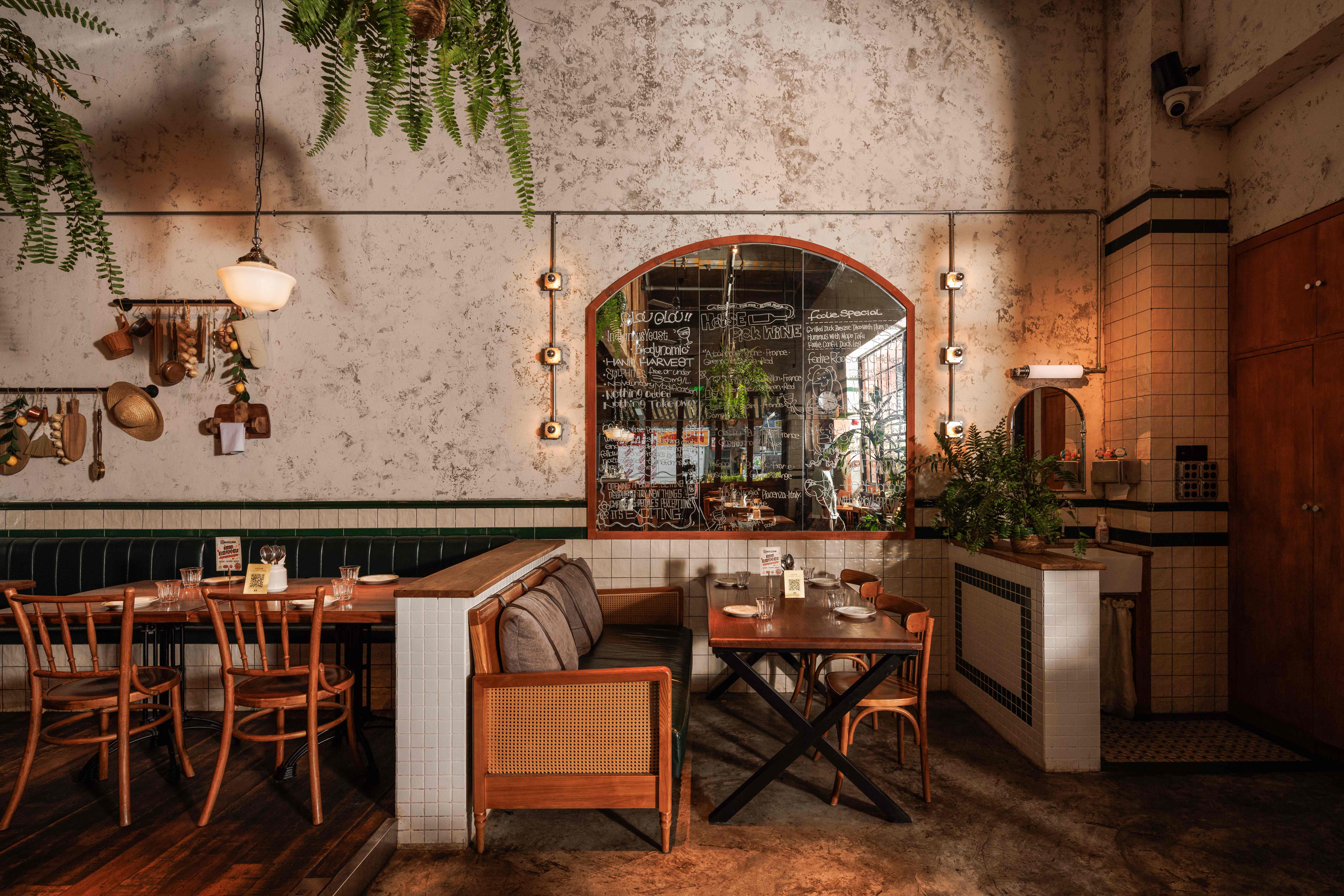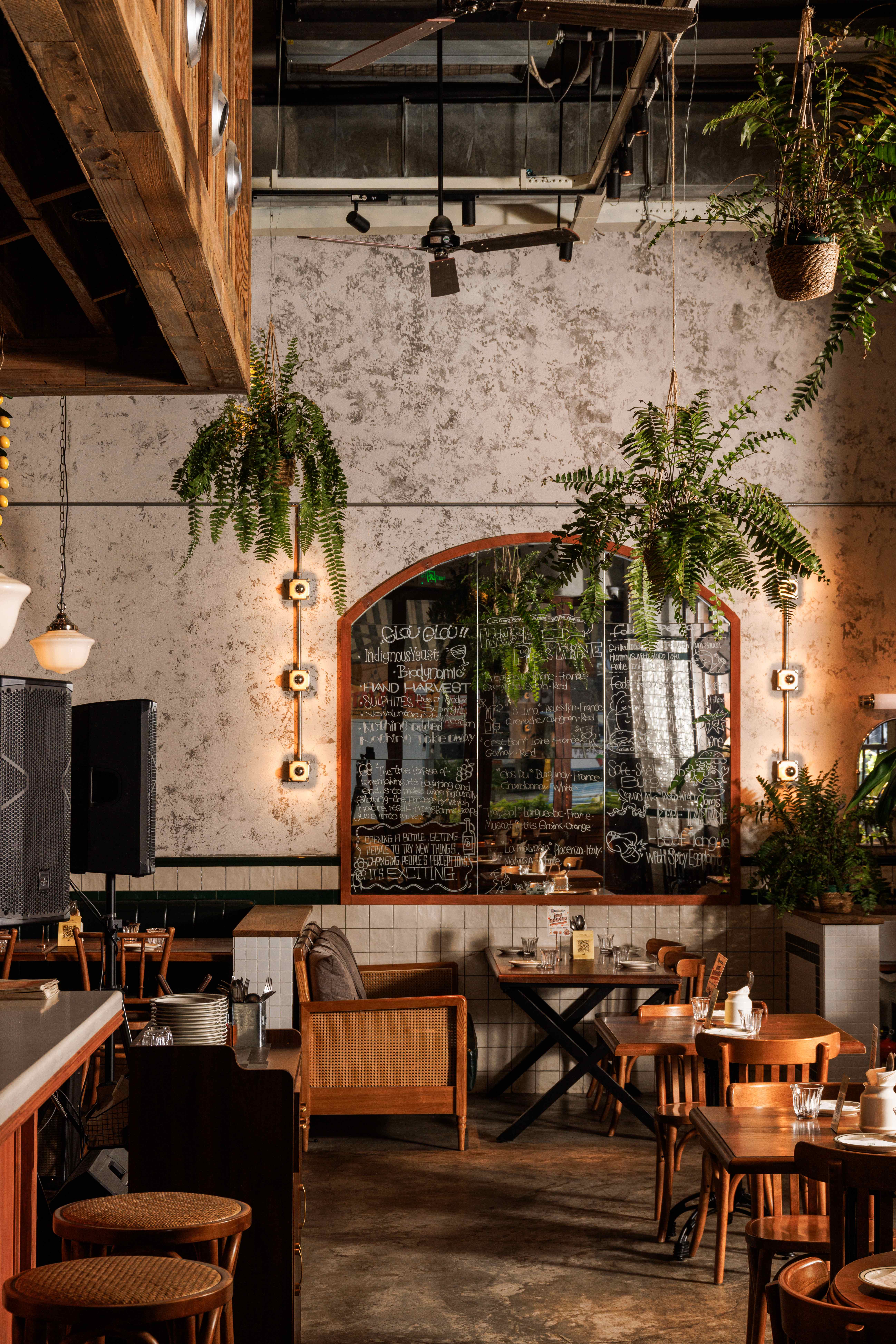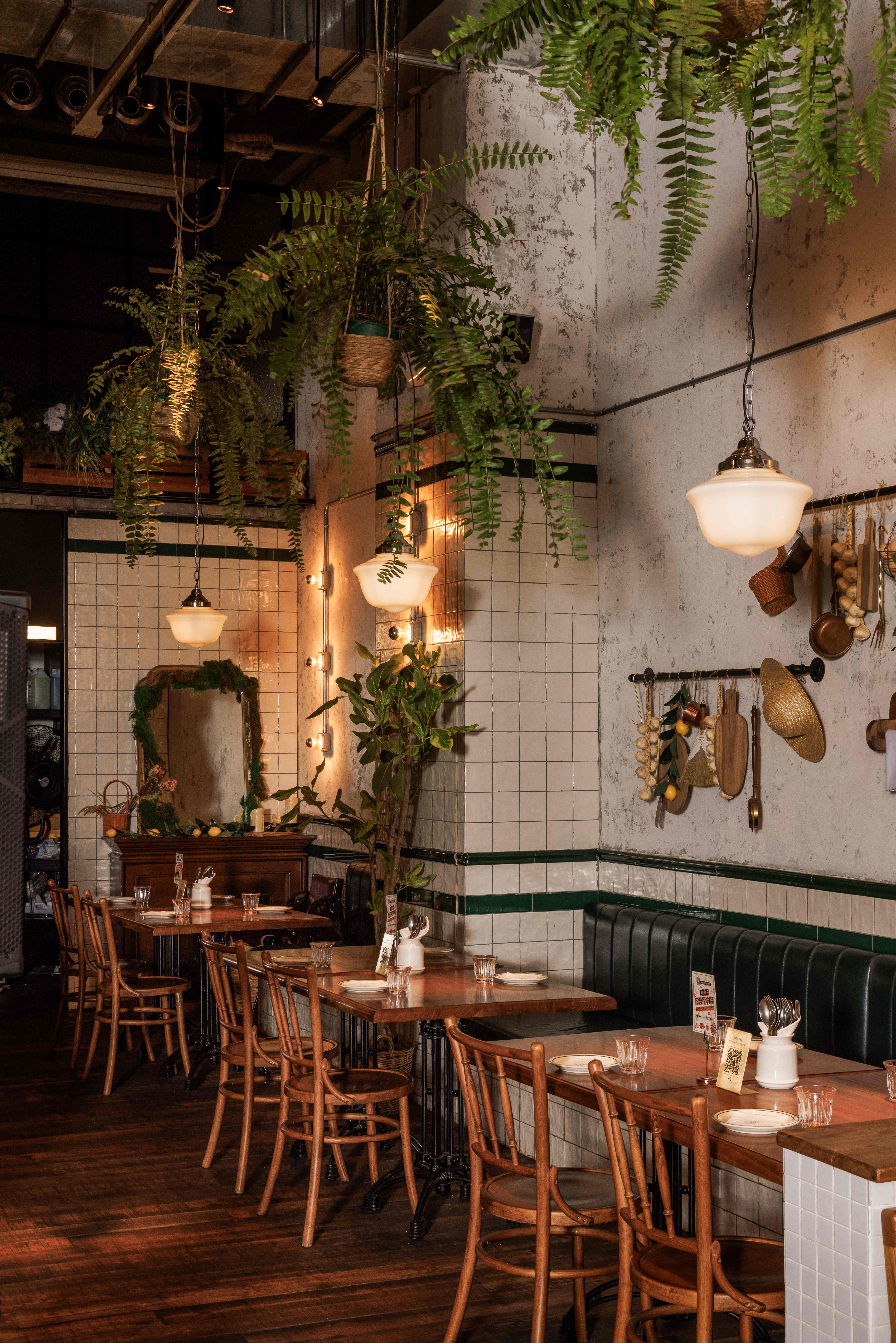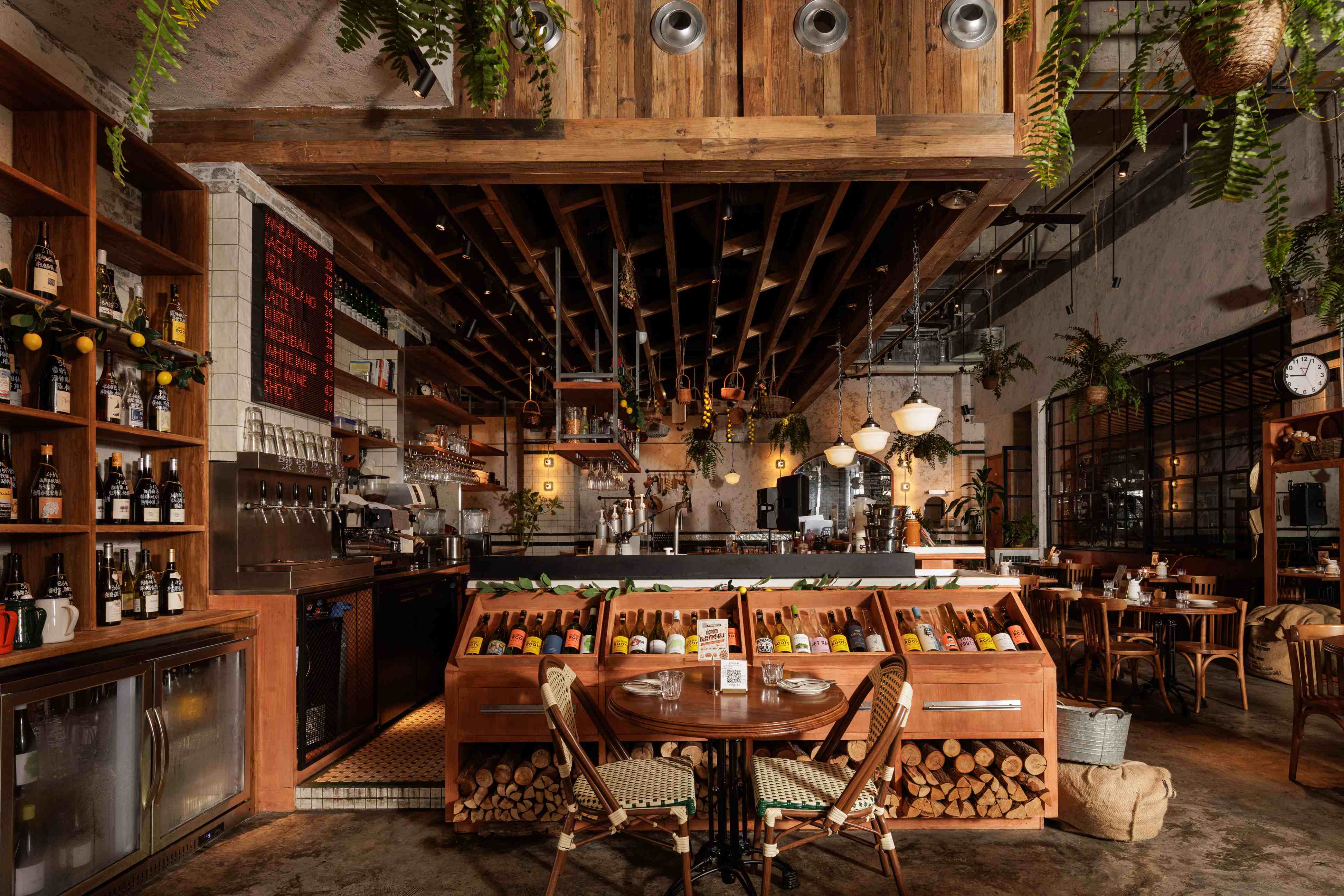 项目定位:福瓶FoolieBottle的设计定位是“都市中的花园”。它摒弃传统餐厅的封闭与形式感,旨在都市街角打造一个如法国小馆般自在、复古且明亮的“花园式”开放空间。策划思路围绕“松弛哲学”与“真诚连接”展开。通过砸掉隔墙、采用全明厨与挑高设计,物理上打破边界,拉近主厨与食客的距离,营造开放透明的氛围。空间以原生木材与法式乡村风为基调,搭配季节性绿植,塑造中性温润、自然呼吸的场域。其核心是提供一种“留白”的体验,适配从工作餐、下午茶到微醺夜饮的全时段需求,让食材与交流成为真正的主角,实现都市中理想主义的生活轻社交。