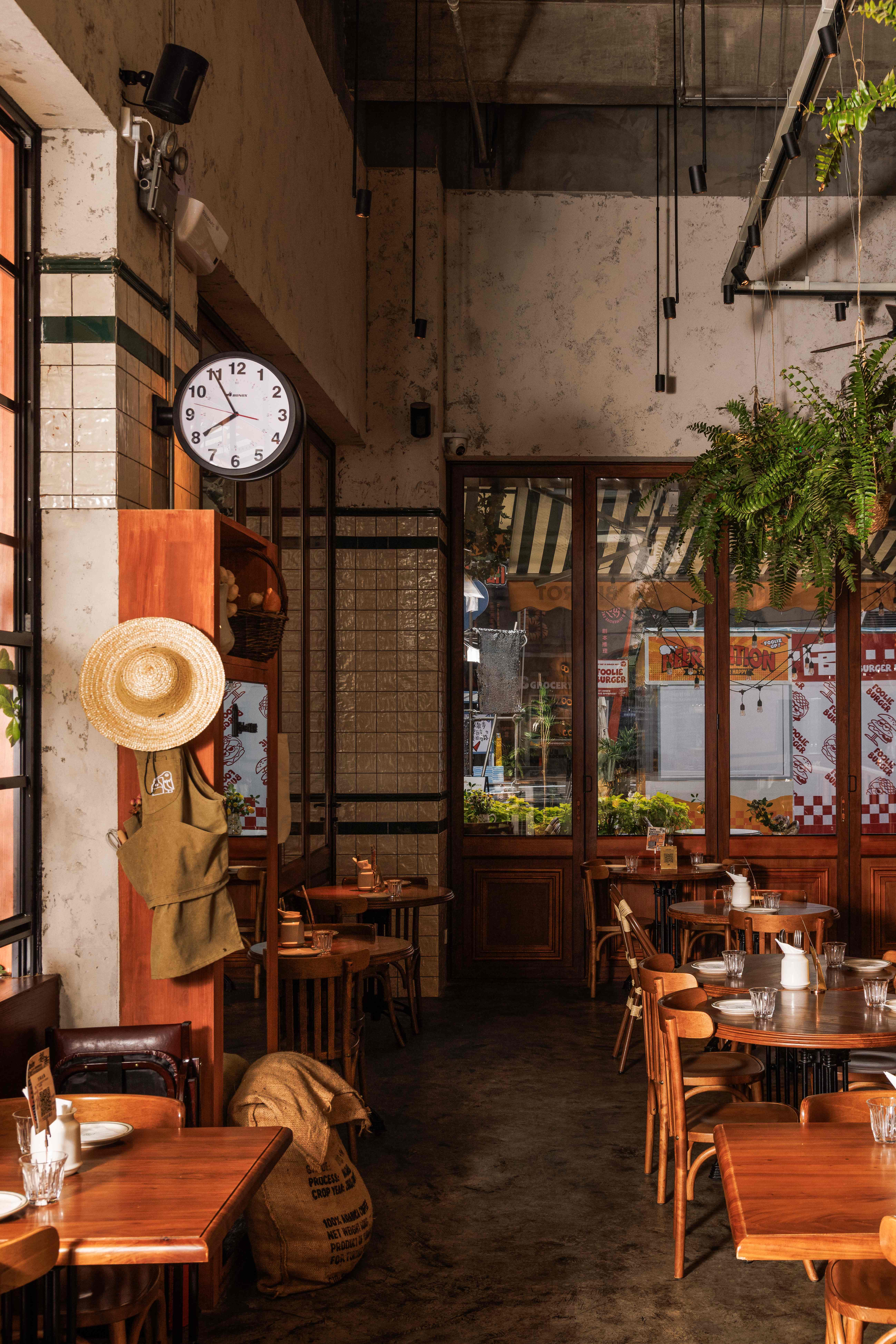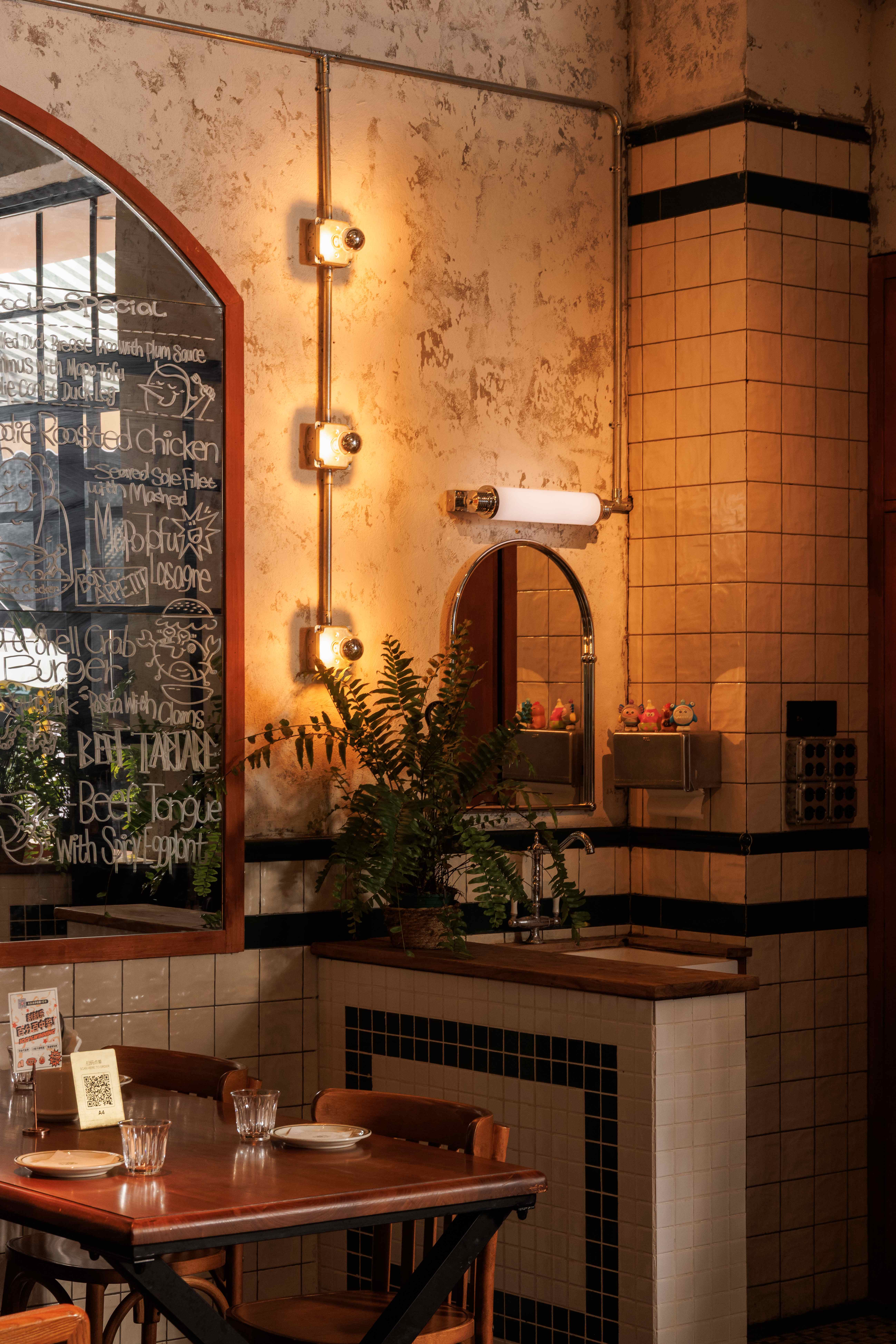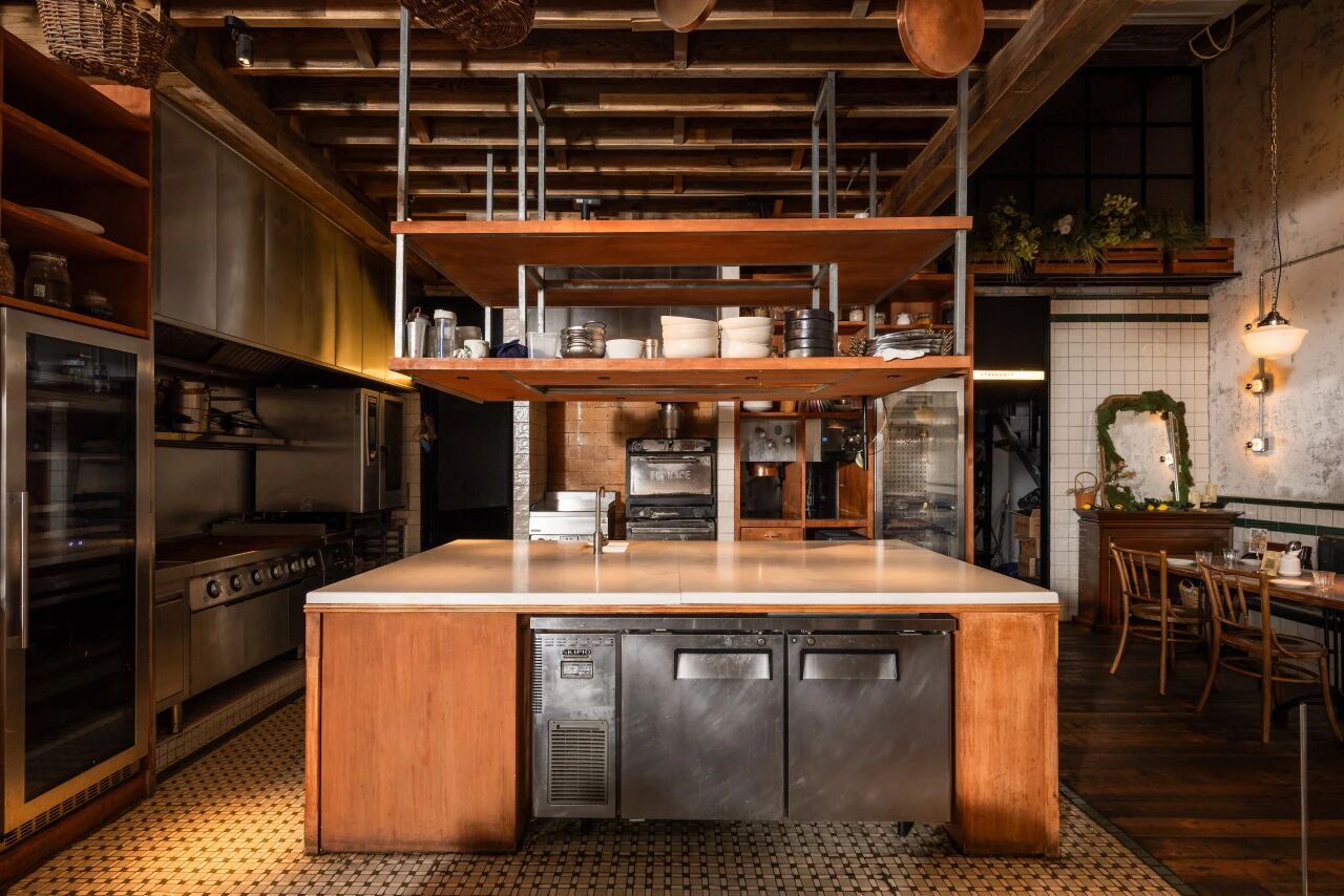 空间意境:将原有工业基底、法式乡村温情与当代松弛美学进行非刻意的融合。老风化木板与水泥自流平奠定了质朴且带有时间痕迹的工业感,而复古拼花瓷砖与艺术涂料的局部点缀,则在不经意间注入法式街角的浪漫与色彩活力。其规整而温润的质感,作为新旧之间的调和媒介平衡了粗犷与精致。风格并非单一标签的复刻,而是通过材质对话,营造出一种去设计化、易于亲近的“日常感”高级,契合品牌的轻松哲学。