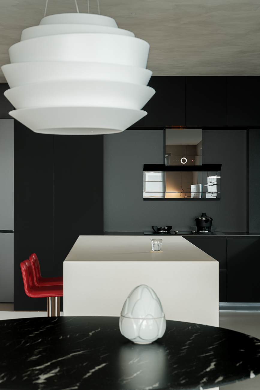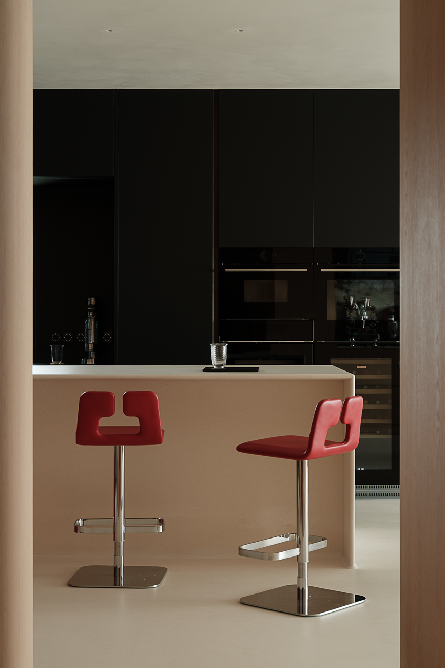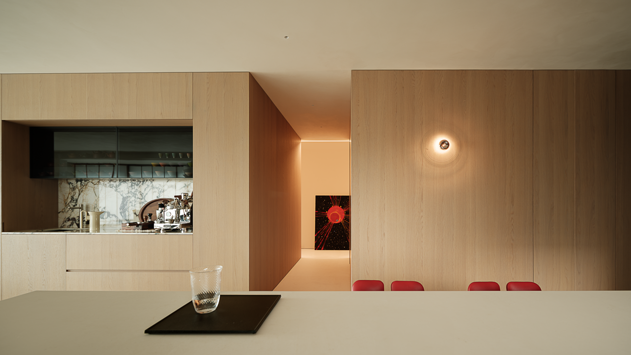 设计选材:浅米白、原木色,到餐厅区域逐渐加深的色调,色彩在空间中形成了如同自然光线带来的微妙渐变,而一抹突兀却恰到好处的亮红色吧椅,打破了中性色调的平衡,为空间注入灵动的活力,材质的触感、光线的温度、空气的流动……这些细微的感知被不断放大,成为了空间的主角。