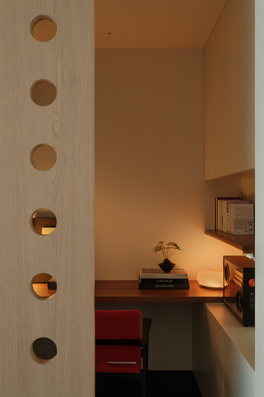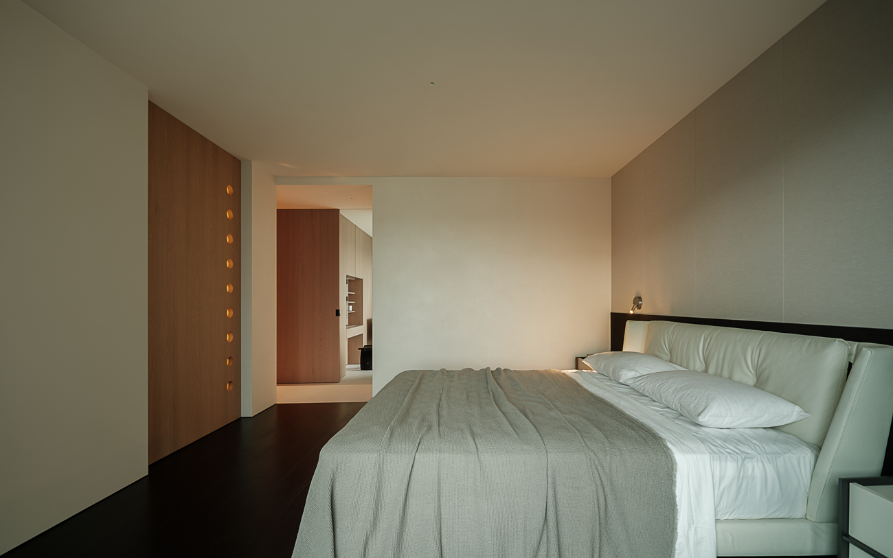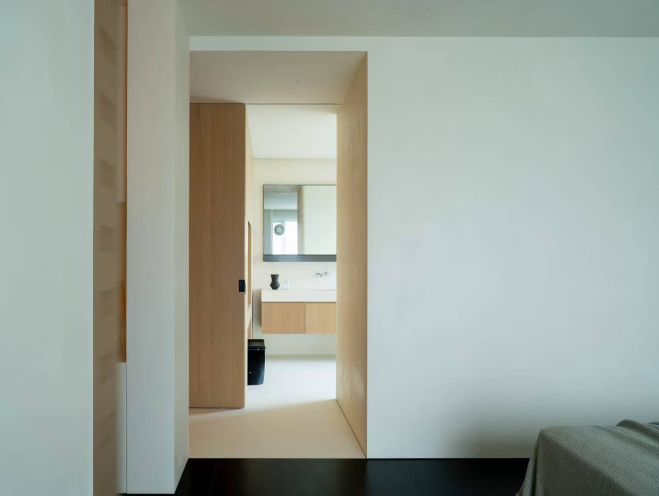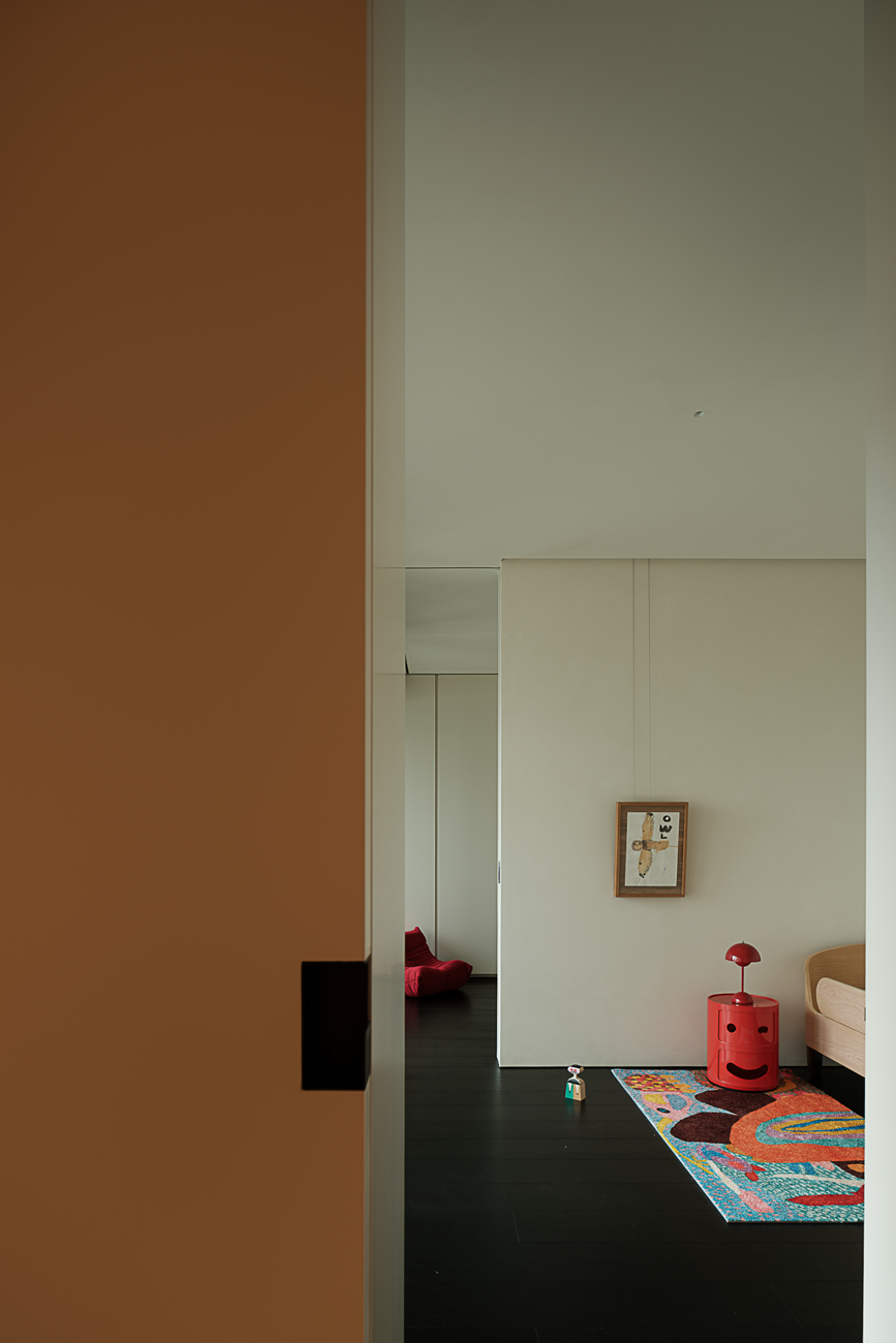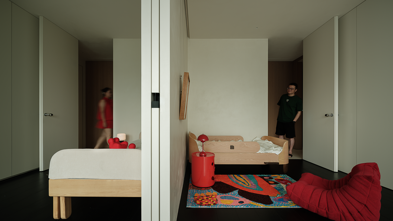 空间意境:面对窗外近邻这一城市居住的典型困境,设计以一道可开合的木格栅屏风作为对隐私的回应,光线经由格栅的宣纸过滤后,形成柔和的漫射,在遮挡窗外视线的同时,为茶室注入悠然的韵味。公共区域的完全贯通,打破了功能分区的传统界限,客厅、餐厅、厨房、茶室形成了连续的空间序列,视线与动线在其中自由穿梭。音乐角、茶席与鱼缸……这些承载着主任爱好的元素,被精心编织进空间的脉络中,彼此连贯呼应,形成一种内在的循环节奏。在无实体隔墙的开放式平面中,色彩的明暗变化便成为了界定空间功能的隐形语言,从客厅区域的浅米白、原木色,到餐厅区域逐渐加深的色调,色彩在空间中形成了如同自然光线带来的微妙渐变,而一抹突兀却恰到好处的亮红色吧椅,打破了中性色调的平衡,为空间注入灵动的活力,暗示着生活本身应有的生动。主卧套房以纯粹的米白与原木材质构筑,摒弃一切冗余的装饰,在这里,设计退居幕后,将空间完全交还给居住者本身的身体感知。套房内整合睡眠区域、三分离式卫生间、更衣空间以及功能简单的书房,构成了一个完整的生活系统,不仅提高了生活效率,更重要的是,它创造了一个完全自足的私密领域,夫妻二人可以在此完成大部分的日常所需,无需频繁地穿越公共区域,从而获得真正意义上的精神独立与安宁。儿童房的设计体现了设计师对更长远的居住时间的考量。通过可开合的联动门系统,联通保姆房与儿童房,在孩子幼年时期便于集中照料;而等到孩子成年后,打开开合结构并入保姆房,形成完整独立的卧房,与另一个备用房间一起,为两个孩子提供各自独立的私享空间。