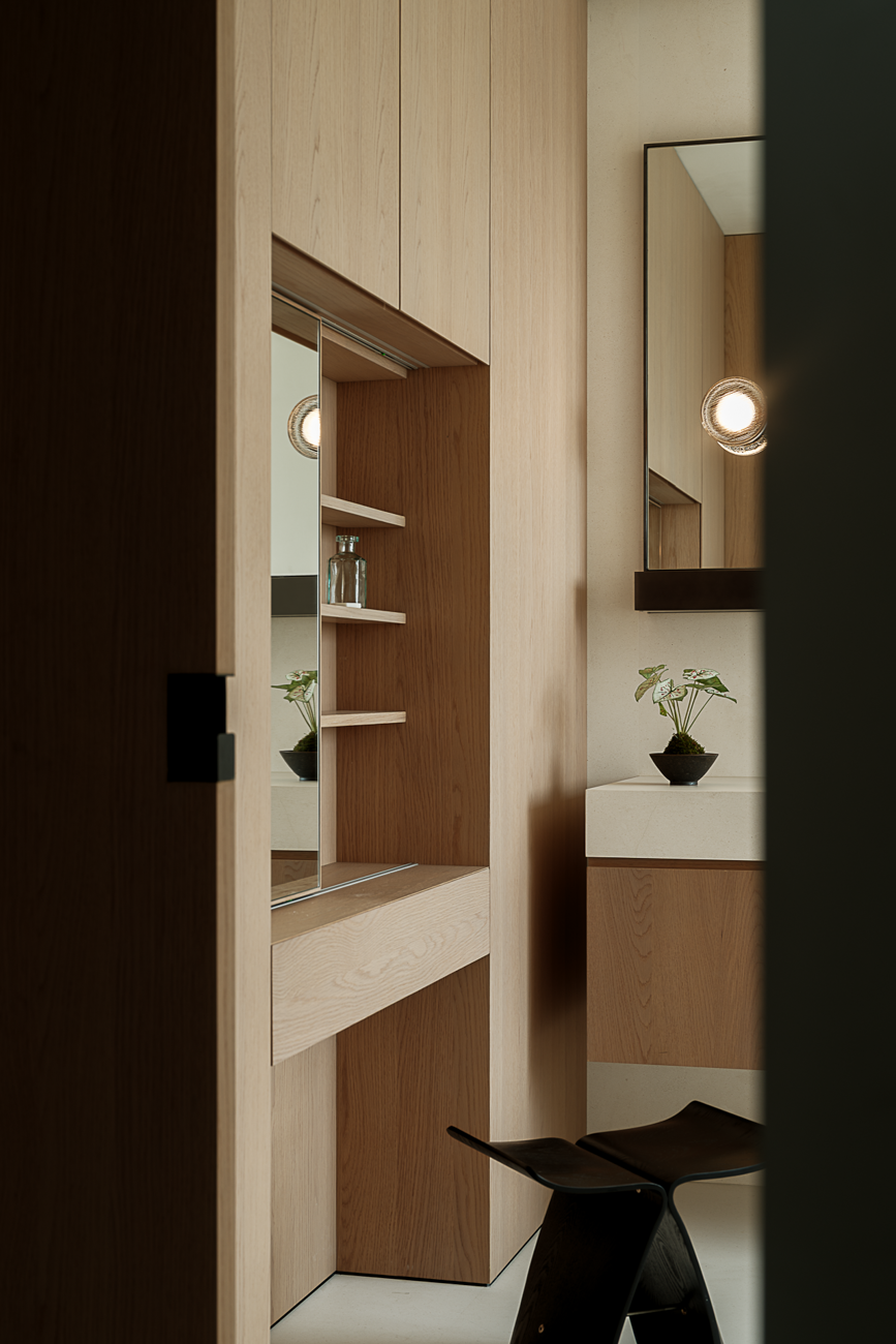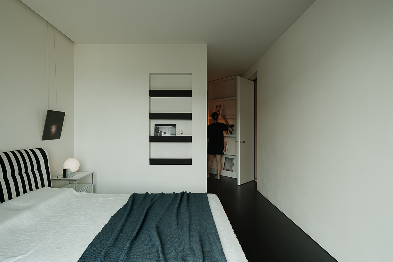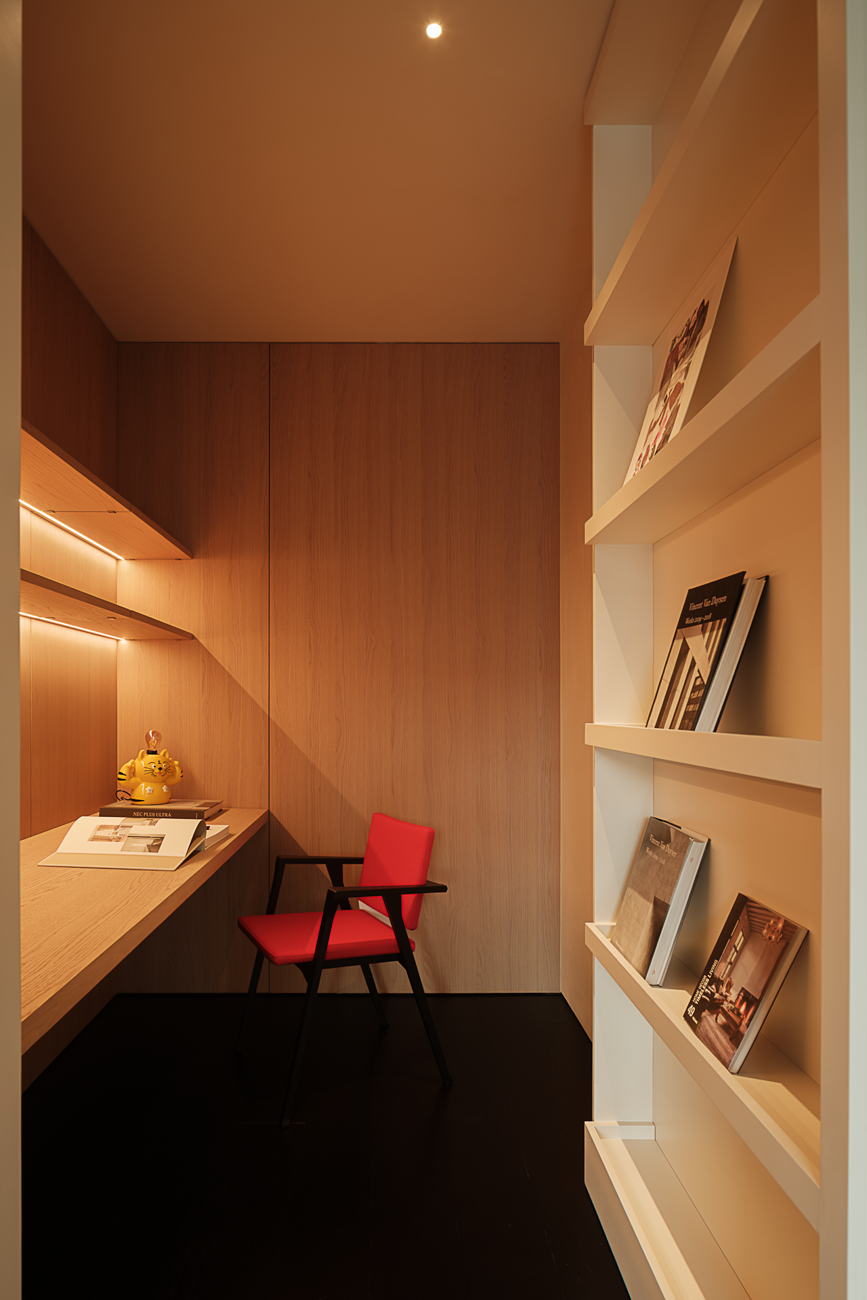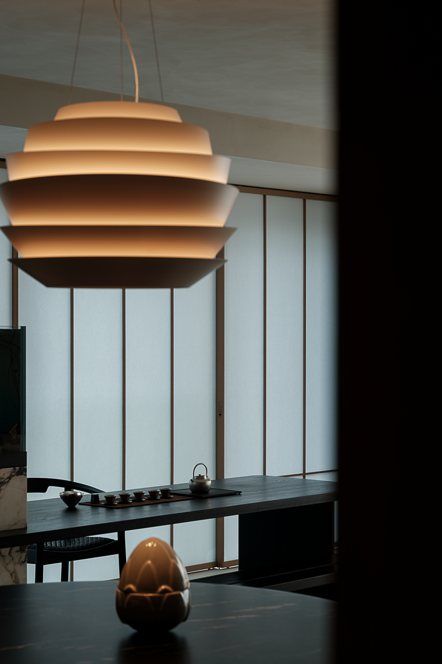 空间意境:面对窗外近邻这一城市居住的典型困境,设计以一道可开合的木格栅屏风作为对隐私的回应,光线经由格栅的宣纸过滤后,形成柔和的漫射,在遮挡窗外视线的同时,为茶室注入悠然的韵味。公共区域的完全贯通,打破了功能分区的传统界限,客厅、餐厅、厨房、茶室形成了连续的空间序列,视线与动线在其中自由穿梭。音乐角、茶席与鱼缸……这些承载着主任爱好的元素,被精心编织进空间的脉络中,彼此连贯呼应,形成一种内在的循环节奏。在无实体隔墙的开放式平面中,色彩的明暗变化便成为了界定空间功能的隐形语言,从客厅区域的浅米白、原木色,到餐厅区域逐渐加深的色调,色彩在空间中形成了如同自然光线带来的微妙渐变,而一抹突兀却恰到好处的亮红色吧椅,打破了中性色调的平衡,为空间注入灵动的活力,暗示着生活本身应有的生动。主卧套房以纯粹的米白与原木材质构筑,摒弃一切冗余的装饰,在这里,设计退居幕后,将空间完全交还给居住者本身的身体感知。套房内整合睡眠区域、三分离式卫生间、更衣空间以及功能简单的书房,构成了一个完整的生活系统,不仅提高了生活效率,更重要的是,它创造了一个完全自足的私密领域,夫妻二人可以在此完成大部分的日常所需,无需频繁地穿越公共区域,从而获得真正意义上的精神独立与安宁。儿童房的设计体现了设计师对更长远的居住时间的考量。通过可开合的联动门系统,联通保姆房与儿童房,在孩子幼年时期便于集中照料;而等到孩子成年后,打开开合结构并入保姆房,形成完整独立的卧房,与另一个备用房间一起,为两个孩子提供各自独立的私享空间。
