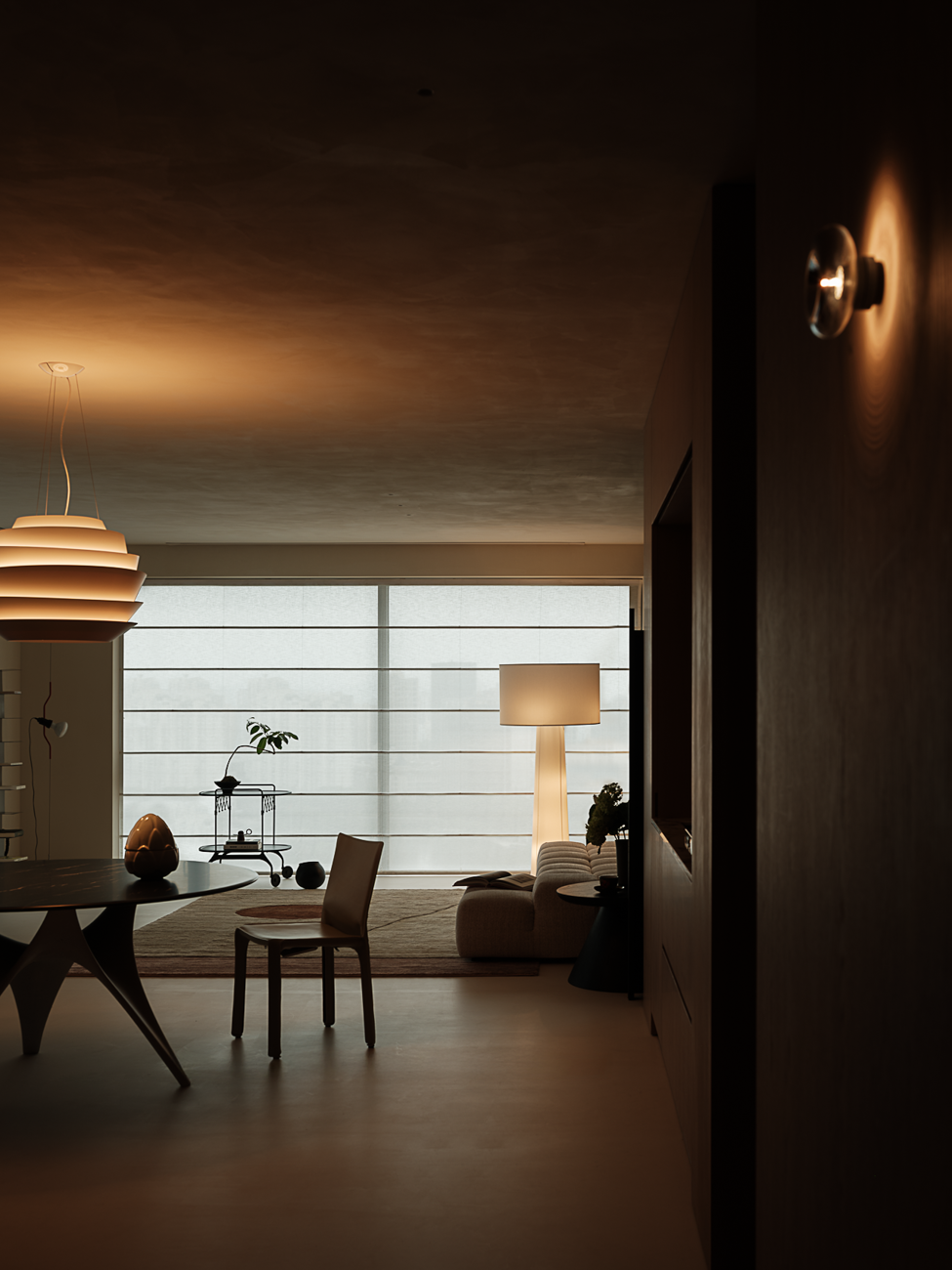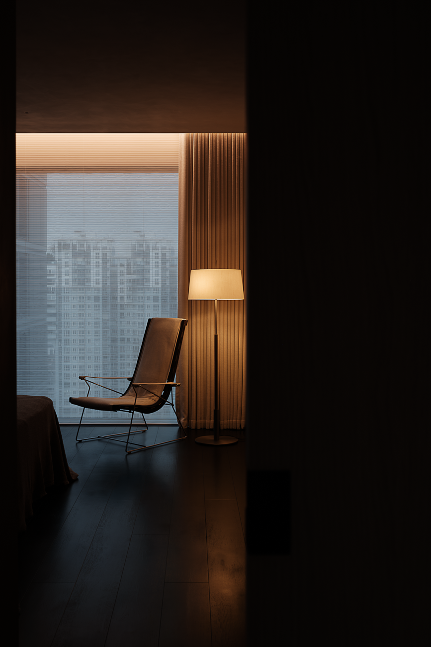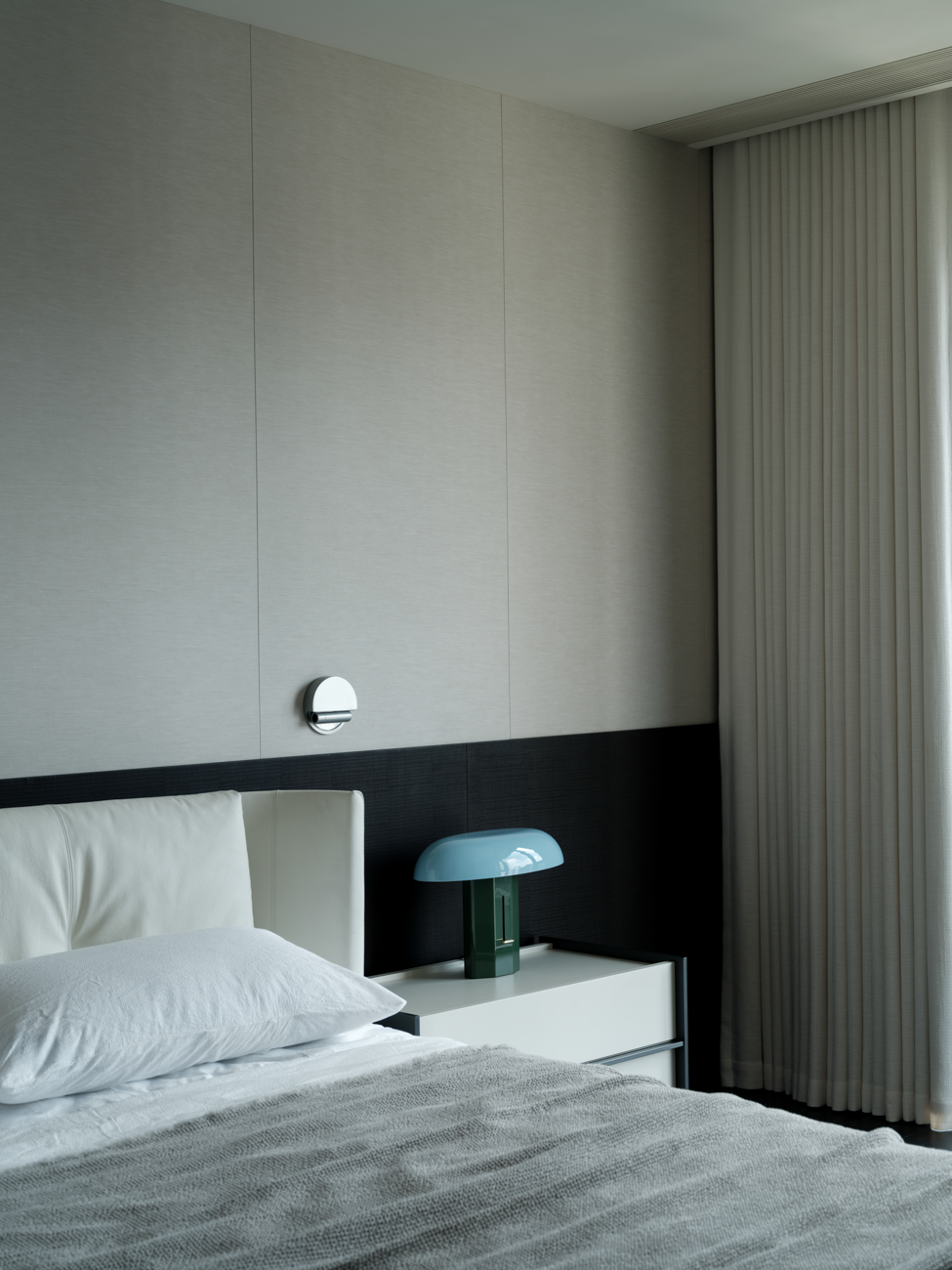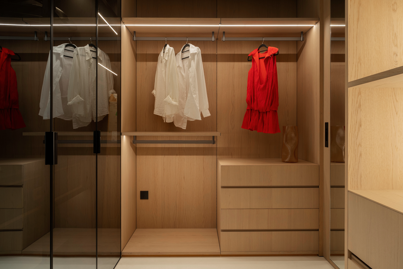 空间意境:面对窗外近邻这一城市居住的典型困境,设计以一道可开合的木格栅屏风作为对隐私的回应,光线经由格栅的宣纸过滤后,形成柔和的漫射,在遮挡窗外视线的同时,为茶室注入悠然的韵味。公共区域的完全贯通,打破了功能分区的传统界限,客厅、餐厅、厨房、茶室形成了连续的空间序列,视线与动线在其中自由穿梭。音乐角、茶席与鱼缸……这些承载着主任爱好的元素,被精心编织进空间的脉络中,彼此连贯呼应,形成一种内在的循环节奏。在无实体隔墙的开放式平面中,色彩的明暗变化便成为了界定空间功能的隐形语言,从客厅区域的浅米白、原木色,到餐厅区域逐渐加深的色调,色彩在空间中形成了如同自然光线带来的微妙渐变,而一抹突兀却恰到好处的亮红色吧椅,打破了中性色调的平衡,为空间注入灵动的活力,暗示着生活本身应有的生动。主卧套房以纯粹的米白与原木材质构筑,摒弃一切冗余的装饰,在这里,设计退居幕后,将空间完全交还给居住者本身的身体感知。套房内整合睡眠区域、三分离式卫生间、更衣空间以及功能简单的书房,构成了一个完整的生活系统,不仅提高了生活效率,更重要的是,它创造了一个完全自足的私密领域,夫妻二人可以在此完成大部分的日常所需,无需频繁地穿越公共区域,从而获得真正意义上的精神独立与安宁。儿童房的设计体现了设计师对更长远的居住时间的考量。通过可开合的联动门系统,联通保姆房与儿童房,在孩子幼年时期便于集中照料;而等到孩子成年后,打开开合结构并入保姆房,形成完整独立的卧房,与另一个备用房间一起,为两个孩子提供各自独立的私享空间。