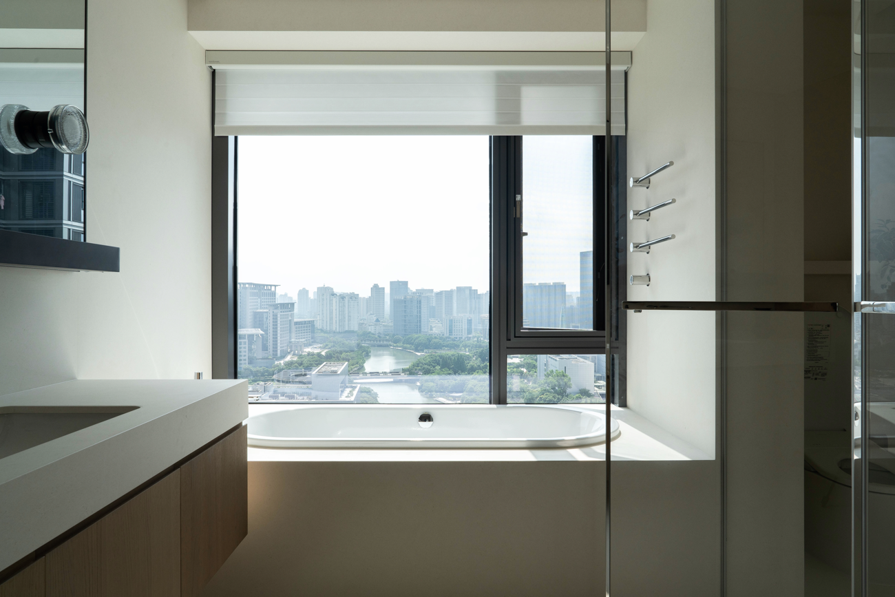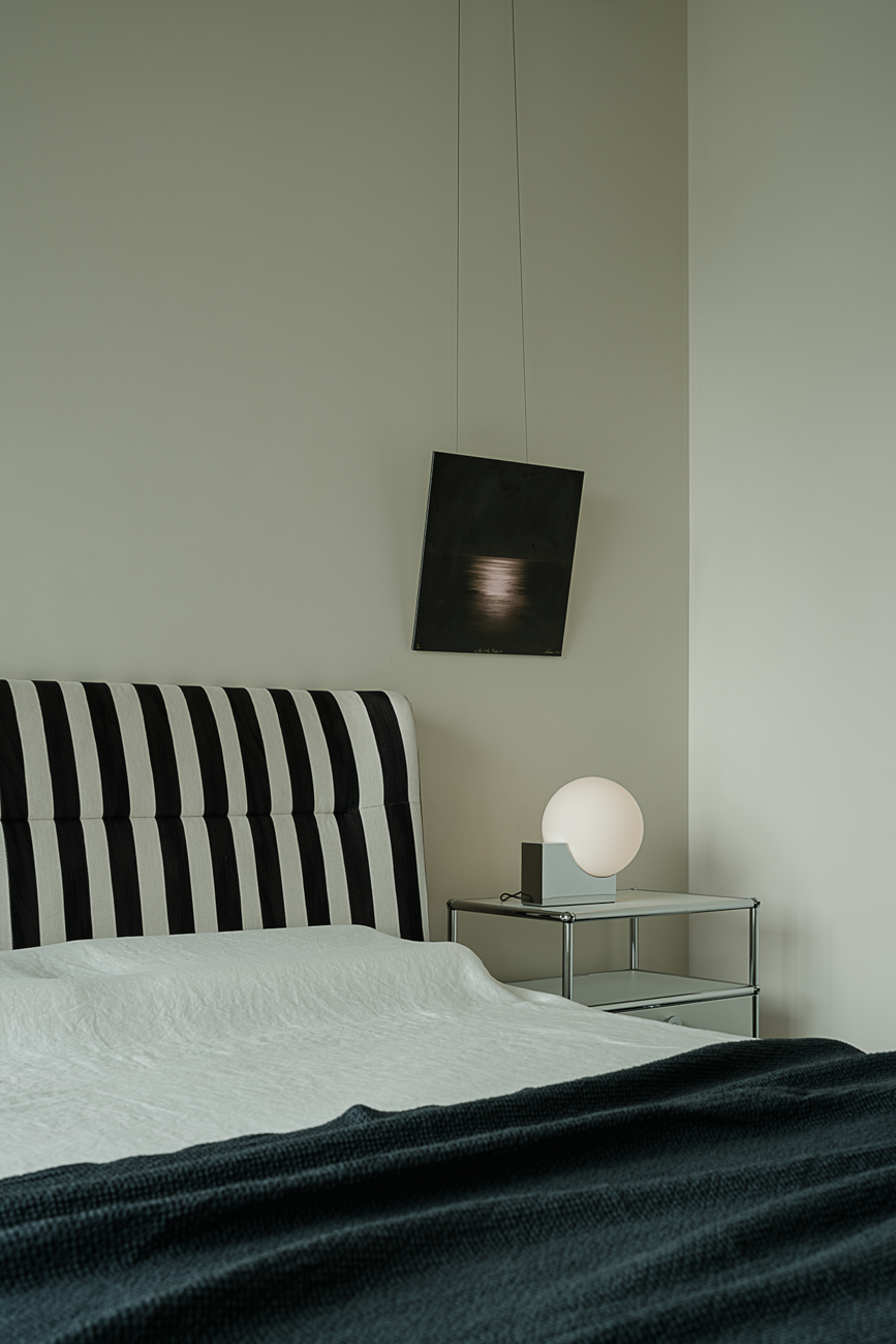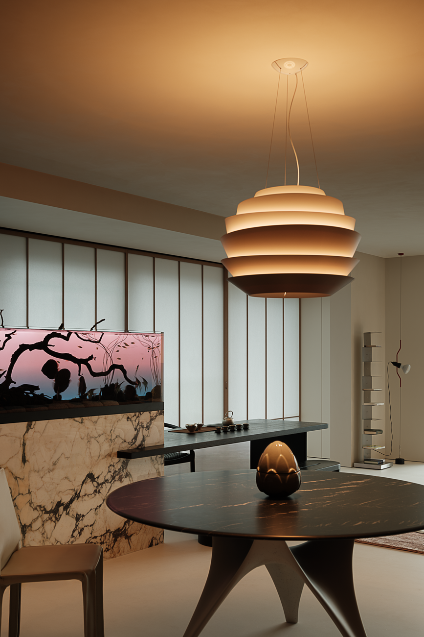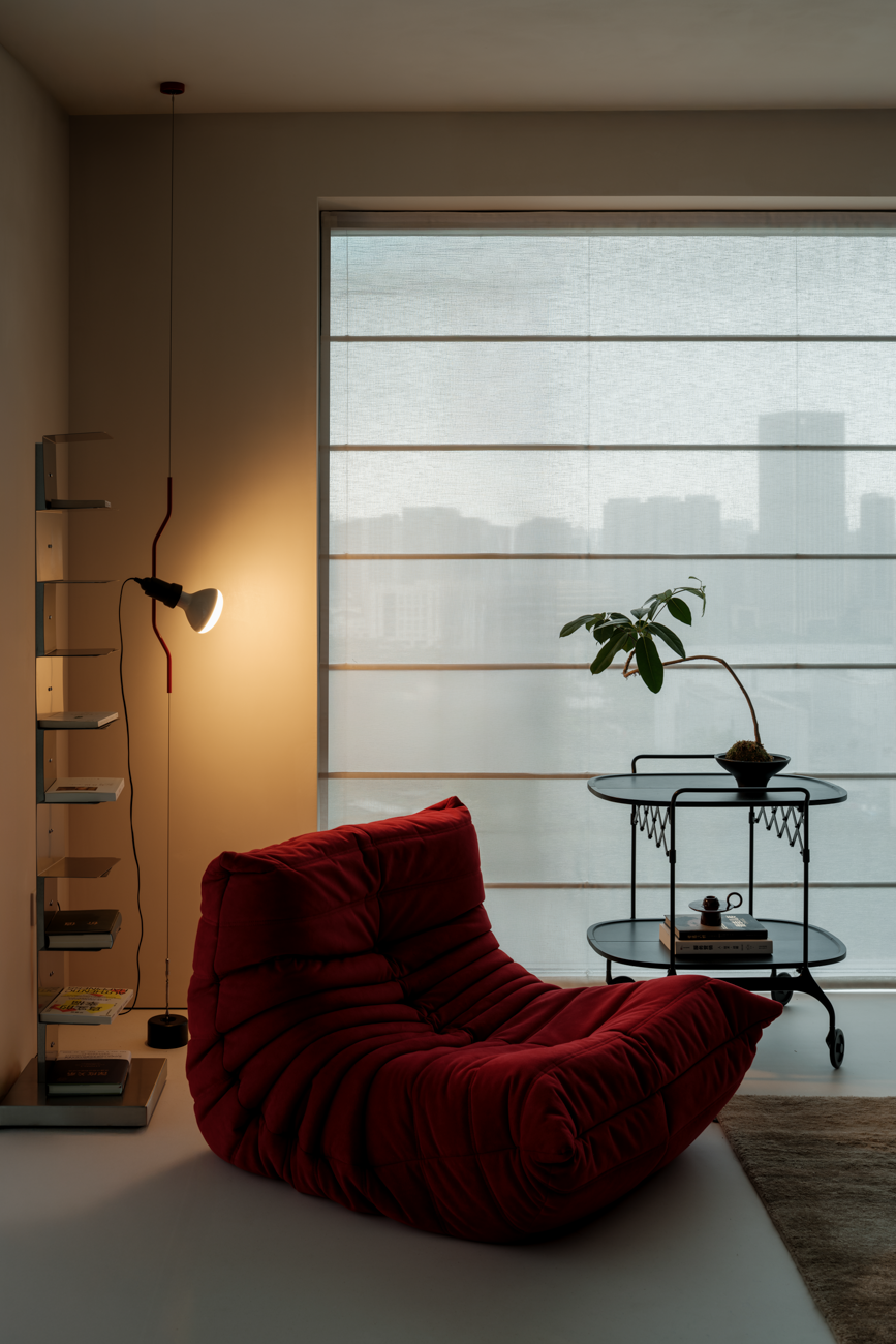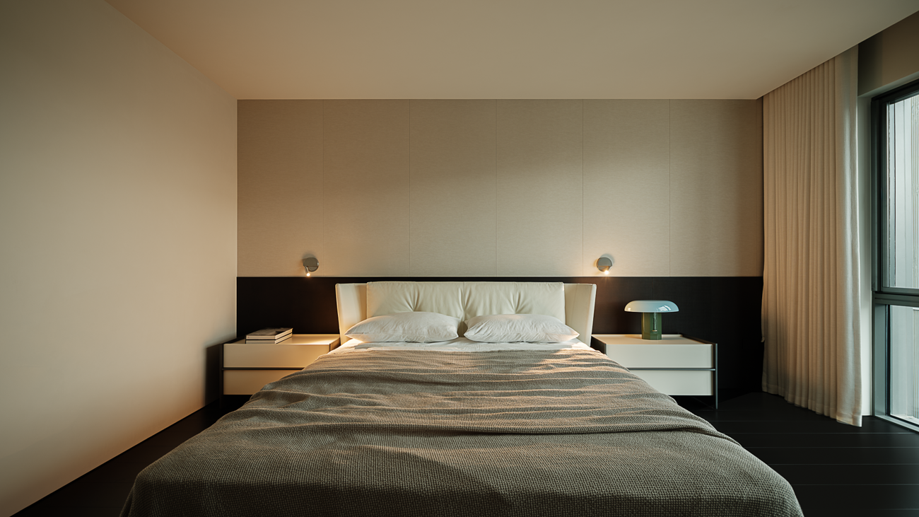 空间意境:面对窗外近邻这一城市居住的典型困境,设计以一道可开合的木格栅屏风作为对隐私的回应,光线经由格栅的宣纸过滤后,形成柔和的漫射,在遮挡窗外视线的同时,为茶室注入悠然的韵味。公共区域的完全贯通,打破了功能分区的传统界限,客厅、餐厅、厨房、茶室形成了连续的空间序列,视线与动线在其中自由穿梭。音乐角、茶席与鱼缸……这些承载着主任爱好的元素,被精心编织进空间的脉络中,彼此连贯呼应,形成一种内在的循环节奏。在无实体隔墙的开放式平面中,色彩的明暗变化便成为了界定空间功能的隐形语言,从客厅区域的浅米白、原木色,到餐厅区域逐渐加深的色调,色彩在空间中形成了如同自然光线带来的微妙渐变,而一抹突兀却恰到好处的亮红色吧椅,打破了中性色调的平衡,为空间注入灵动的活力,暗示着生活本身应有的生动。主卧套房以纯粹的米白与原木材质构筑,摒弃一切冗余的装饰,在这里,设计退居幕后,将空间完全交还给居住者本身的身体感知。套房内整合睡眠区域、三分离式卫生间、更衣空间以及功能简单的书房,构成了一个完整的生活系统,不仅提高了生活效率,更重要的是,它创造了一个完全自足的私密领域,夫妻二人可以在此完成大部分的日常所需,无需频繁地穿越公共区域,从而获得真正意义上的精神独立与安宁。儿童房的设计体现了设计师对更长远的居住时间的考量。通过可开合的联动门系统,联通保姆房与儿童房,在孩子幼年时期便于集中照料;而等到孩子成年后,打开开合结构并入保姆房,形成完整独立的卧房,与另一个备用房间一起,为两个孩子提供各自独立的私享空间。