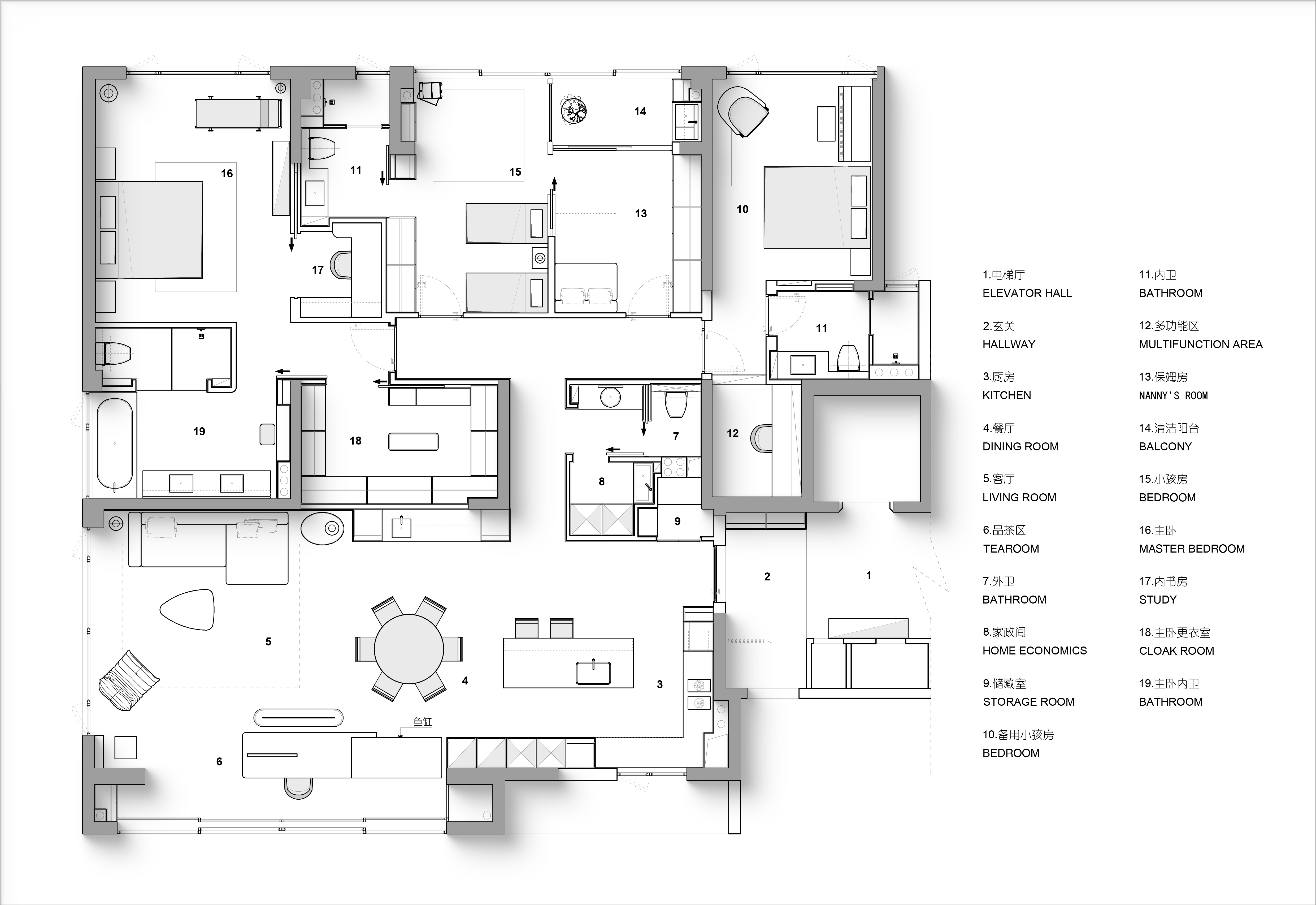 空间布局:公共区域的完全贯通,打破了功能分区的传统界限,客厅、餐厅、厨房、茶室形成了连续的空间序列,视线与动线在其中自由穿梭。音乐角、茶席与鱼缸……这些承载着主任爱好的元素,被精心编织进空间的脉络中,彼此连贯呼应