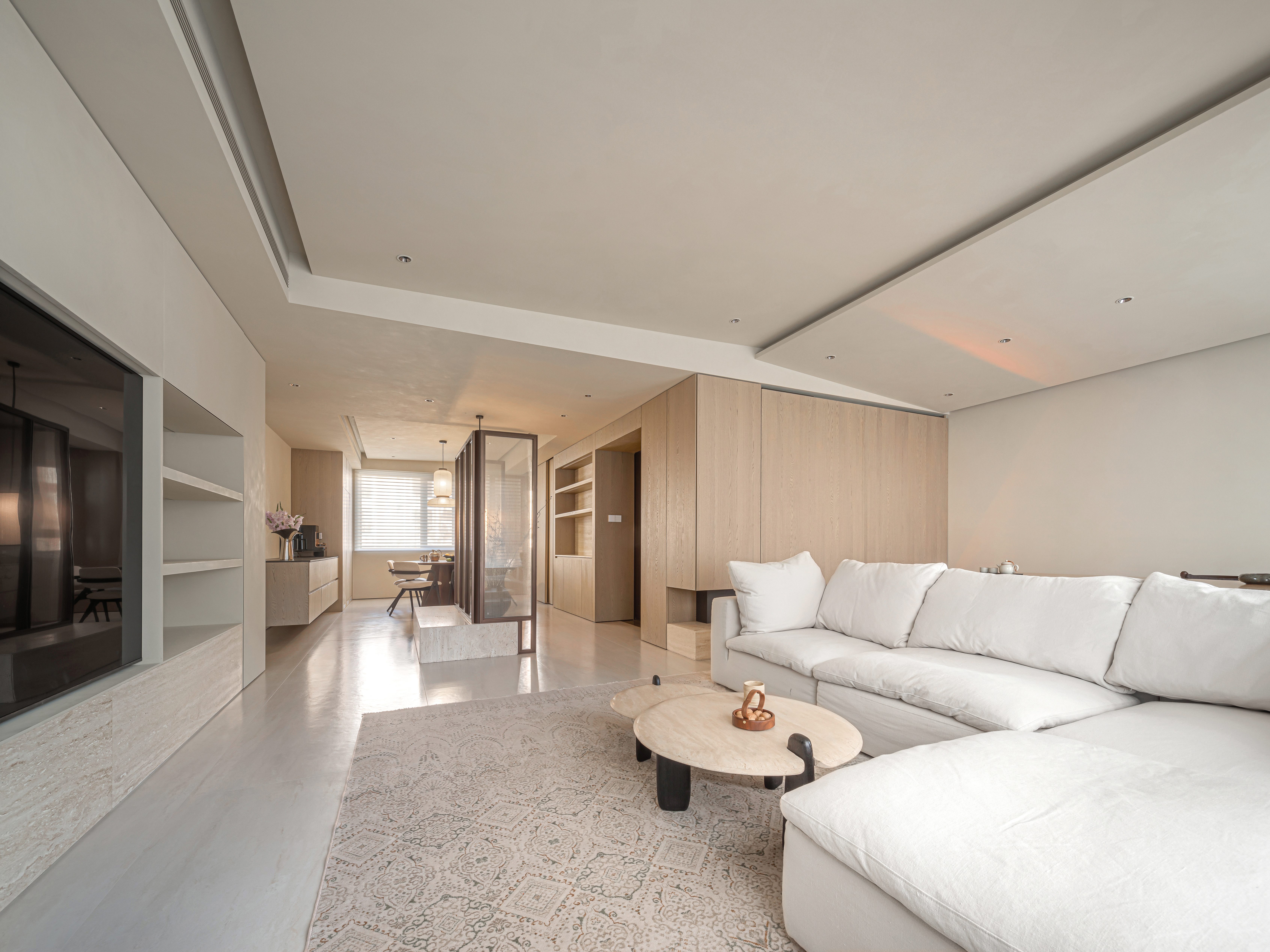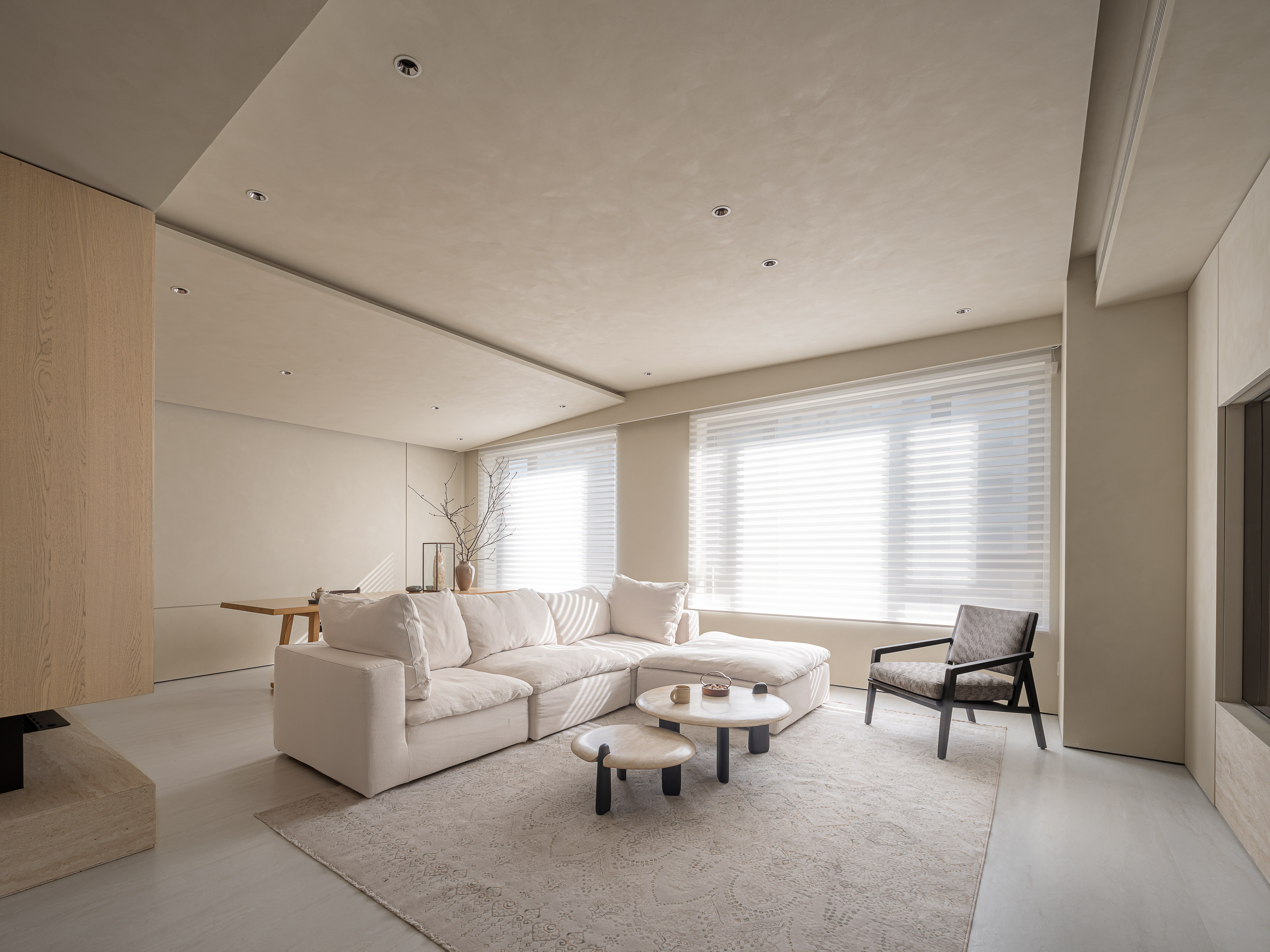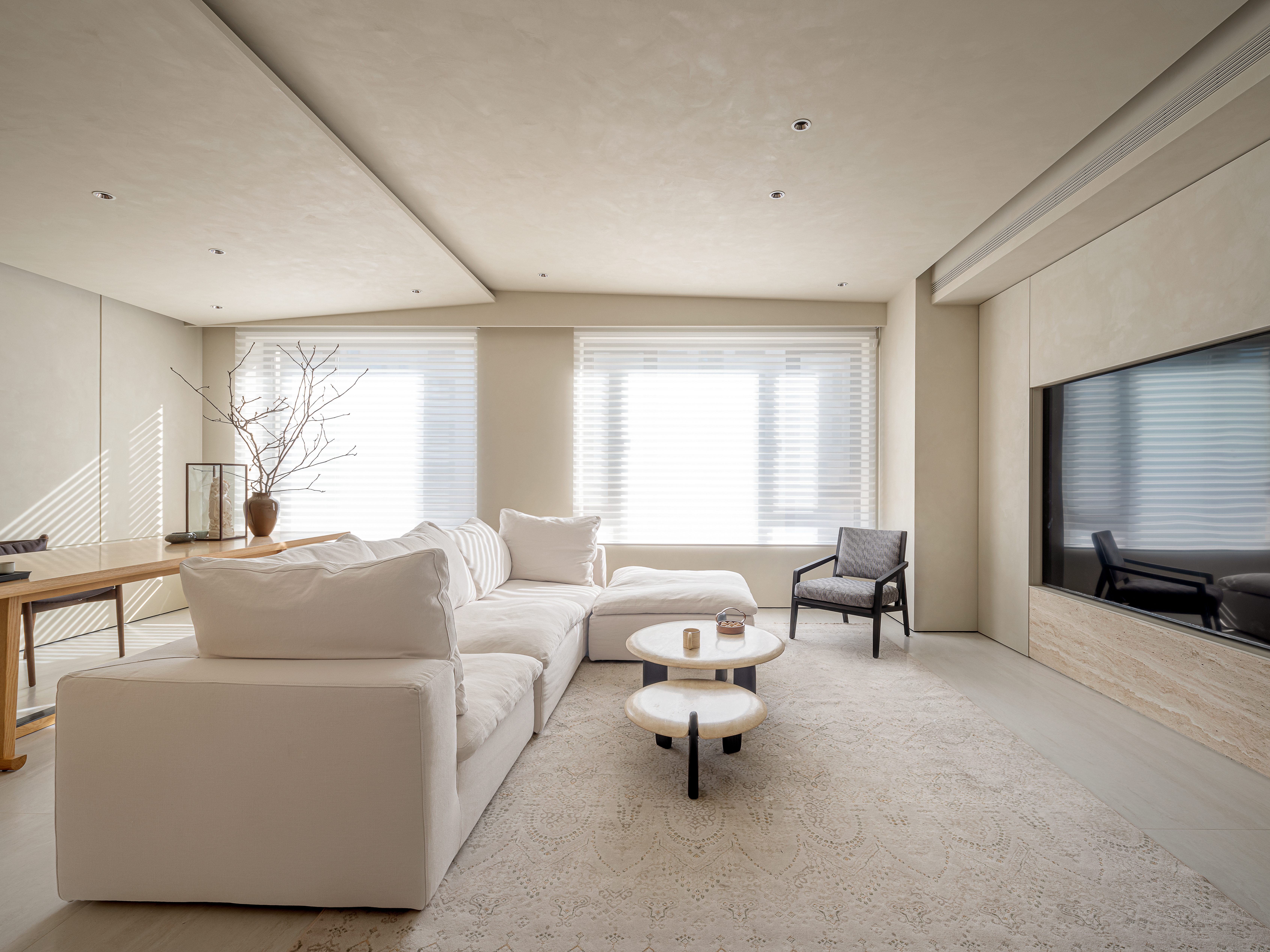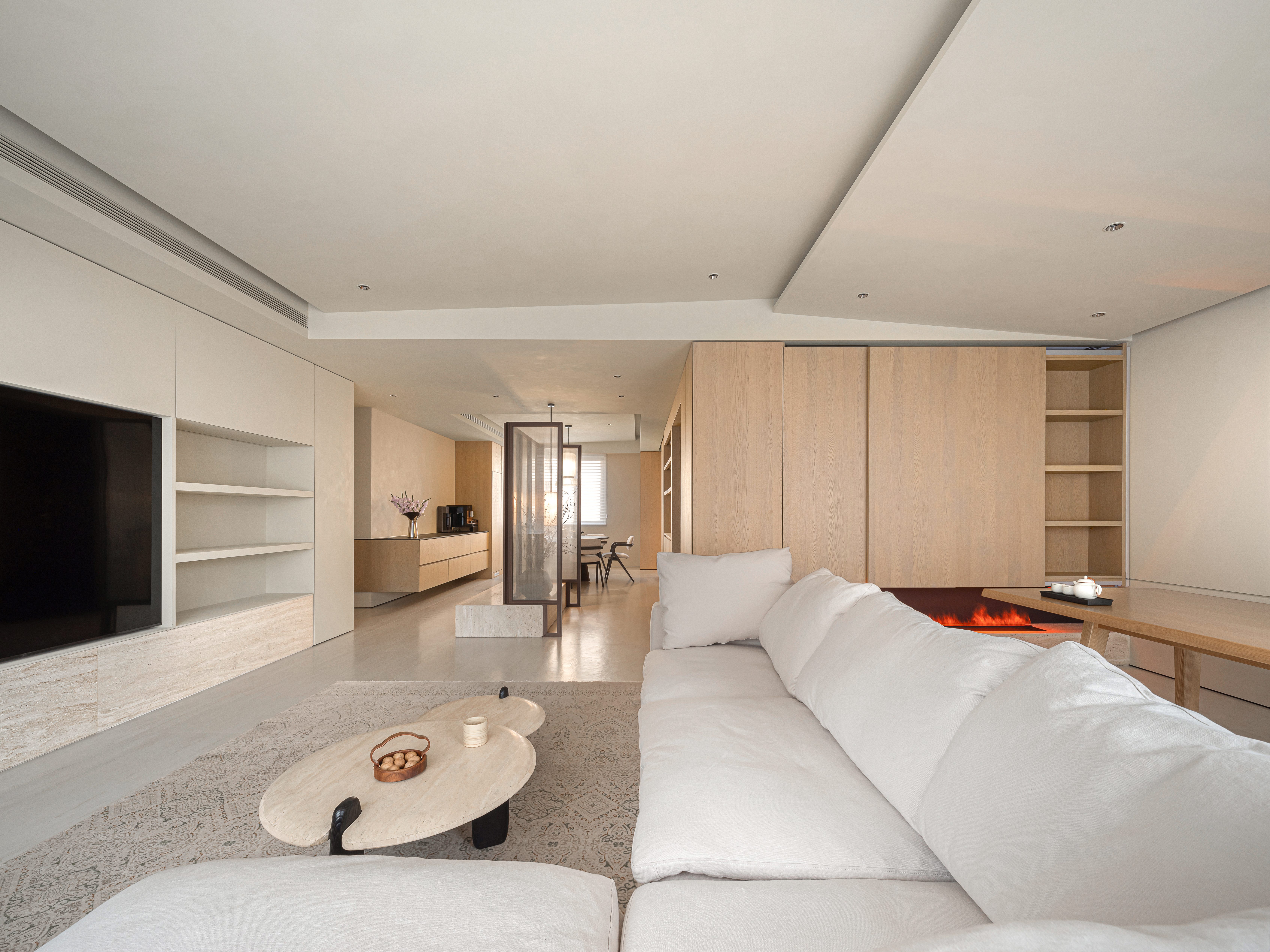 设计选材:以洞石与白色艺术漆为基底,橡木饰面勾勒温度。极简表象下,暗藏整墙收纳系统与折线天花板韵律。