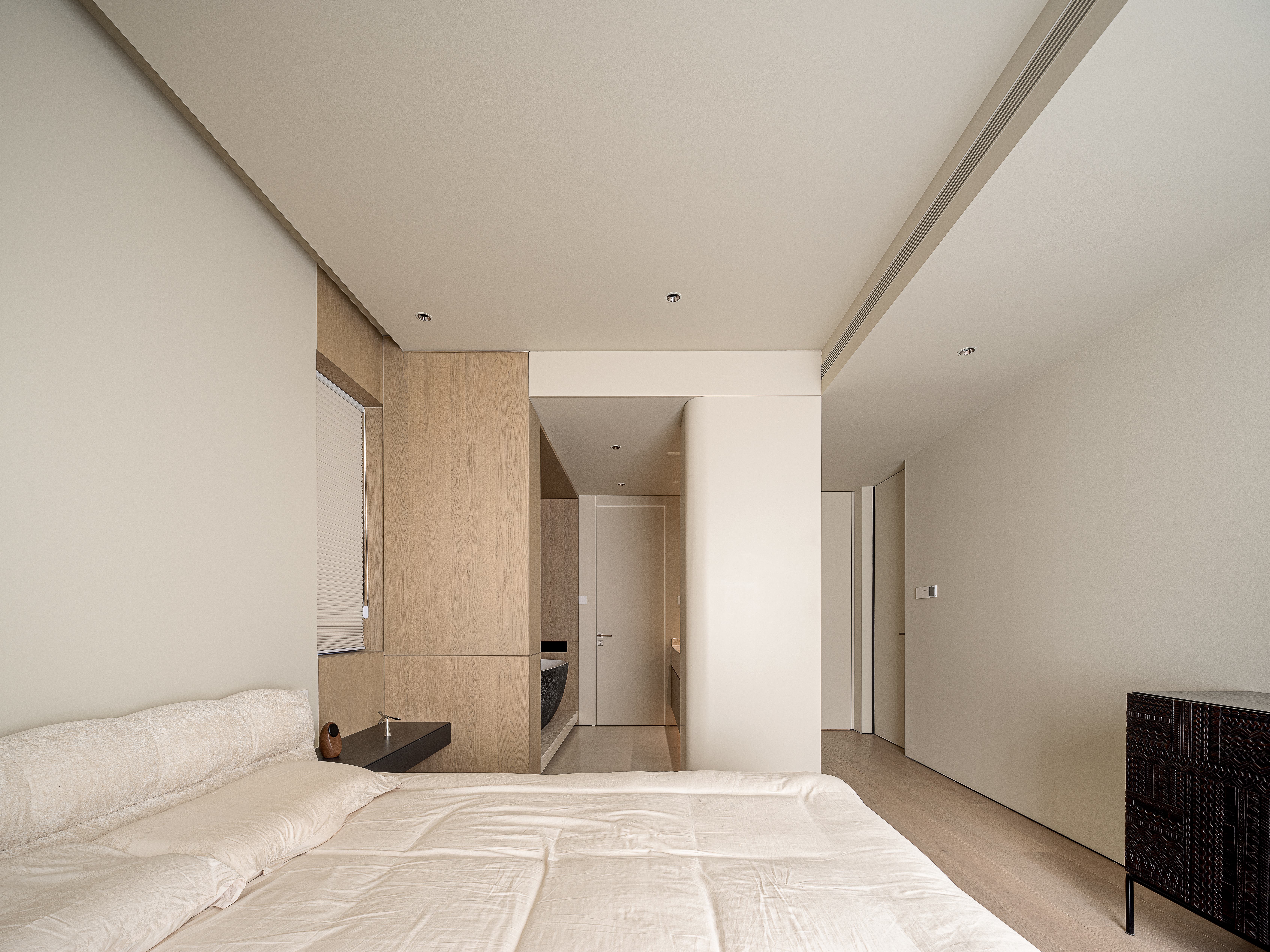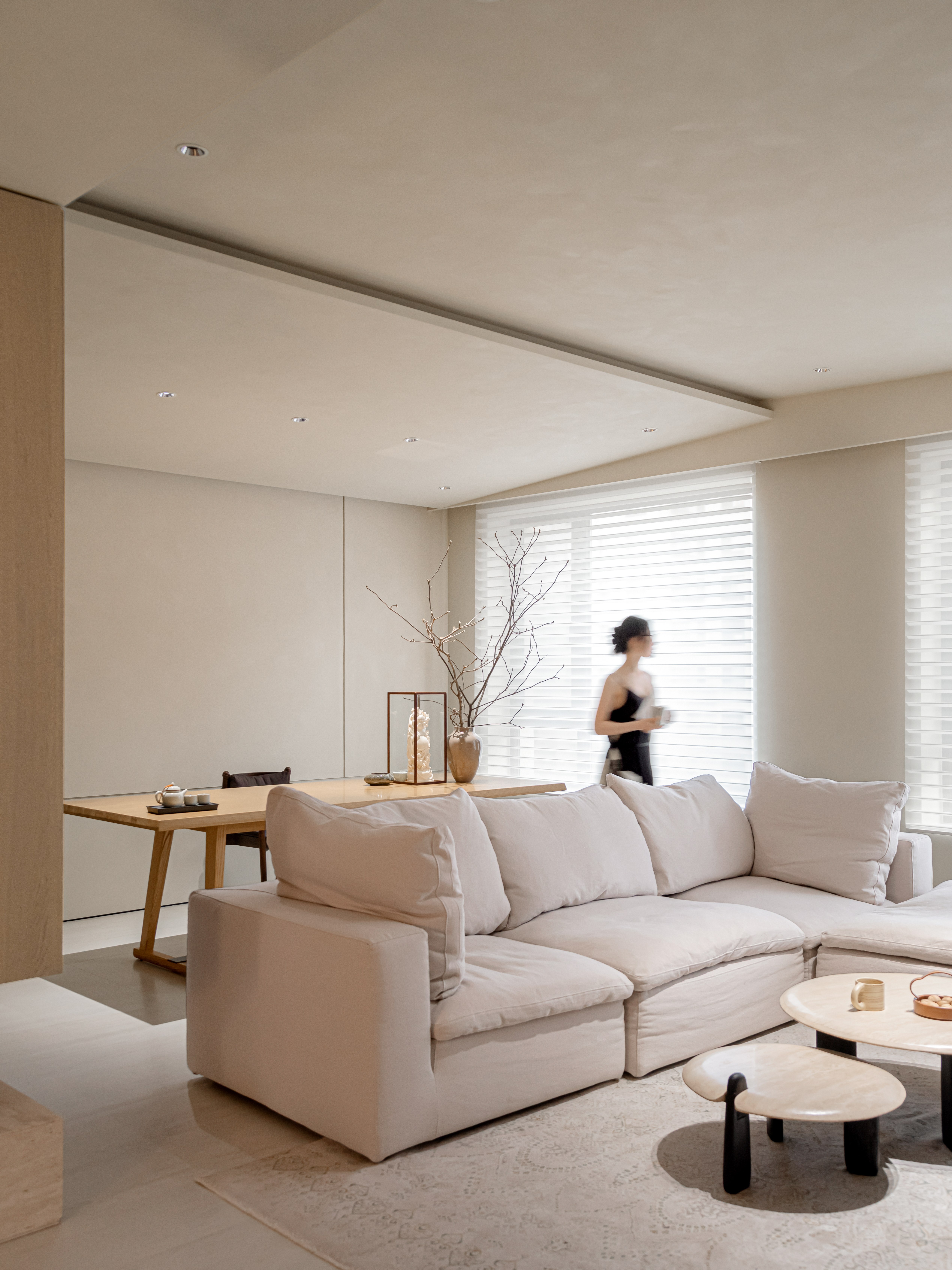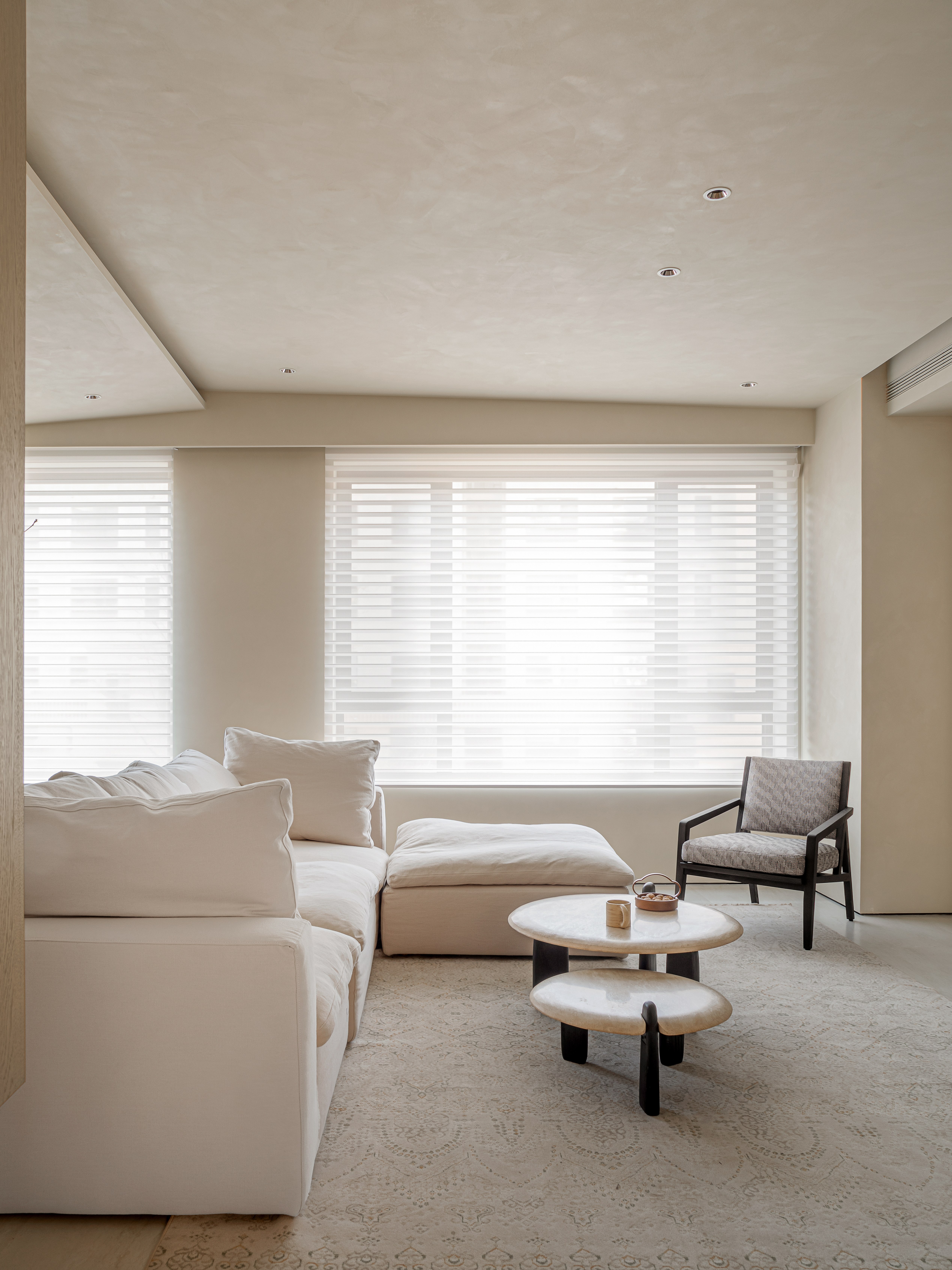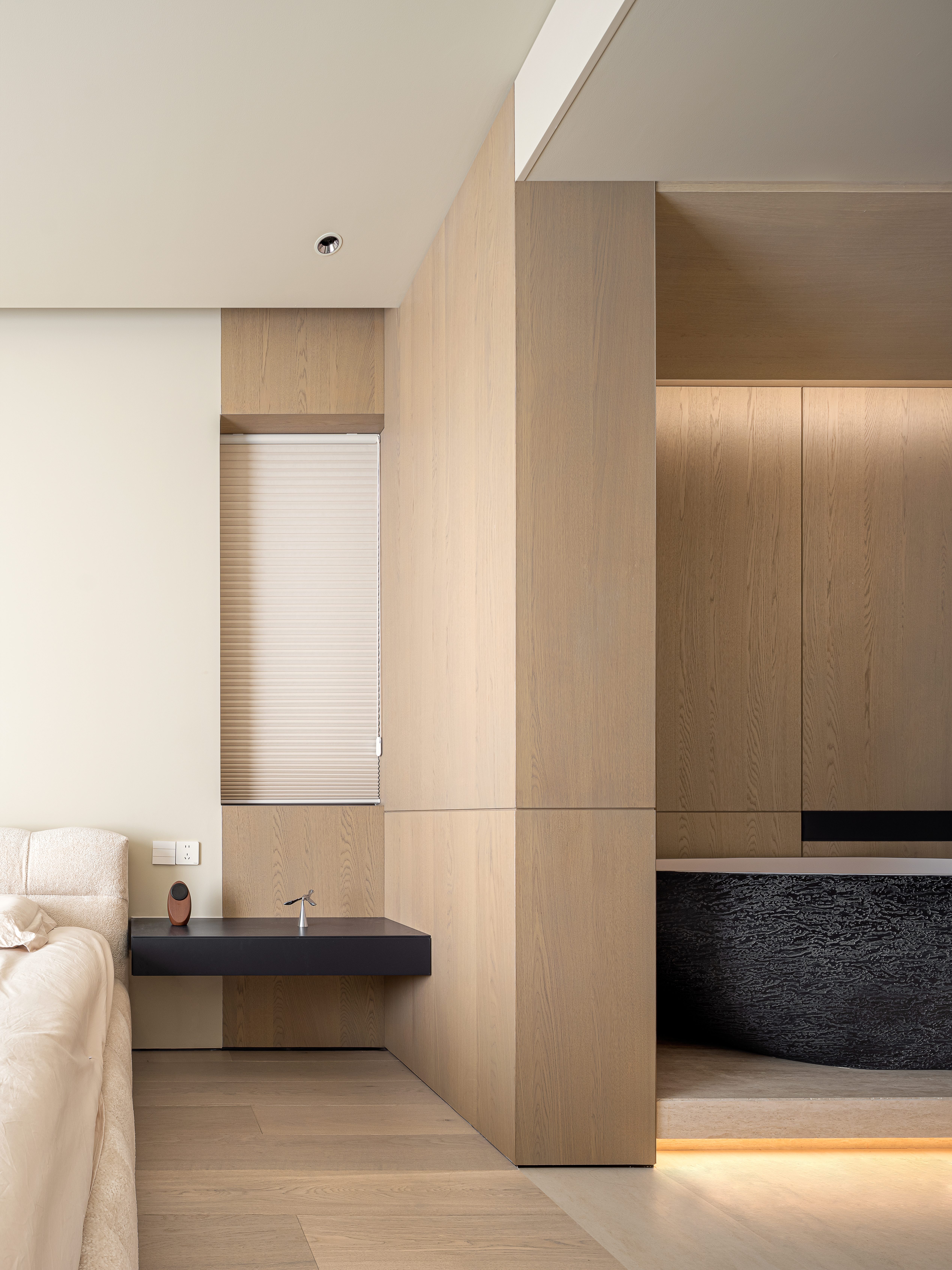 设计选材:以洞石与白色艺术漆为基底,橡木饰面勾勒温度。极简表象下,暗藏整墙收纳系统与折线天花板韵律。