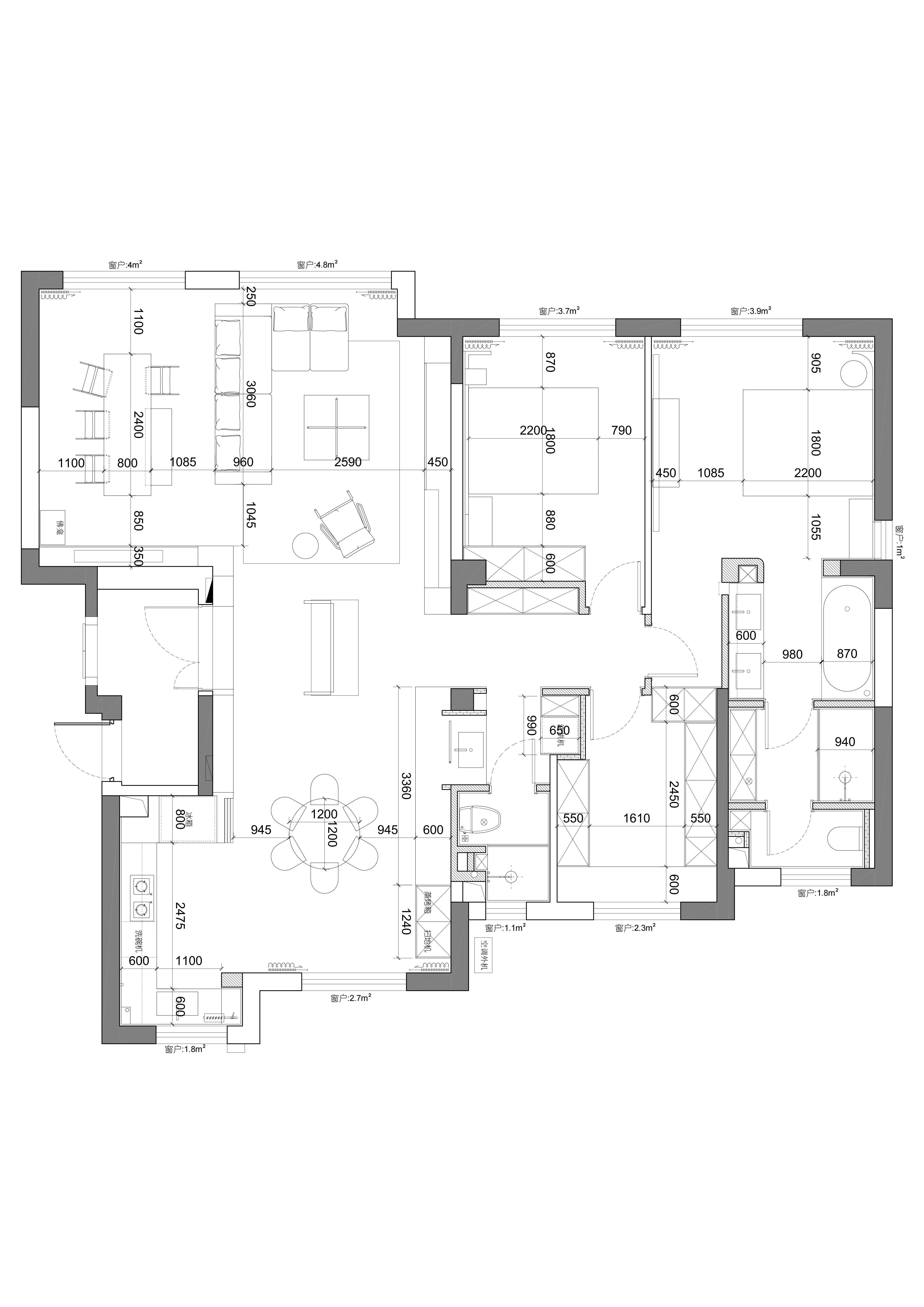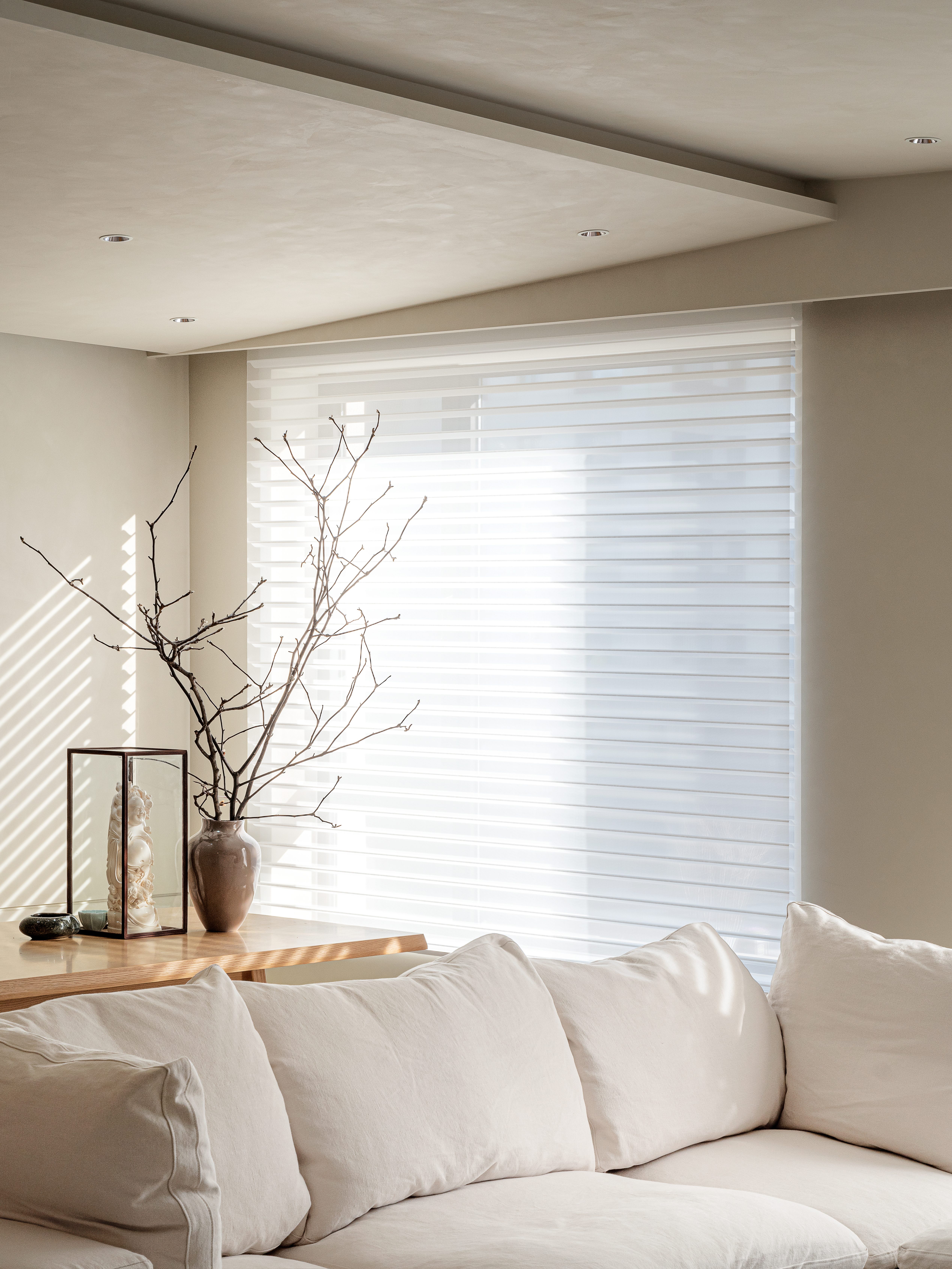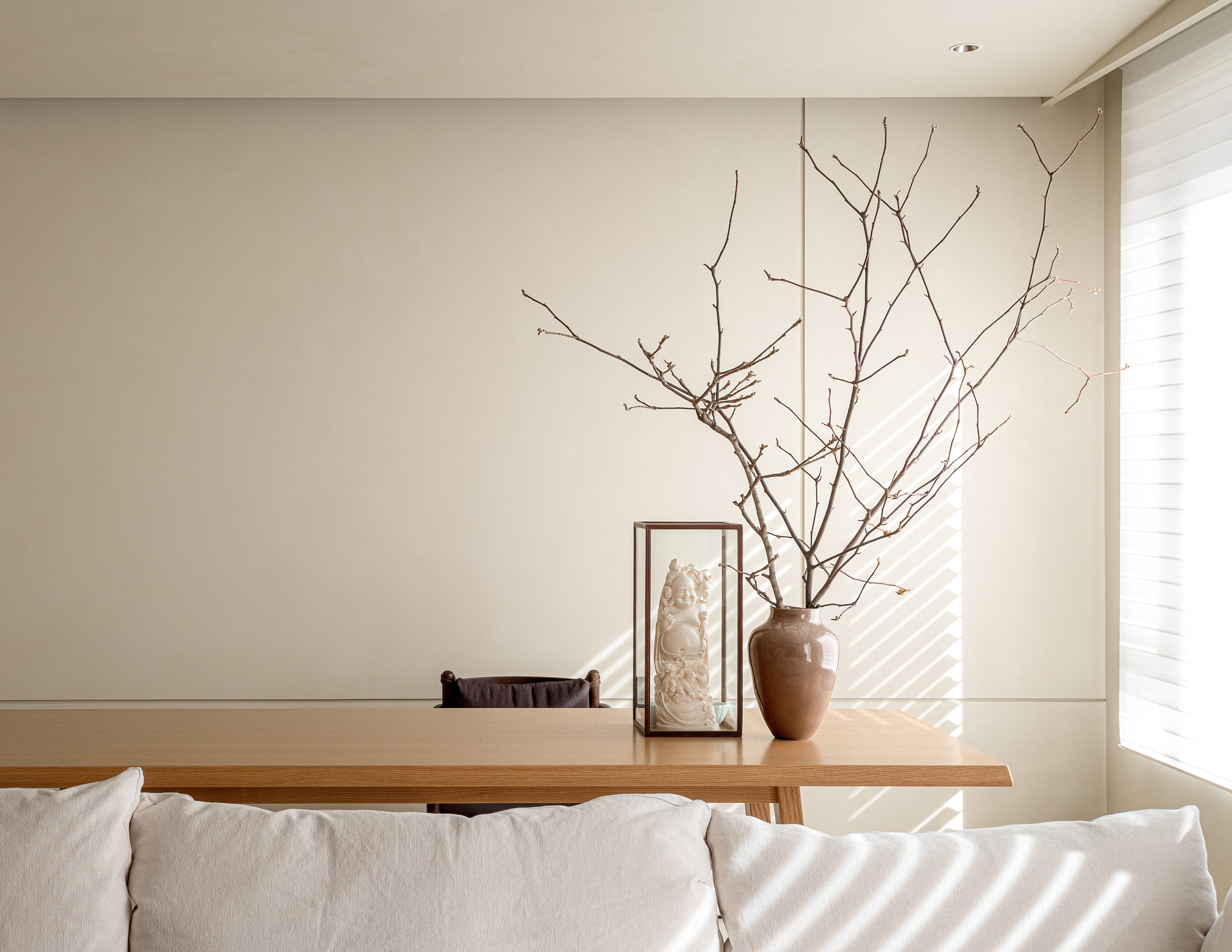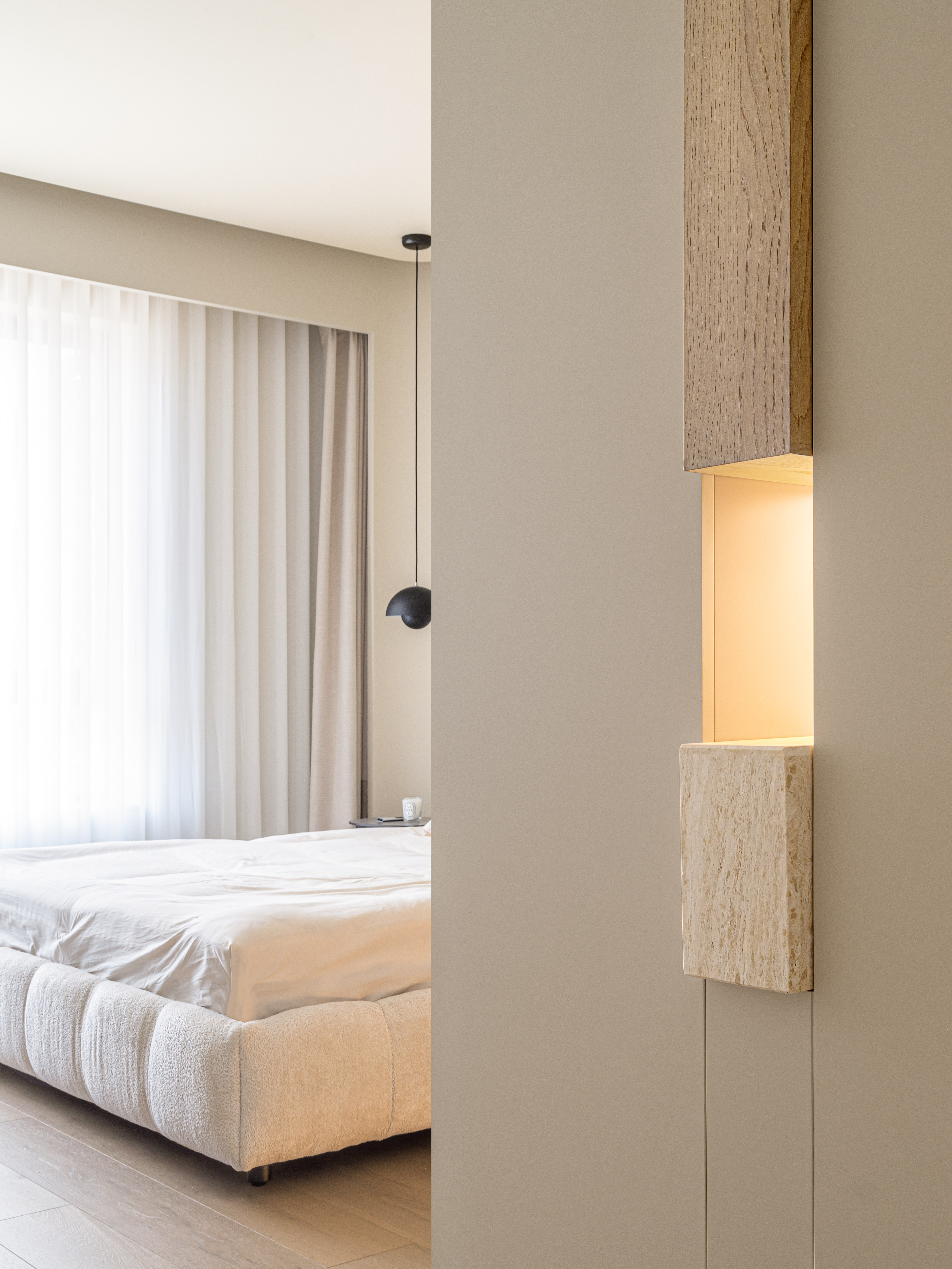设计选材:以洞石与白色艺术漆为基底,橡木饰面勾勒温度。极简表象下,暗藏整墙收纳系统与折线天花板韵律。