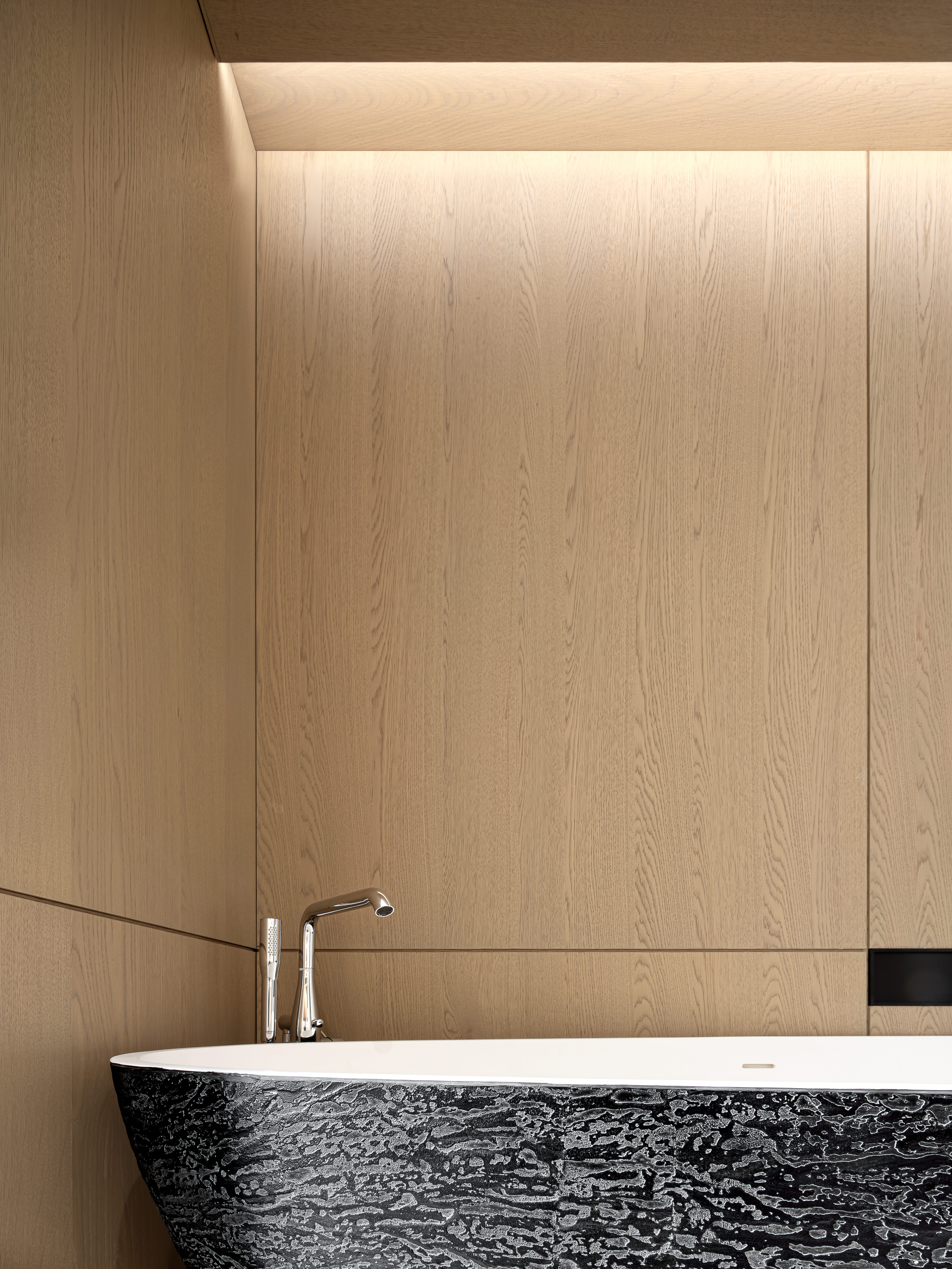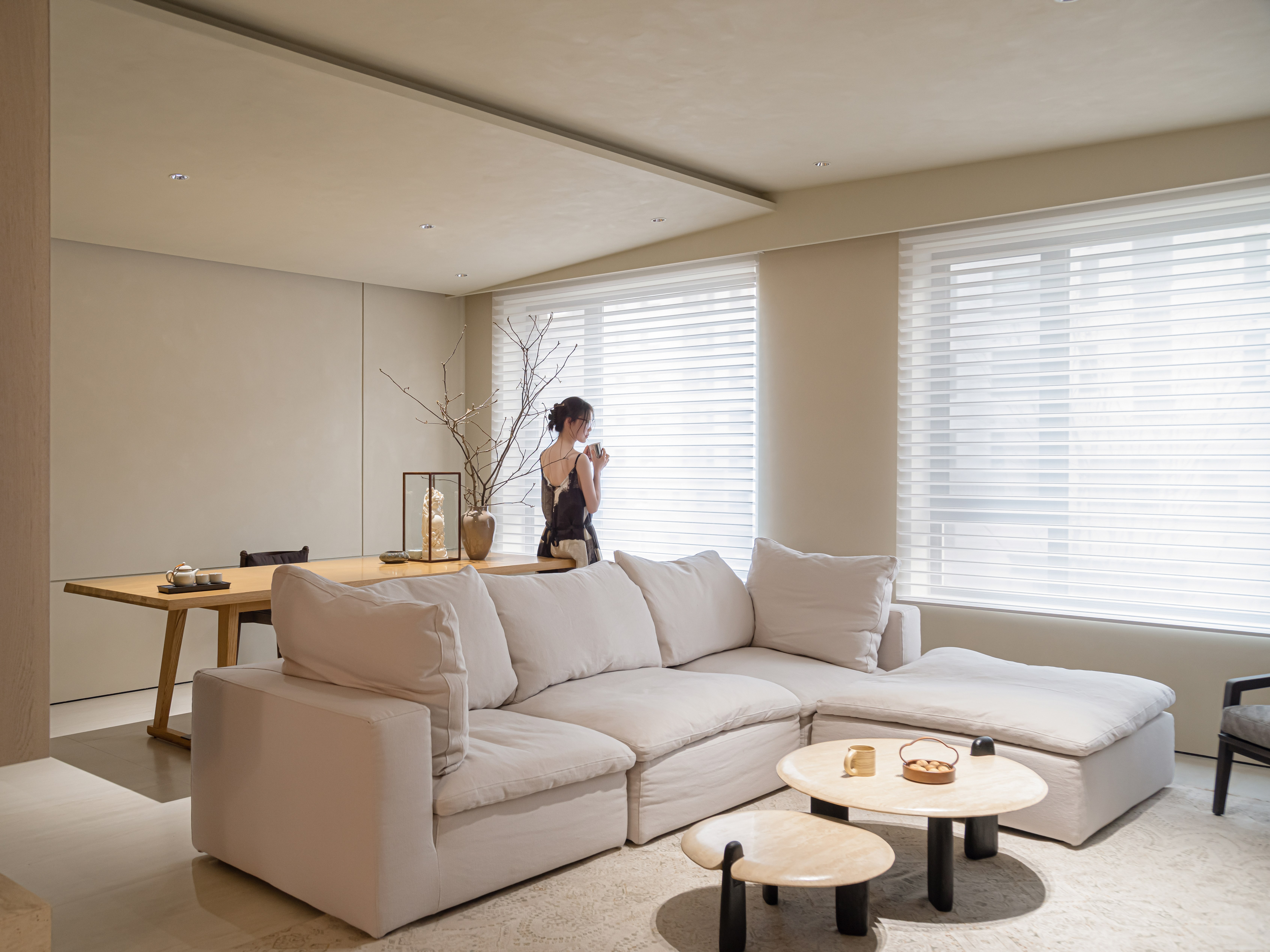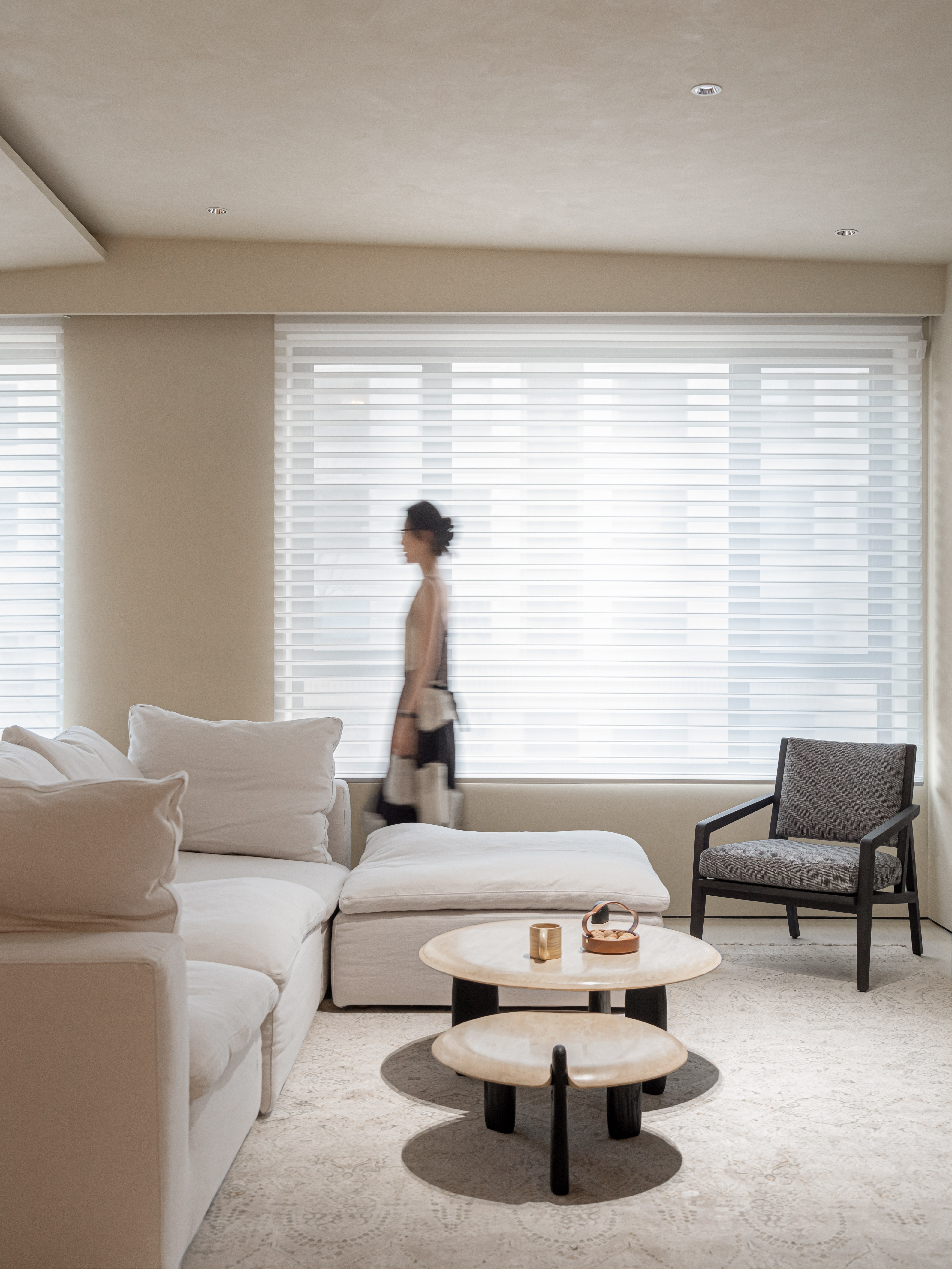 用户体验:投入使用后,强大的隐藏收纳使空间始终整洁静谧,动线流畅。用户评价:“家如会呼吸的留白画卷,功能皆藏于无形,洞石与木纹的碰撞,在日常中沉淀出东方的宁静与温暖。”