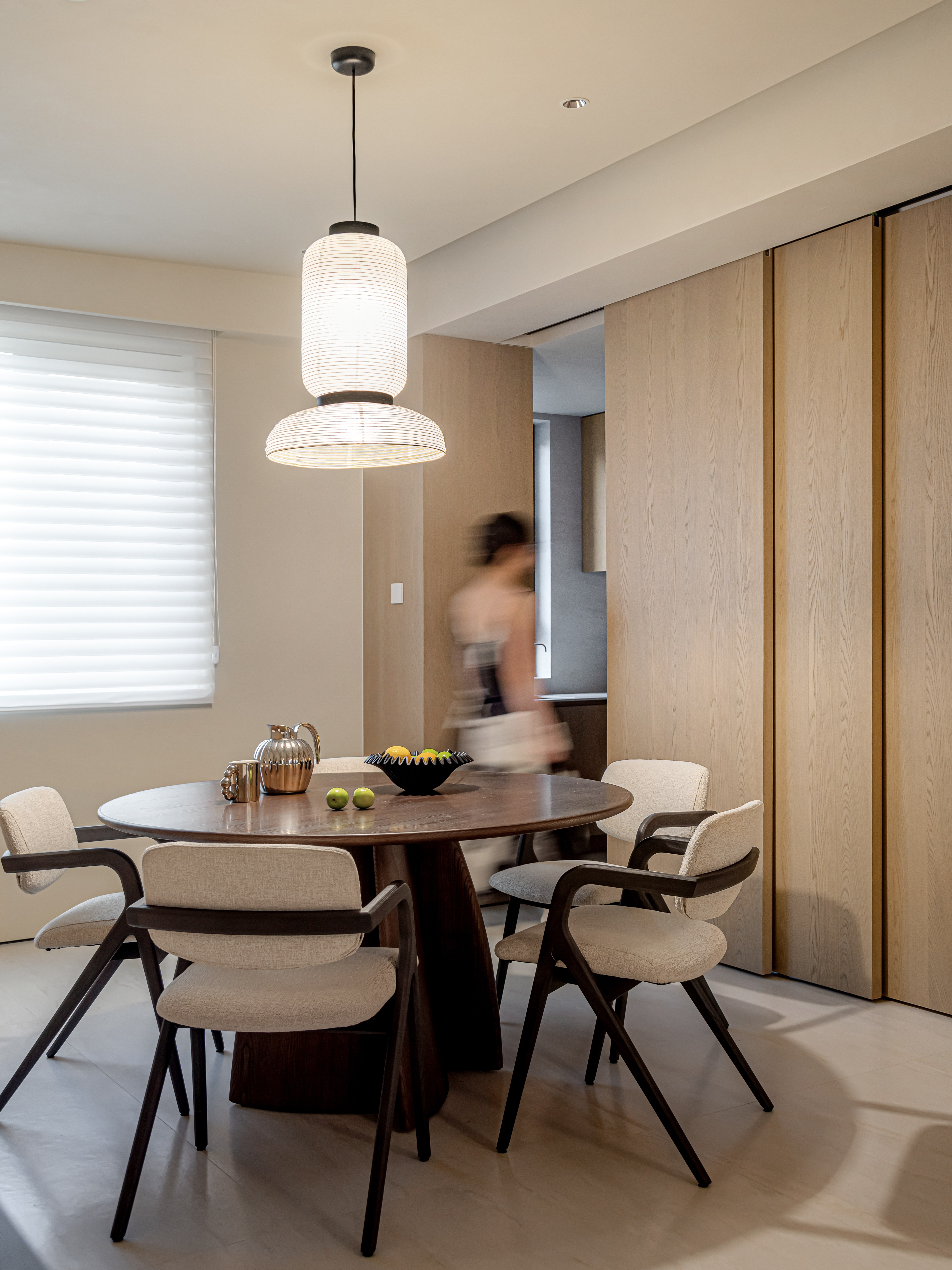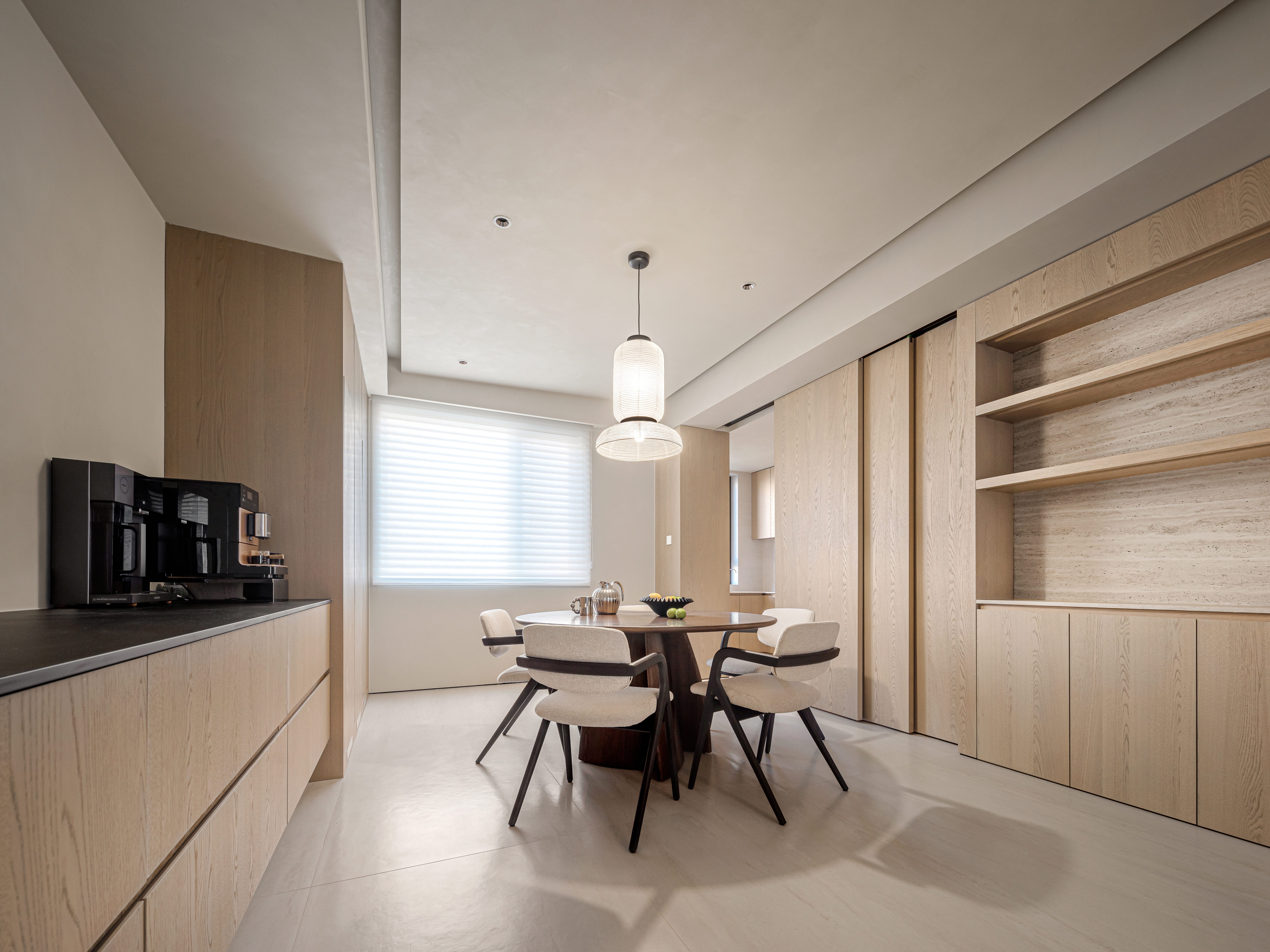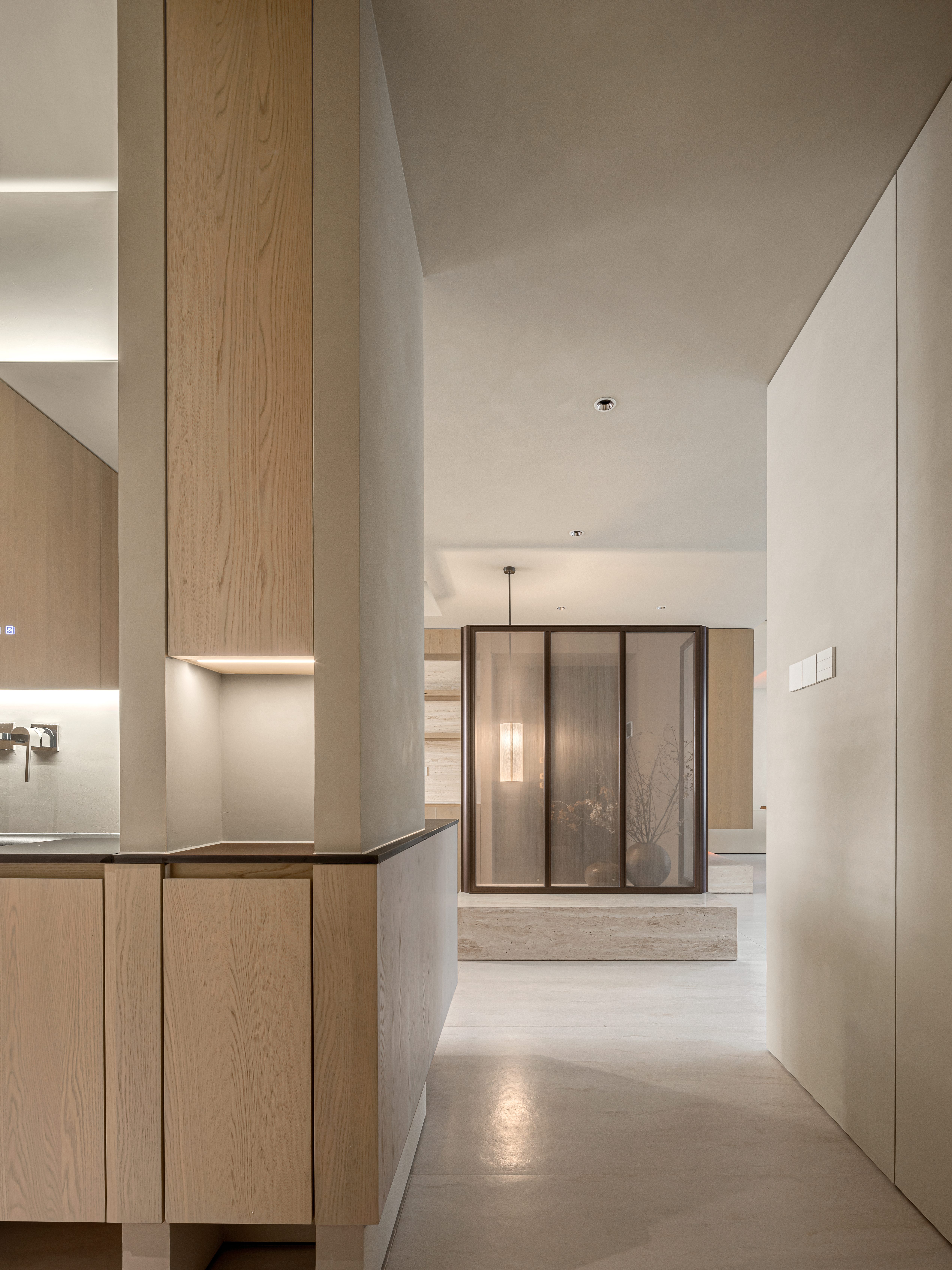 空间布局:矮柜玄关柜上方嵌入壁龛,洞石肌理从地面攀至立面。厨房三联动推拉门消隐于墙,餐边柜内嵌冰箱饮水机,功能归隐于形。