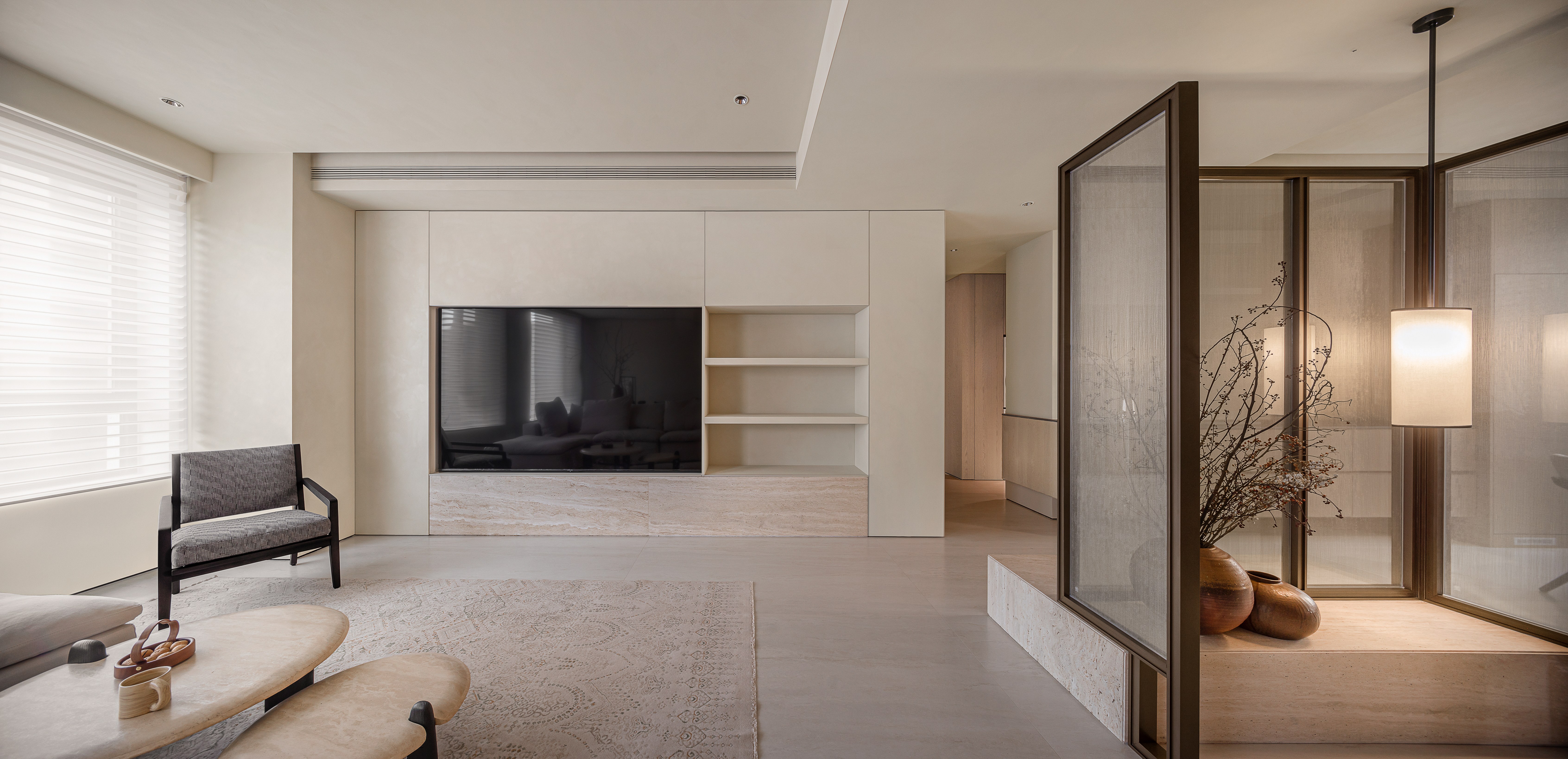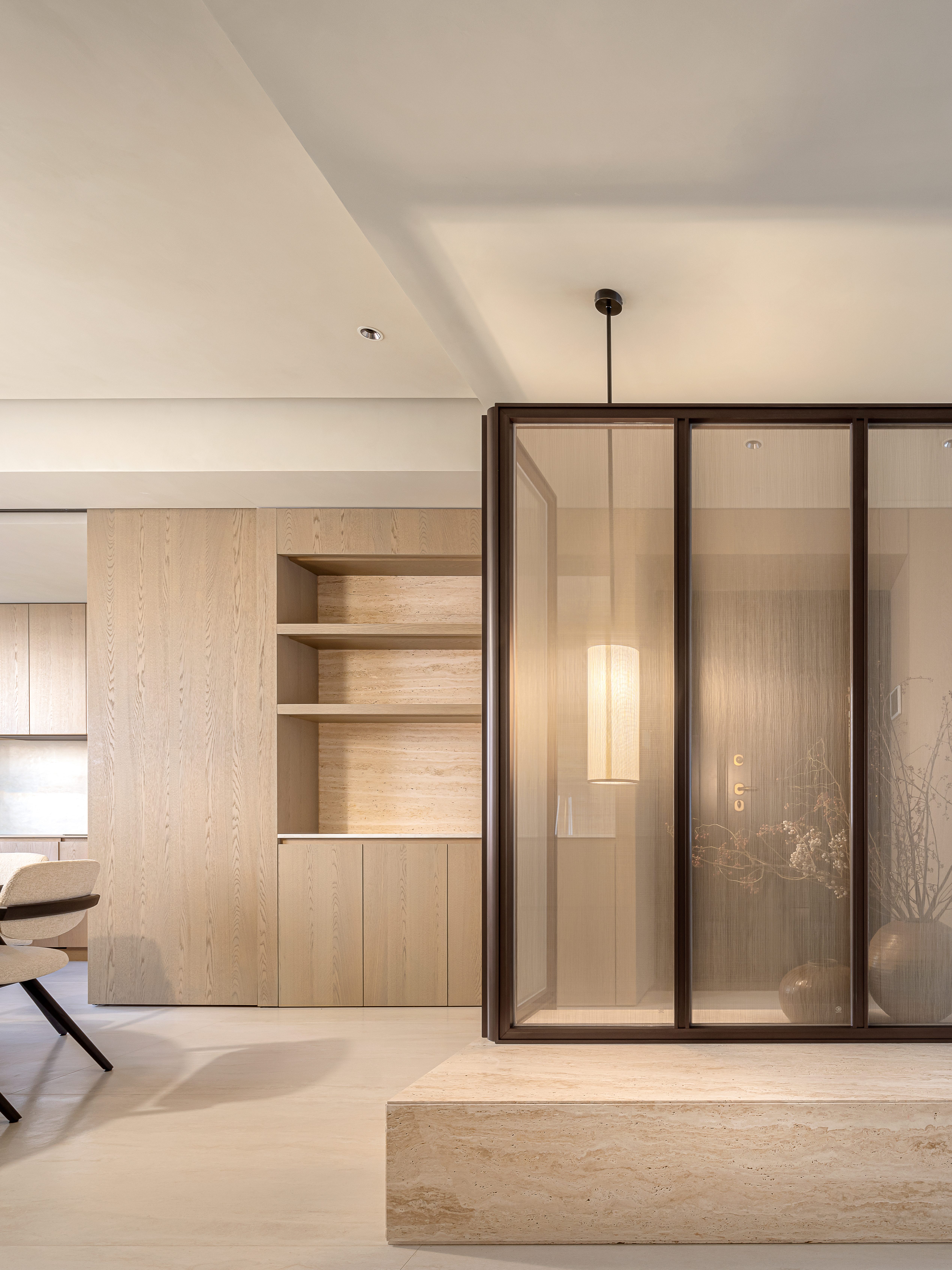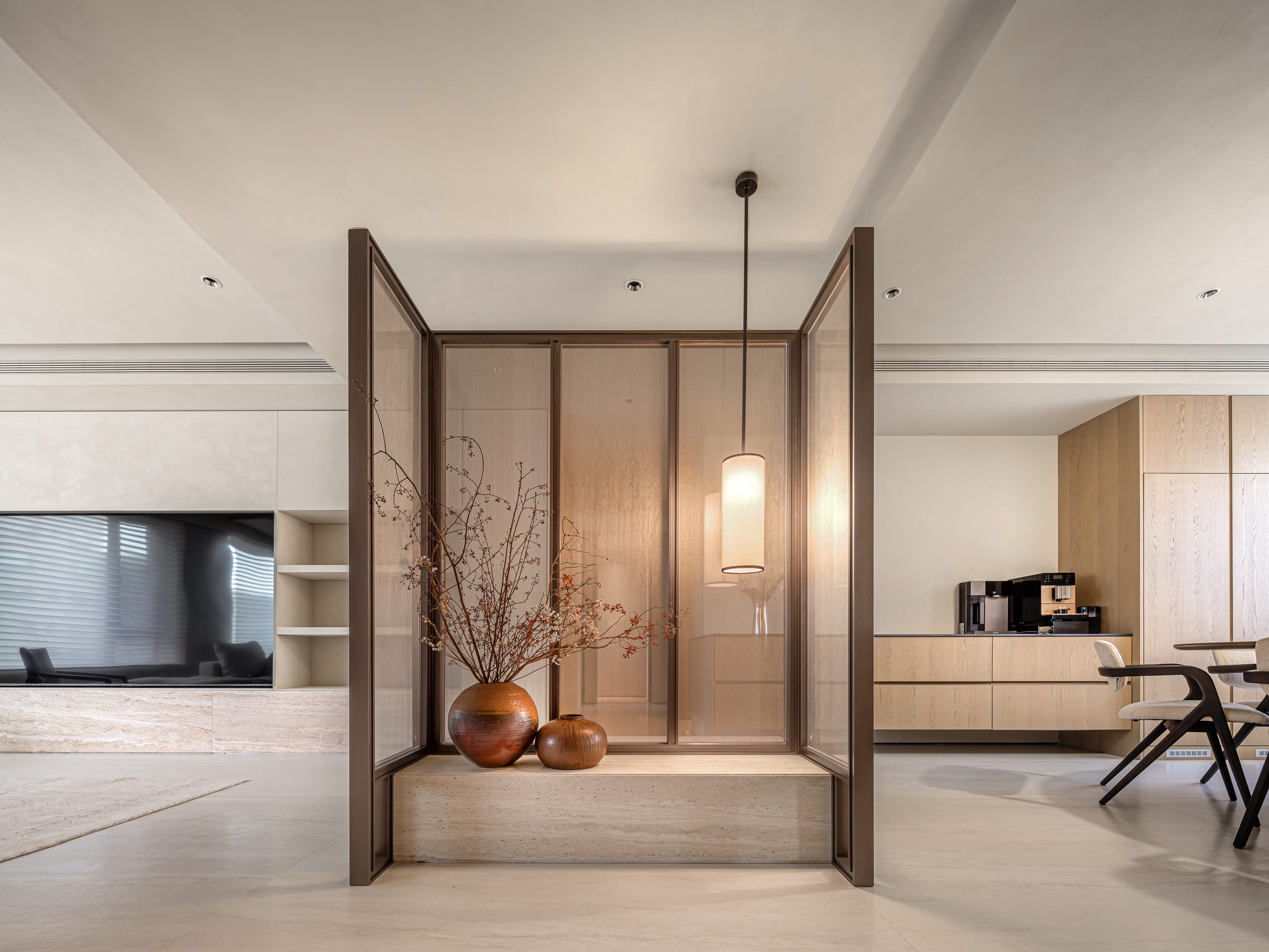 空间意境:空间处处藏匿东方哲思:电视墙柜体整面超强收纳,入户玄关夹绢玻璃屏风质感典雅朦胧
