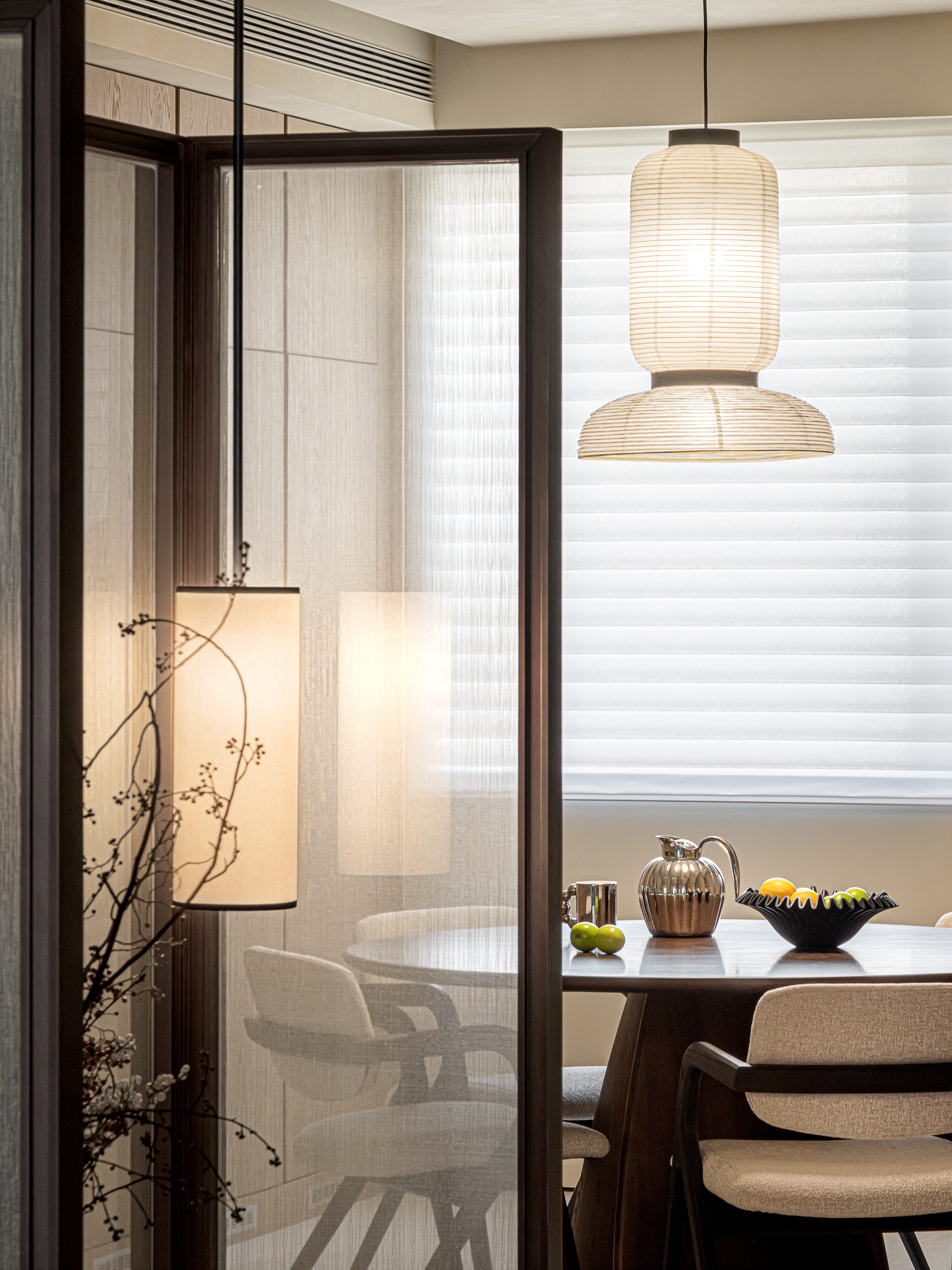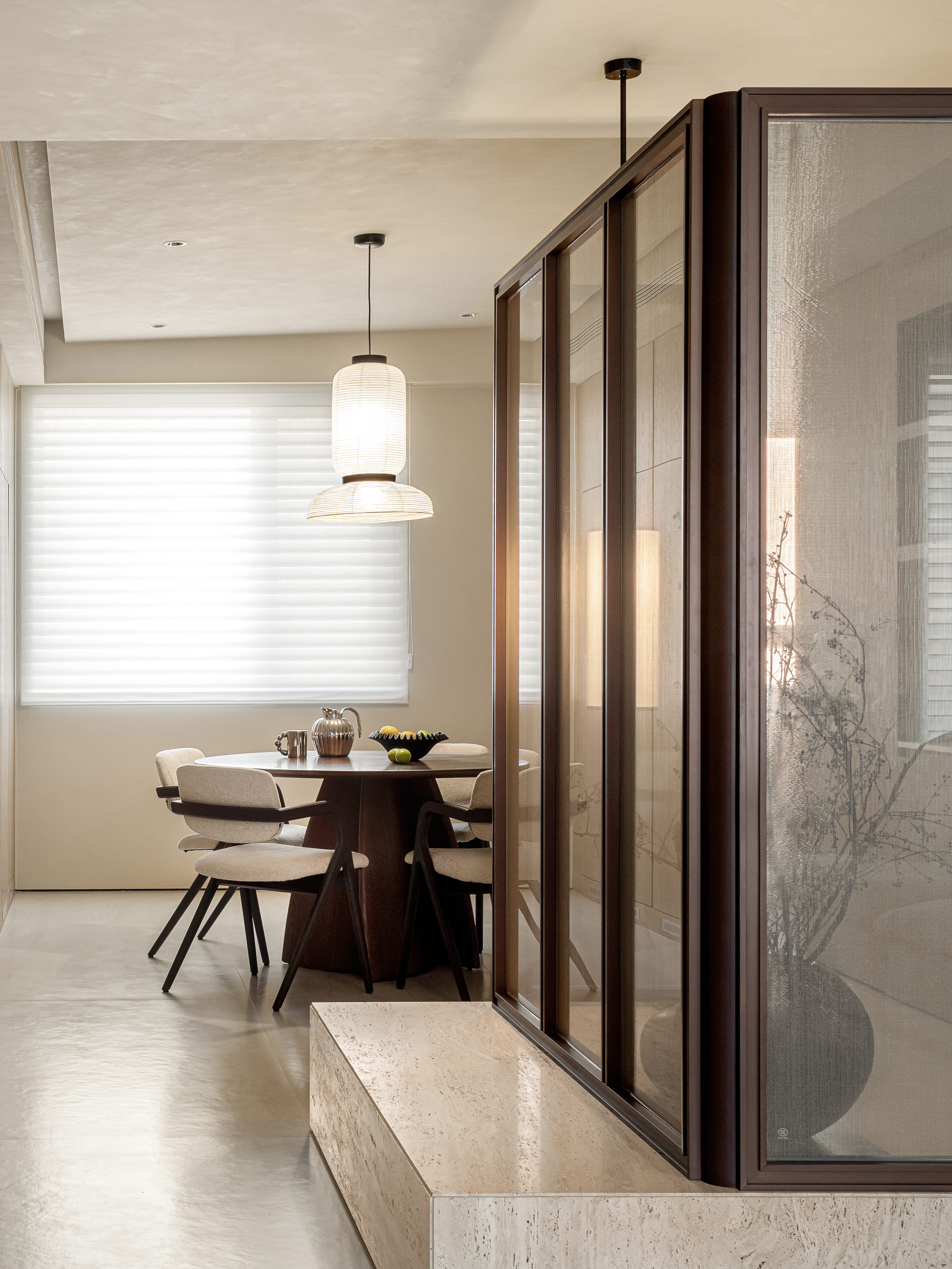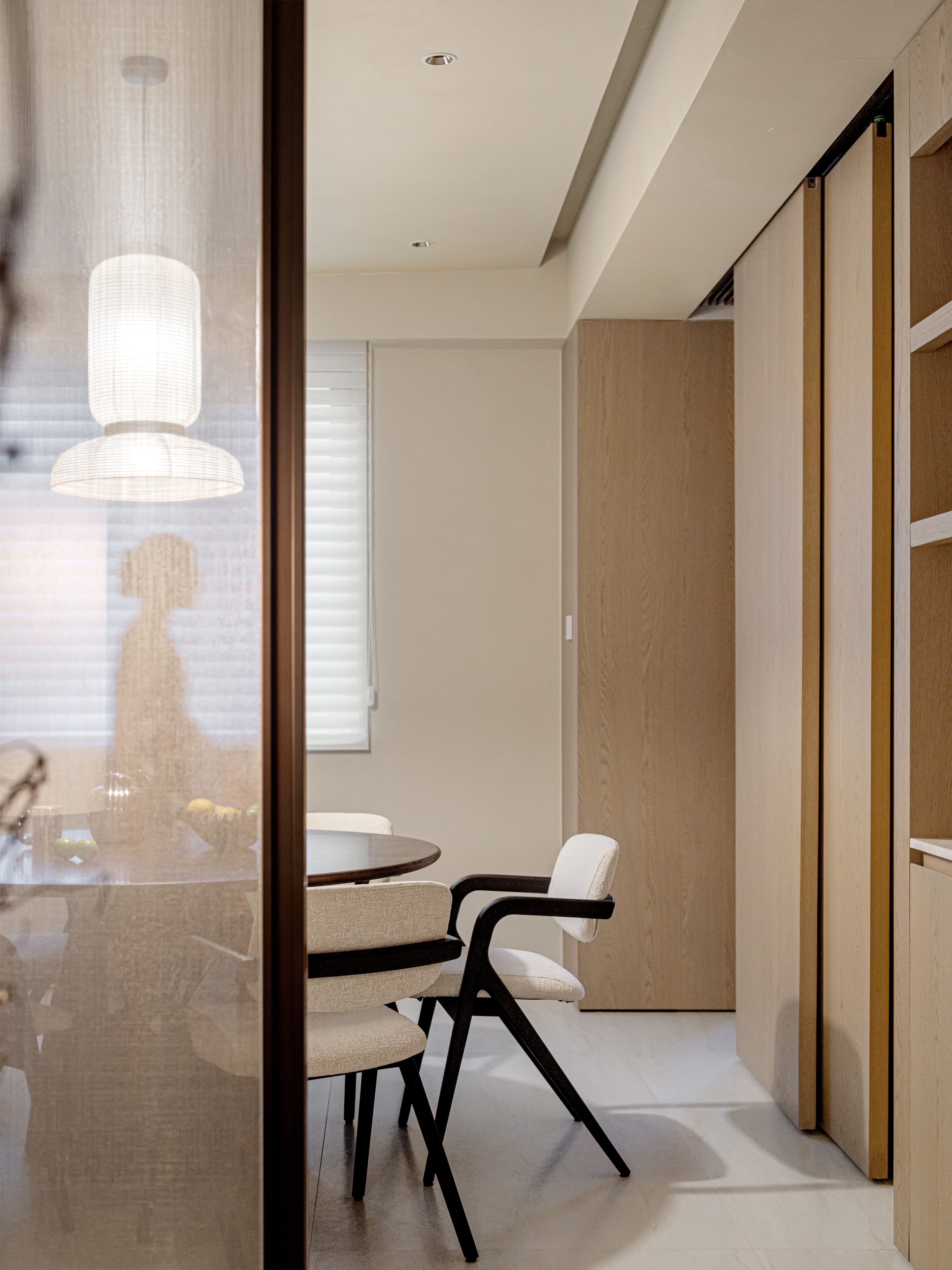 空间意境:空间处处藏匿东方哲思:电视墙柜体整面超强收纳,入户玄关夹绢玻璃屏风质感典雅朦胧