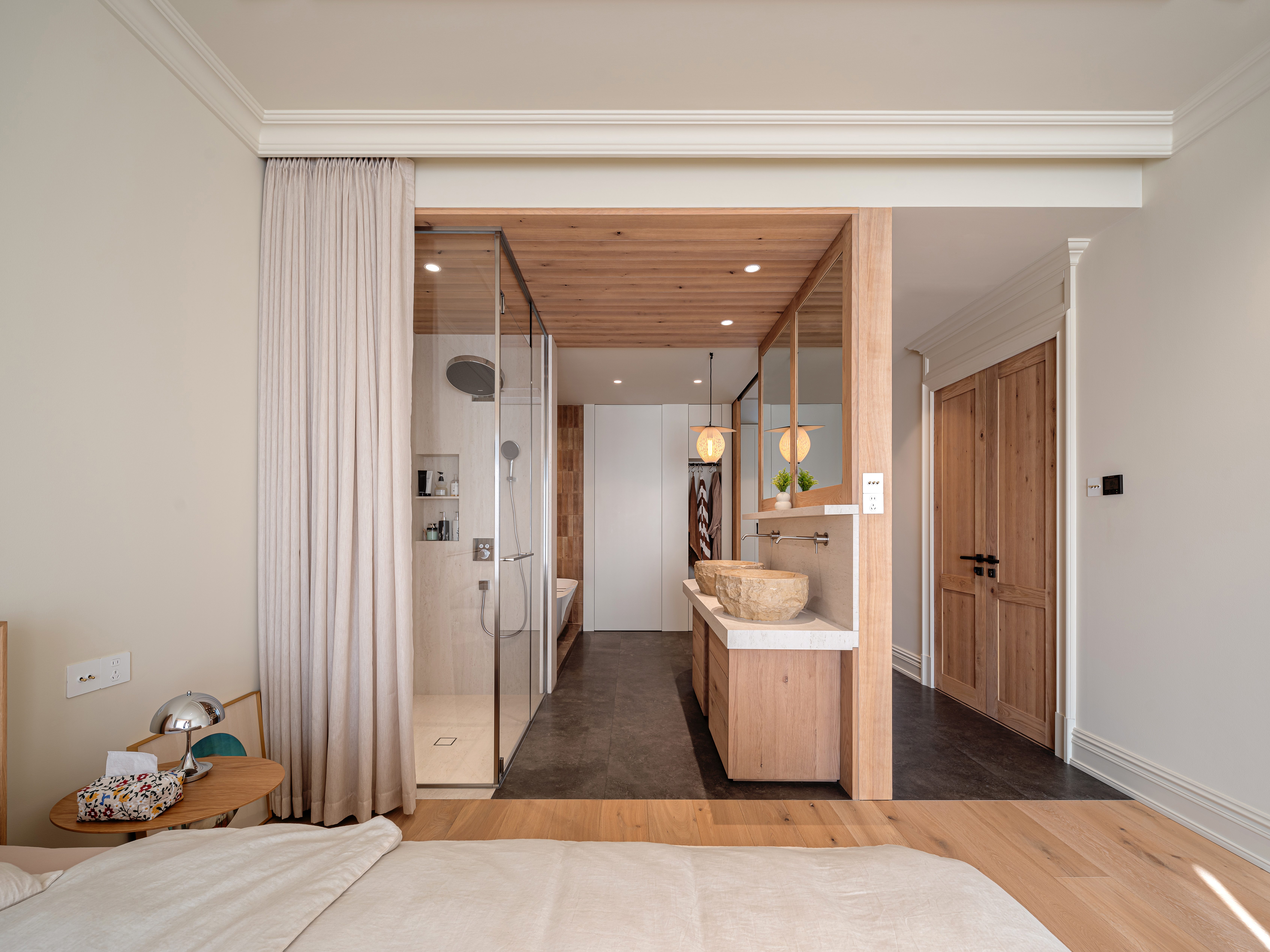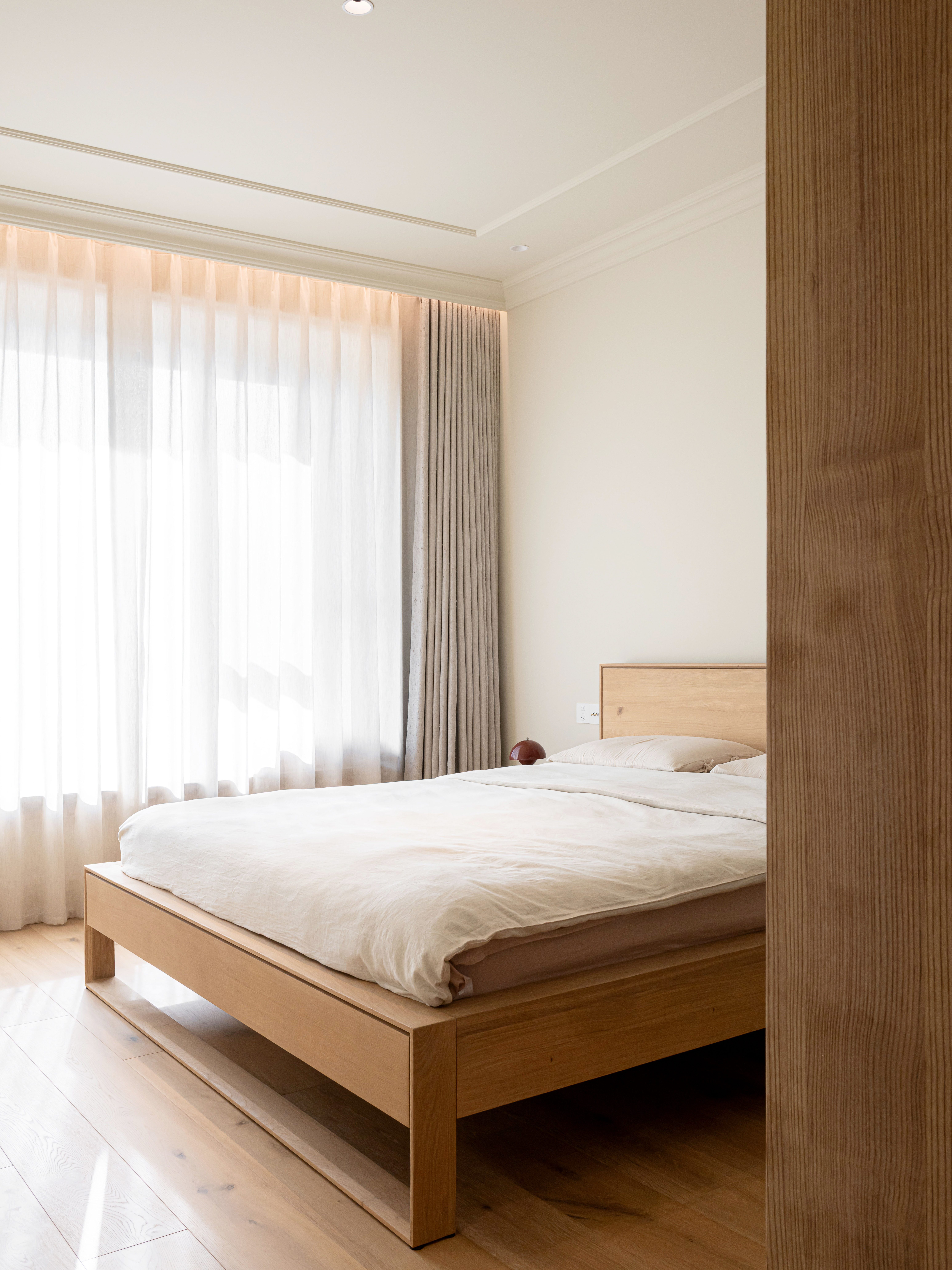空间布局:原始格局是一个三室一厅的家,根据业主的需要我们将这个家改为两室,将两个房间联通,让主卧室变成超爽的套房,“休息+淋浴+双台盆洗手池+衣帽间”。空间功能被一条洄游动线串联起来。餐厨区域使用了木质吊顶,用瓷砖铺地将其与客厅区域分开来。不同于国内常见的定制家具,在这个项目中使用了砖砌橱柜的做法,耐用不贵,又天然感十足。卧室的床也选择了经典的法式架子床,搭配亚麻帷幕,舒适的小窝是自己专属的“度假空间”。