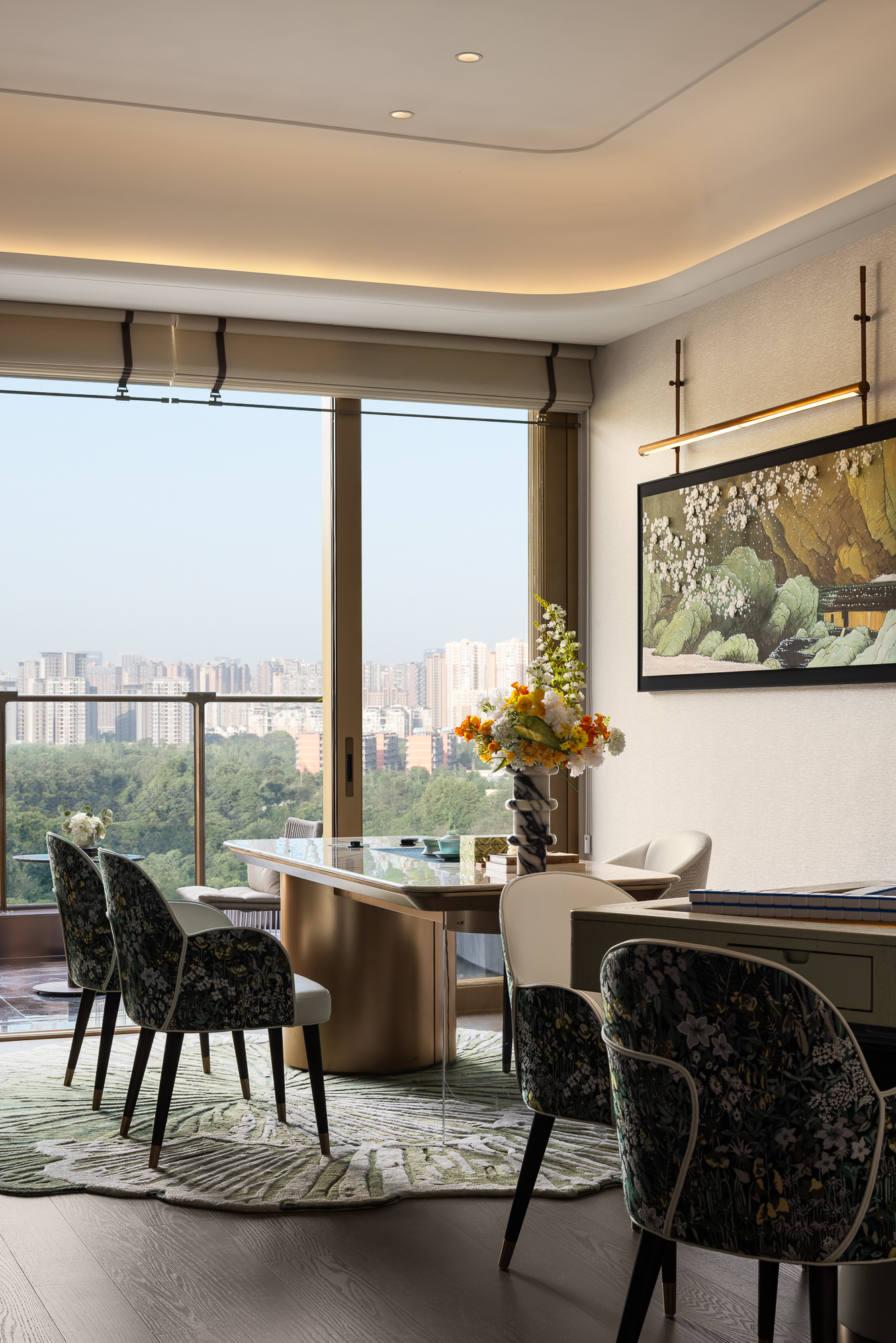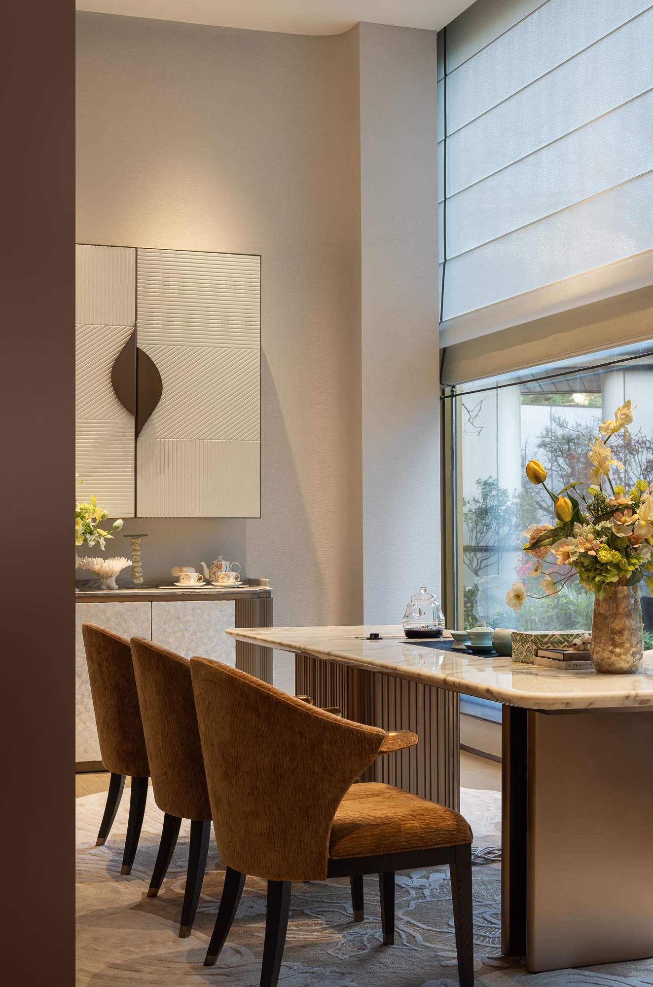 复古织花靠椅轻挨在茶桌金属桌腿旁,山水挂画西技挥洒东方墨韵,地毯纹理述说时光的柔,浸着东方茶室的静雅,又不乏西式沙龙的闲适。