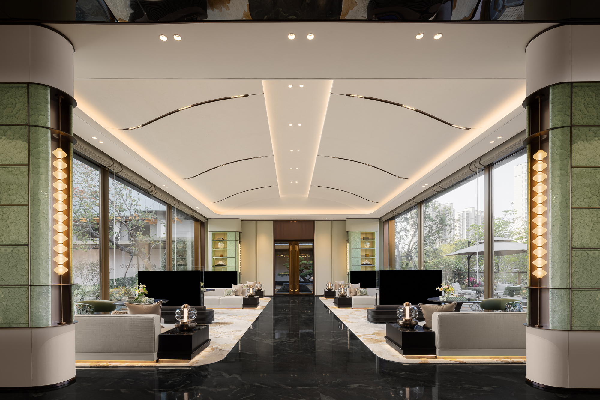 空间意境:福州秀山售楼处会所的环境风格创新点在于:以“海风咸,东西并蓄”为核心,将福州滨海文化与五口通商历史融合,通过新古典与现代简约的腔调共生,实现东方意境与西方元素的巧妙碰撞。
