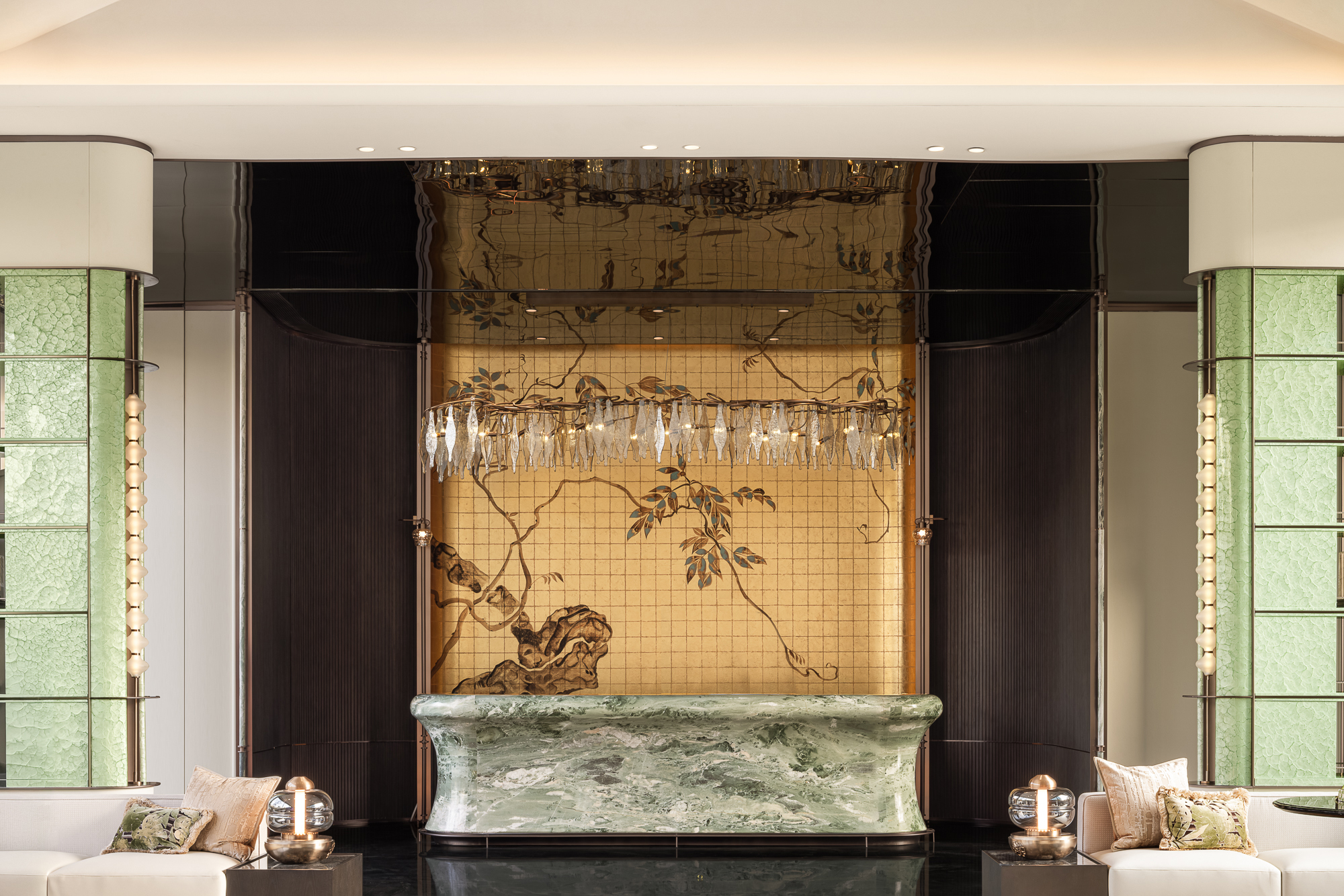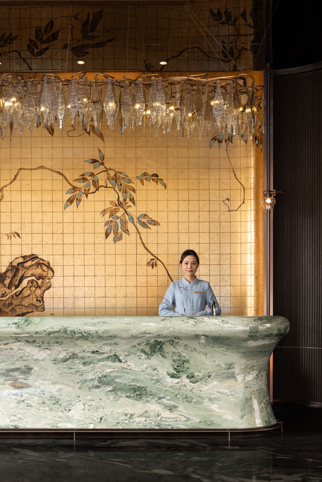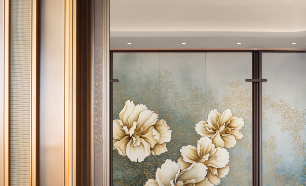 铜门庄严,洒金暗花起鼓;金属编窗,透光斑驳轻盈。大理石似青峰重峦,天然随机纹理交织绿意,黑白拼花大理石提炼自福州市花茉莉花形象,呼应并衬显背屏浅金勾勒漆画茉莉花的层叠舒展、清雅高洁。