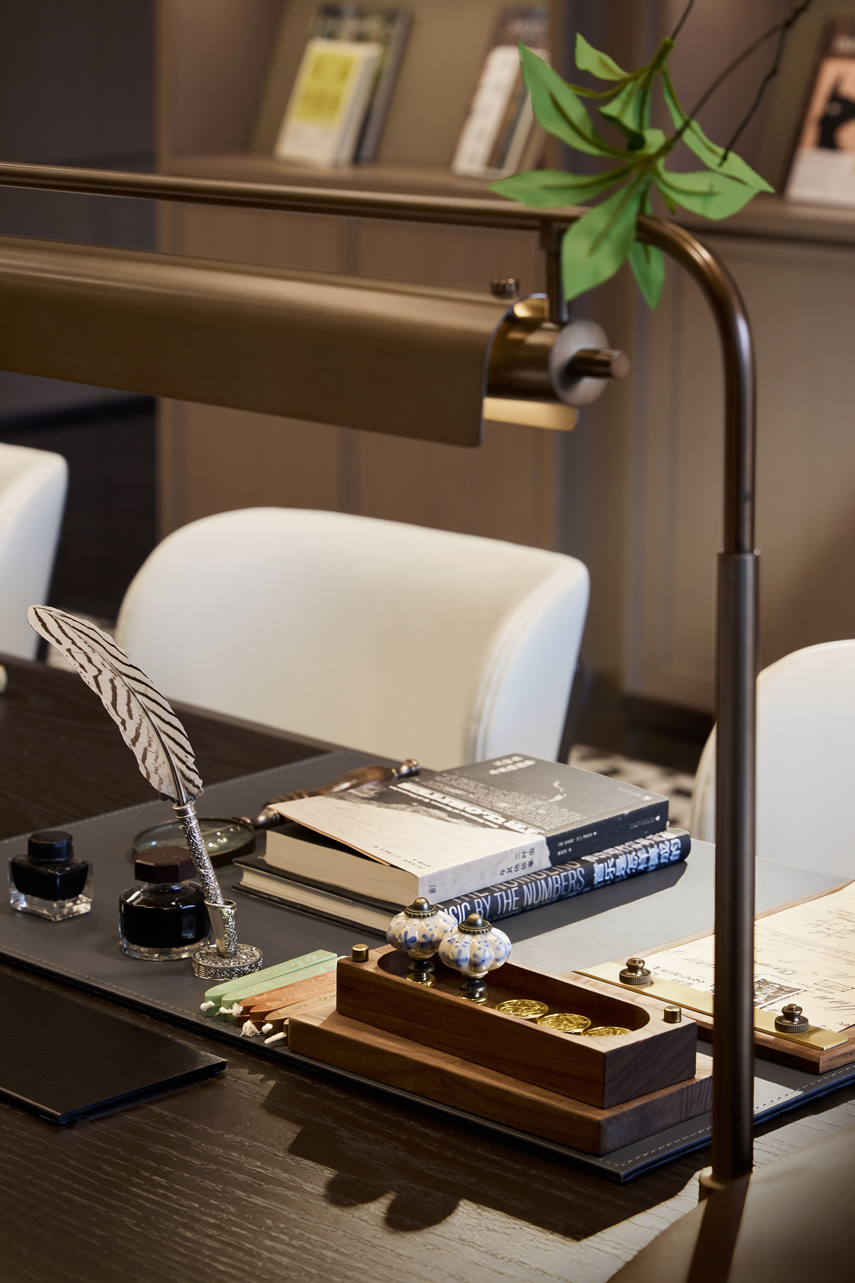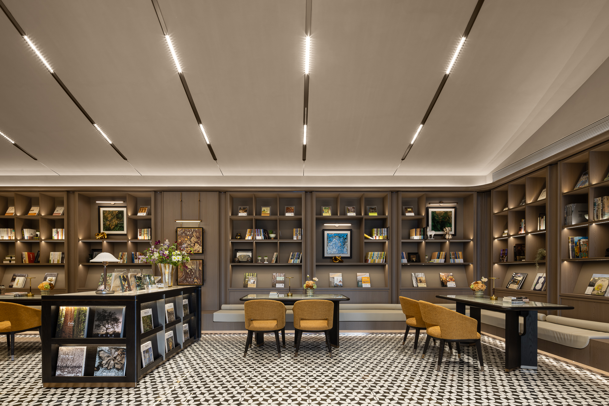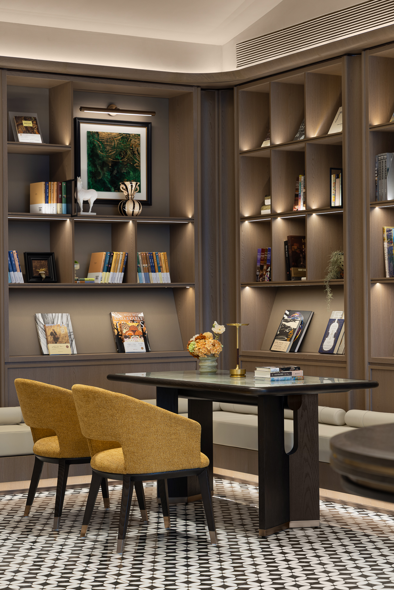 木质书架坚韧温润,秩序排列,嵌摆西式台灯穿插点缀;花瓶造型抽象、轮廓柔和,插鲜花挟裹自然清息;墙间画作题取自然,揉东西方笔触,绘花、草、湖、雨,色调冷暖相宜,同空间共鸣。