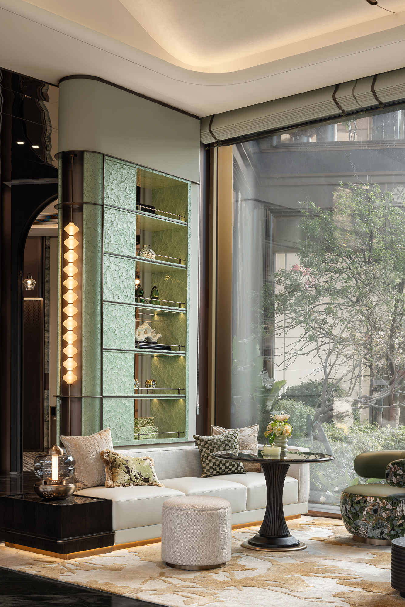 起拱吊顶折落浅金碎光,两侧柜体以定制绿色树脂板模拟福州大漆的肌理效果,柜子主体同金属材质彼此作用,在壁灯牵引视点的暗示下交织出穿插构成的体块;暖芒轻晕,柔光抚摸摆件的釉面,衬得米白沙发柔糯软细
