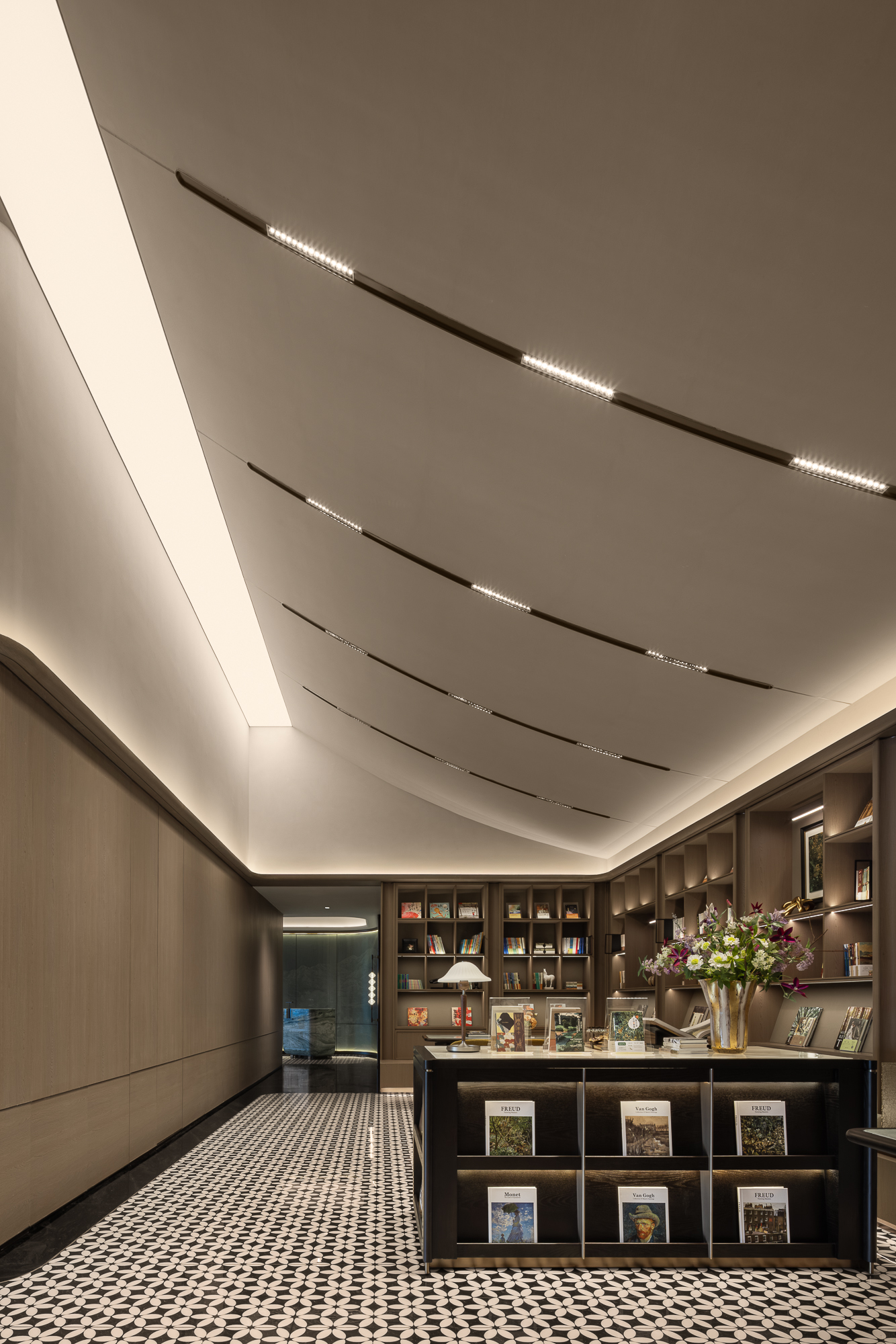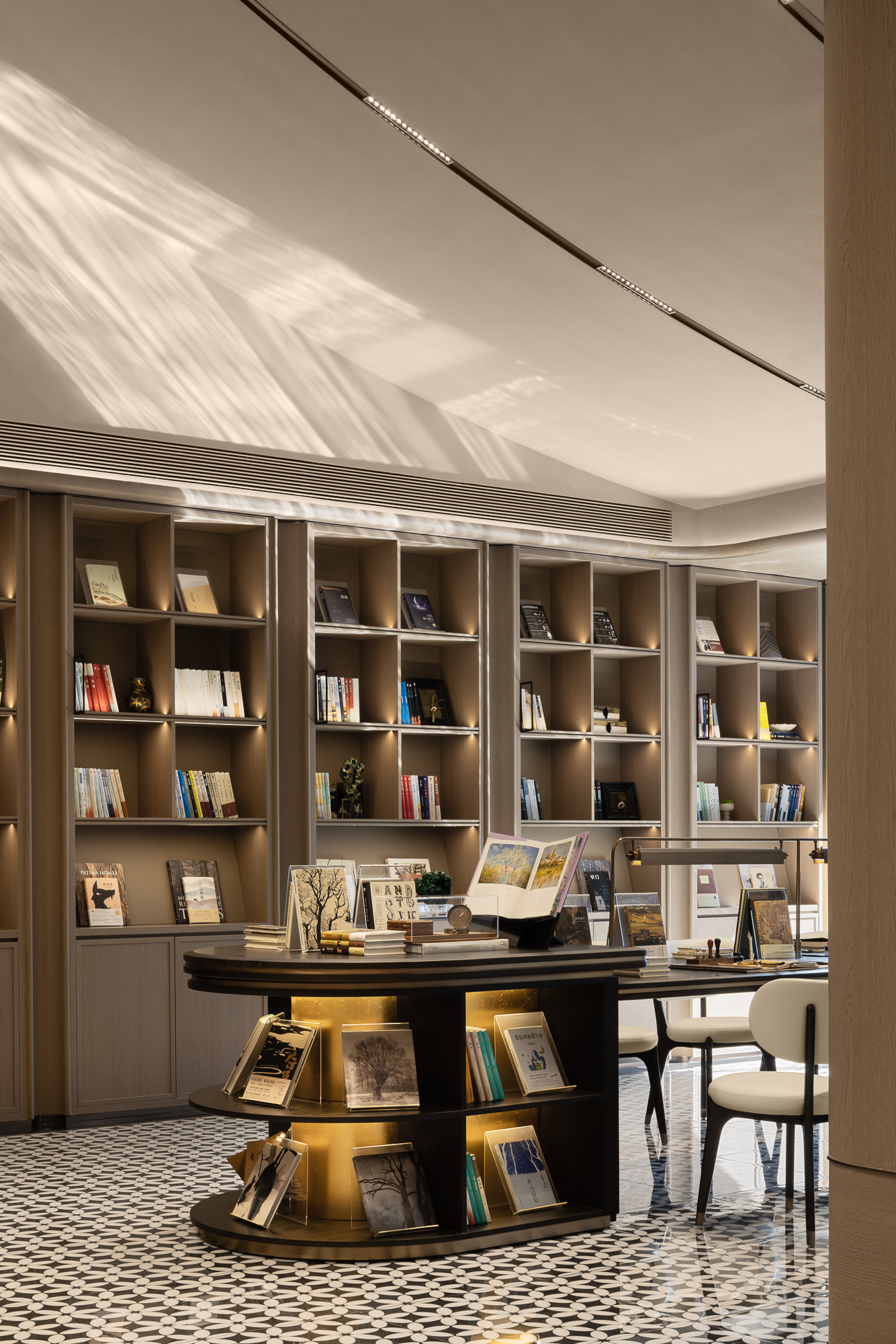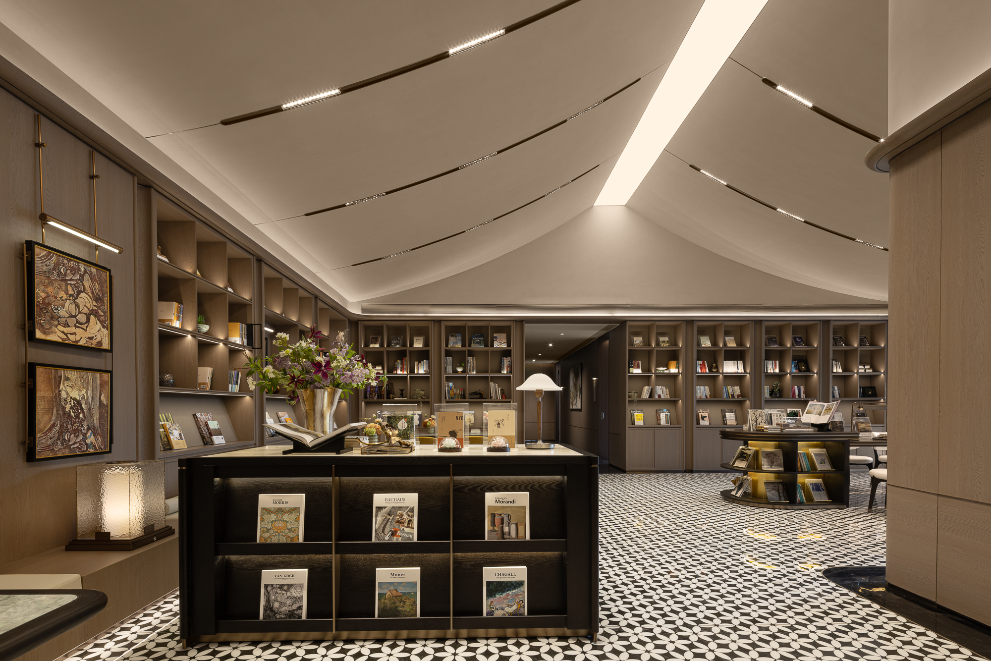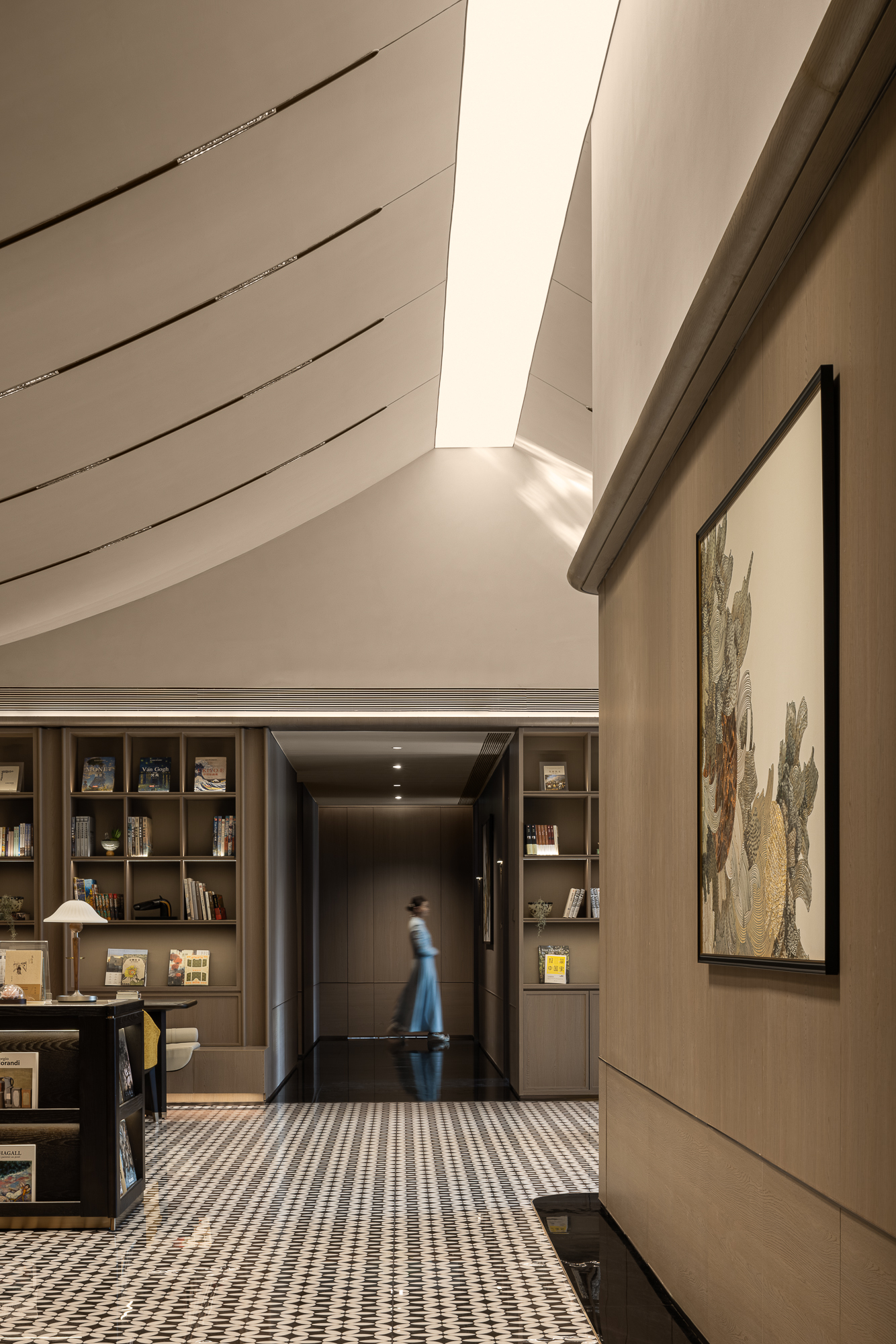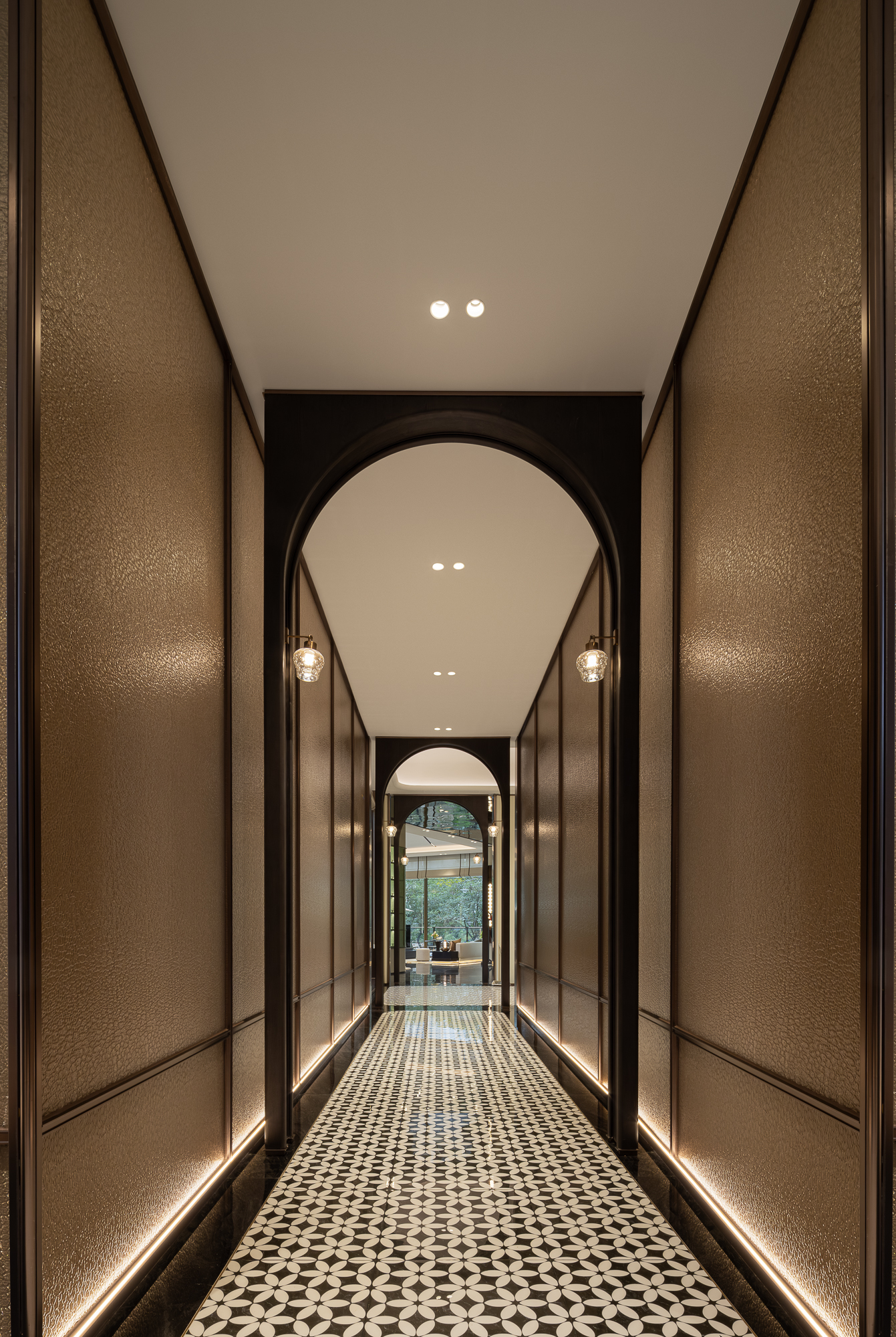将新古典主义的调性揉入现代简约的框架里:圆形花厅暗示内聚的“向心力”;长廊悠悠,咖调内敛;纹理如同潺潺流淌的时光,光影流转,牵引一番沉浸探索的“复古”腔调