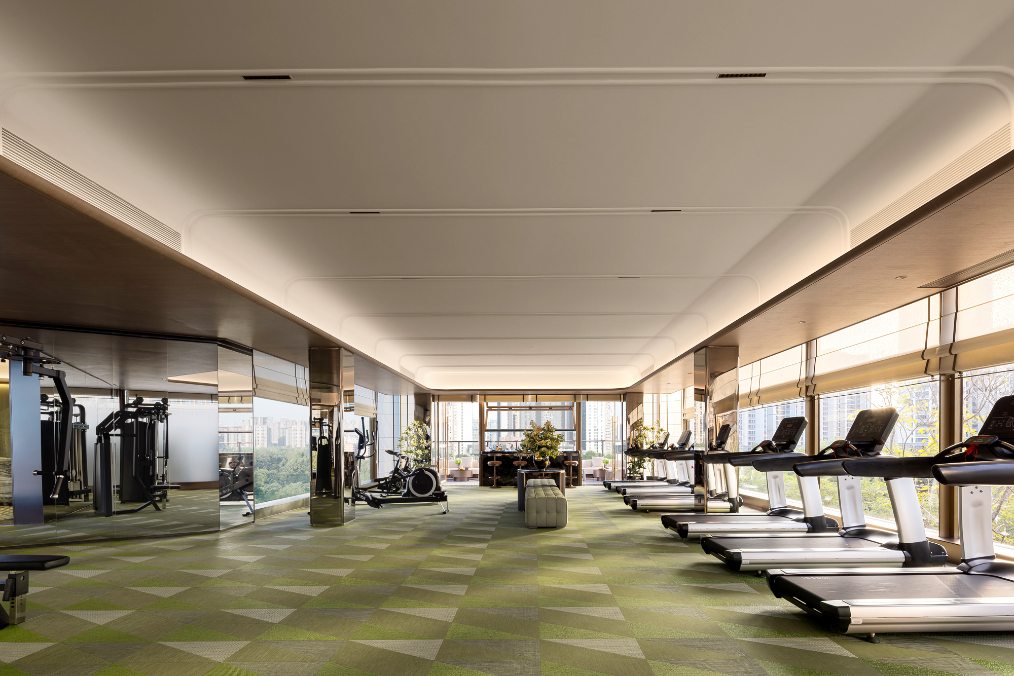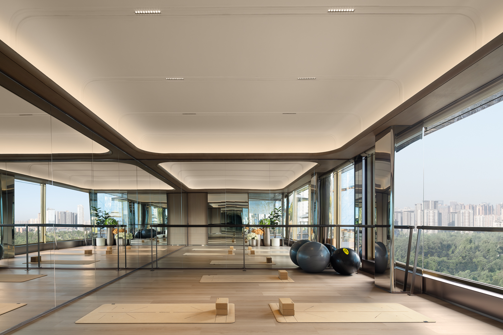 空间布局:福州秀山售楼处会所的空间布局创新点在于:以“消隐交互”为核心,打破传统单向输出模式,采用隔而不断的布局策略(如弧墙转折、定制柜体穿插),实现空间的柔性分隔。通过落地窗弱化室内外边界,将自然景观(如中庭林泉雾景)引入室内,营造“与自然共赴”的沉浸感。同时,开敞区域预设多元使用状态(如健身房设施的随意摆放),强调包容性与互动性,使私密与开放、传统与现代在流动中达成平衡,形成兼具仪式感与生活化的复合场景。
