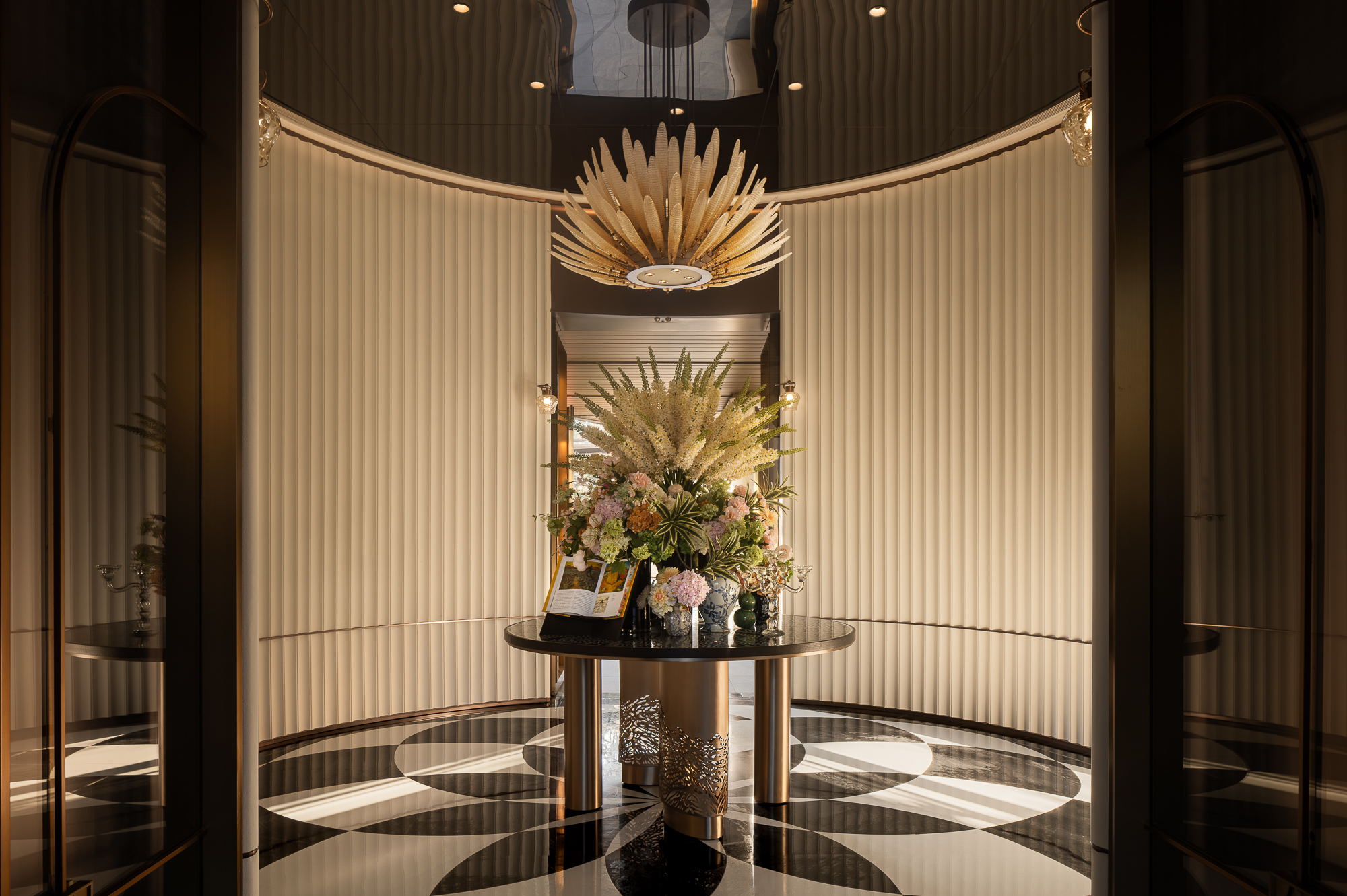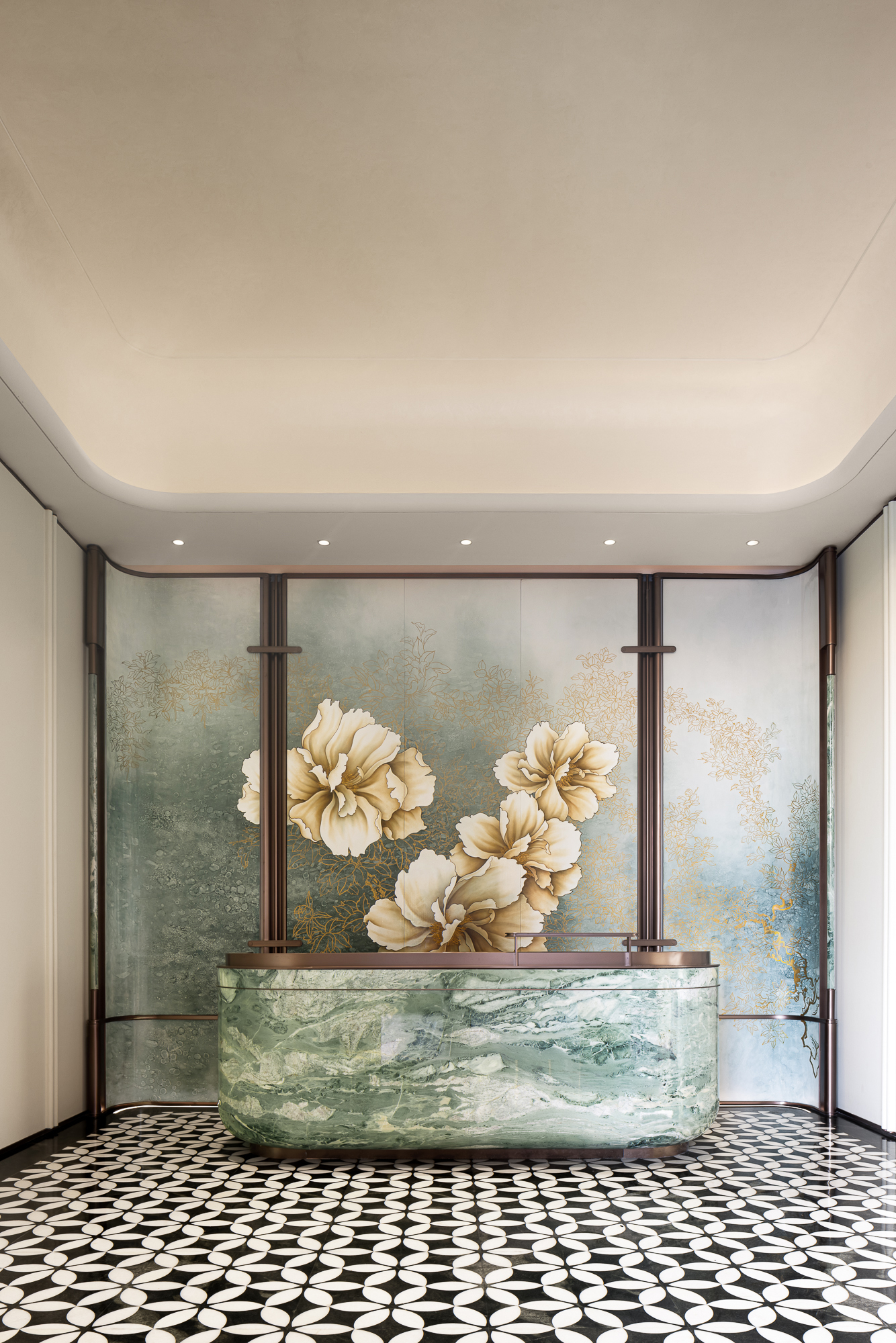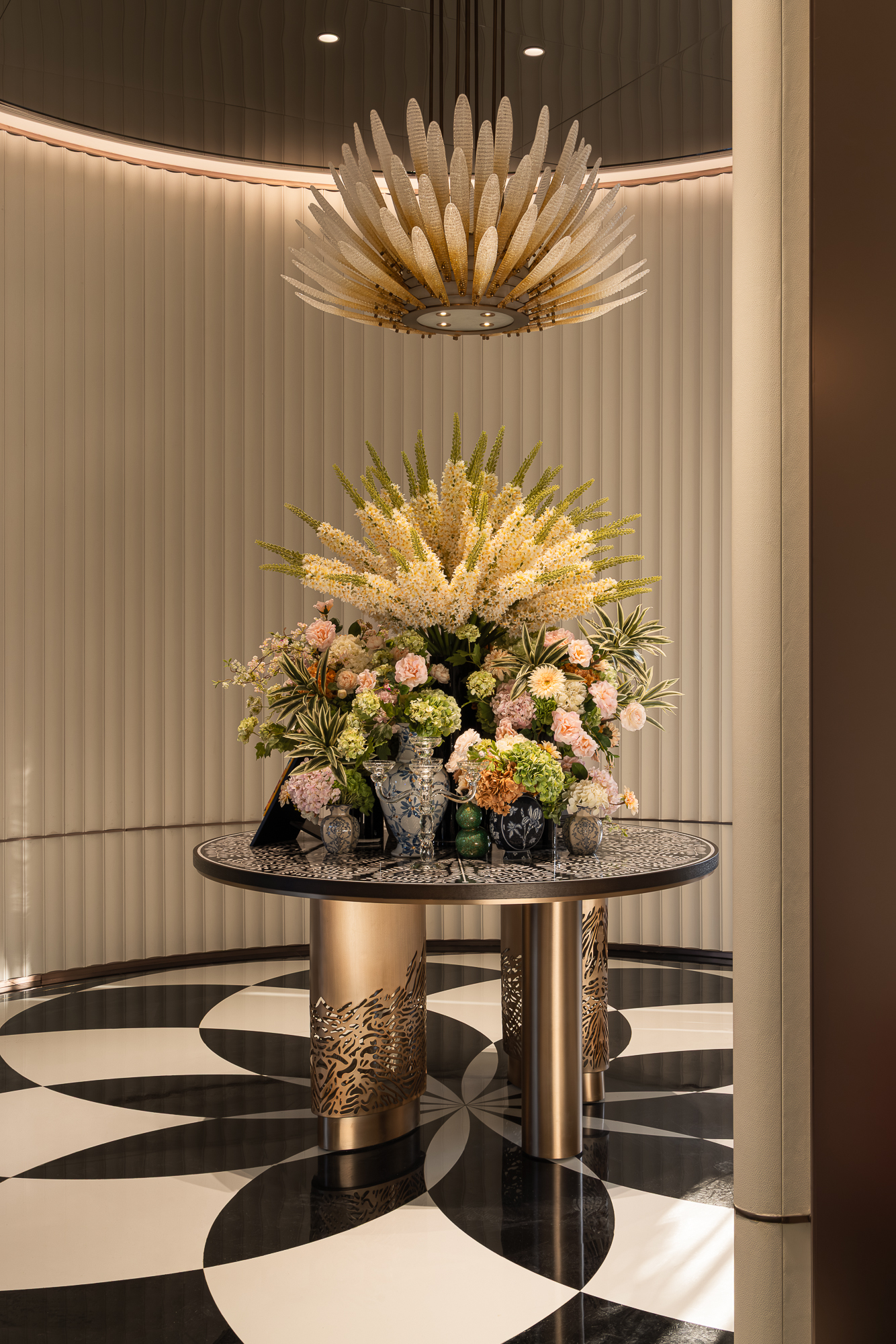 当鎏金枝头的水晶花蕊轻轻绽放绰约花簇,暖调光晕漫过了圆弧竖纹墙的规律柔褶;鹅黄、翠绿、粉红、浅紫——鲜花簇拥,叠成春日余韵;金属雕栏镂空柱脚静立在以茉莉花为形凝练成的黑、白花砖秩序铺展放射的浪漫氛围中