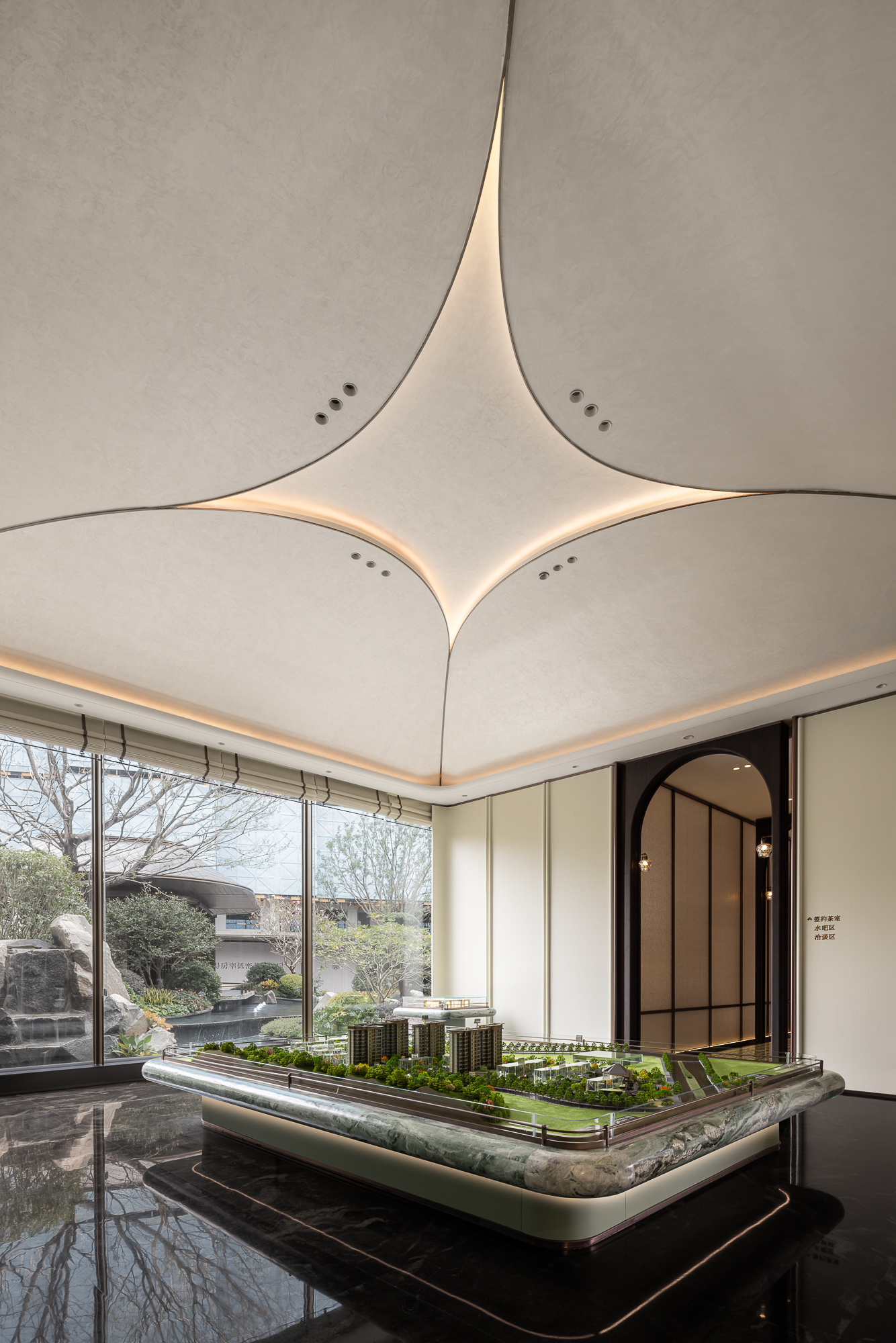 当白墙点缀起鼓饰线温柔地掩遮窗外绿影青水,吊顶中式元素取茉莉花瓣为形与铜钱“孔方”复合,寓意吉祥;调和圆拱门廊、左右壁灯的西式浪漫,带来东西并蓄的微妙体验。杂糅“多元性”的场景氛围,意图通过某种潜移默化的形式将当代审美释译于东方意蕴的精神内,又恰如其分地显露鲜明个性。
