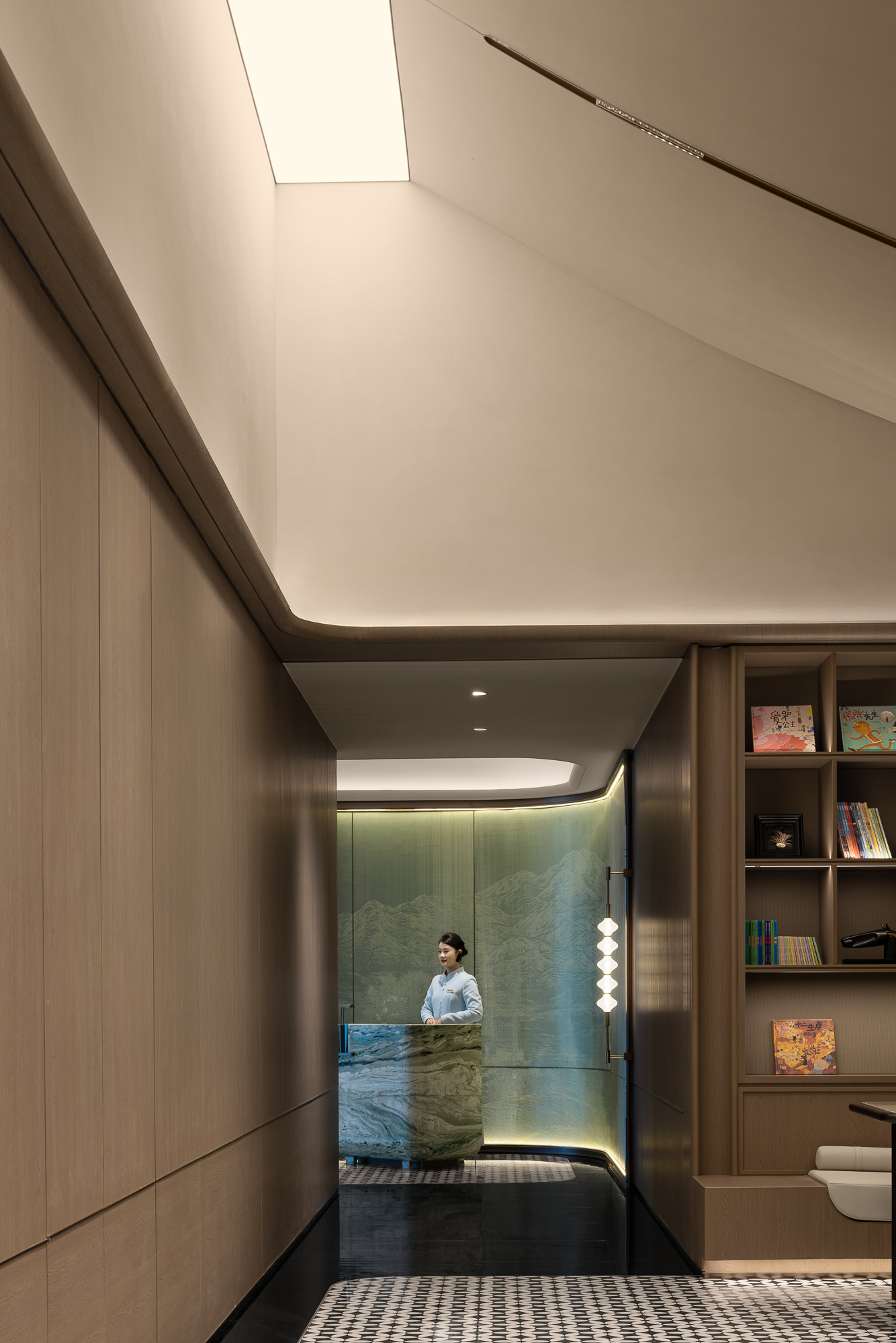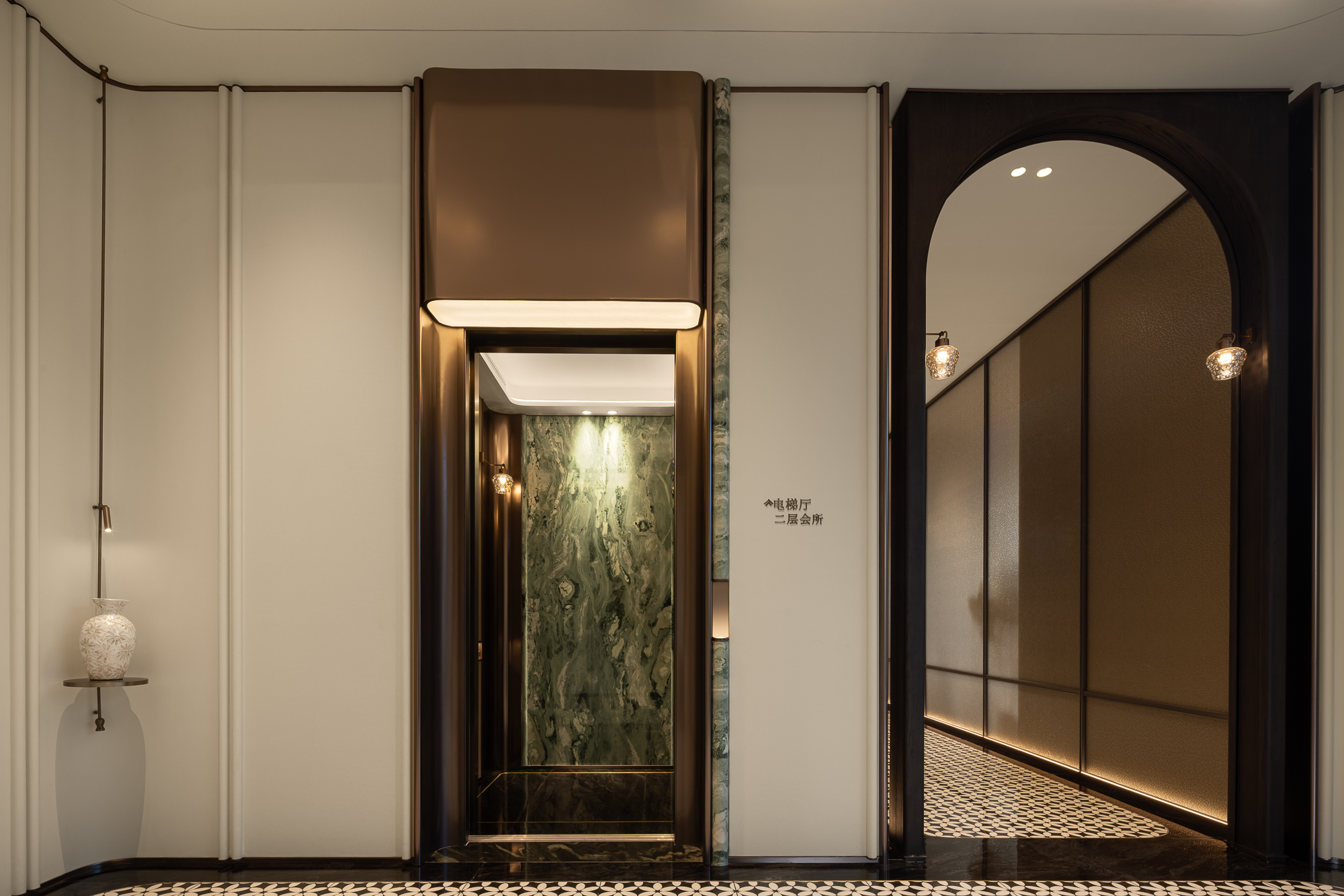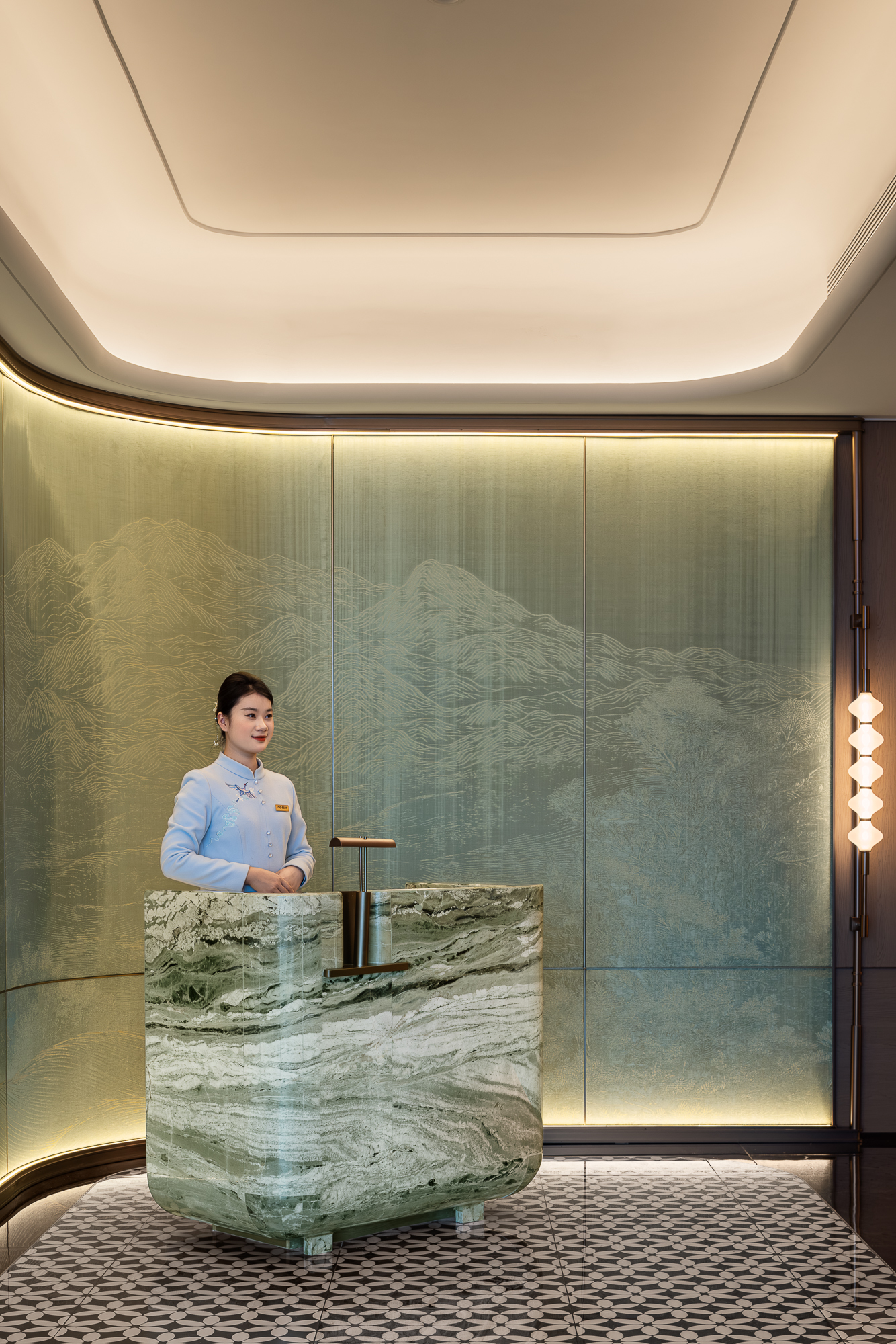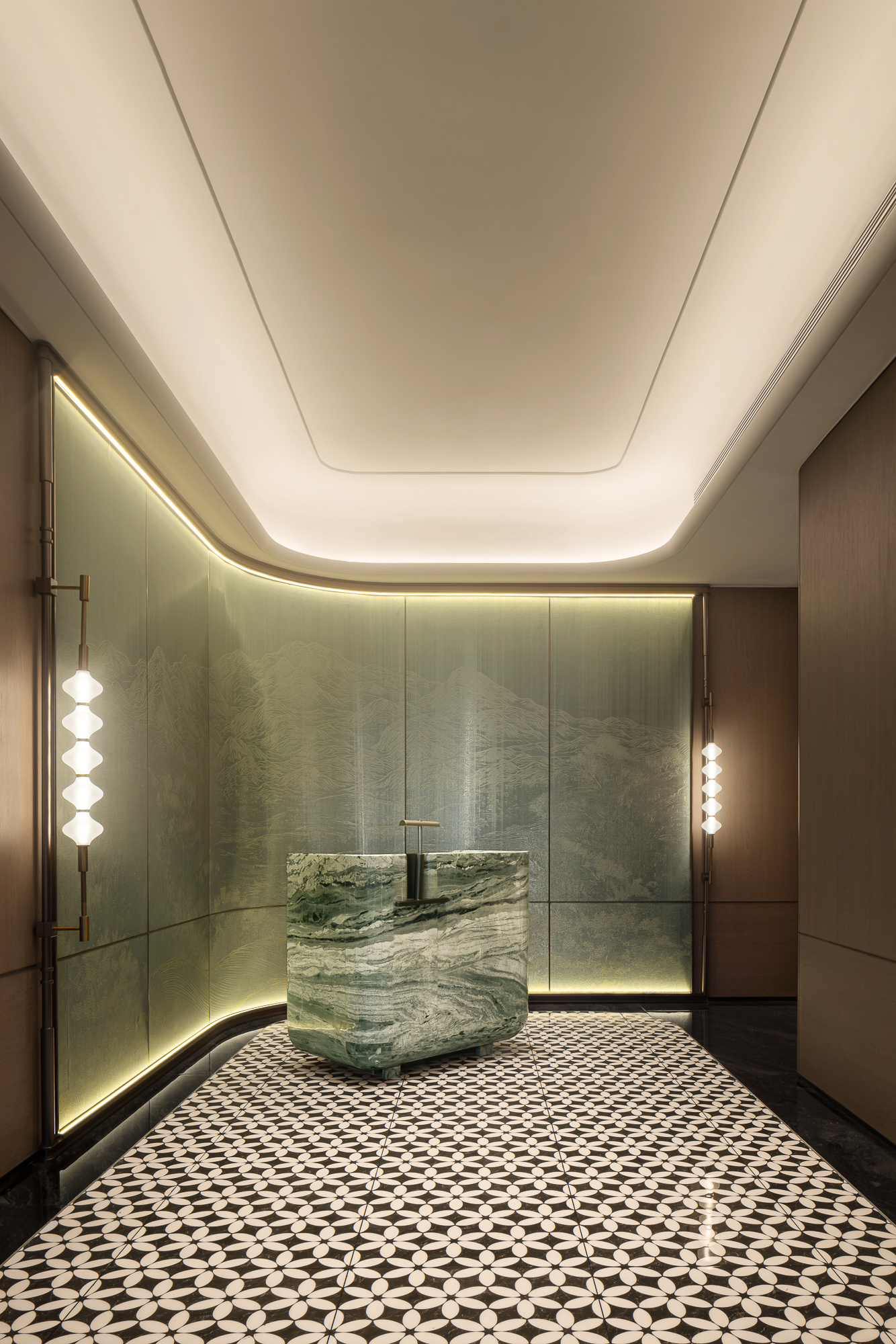 灯光牵引弧墙圆润转折,墙垣皴染山岚肌理;天然石材青玉般的质感,在“茉莉花”形地砖铺延上置入一抹自然苍劲;两侧灯串形似灯笼,垂落的光把山水悠逸揉进墙面,然后在旧时光的纹理间流露缕缕古韵幽意。