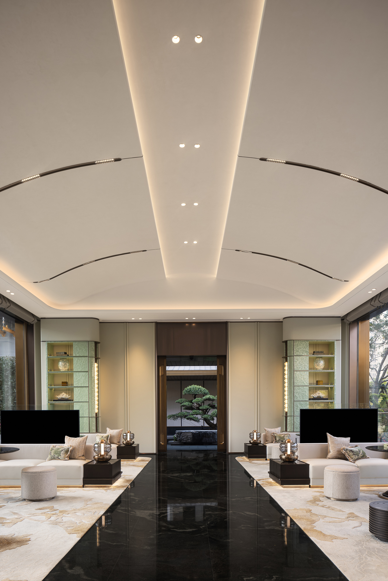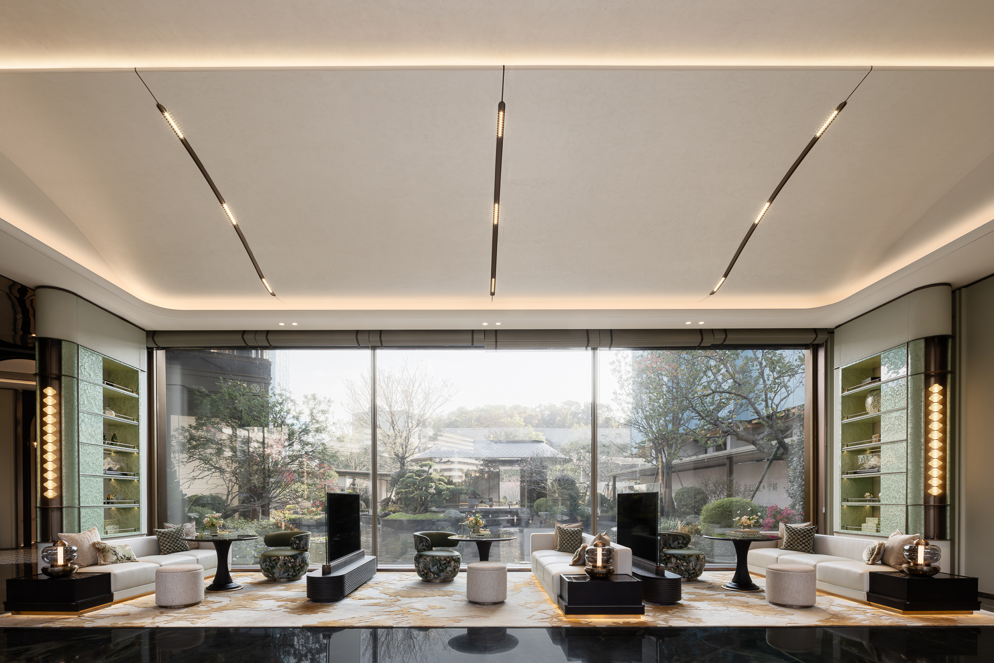 巨幅玻璃裁截天地作框,中庭林泉雾景,裹挟氤氲水气穿牖而来;植影藏绿,叠石漱溪,了无痕迹地把自然清旷揉进此间的“软绒”里