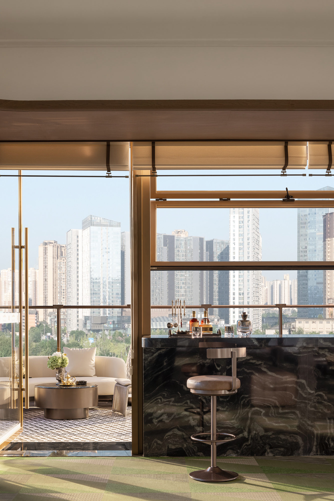 无论是大尺寸落地窗收纳窗外之景,亦或翠绿大理石吧台呼应陈列柜饰面的浅青,设计着力营造一种“与自然共赴”的疏畅开朗
