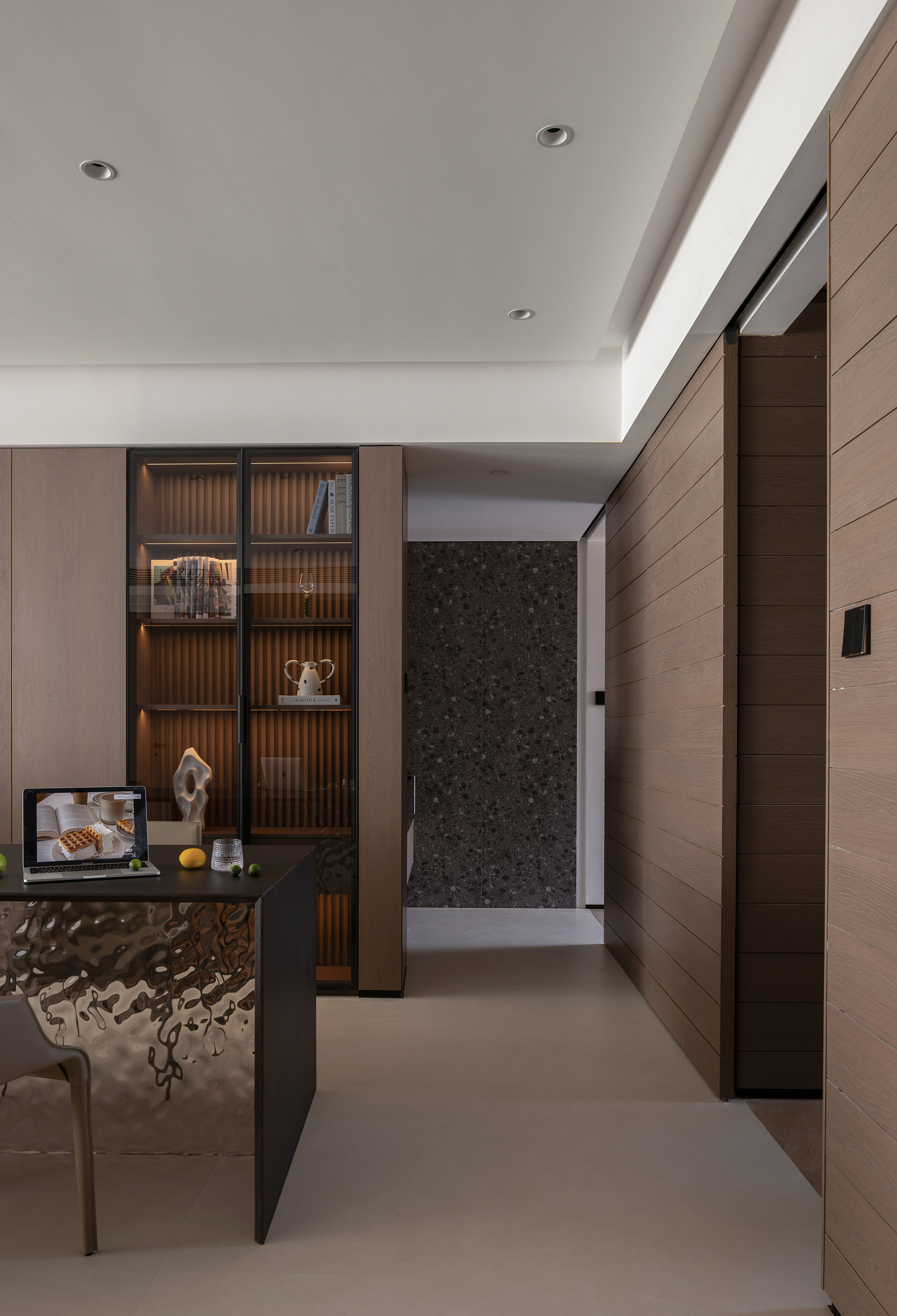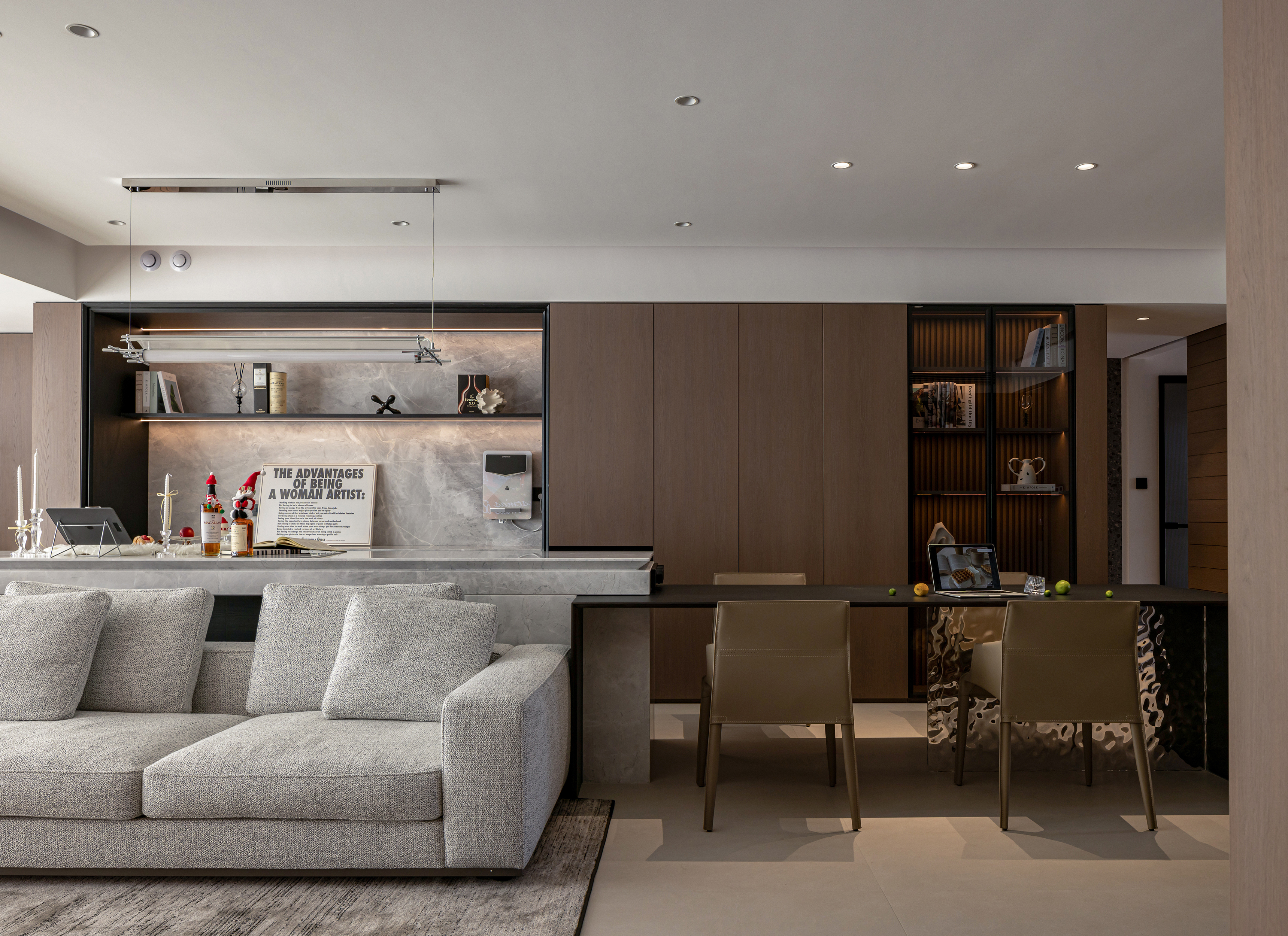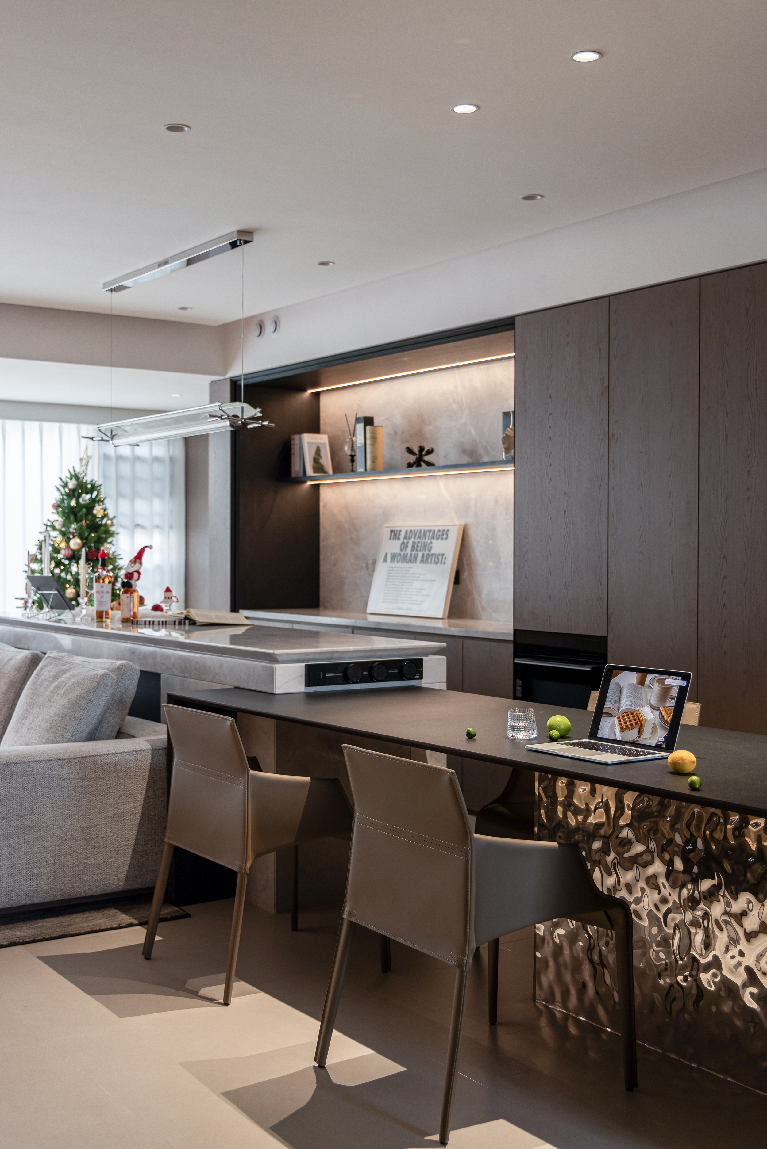 空间意境:客餐岛一体构成复合体块,既满足日常备餐、用餐、聚会需求,也是一家三口情感联结的纽带。环形动线让烹饪、交流、用餐自然衔接,也可在父母忙碌时,引导孩子共同制作料理,构建亲密的互动关系。