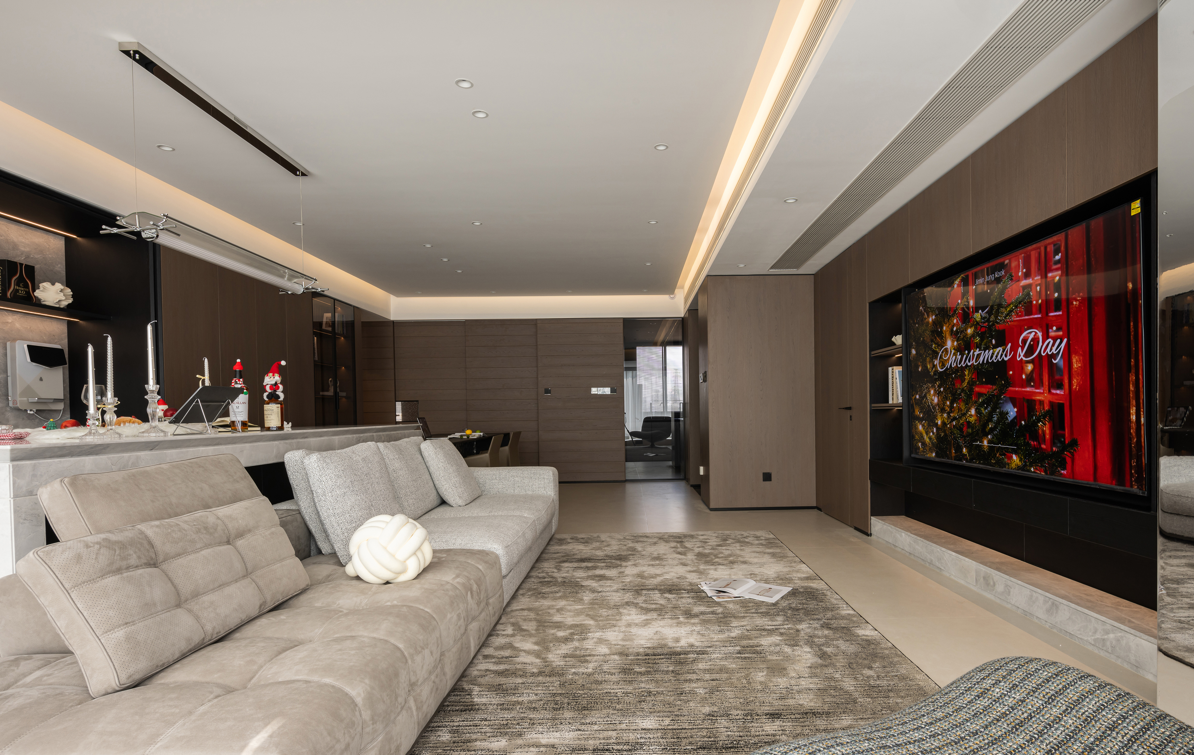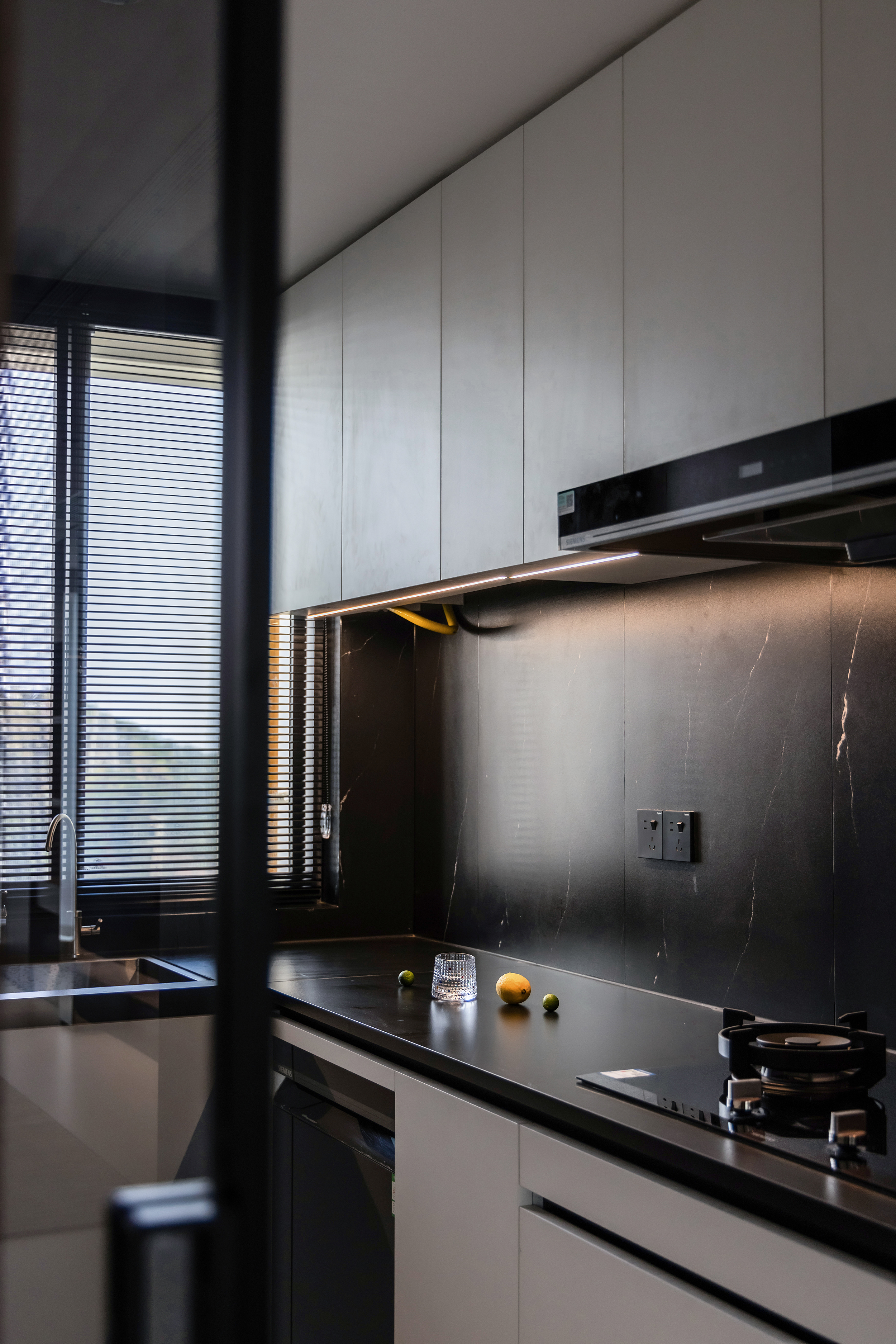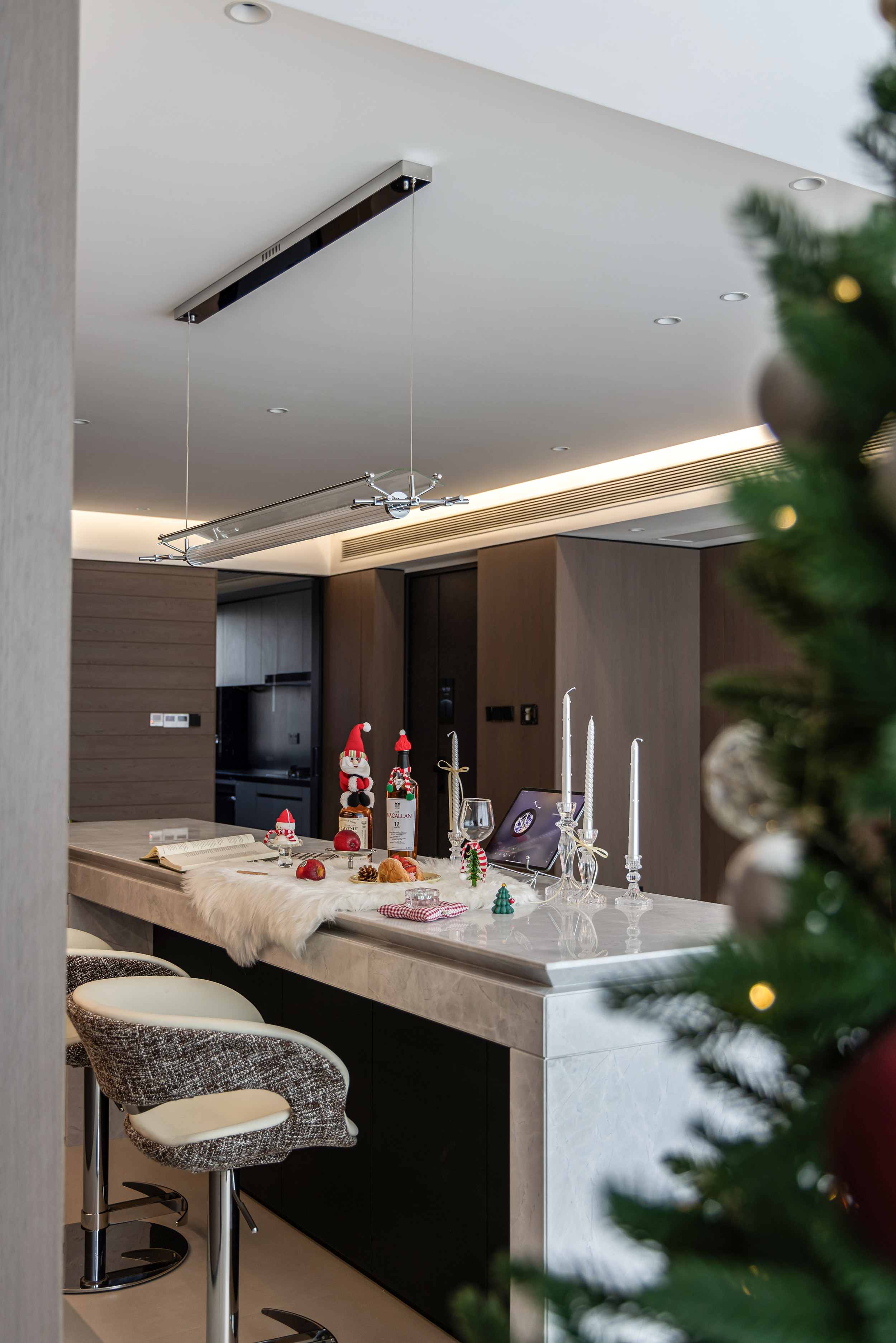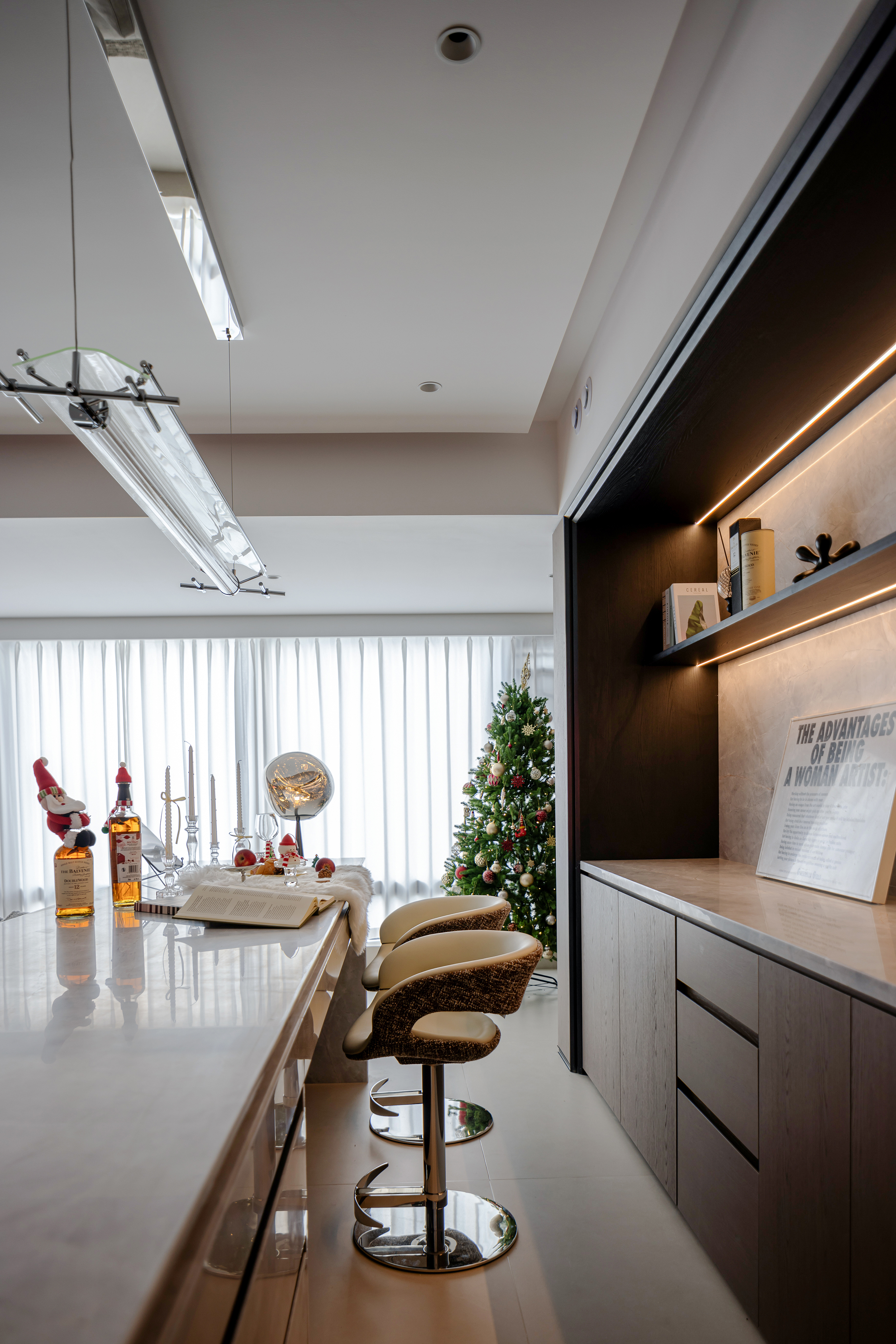 空间意境:客餐岛一体构成复合体块,既满足日常备餐、用餐、聚会需求,也是一家三口情感联结的纽带。环形动线让烹饪、交流、用餐自然衔接,也可在父母忙碌时,引导孩子共同制作料理,构建亲密的互动关系。
