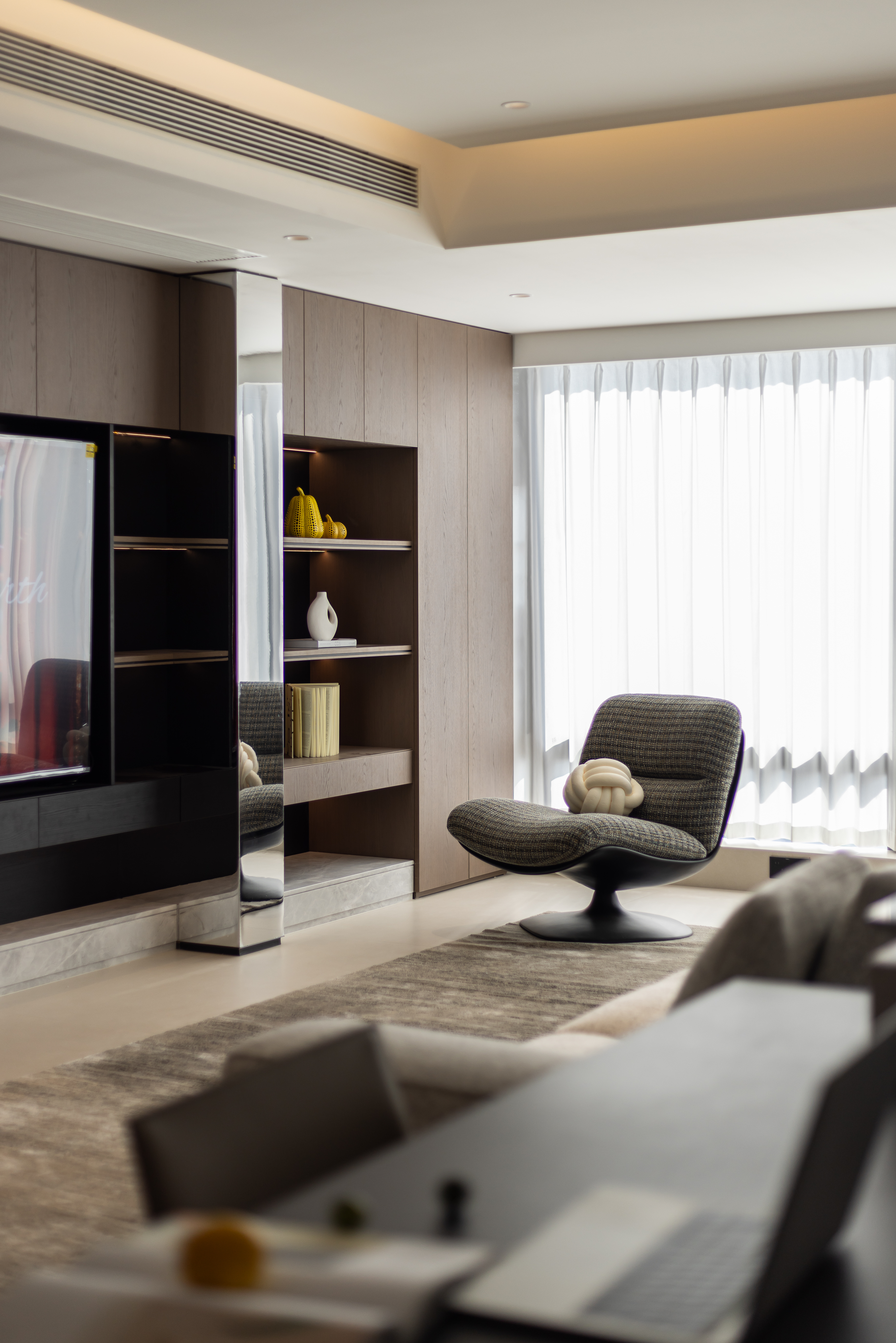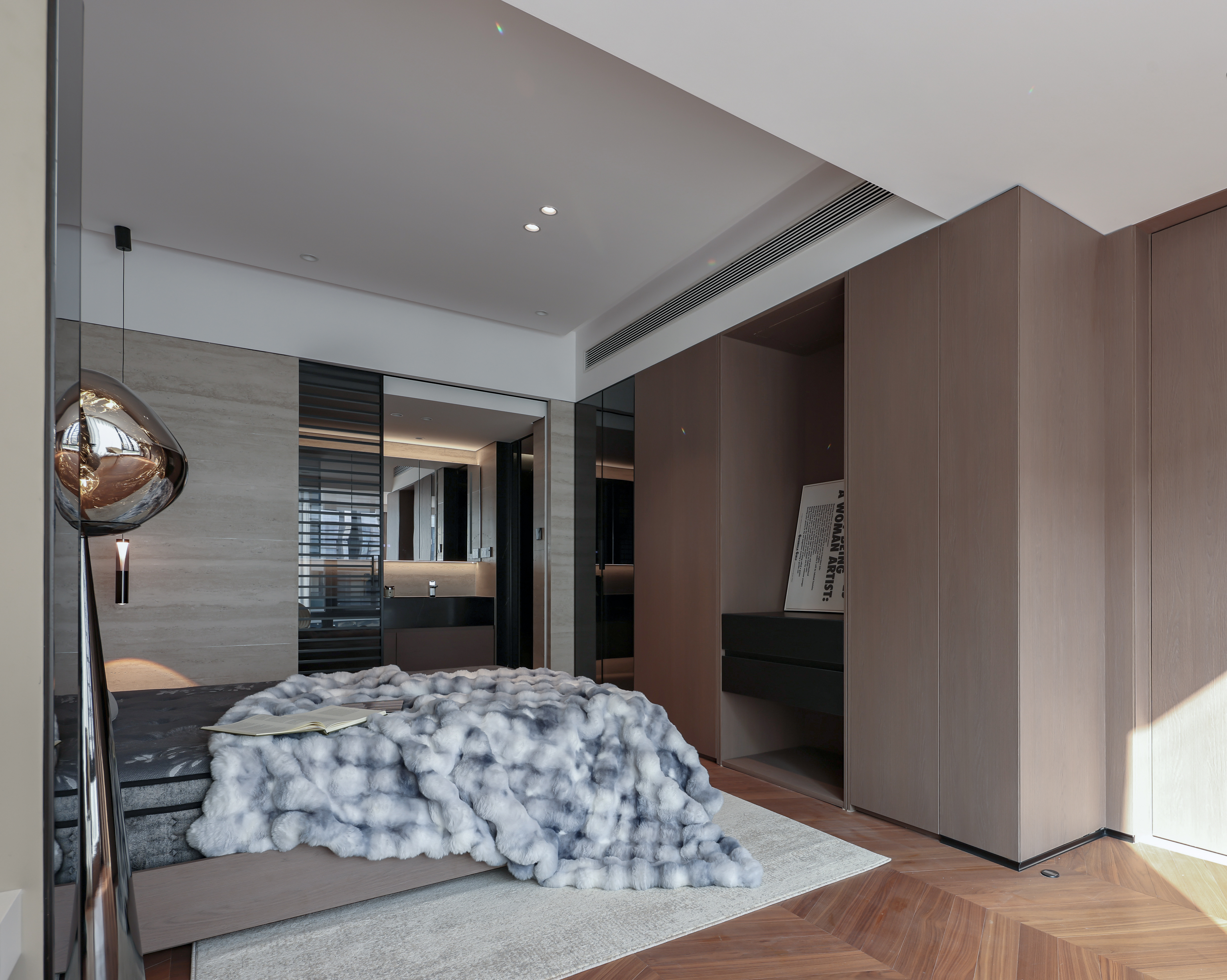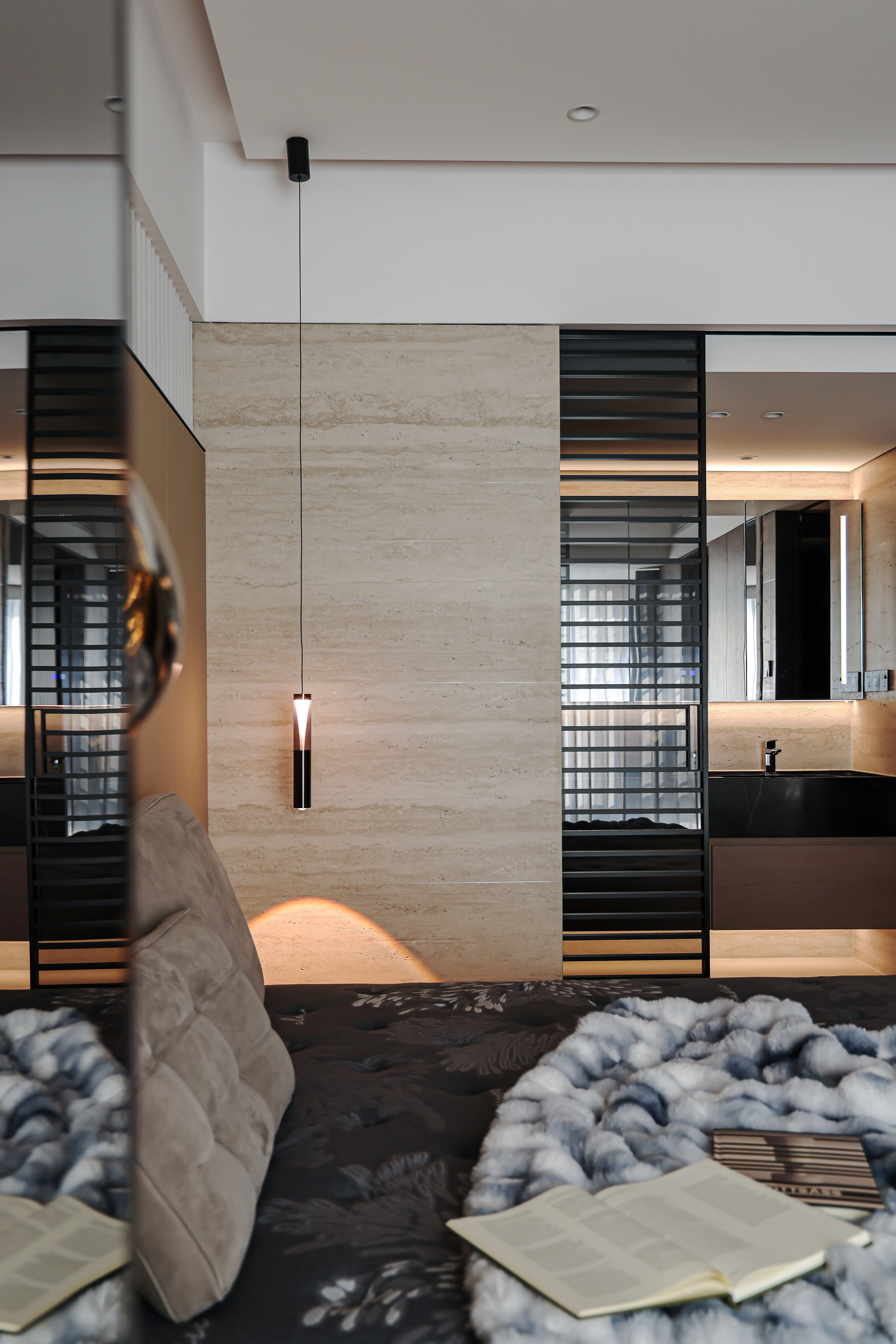 用户体验:主卧镜面微倾,笑靥入画。静然享受属于自我的一点奢侈时光。丰富的材质与线条,达成自然趣味与沉静自持的气质糅合、简化陈设、收束齐整的客卧内,独辟一处陈列区,让时光在这里发酵。明暗色系对比,打破空间沉闷,于细节中隐现雍容文雅的气息。