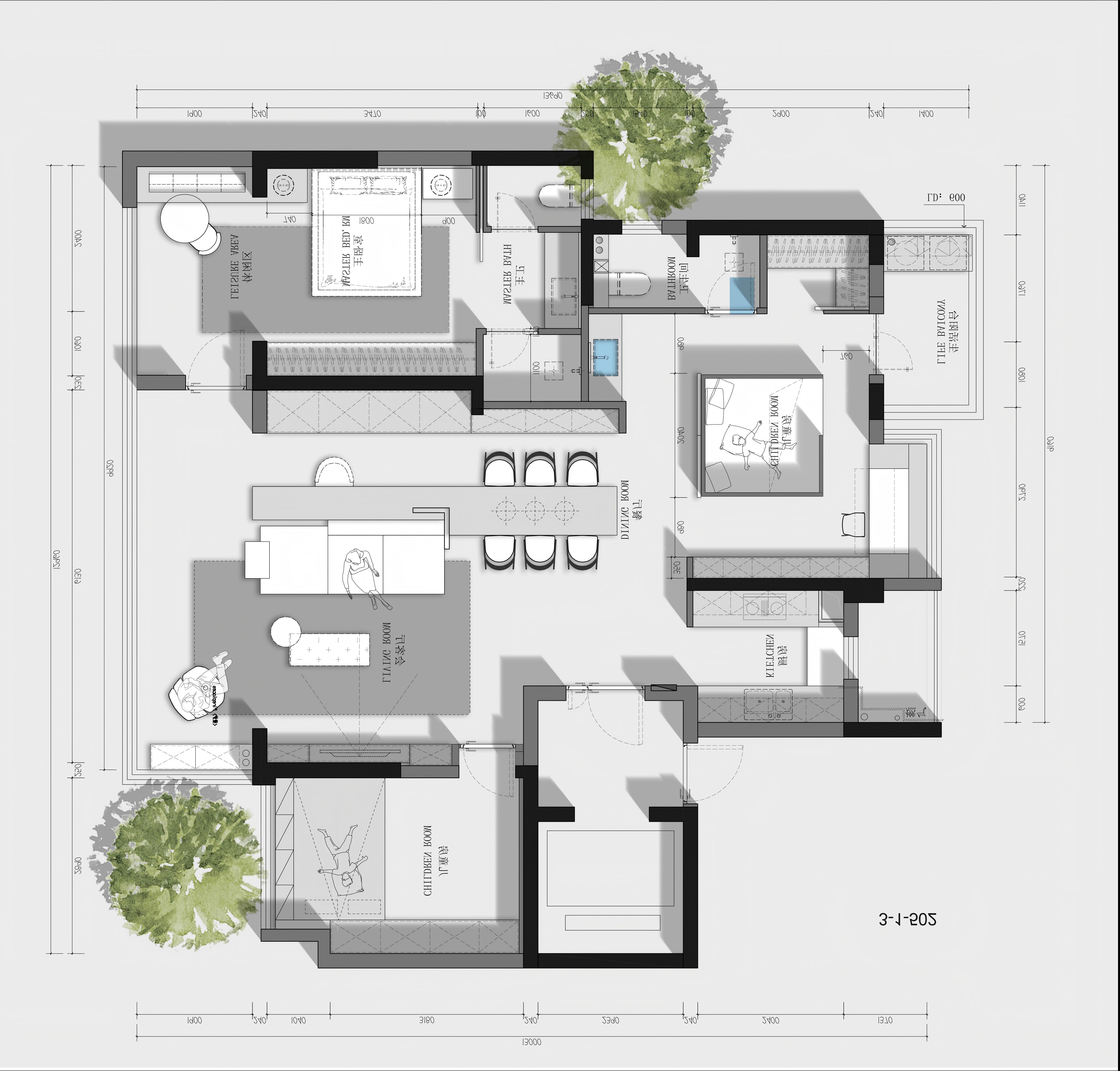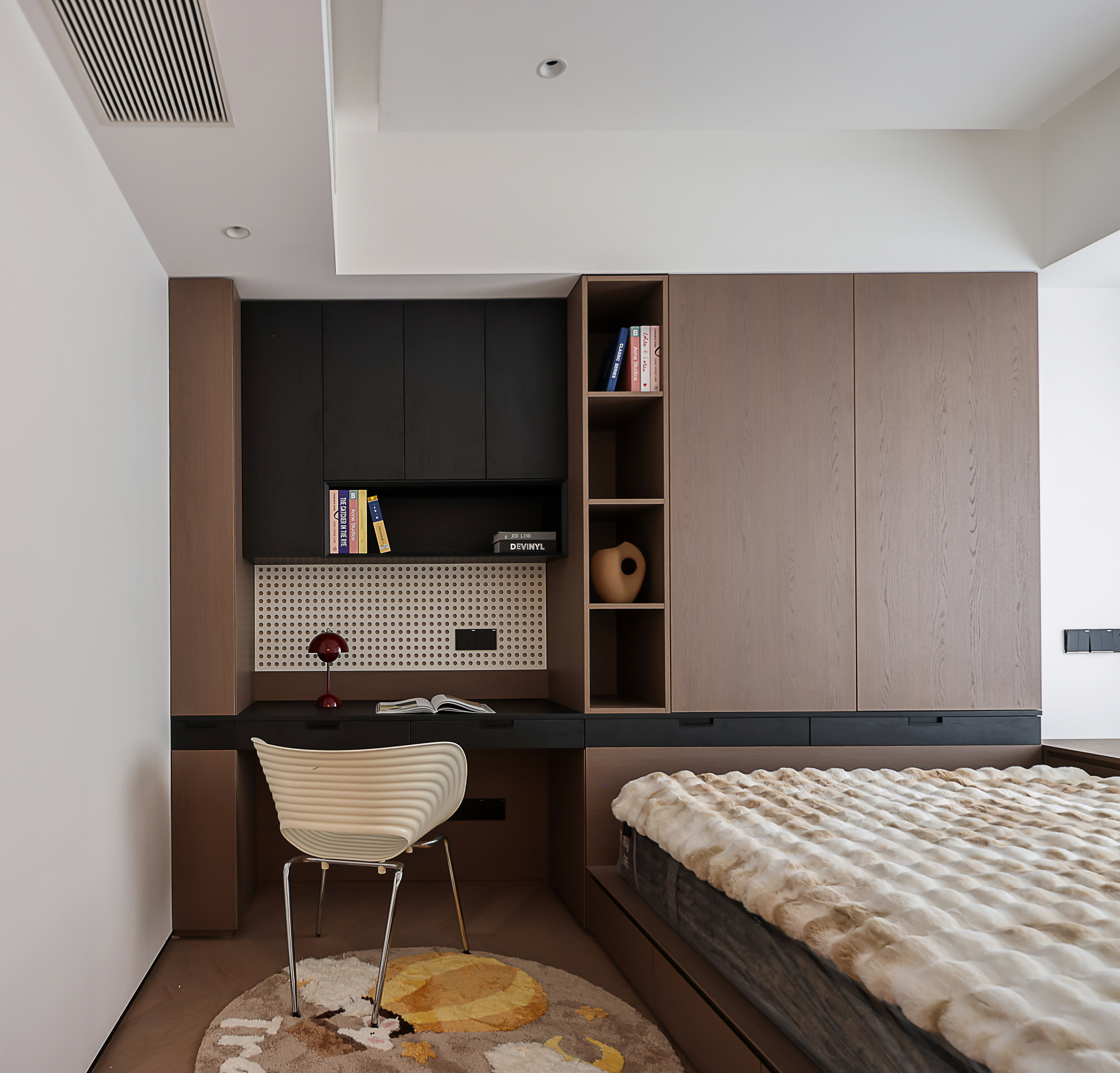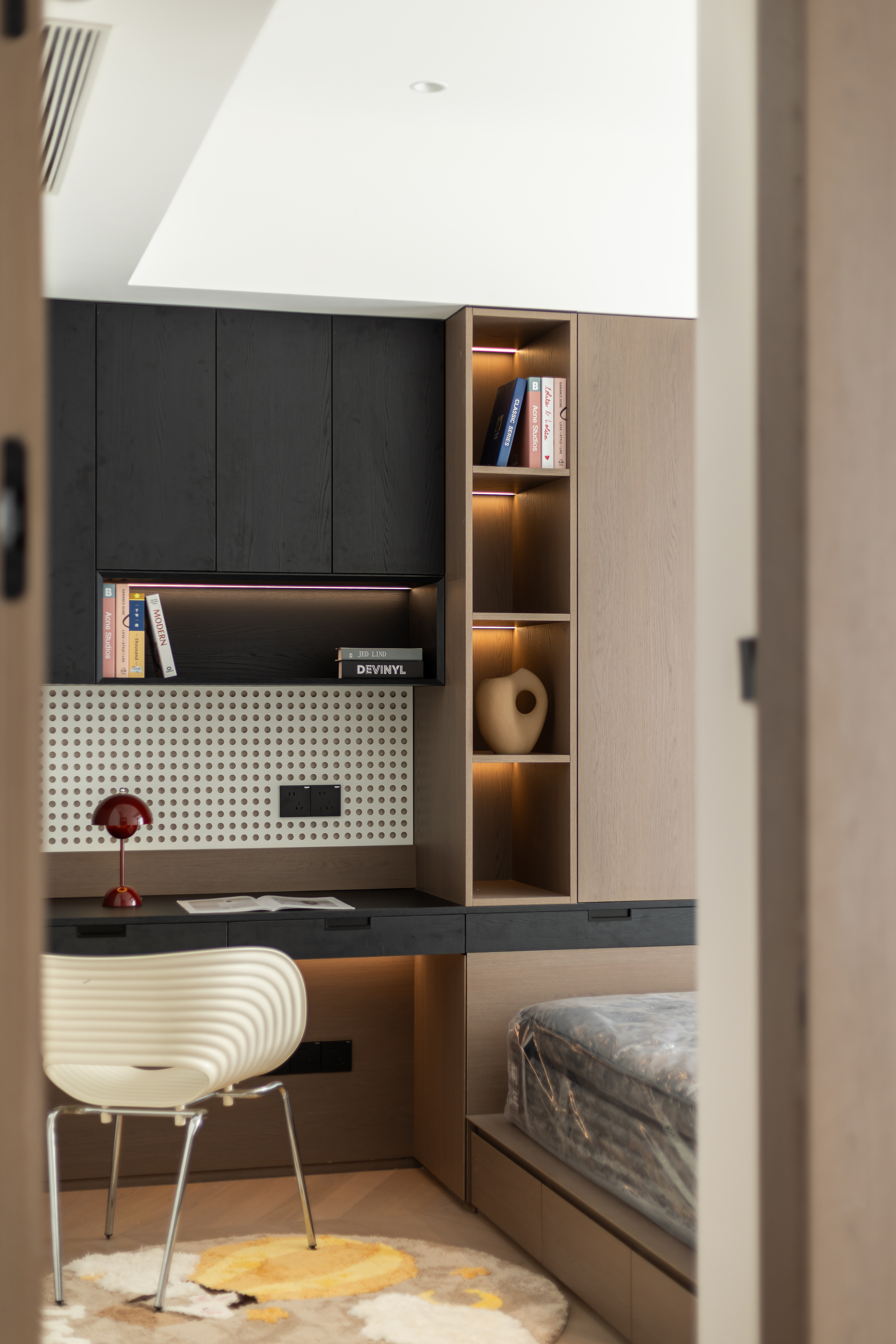空间布局:我们摒弃常规的区隔,转而运用建筑解构主义手法,将儿童房空间进行精准的切割与重组。材质,成为定义功能的无声语言;动线,在连贯的布局中自由流动,创造出远超物理面积的空间体验。