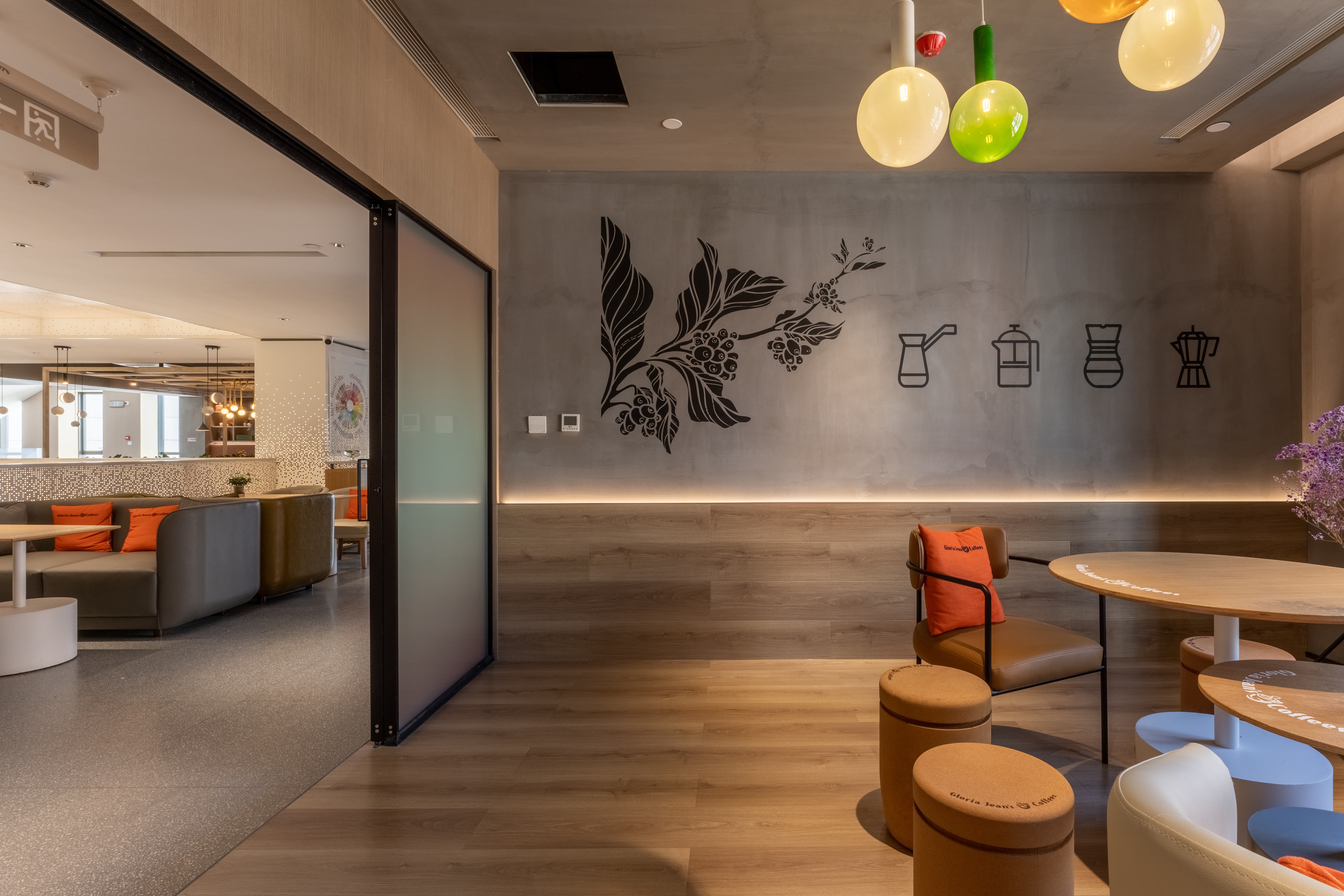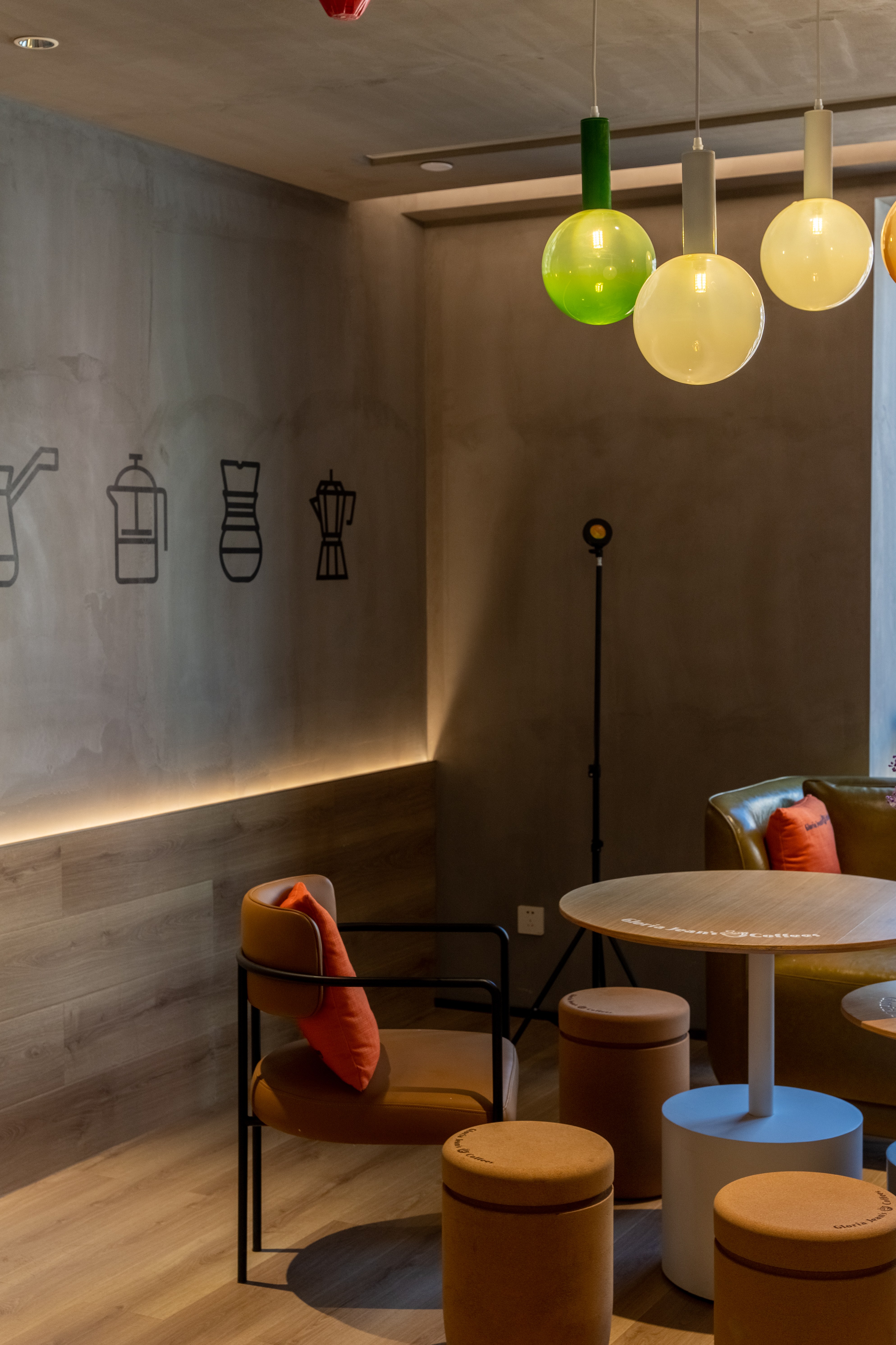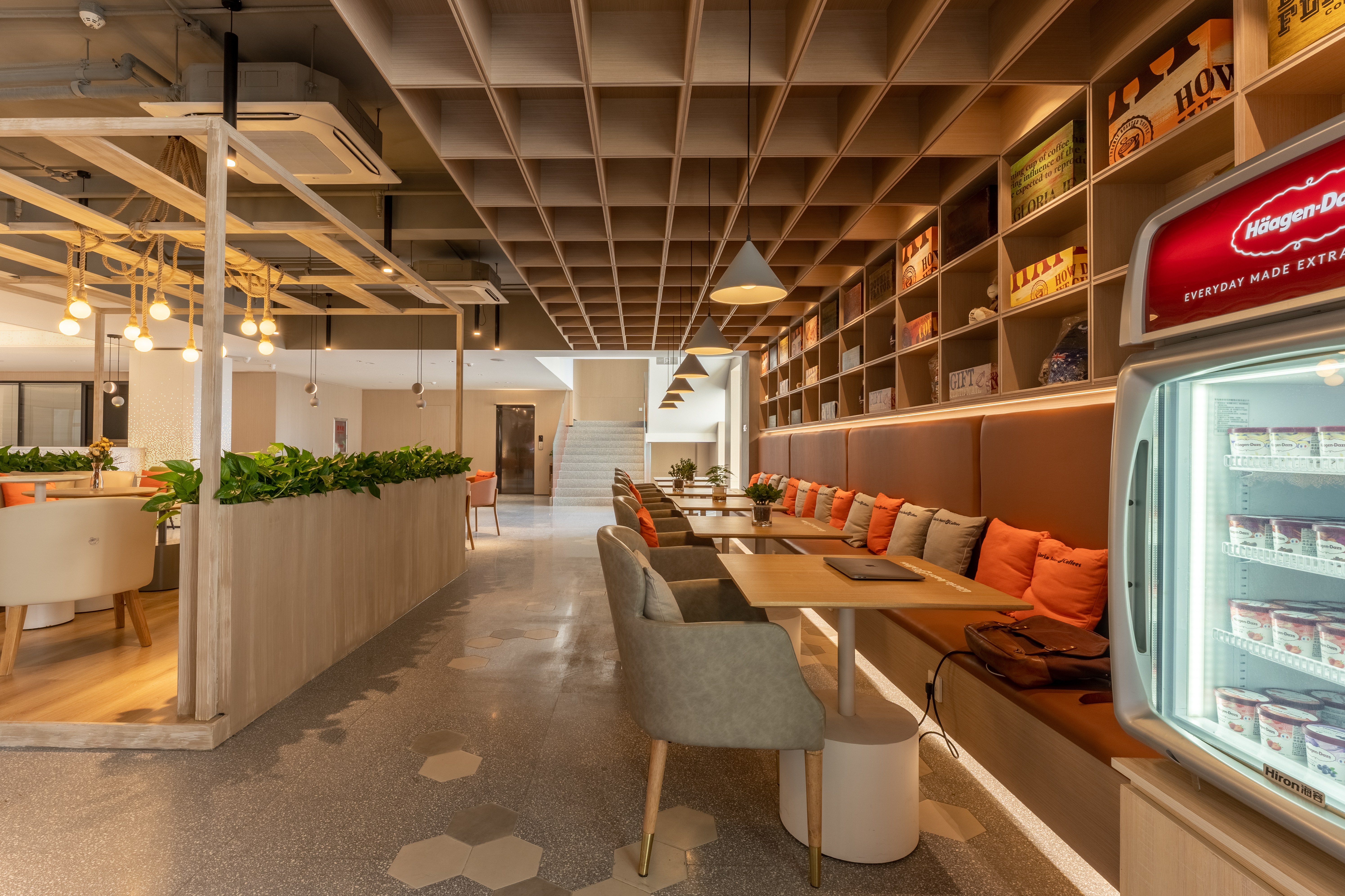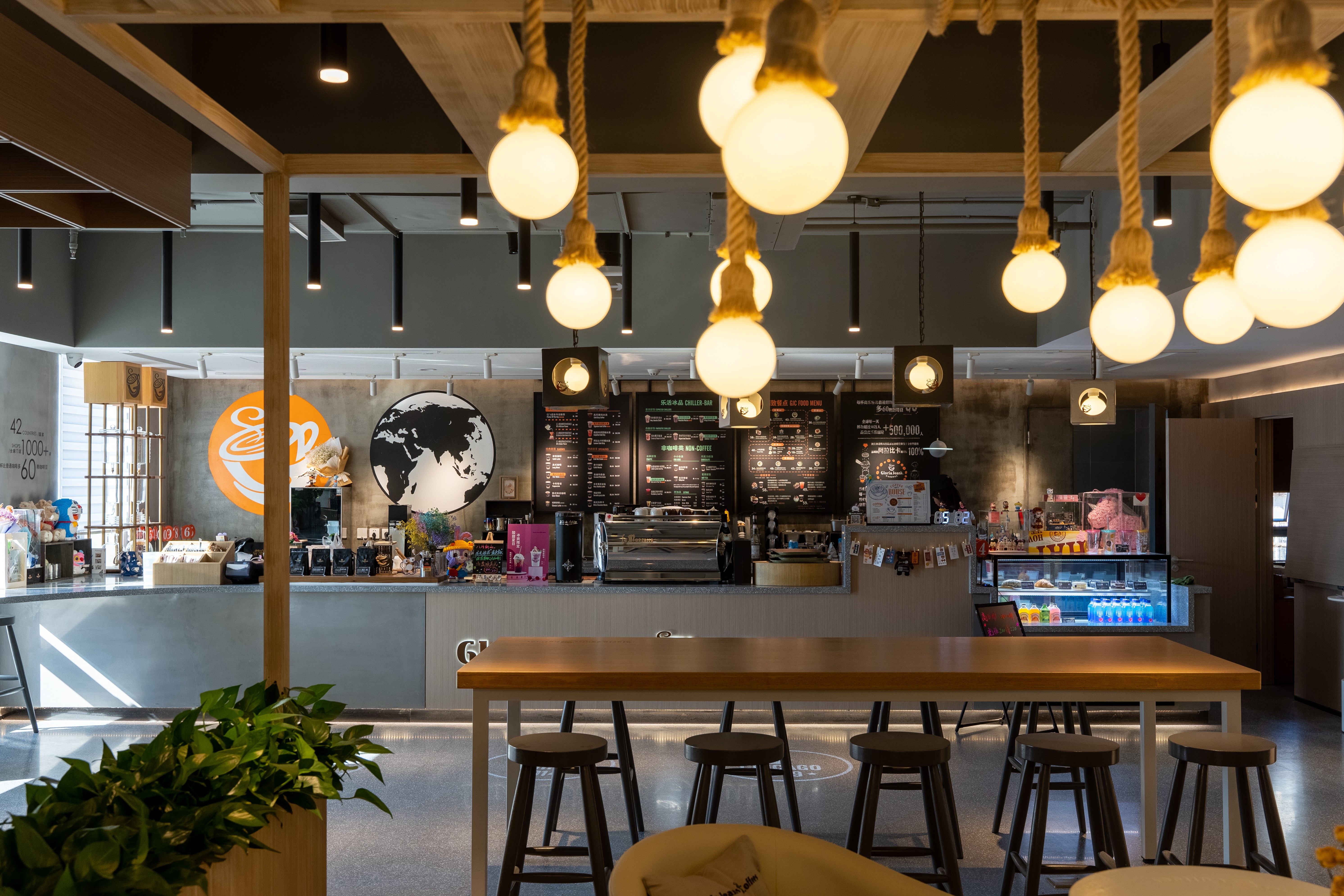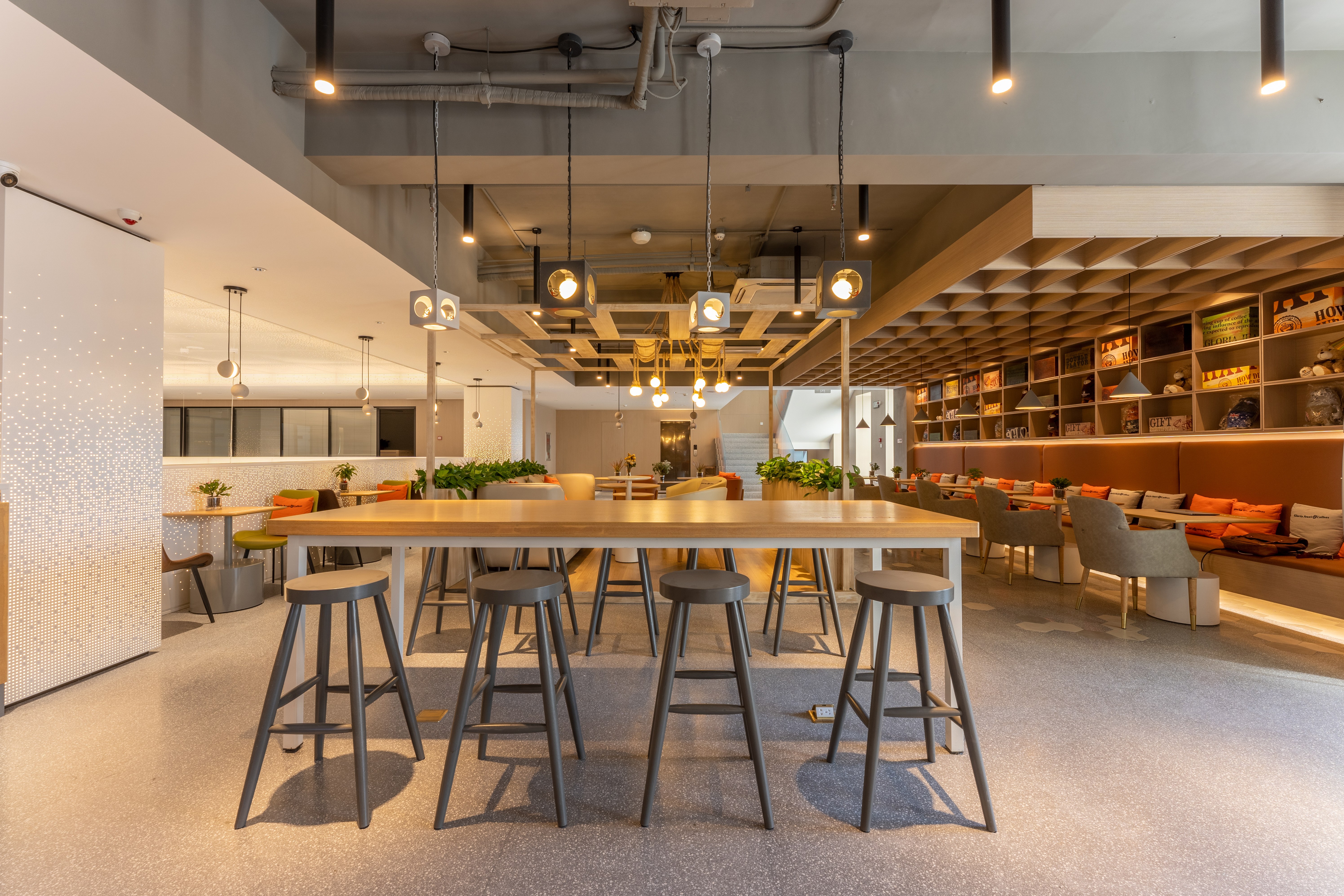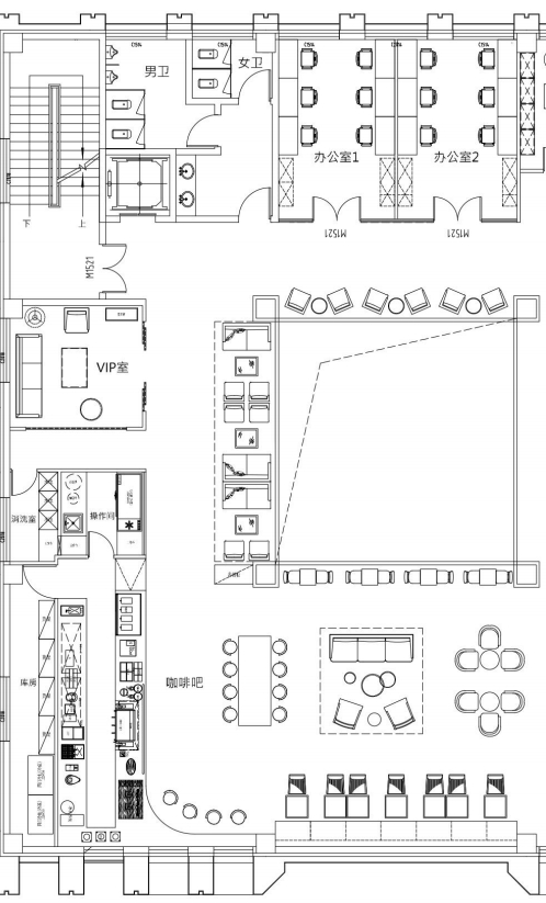 照明设计说明:本案使用3000K暖光,在相对冰冷的创意园办公公共区内营造出一个温馨放松的咖啡角落。摒弃了传统的物理隔墙,在品牌LOGO和操作台背景墙位置采取重点信息照明,在长桌区和散台区采用泛光照明和局部点光的结合,营造放松休闲的氛围感,桌面茶几都配有局部点光照明,满足功能性。VIP室采用局部点光结合灯带的方式营造私密性。以上设计与大环境4000K的冷色调泛光照明形成鲜明对比,起到很好的获客效果。