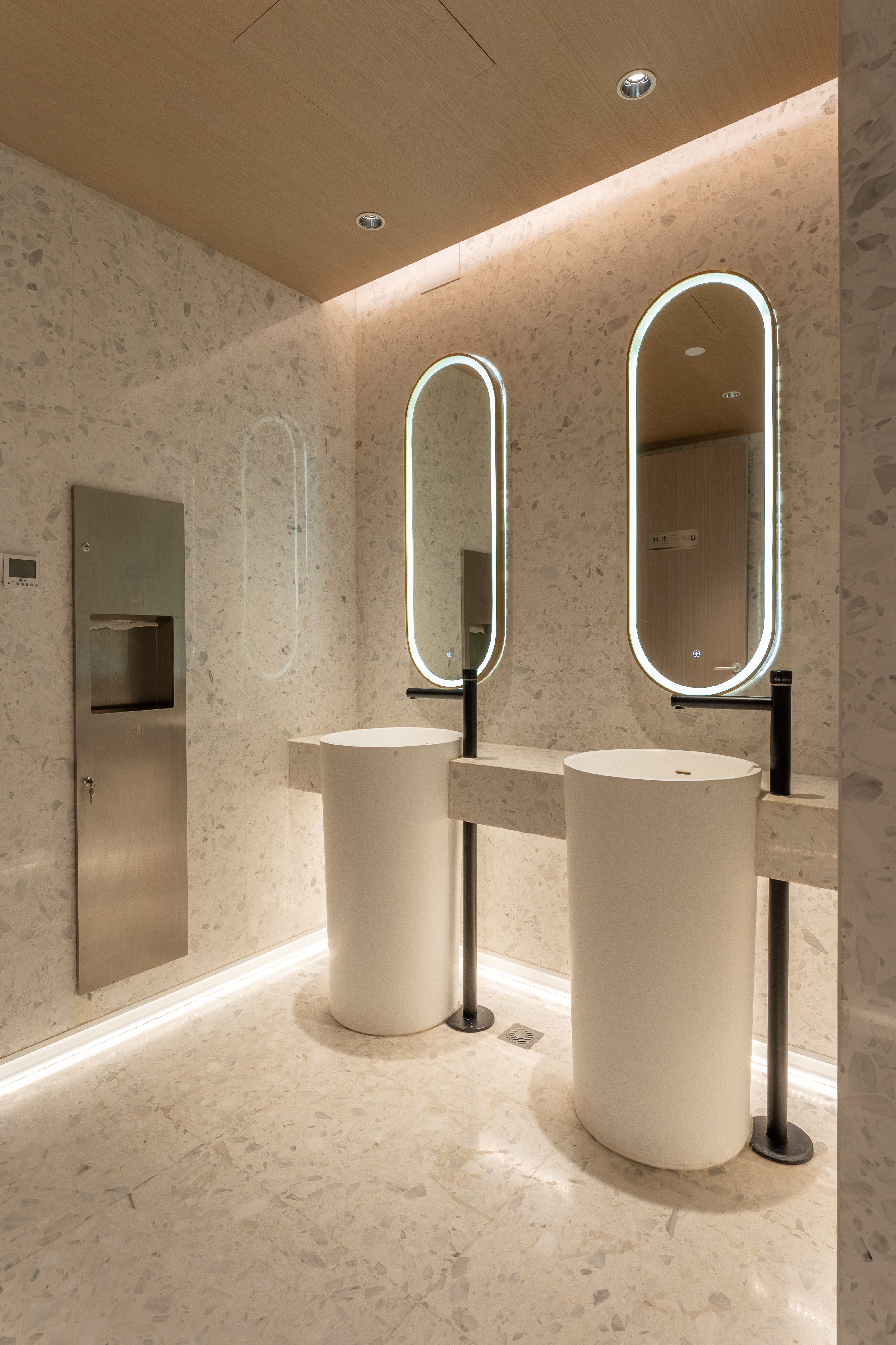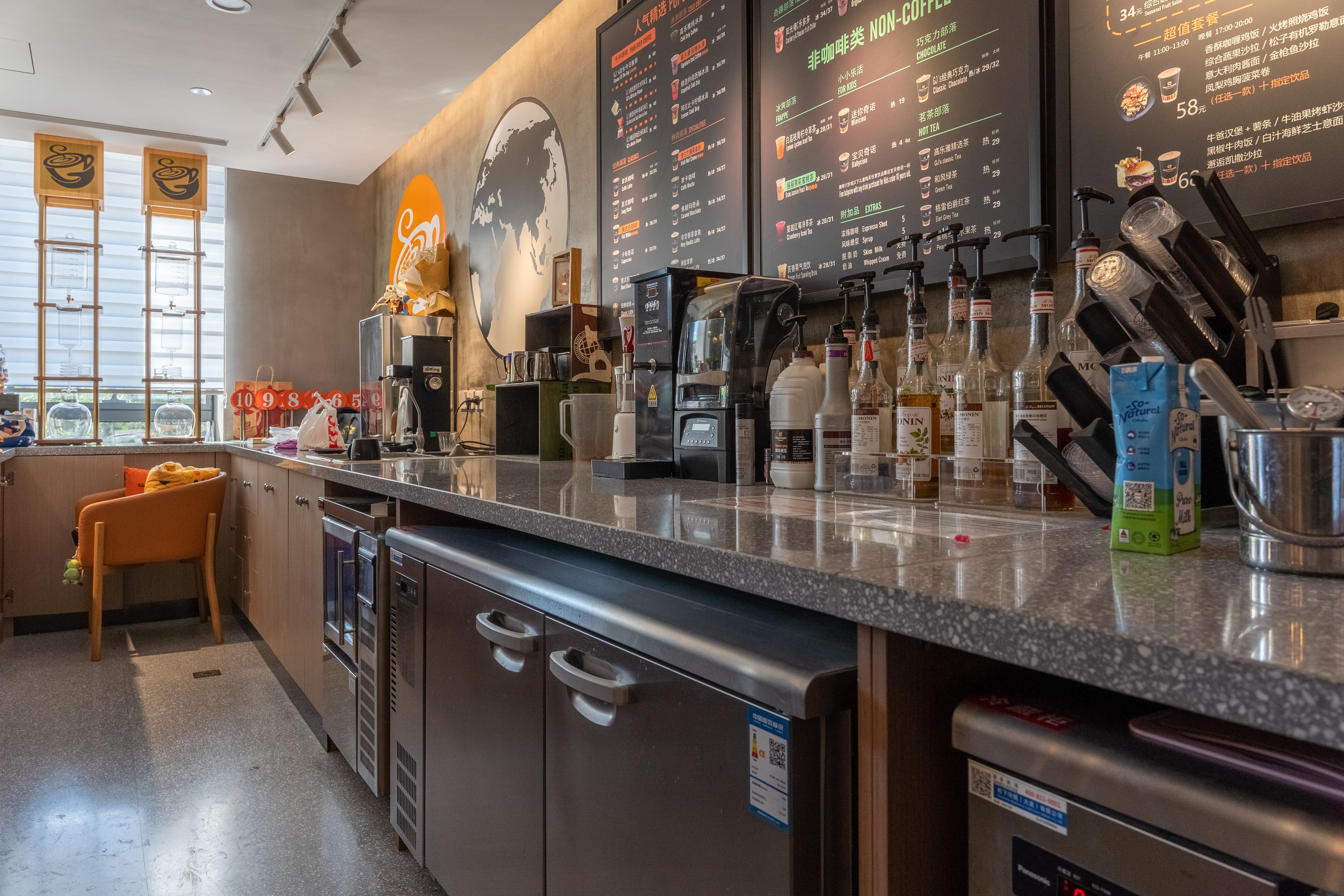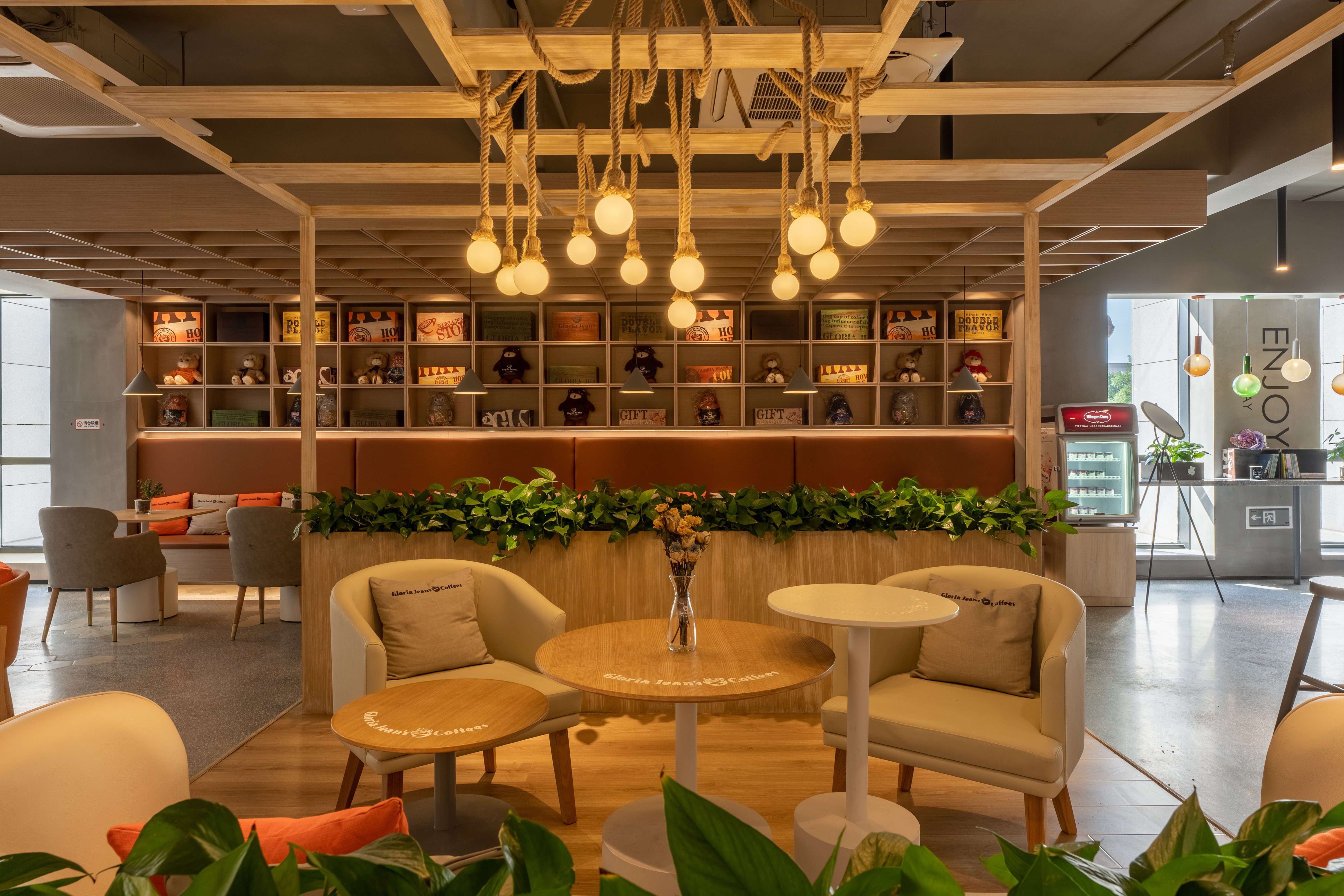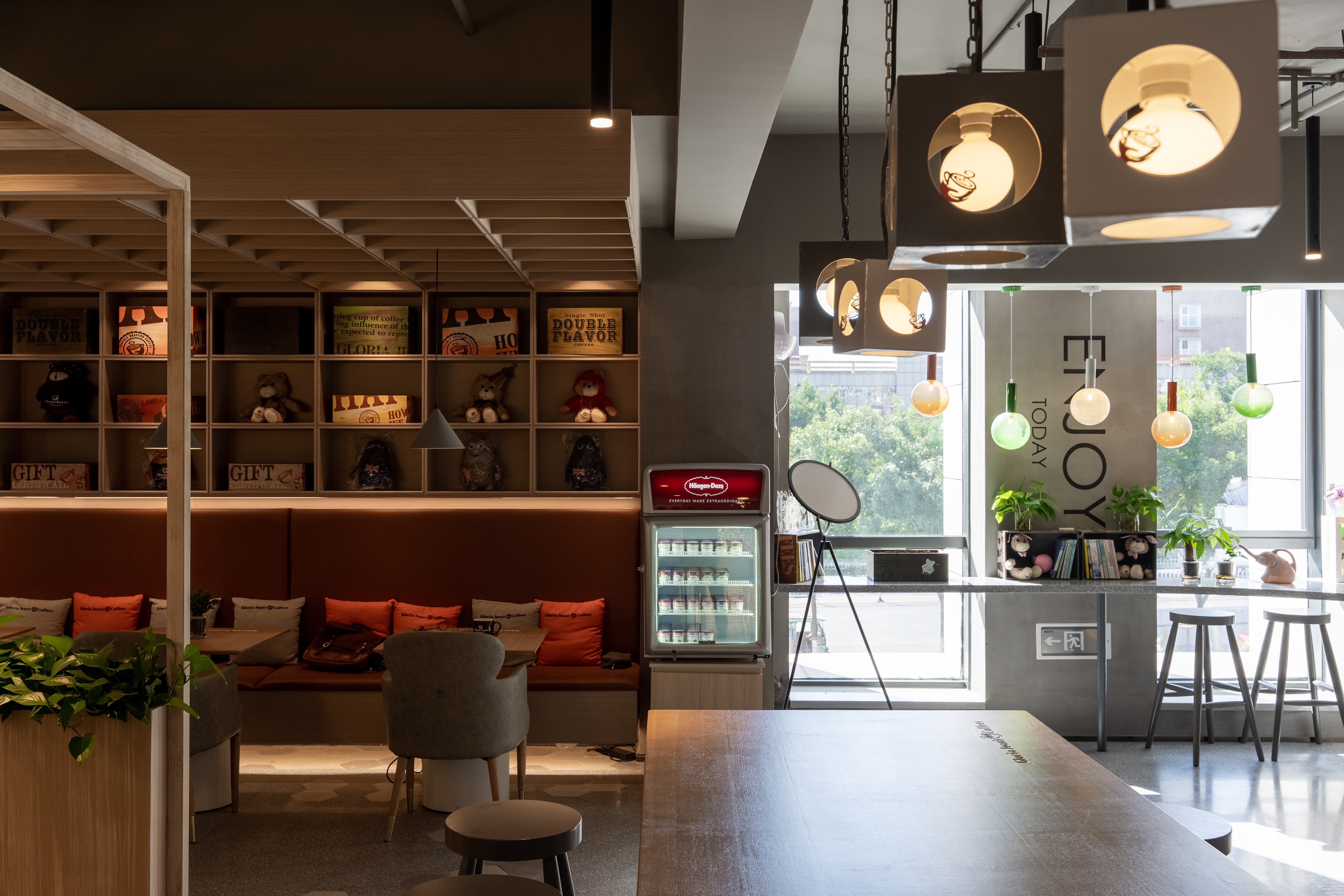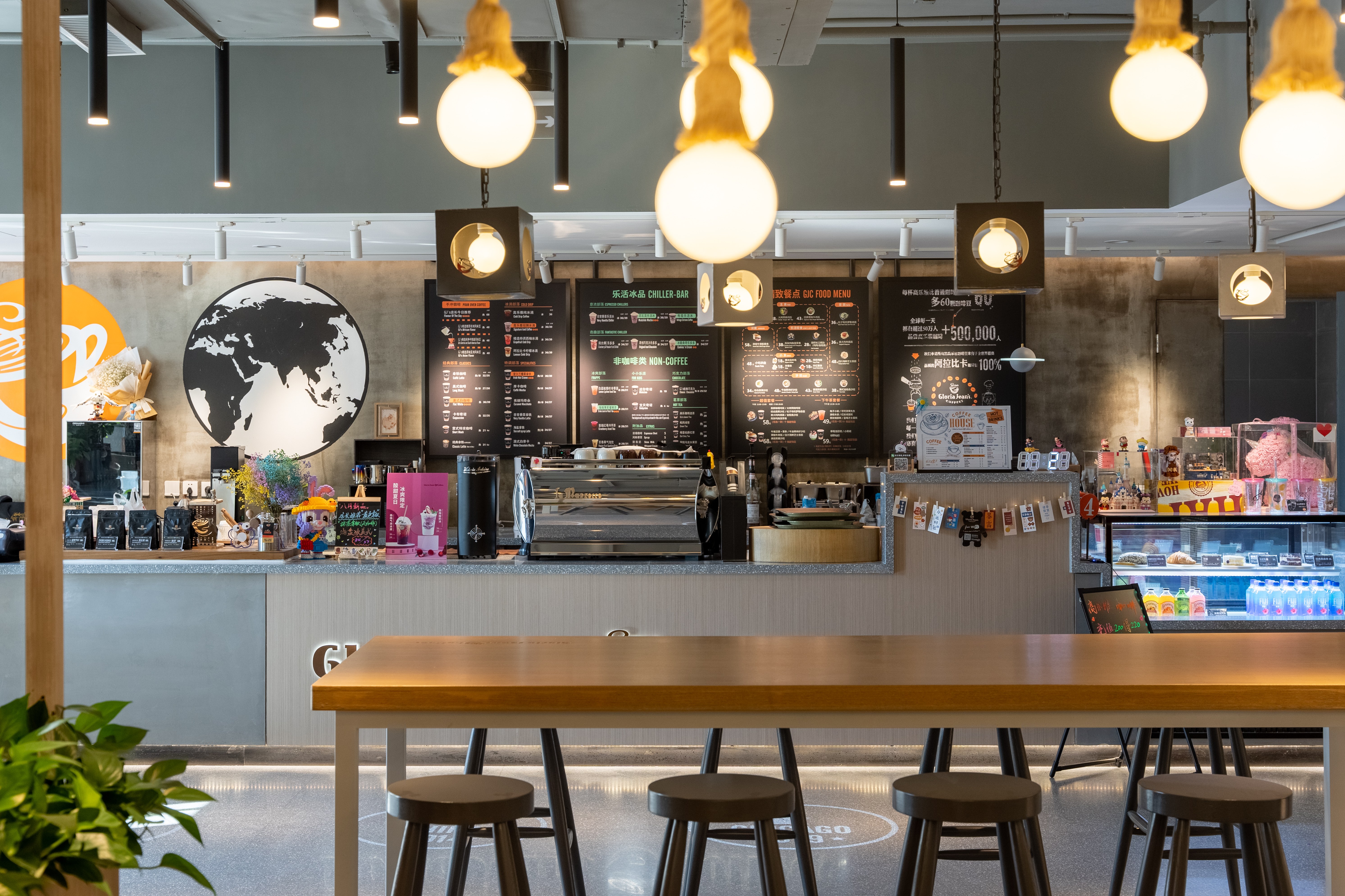 照明设计说明:本案使用3000K暖光,在相对冰冷的创意园办公公共区内营造出一个温馨放松的咖啡角落。摒弃了传统的物理隔墙,在品牌LOGO和操作台背景墙位置采取重点信息照明,在长桌区和散台区采用泛光照明和局部点光的结合,营造放松休闲的氛围感,桌面茶几都配有局部点光照明,满足功能性。VIP室采用局部点光结合灯带的方式营造私密性。以上设计与大环境4000K的冷色调泛光照明形成鲜明对比,起到很好的获客效果。